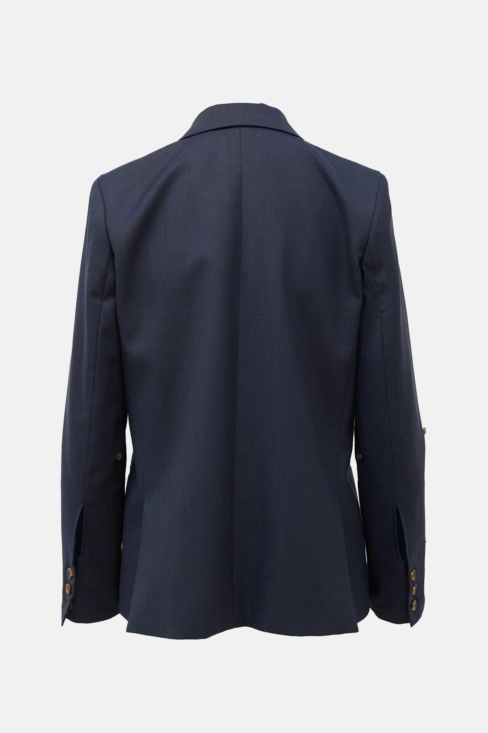 Pre-owned TWP navy wool blend blazer featuring a peak lapel, padded shoulder, button front, and convertible button sleeve. Lined.