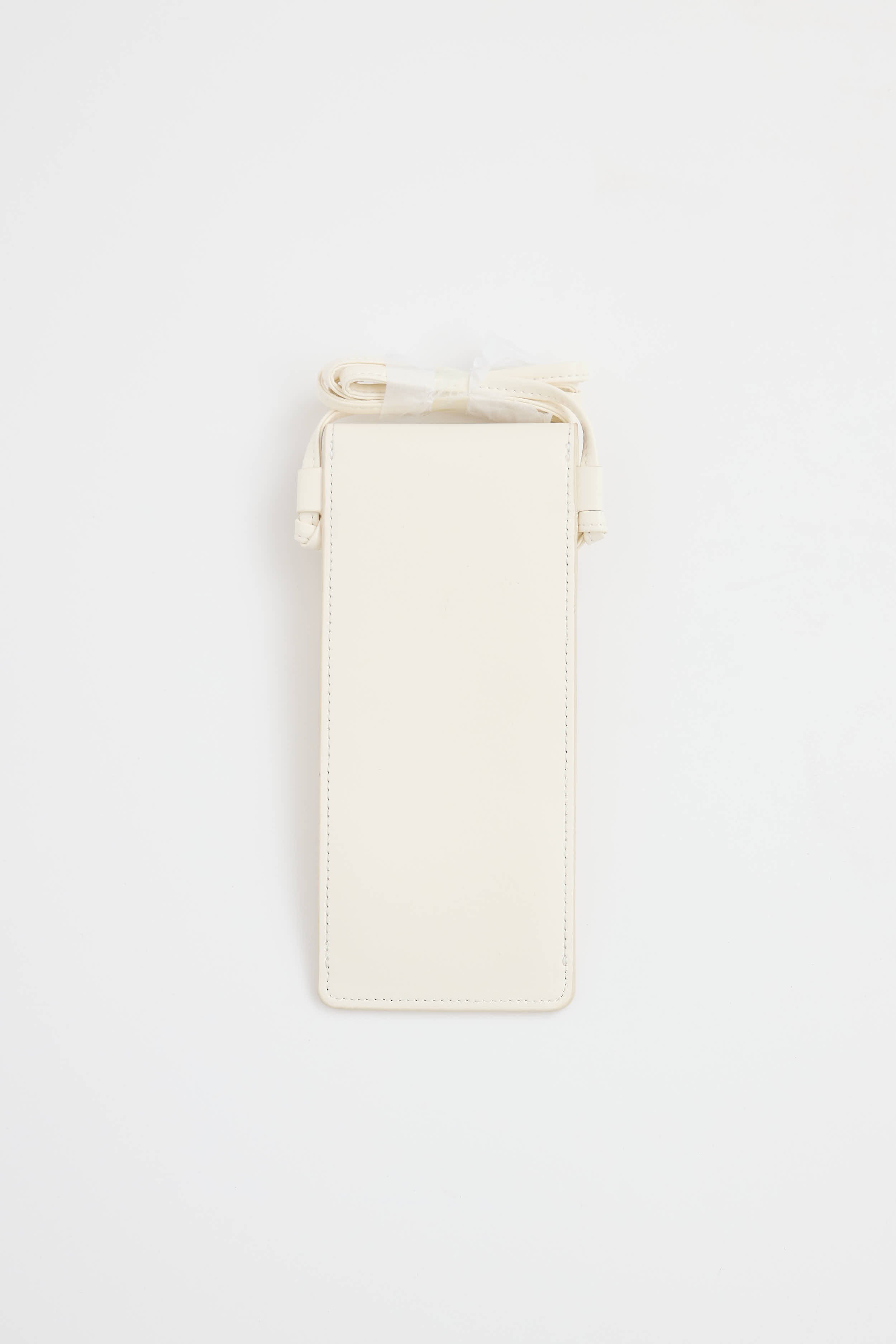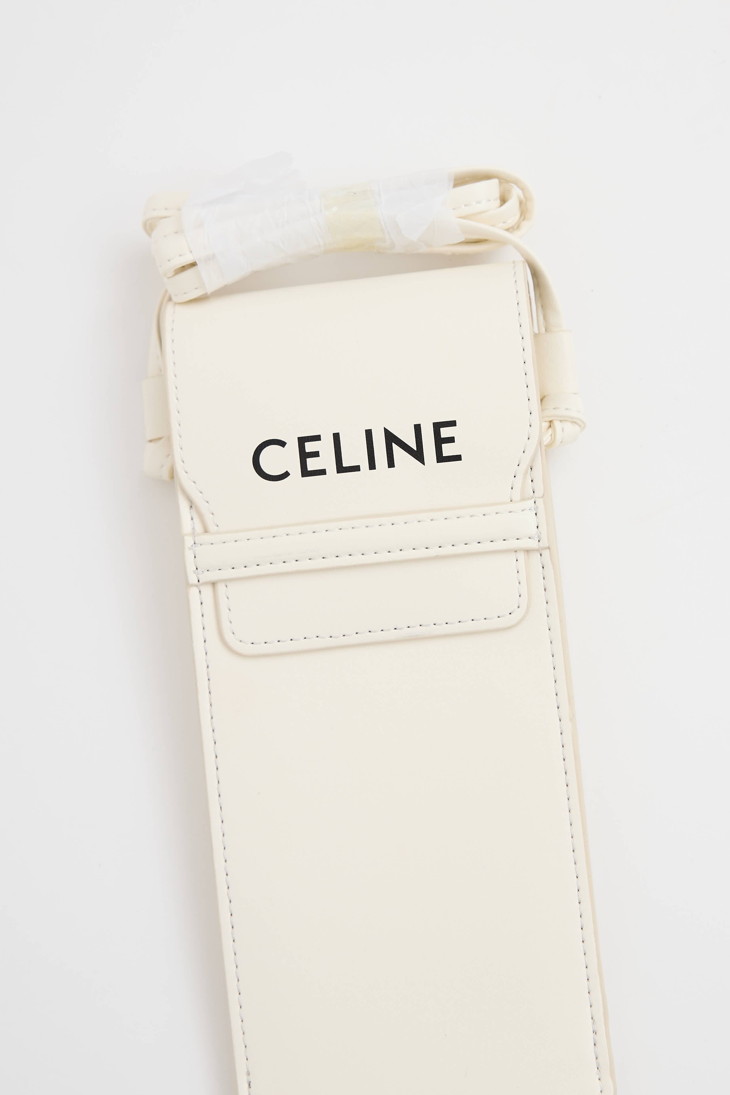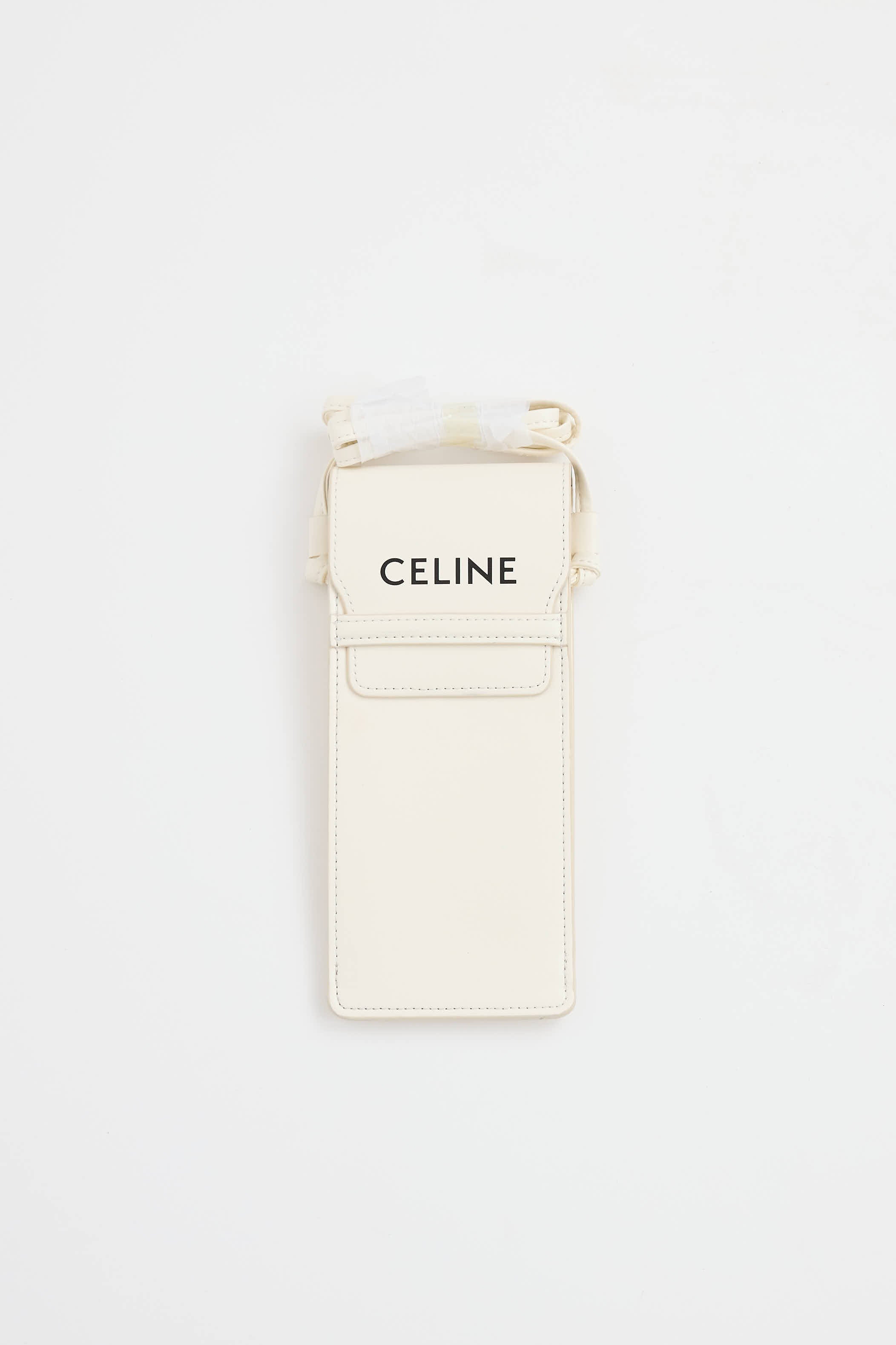 Pre-owned Celine white leather phone pouch featuring crossbody strap, top flap with logo, and one main compartment.