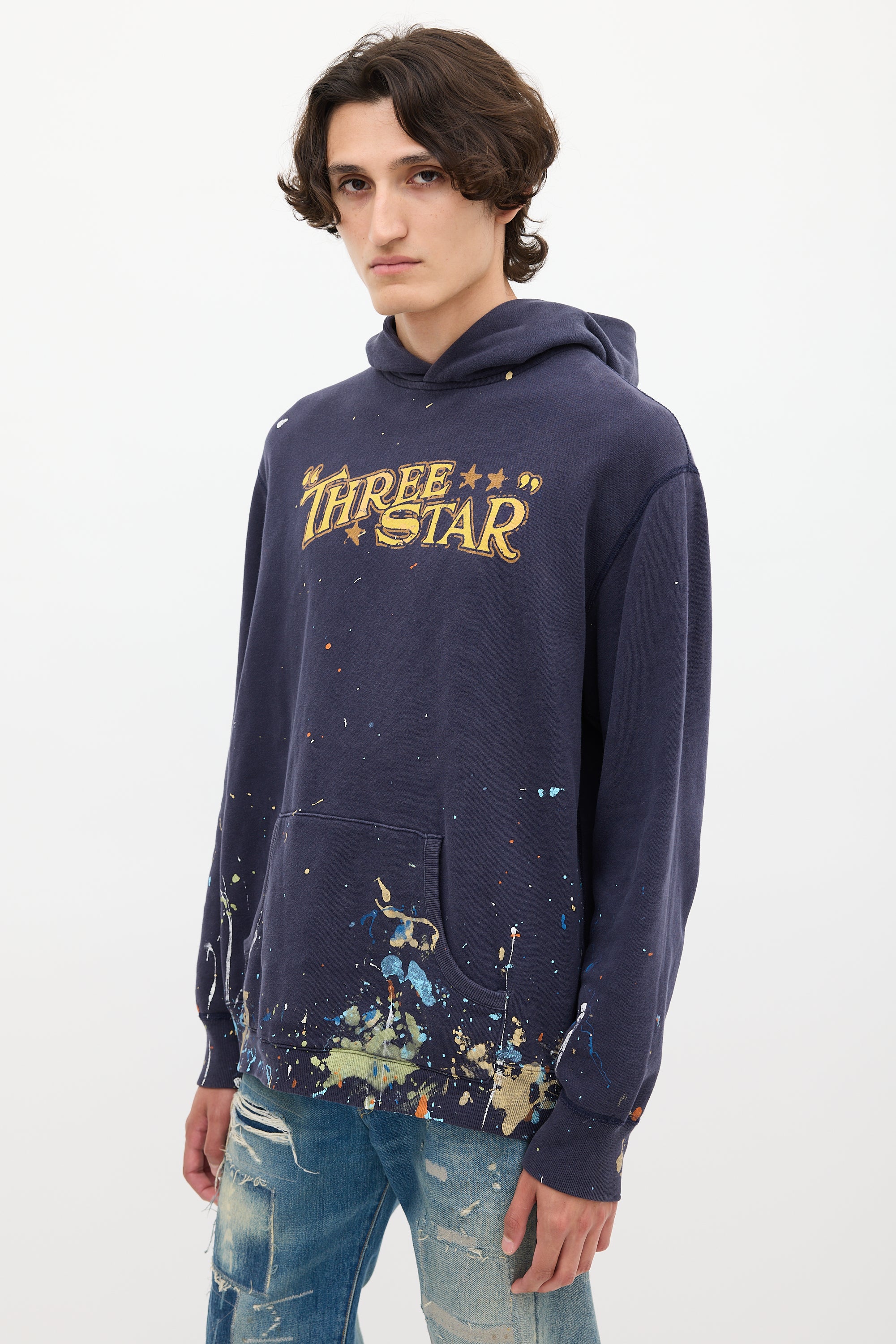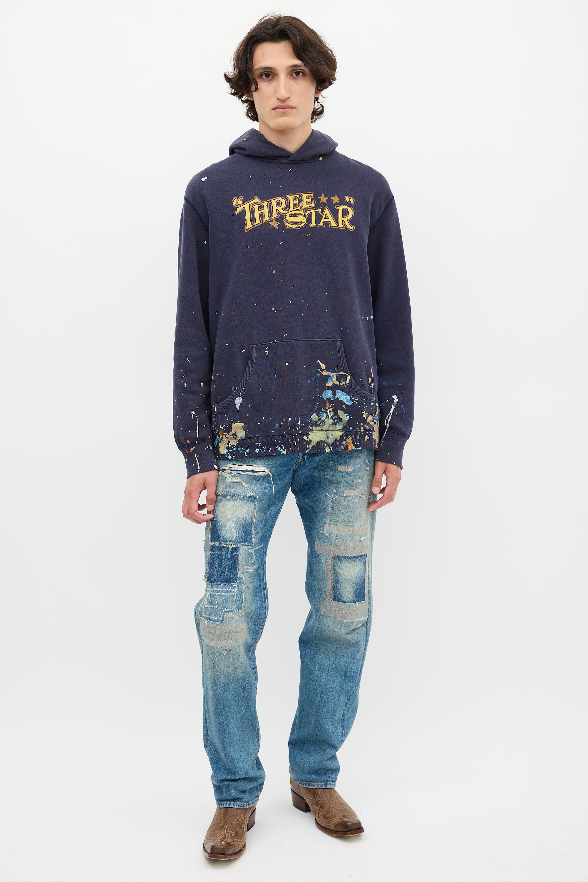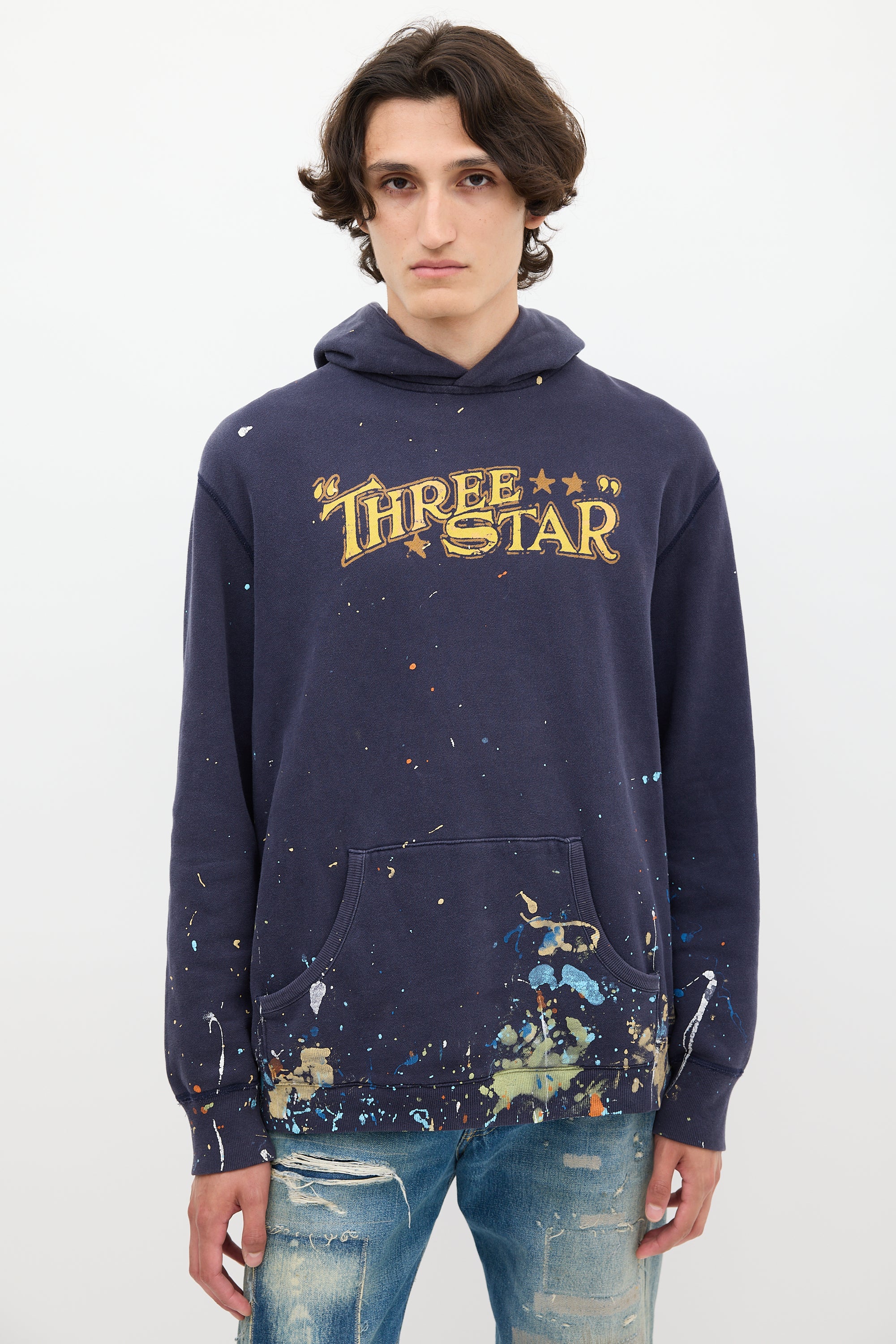 Pre-owned Ralph Lauren Polo navy hoodie featuring yellow "Three Star" lettering printed across chest, multicolour paint splatters throughout, single front kangaroo pocket, long sleeves, and ribbing at hem and cuffs.