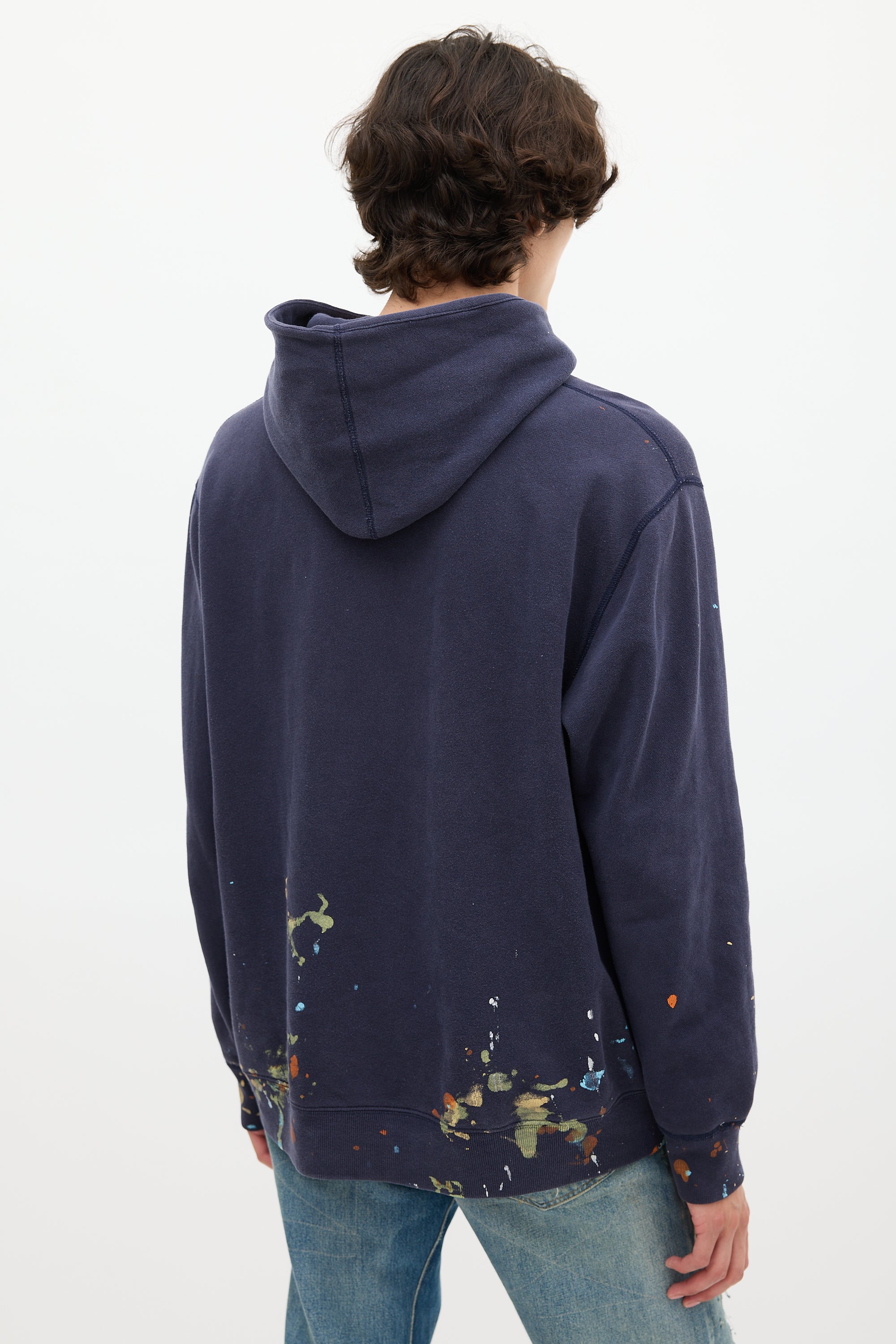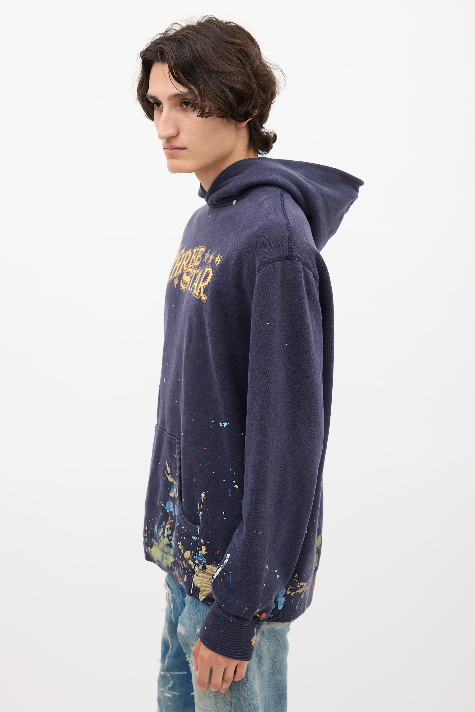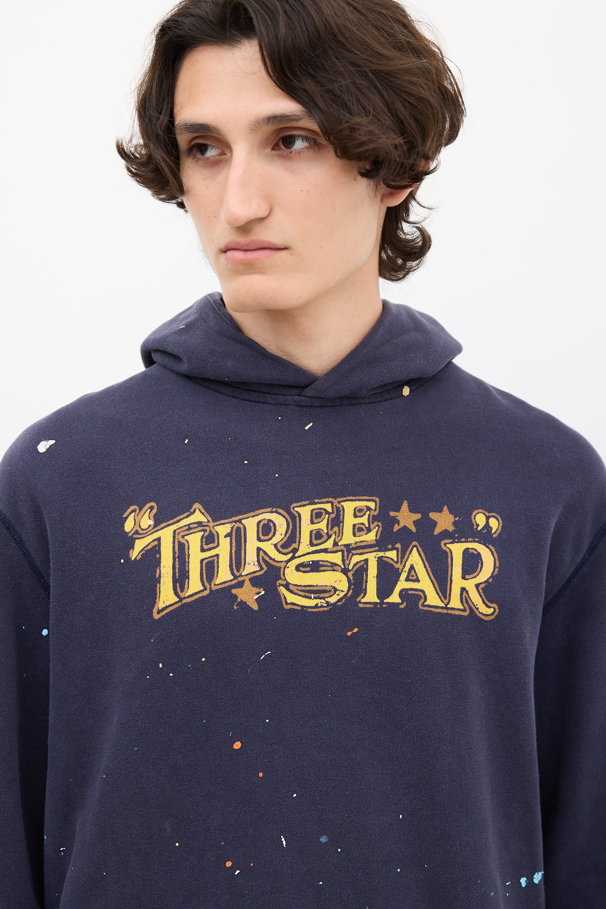 Pre-owned Ralph Lauren Polo navy hoodie featuring yellow "Three Star" lettering printed across chest, multicolour paint splatters throughout, single front kangaroo pocket, long sleeves, and ribbing at hem and cuffs.