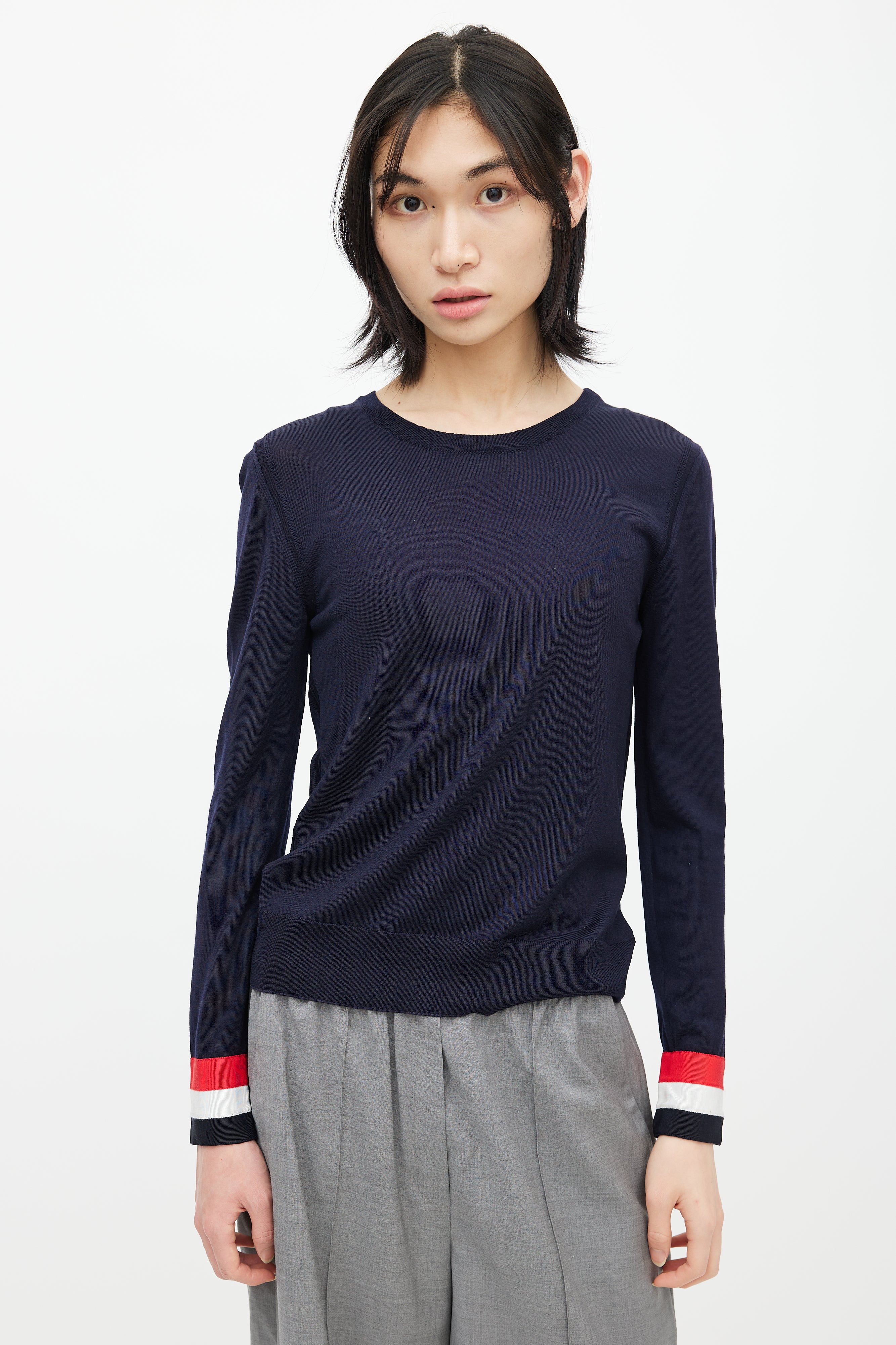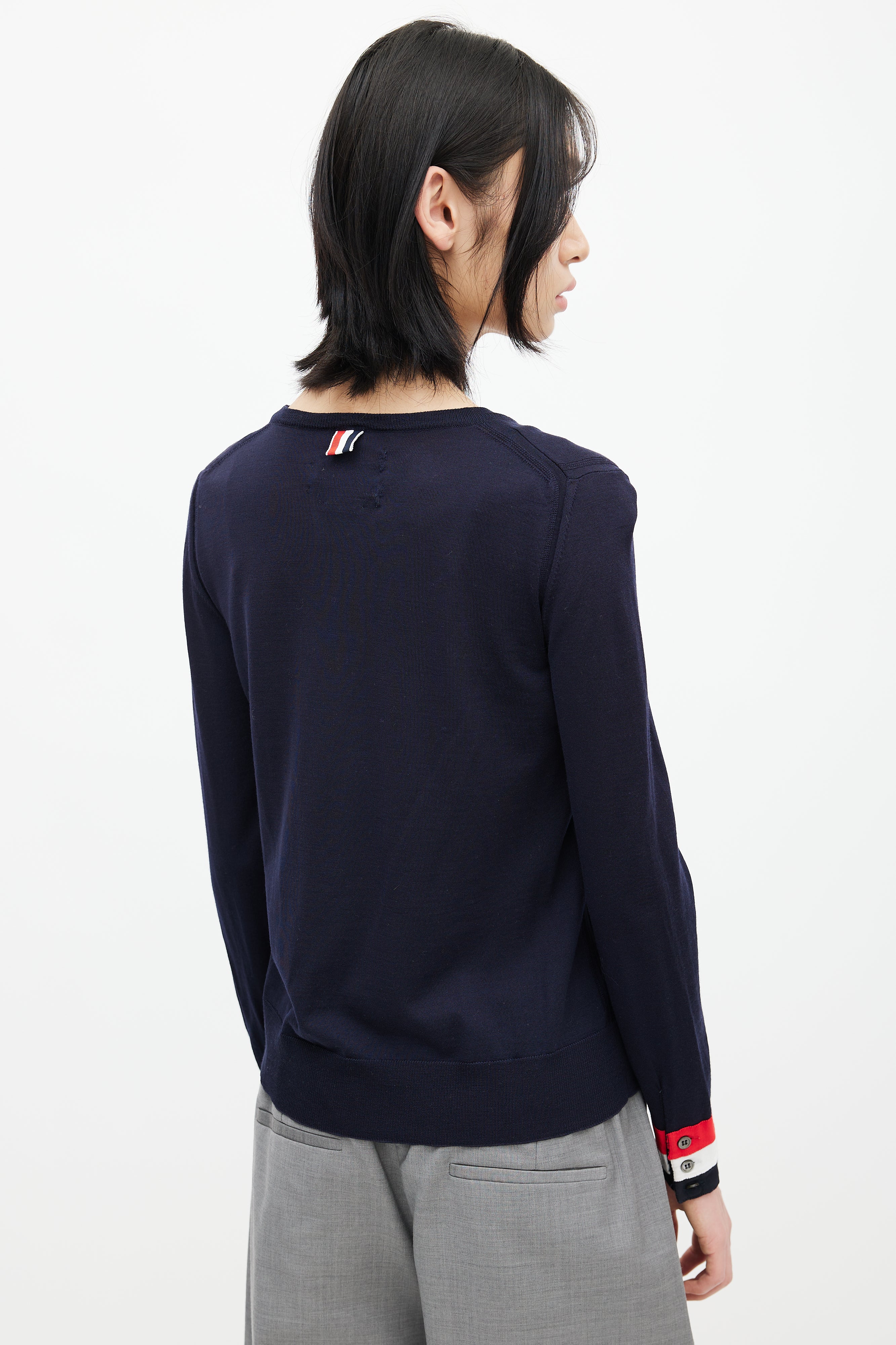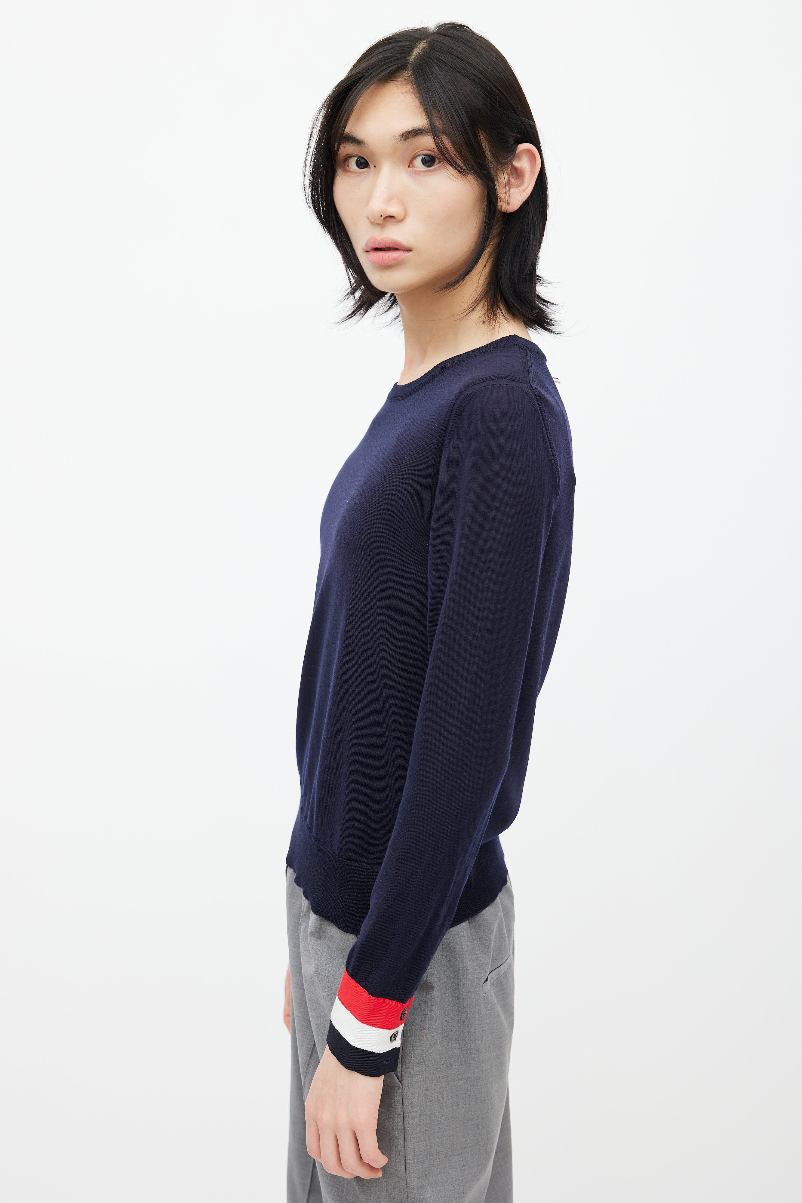 Pre-owned Thom Browne navy knit sweater featuring a crew neckline, long sleeves with multicolour stripe buttoned cuffs, signature webbed patch at back, and ribbed hem.
