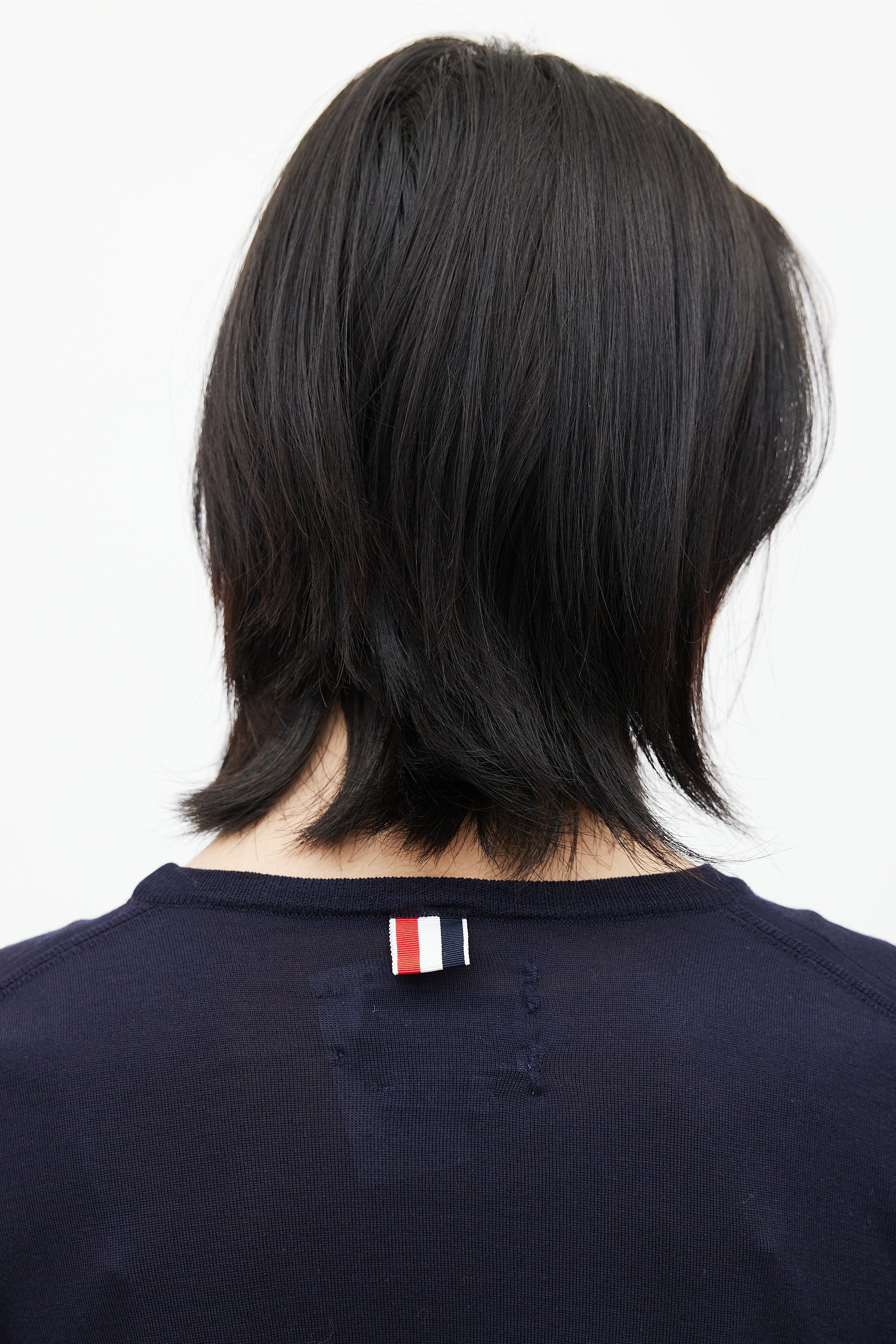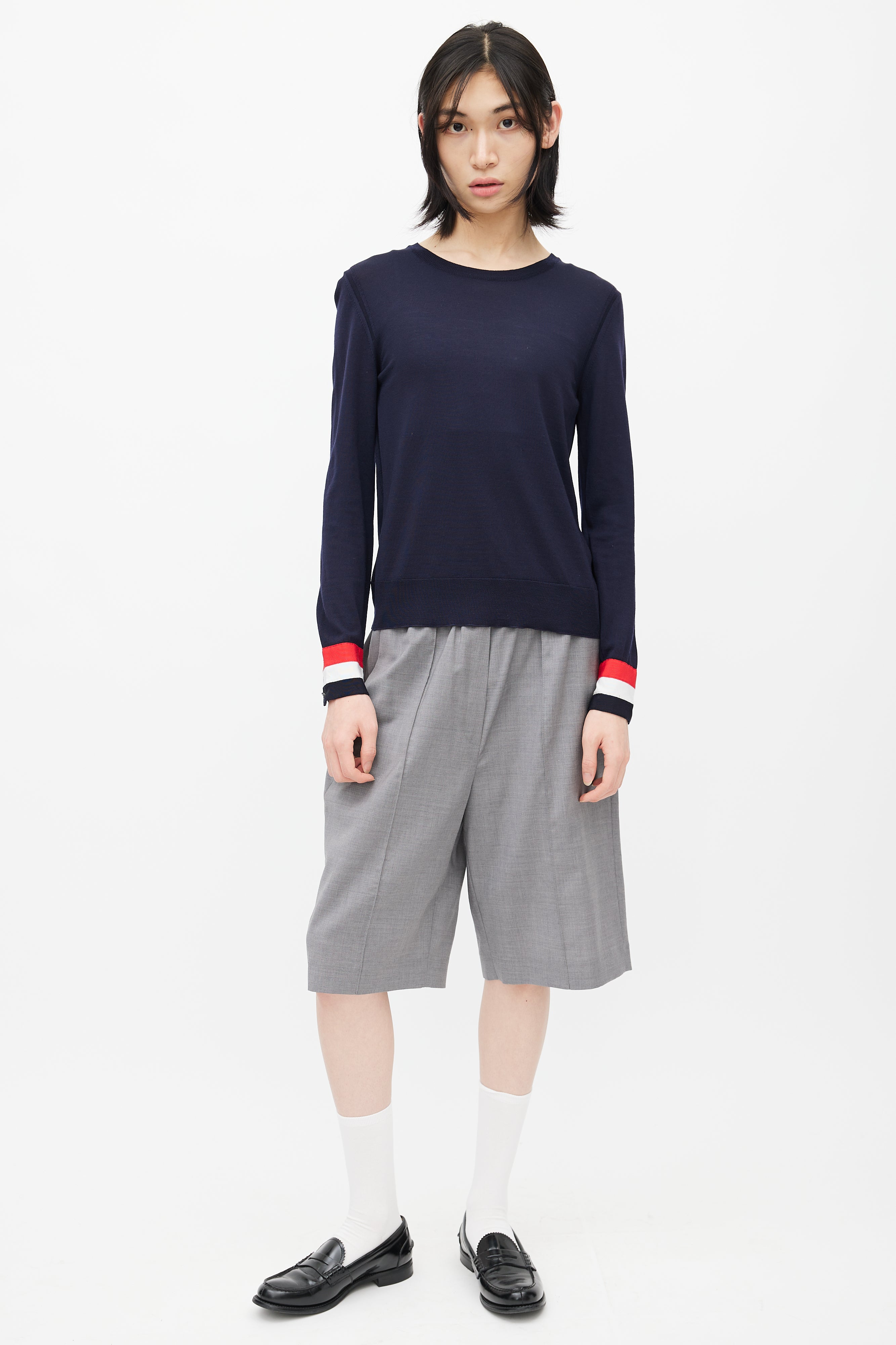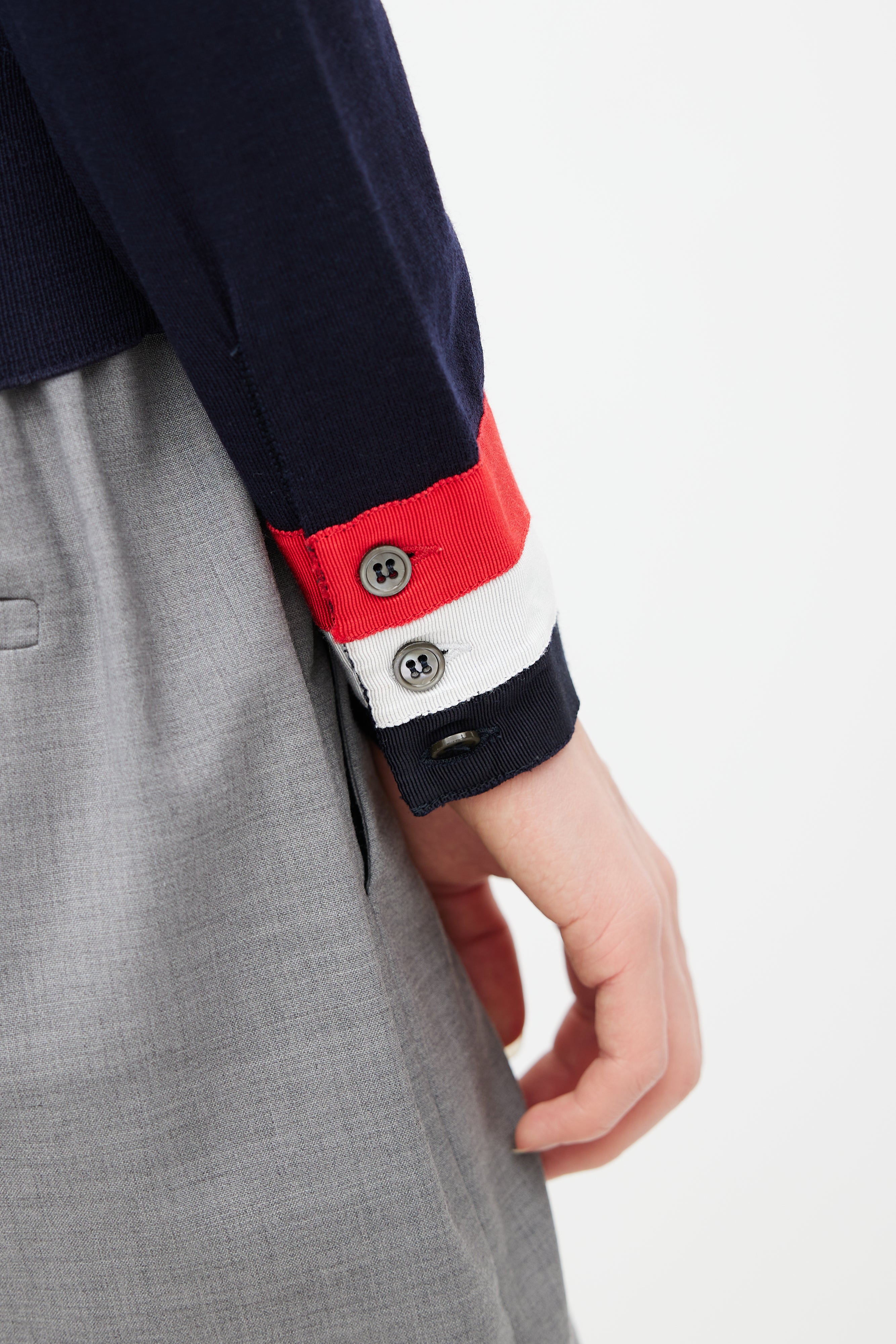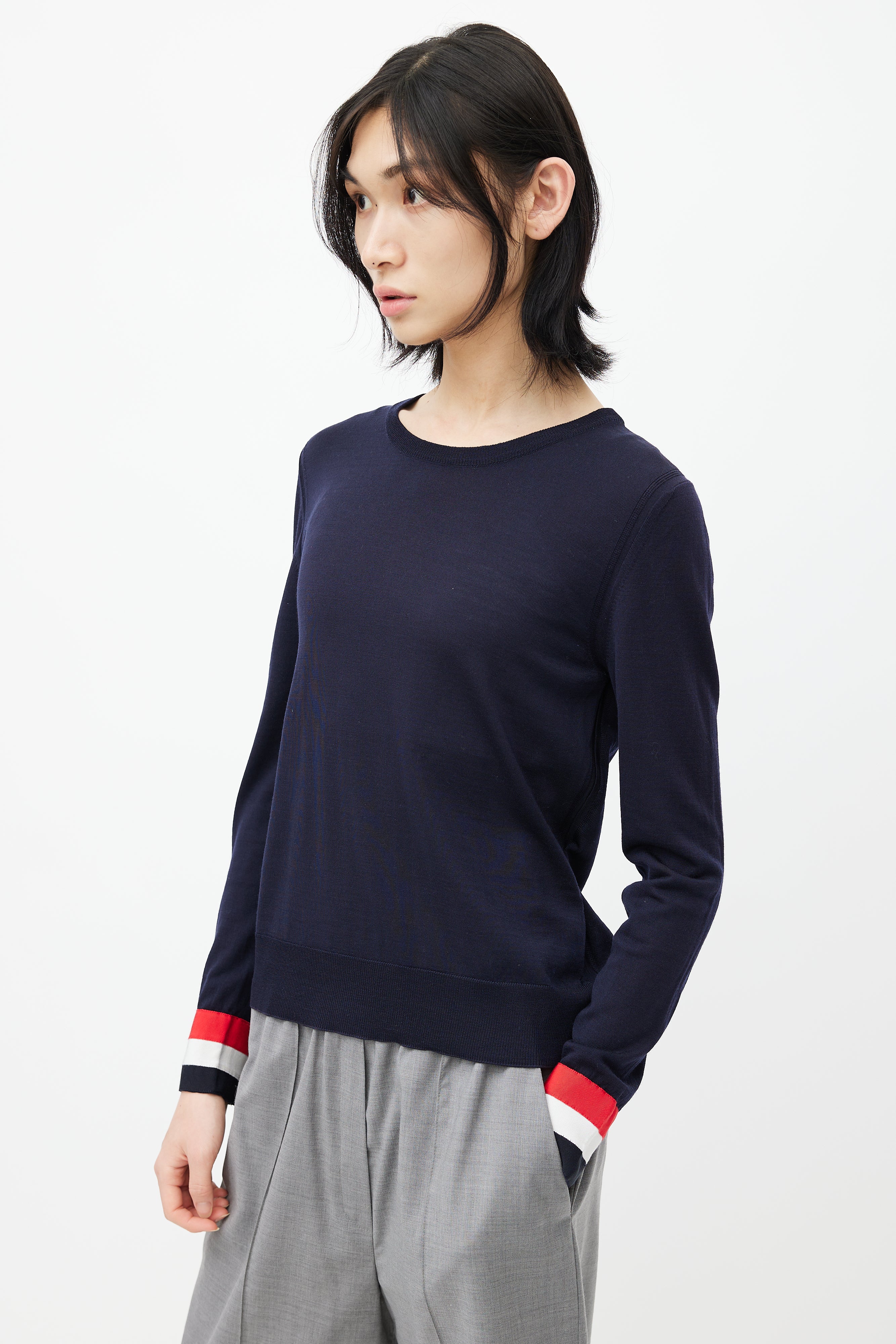 Pre-owned Thom Browne navy knit sweater featuring a crew neckline, long sleeves with multicolour stripe buttoned cuffs, signature webbed patch at back, and ribbed hem.