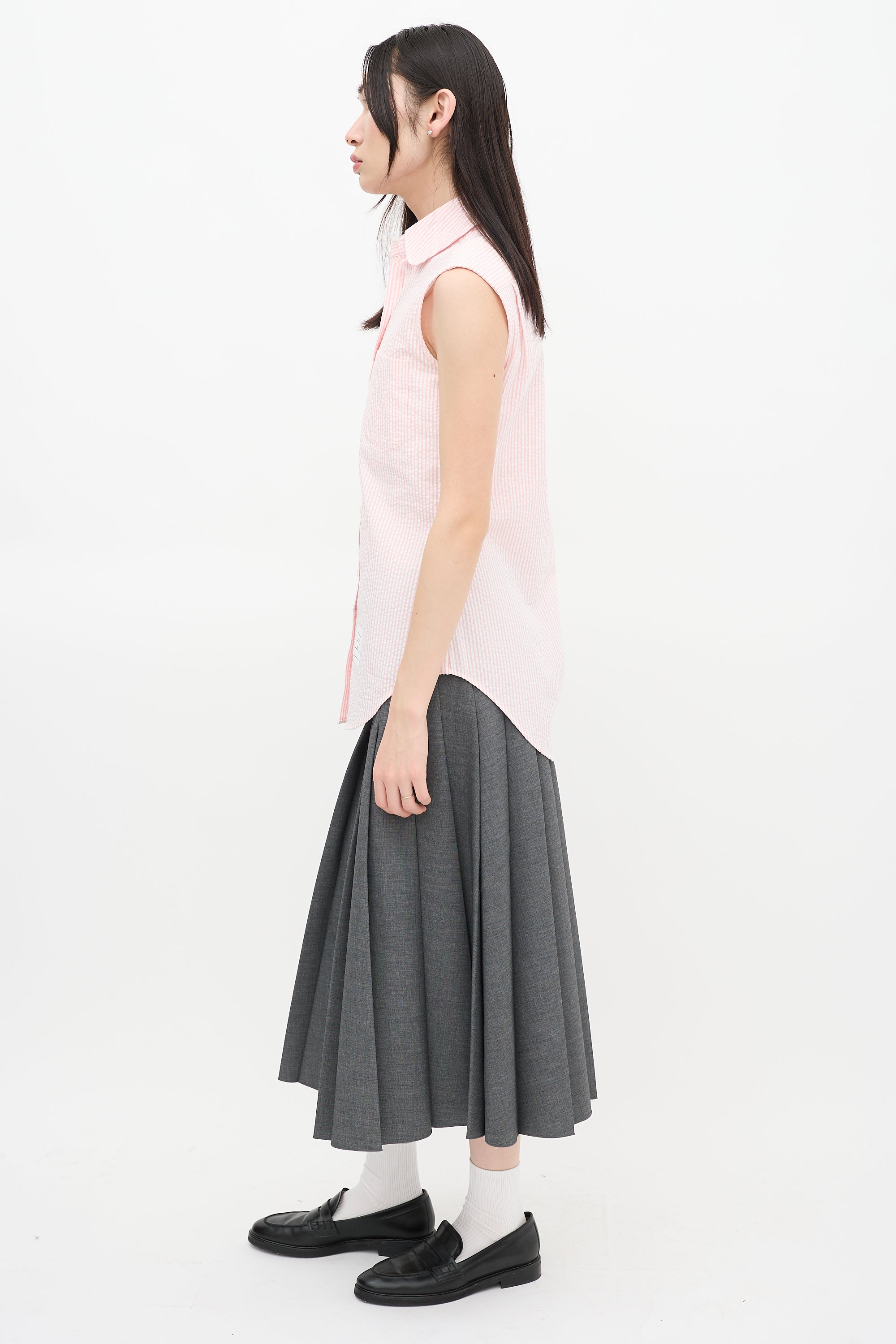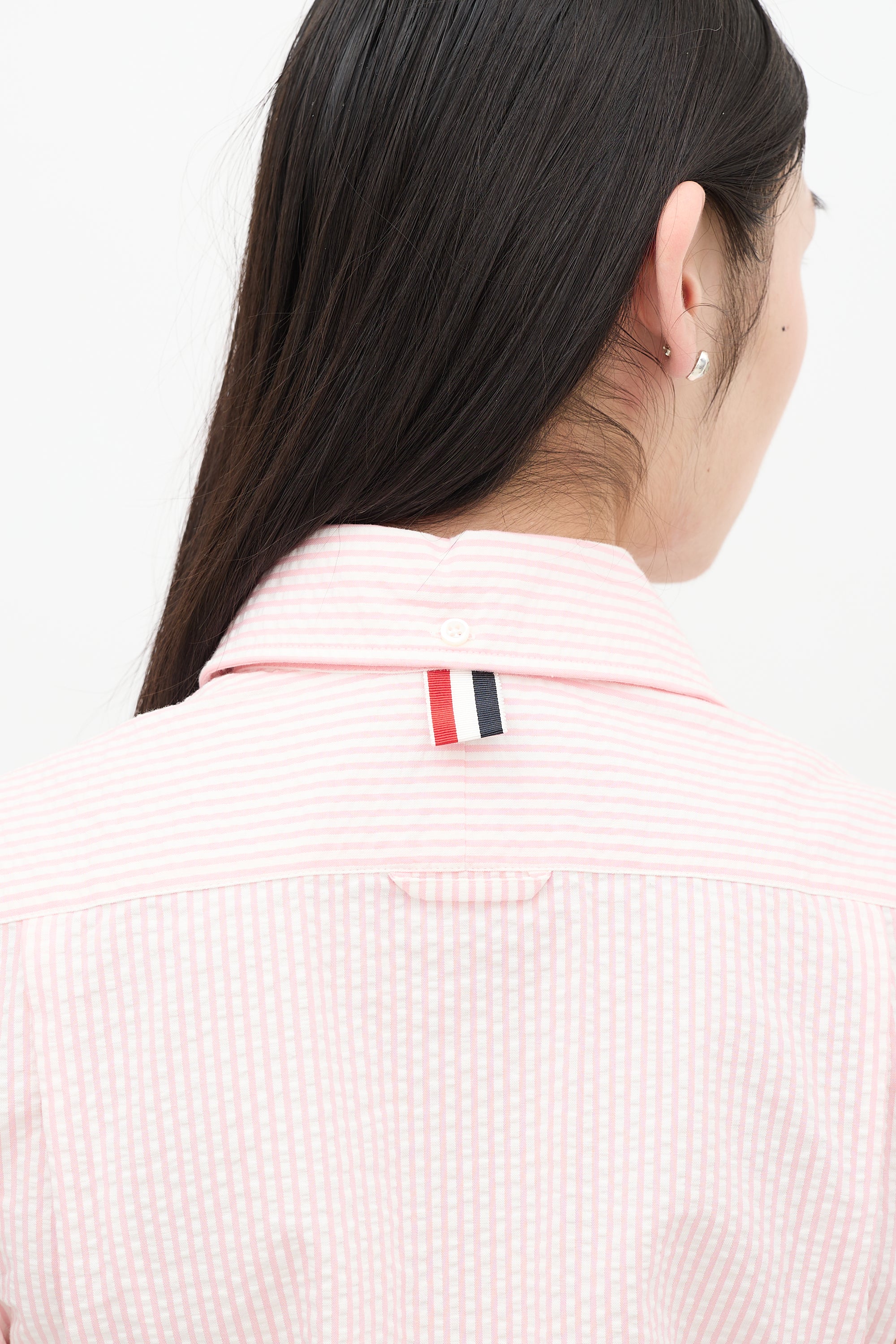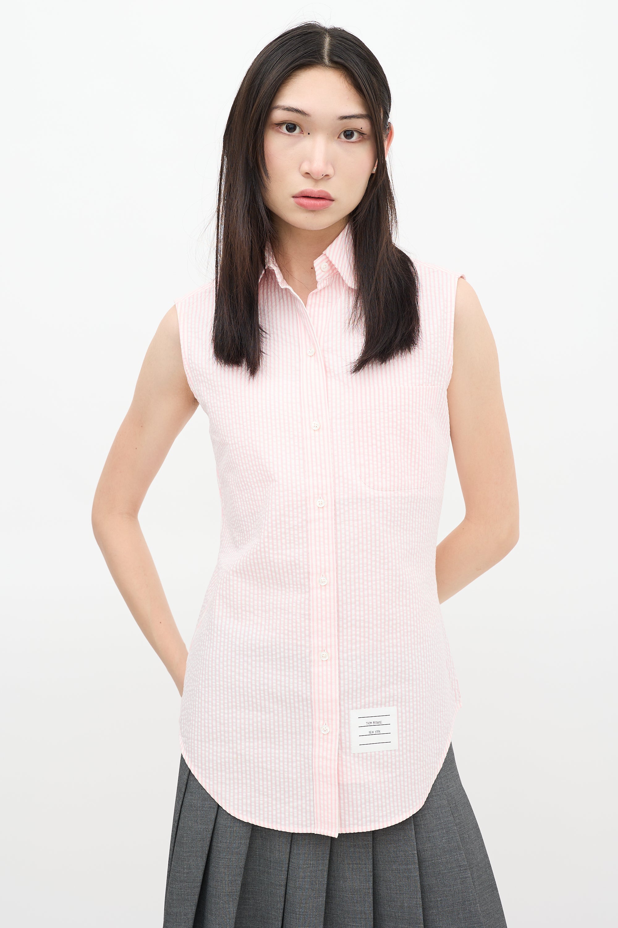 Pre-owned Thom Browne pink and white striped seersucker sleeveless shirt featuring pointed collar, button up front, scooped hem, and signature RWB grosgrain tab at back.