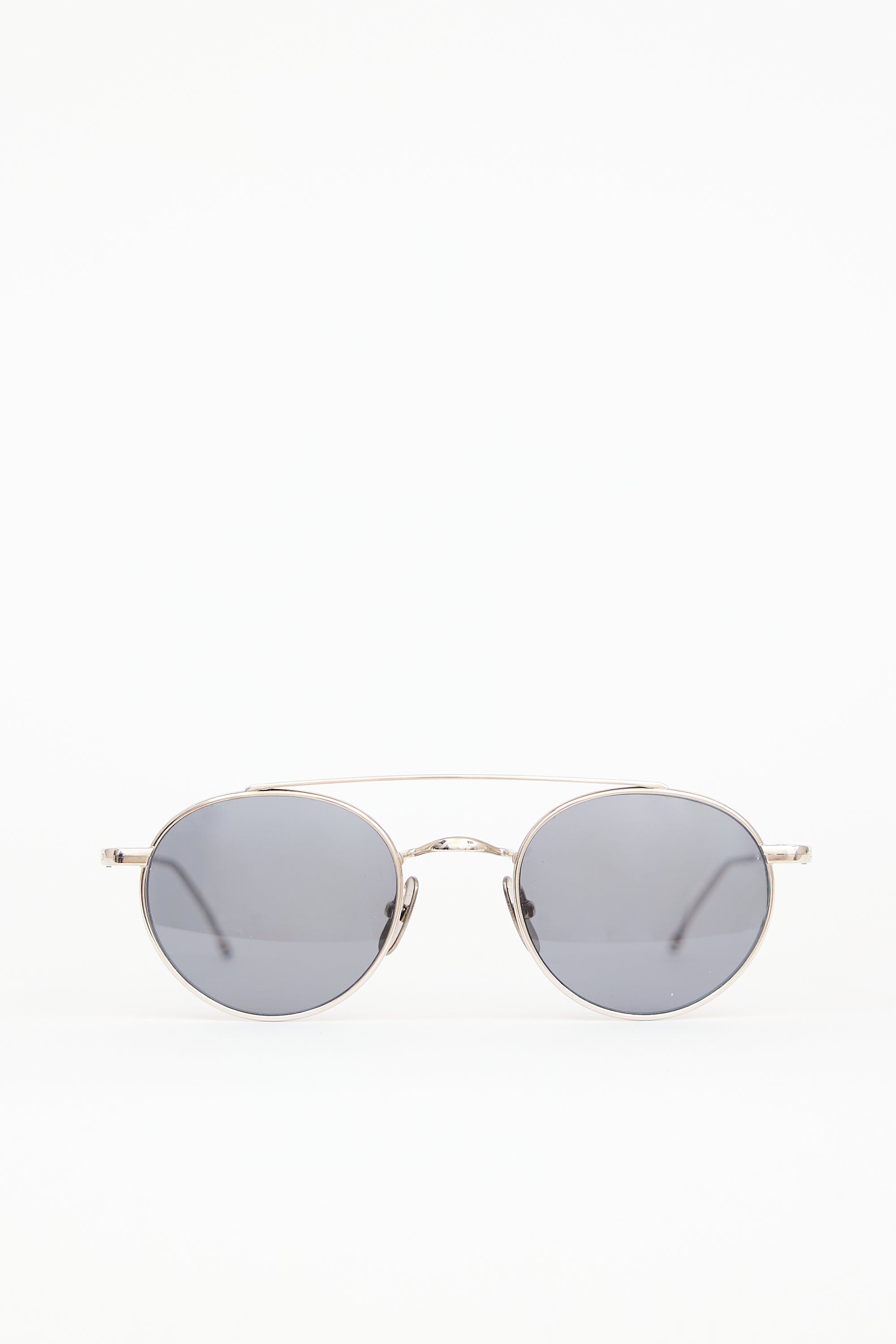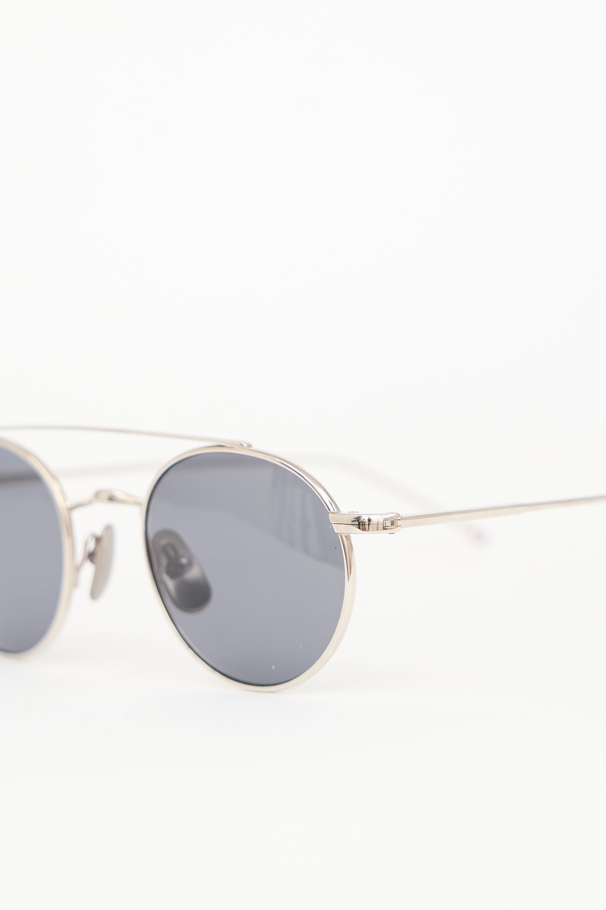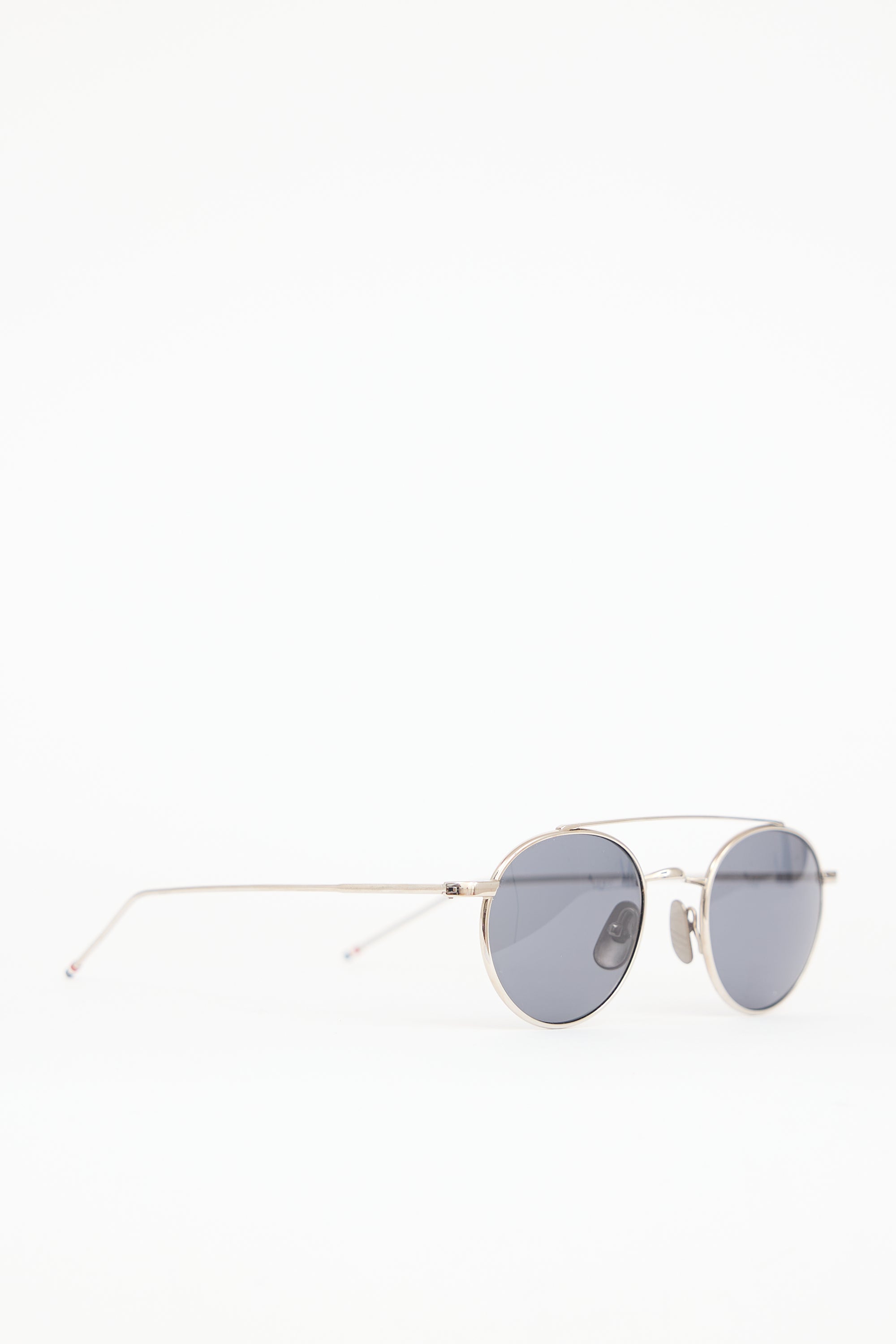 Pre-owned Thom Browne TB101 sunglasses featuring blue tinted lenses, silver tone wire aviator frame, and tricolour arm tips. Comes with original box and wipe cloth.
