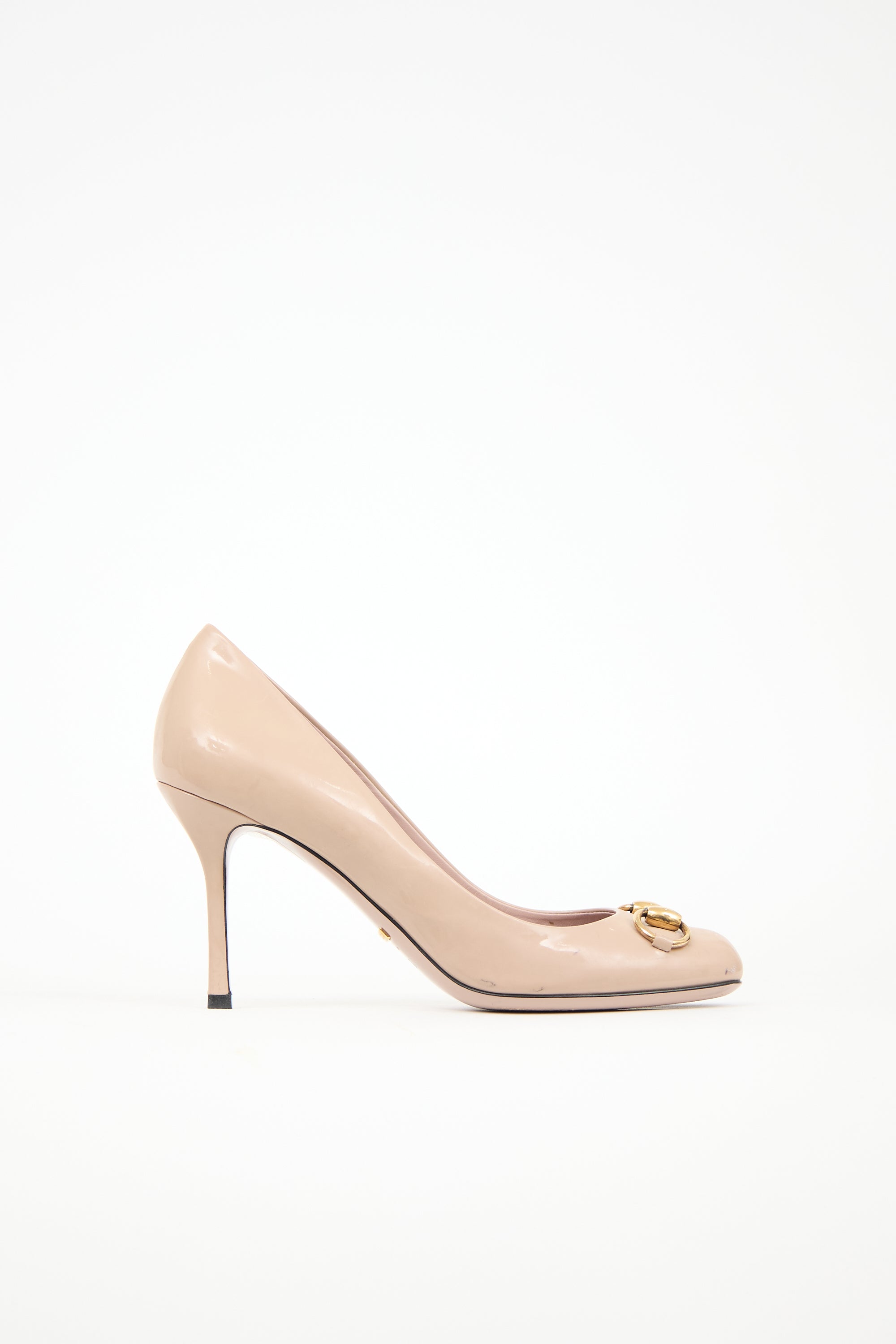 Pre-owned Gucci beige patent leather pumps featuring square toe, gold tone Horsebit embellishment at vamp, and covered stiletto heel.
