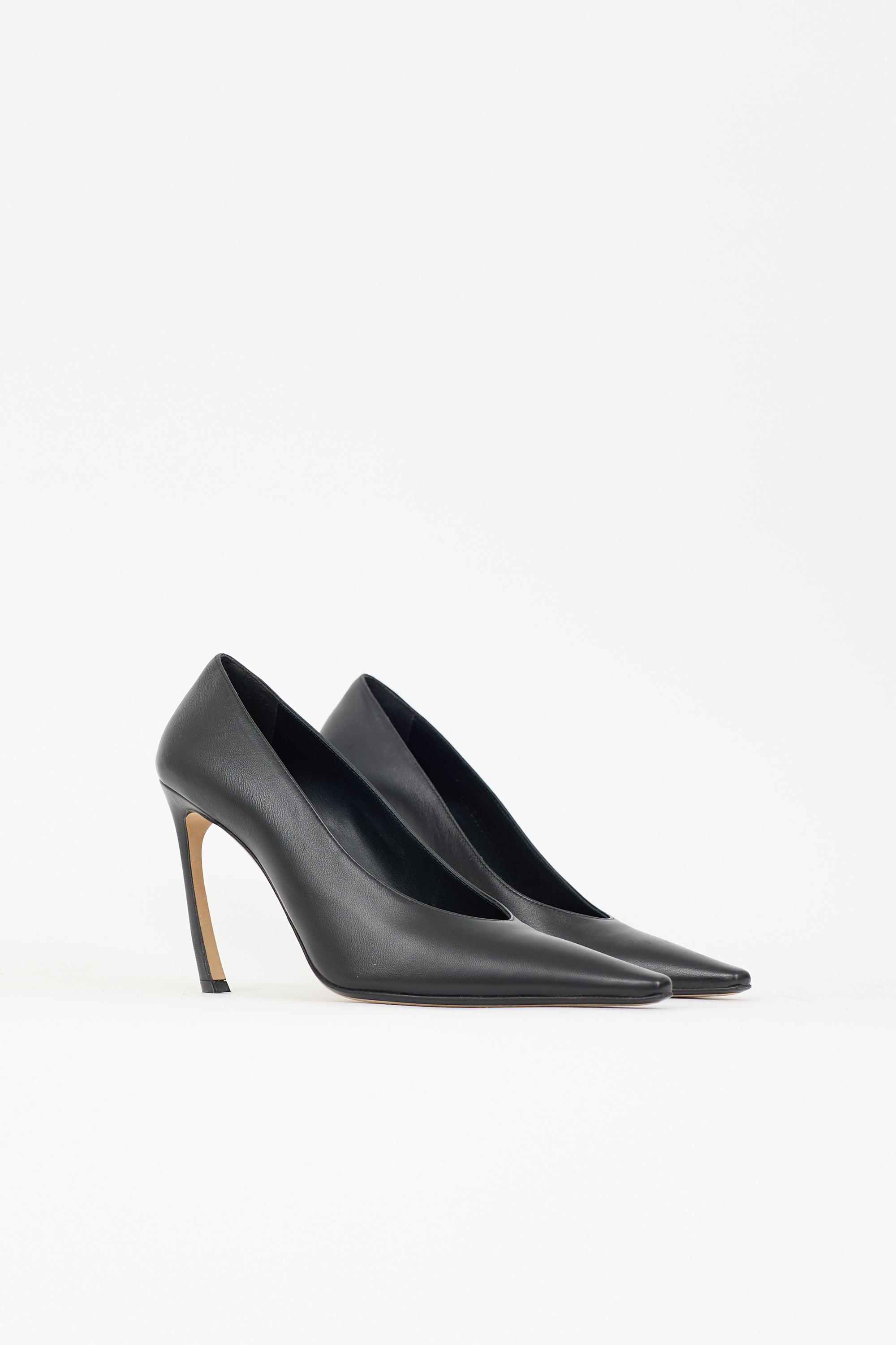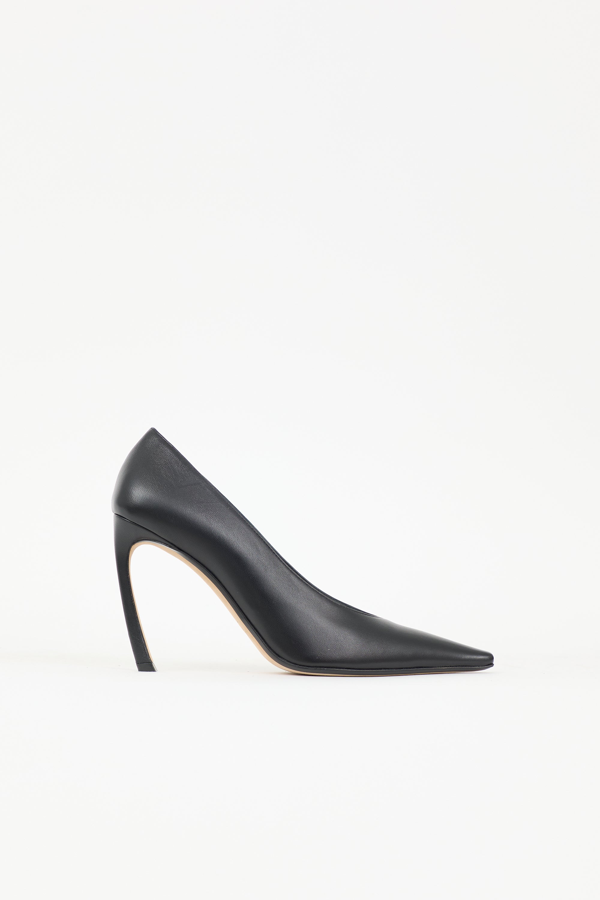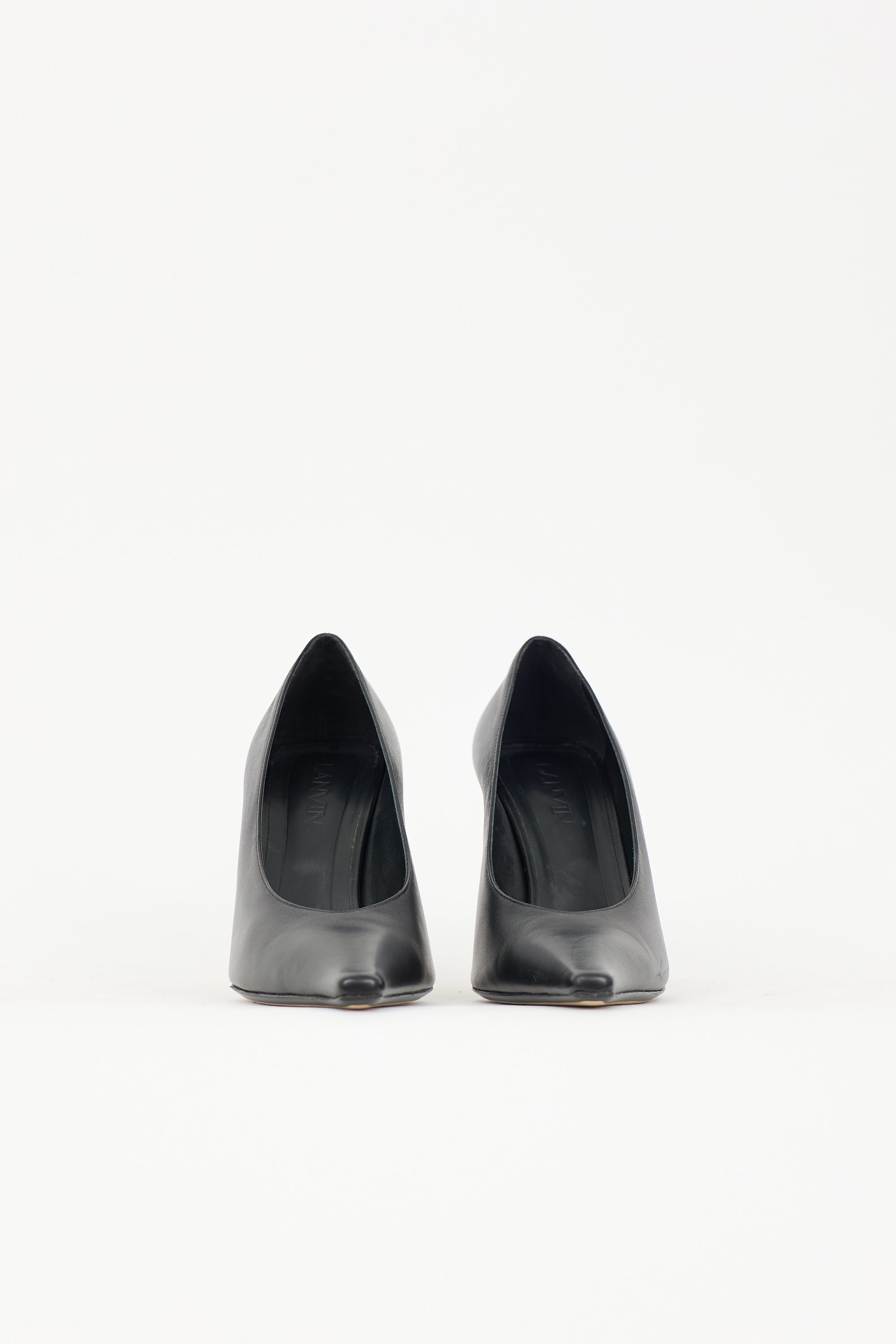 Pre-owned Lanvin black leather Swing pumps featuring a pointed square toe, slip on entry, and sculptural curved stiletto heel. Comes with original dust bag and box.