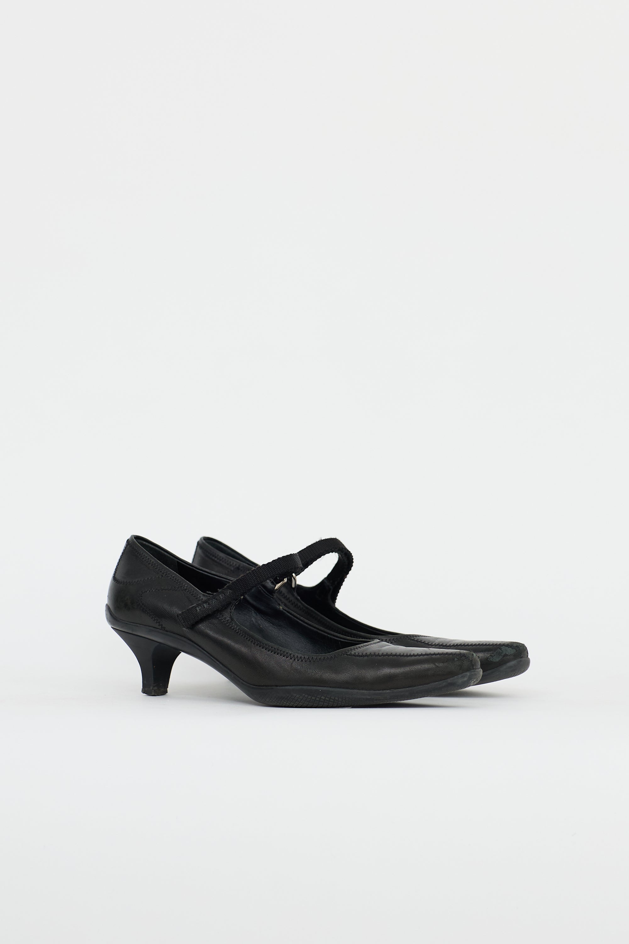 Pre-owned Prada Sport 1900s black leather mary jane pumps featuring an almond toe, tonal topstitching, velcro strap across instep with logo, and rubber sole with debossed logo at heel.
