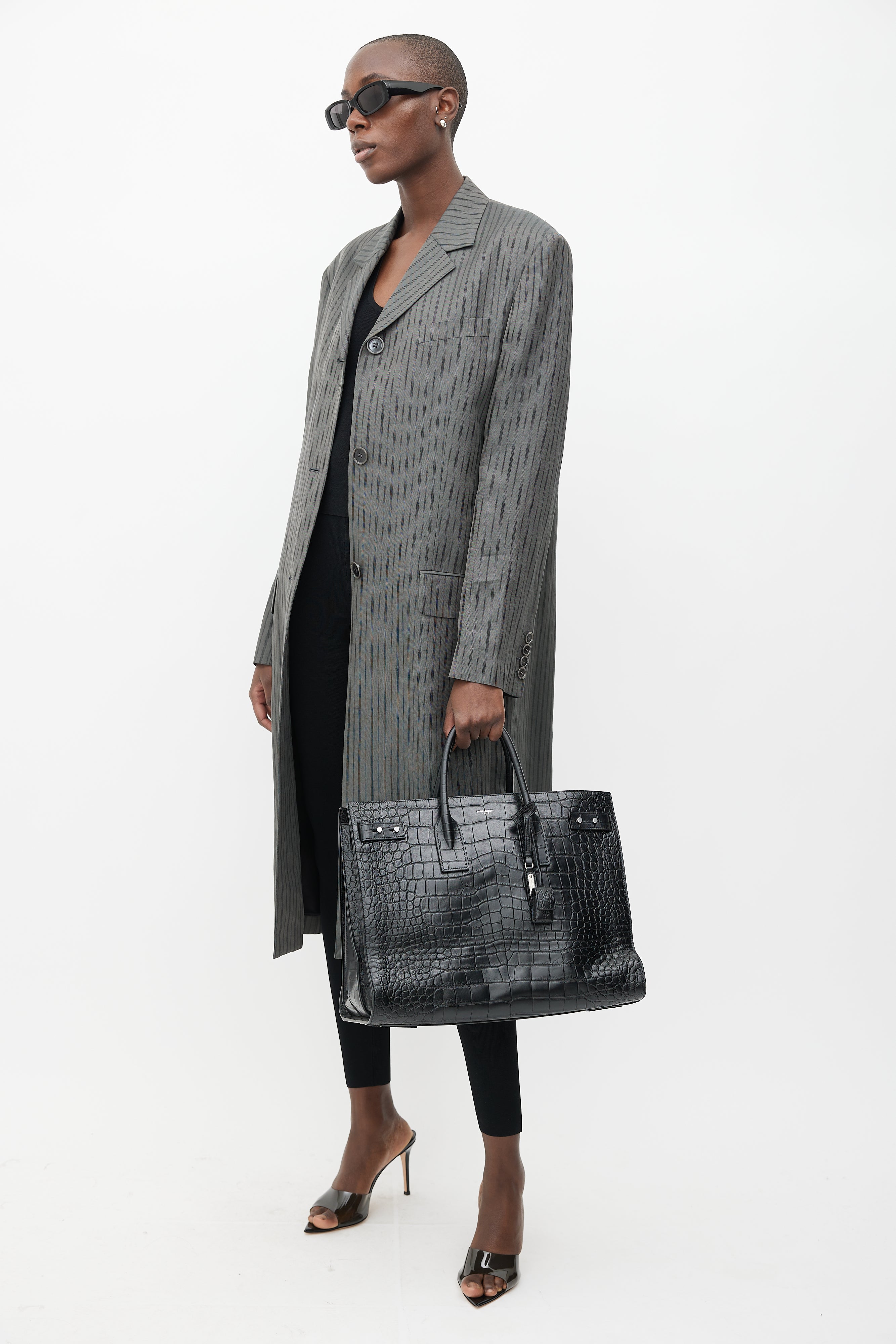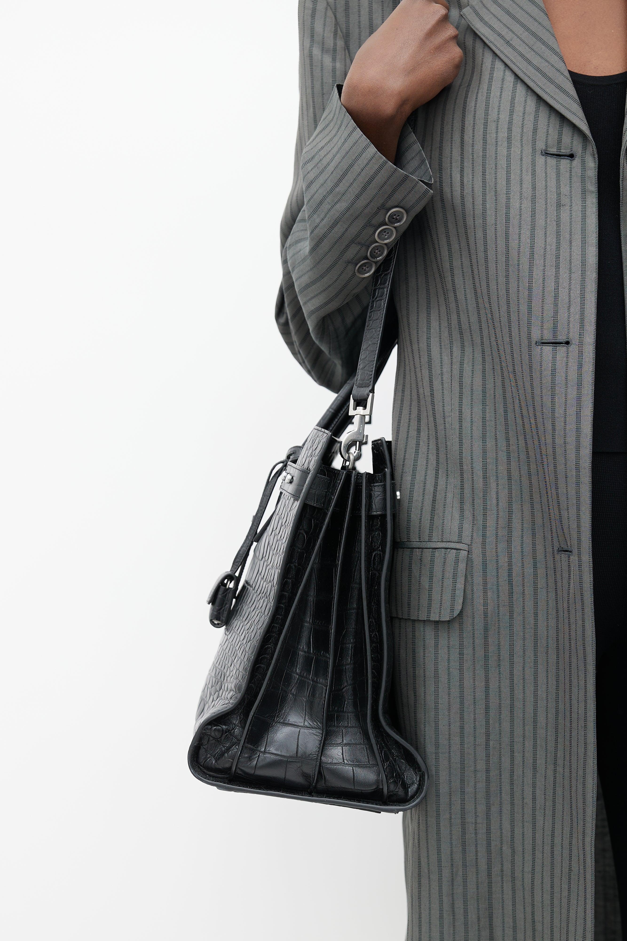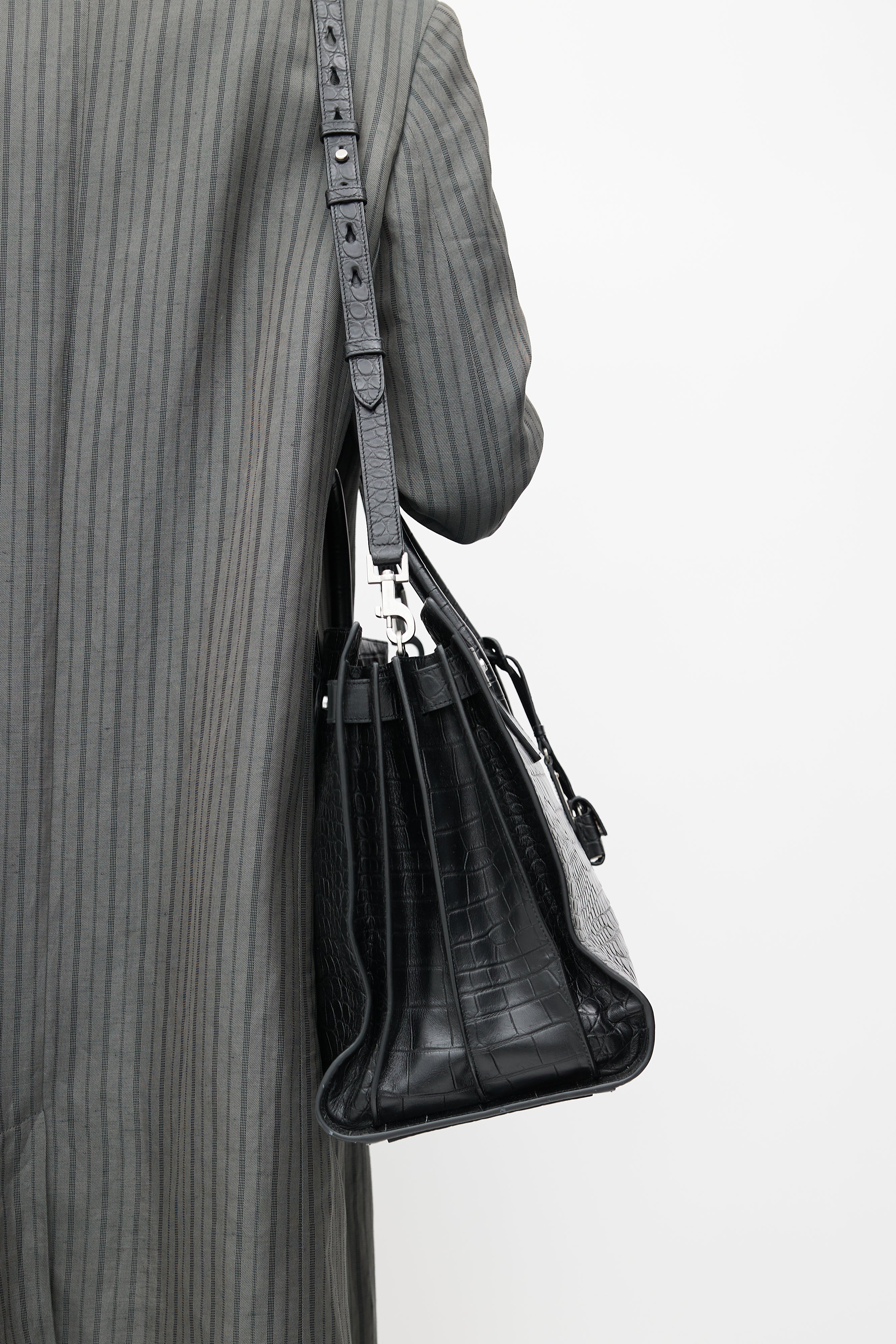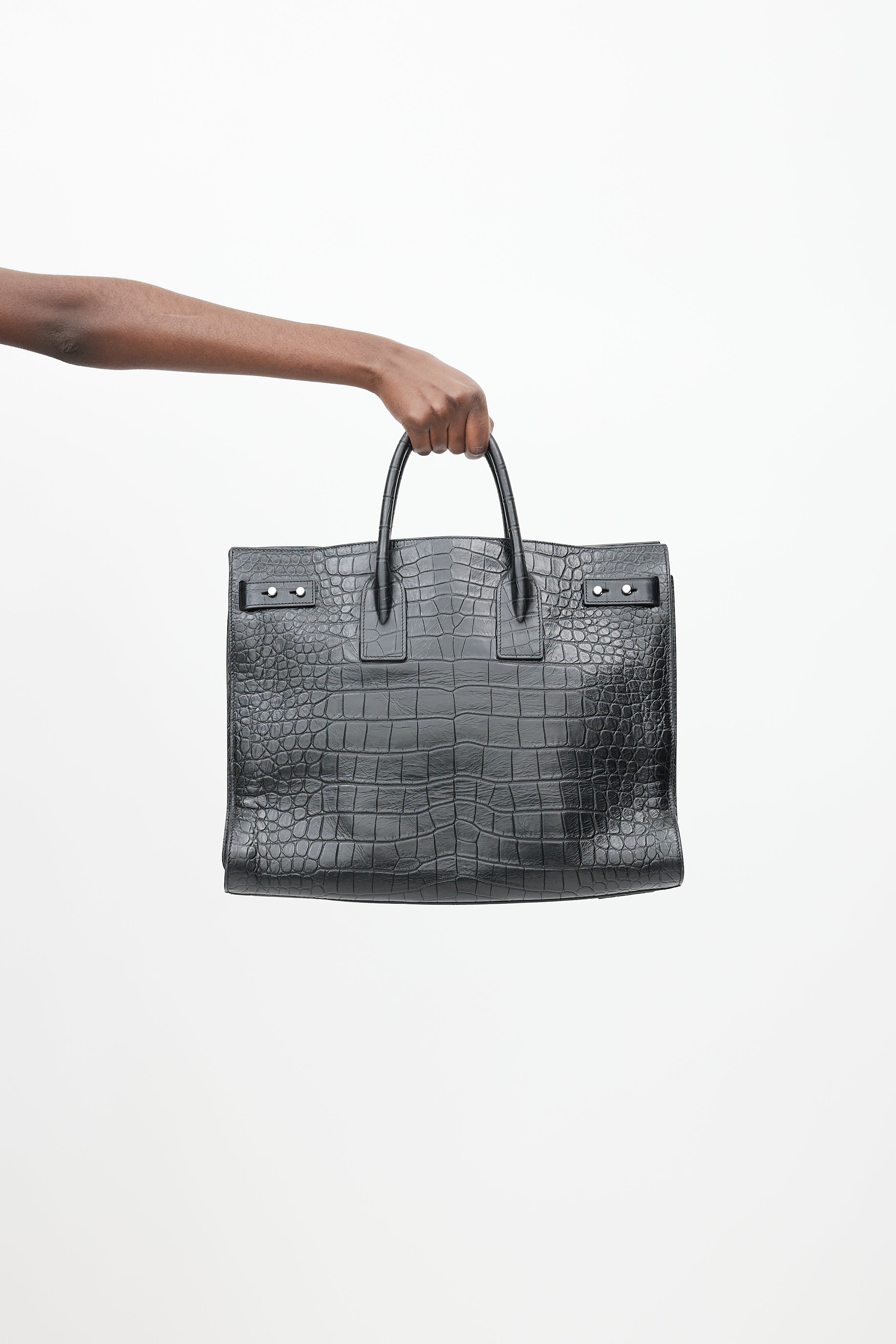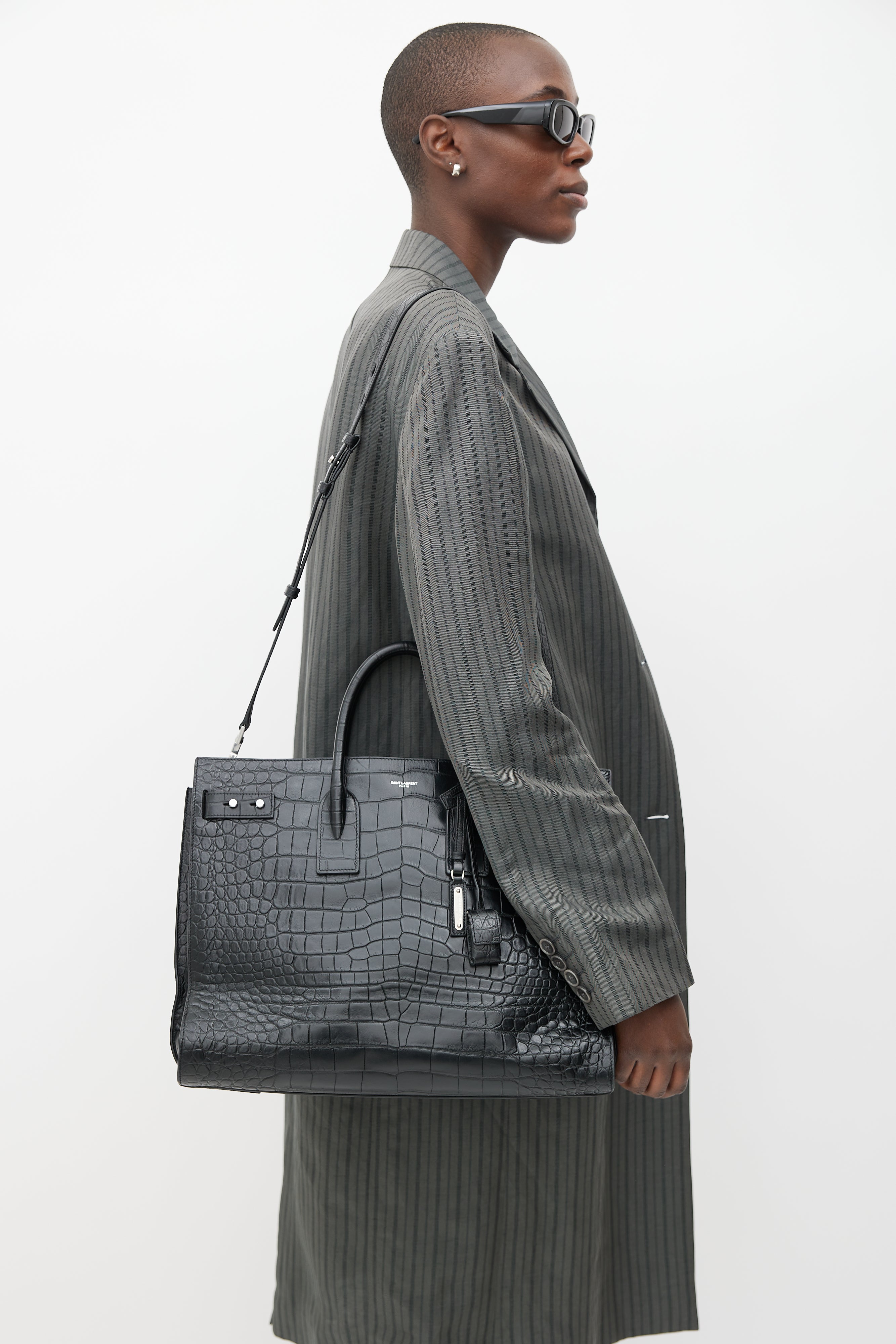 Pre-owned 2018 Saint Laurent black large Sac Du Jour shoulder bag featuring croc effect leather, rolled top handles, silver tone stamped logo, detachable clochette and tag, accordion side, detachable shoulder strap, open compartment, two main compartments, and zip pocket inside. Comes with original dust bag.
