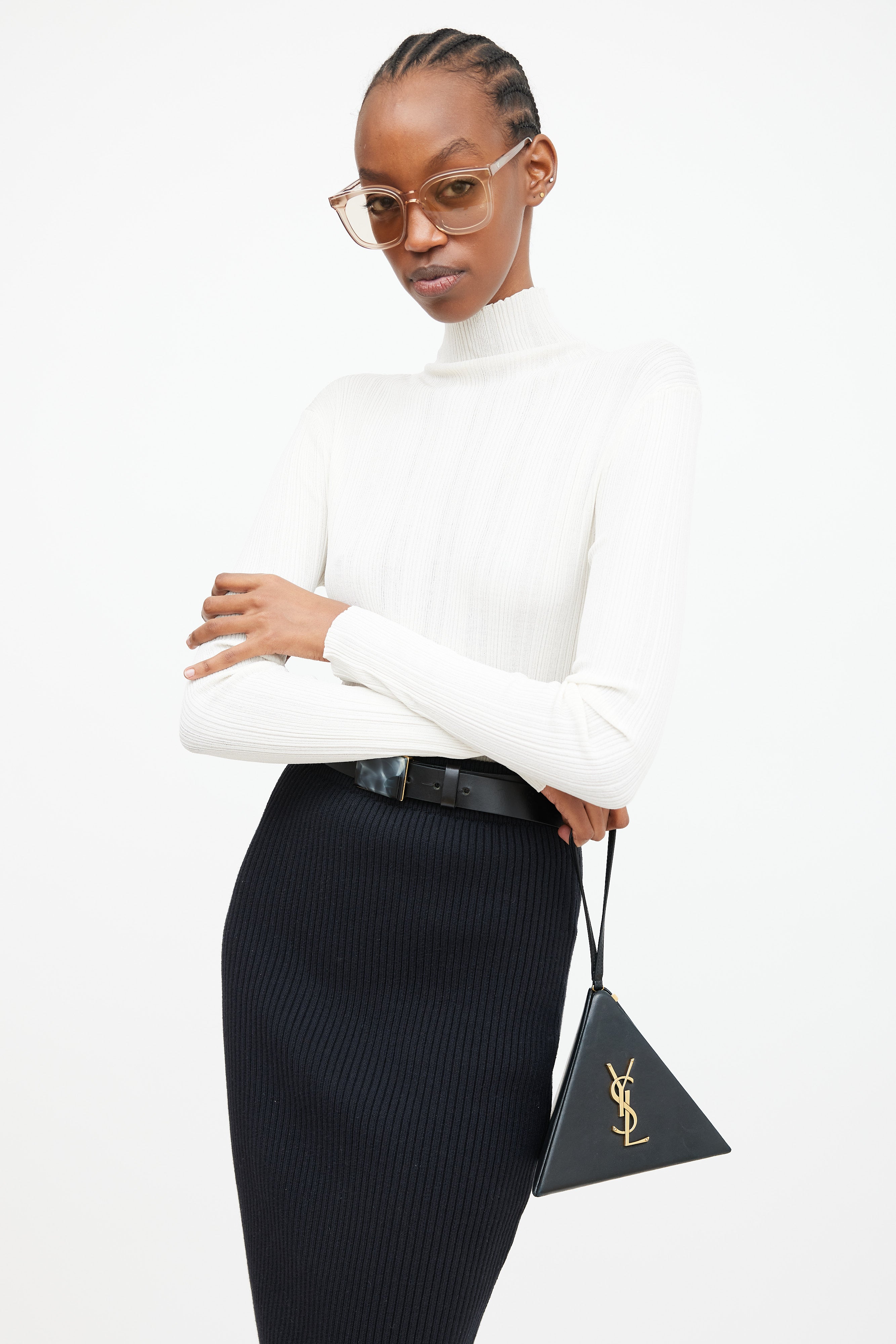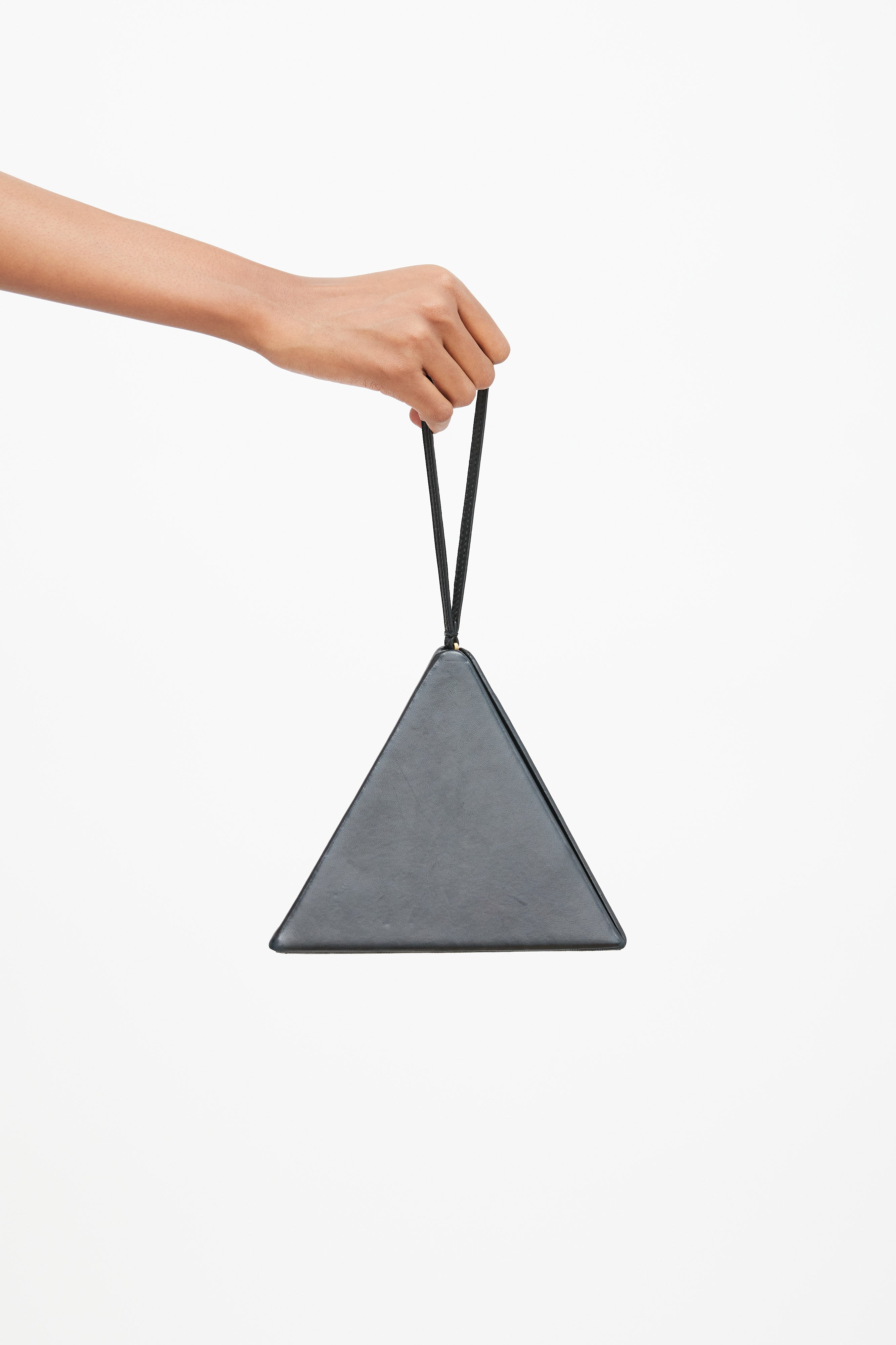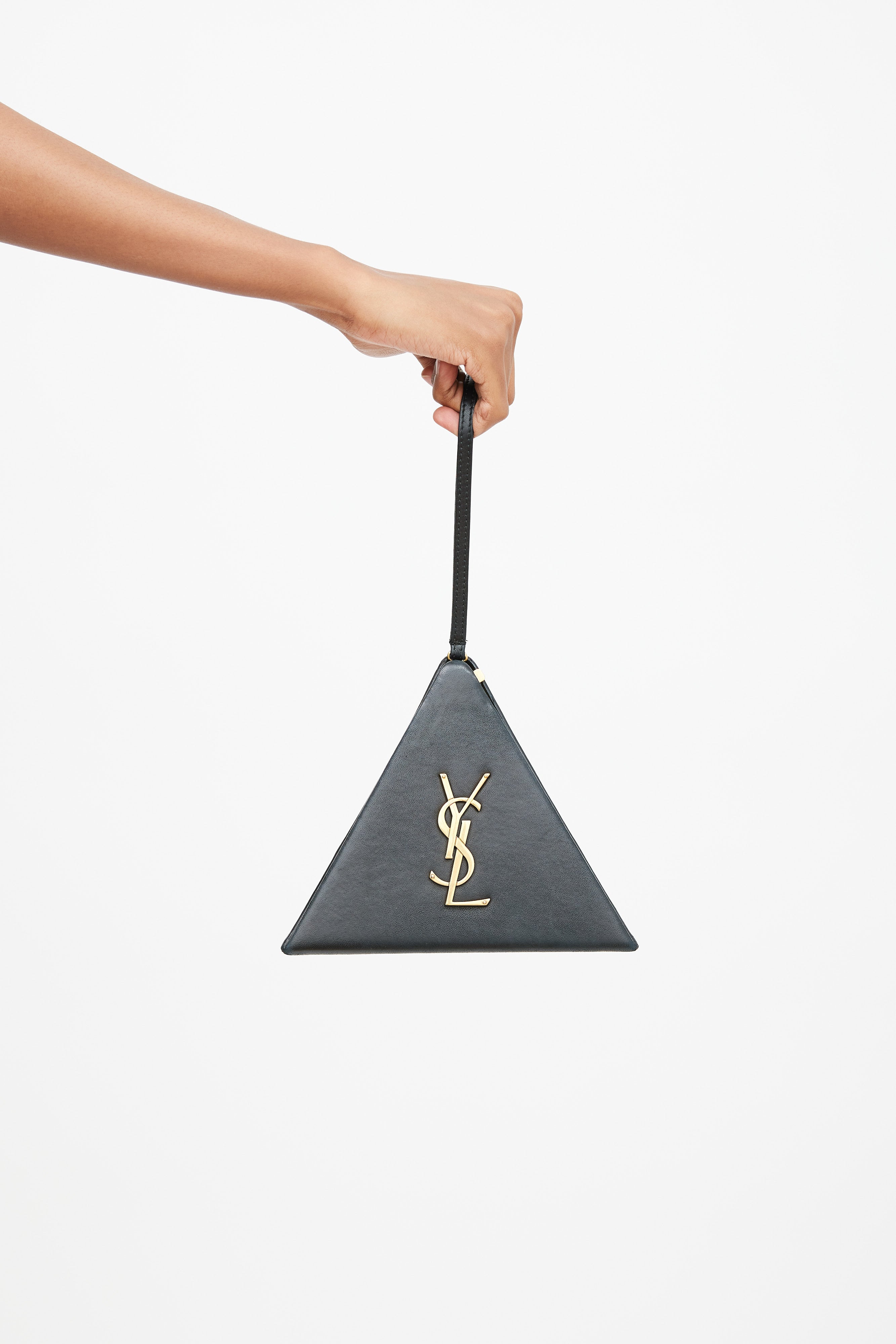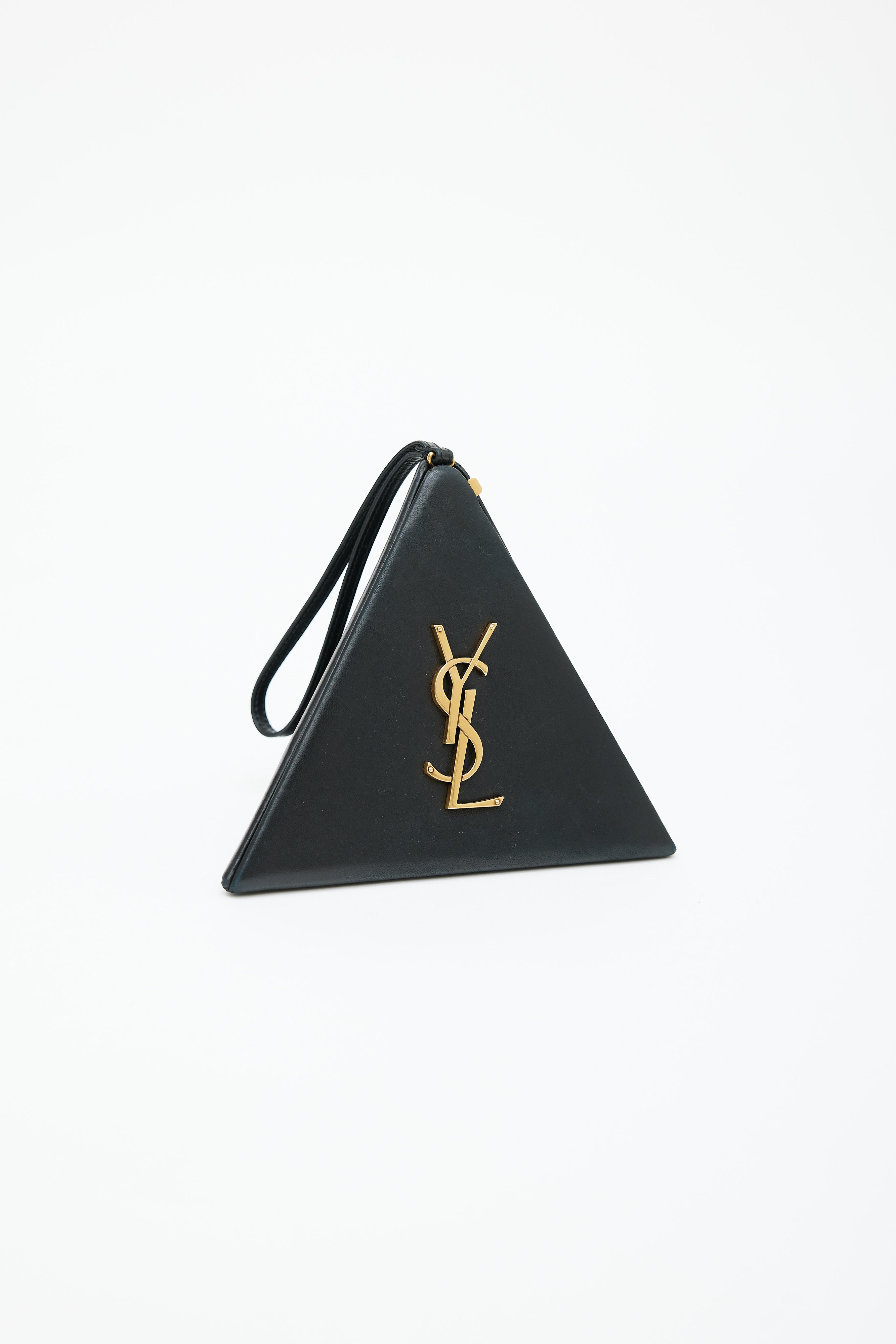 Pre-owned Saint Laurent 2018 black leather Pyramid clutch featuring fixed wristlet, gold tone Cassandre logo hardware at front, metal protective feet, push lock closure, gold tone engraved logo plaque at closure, and one main compartment.
