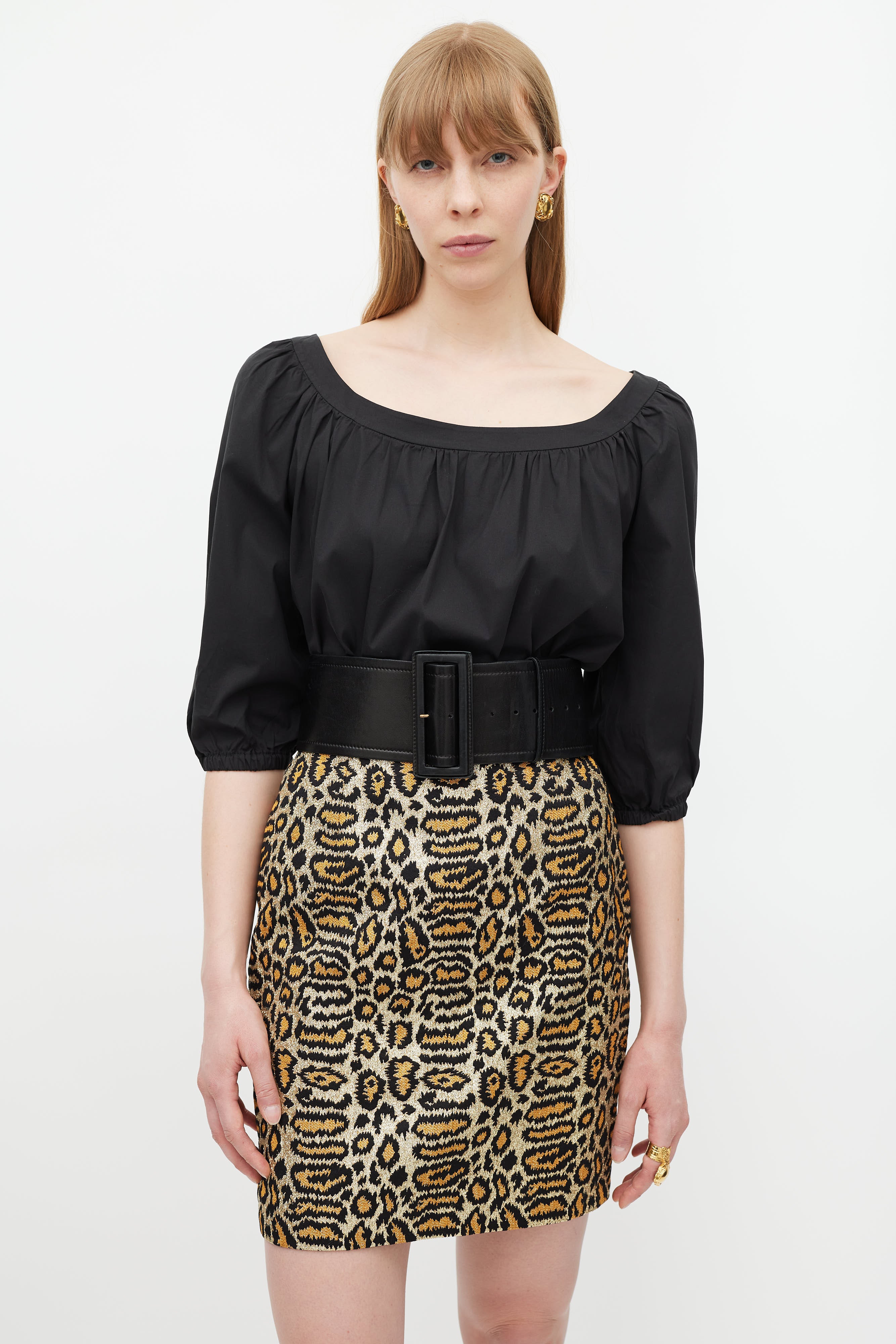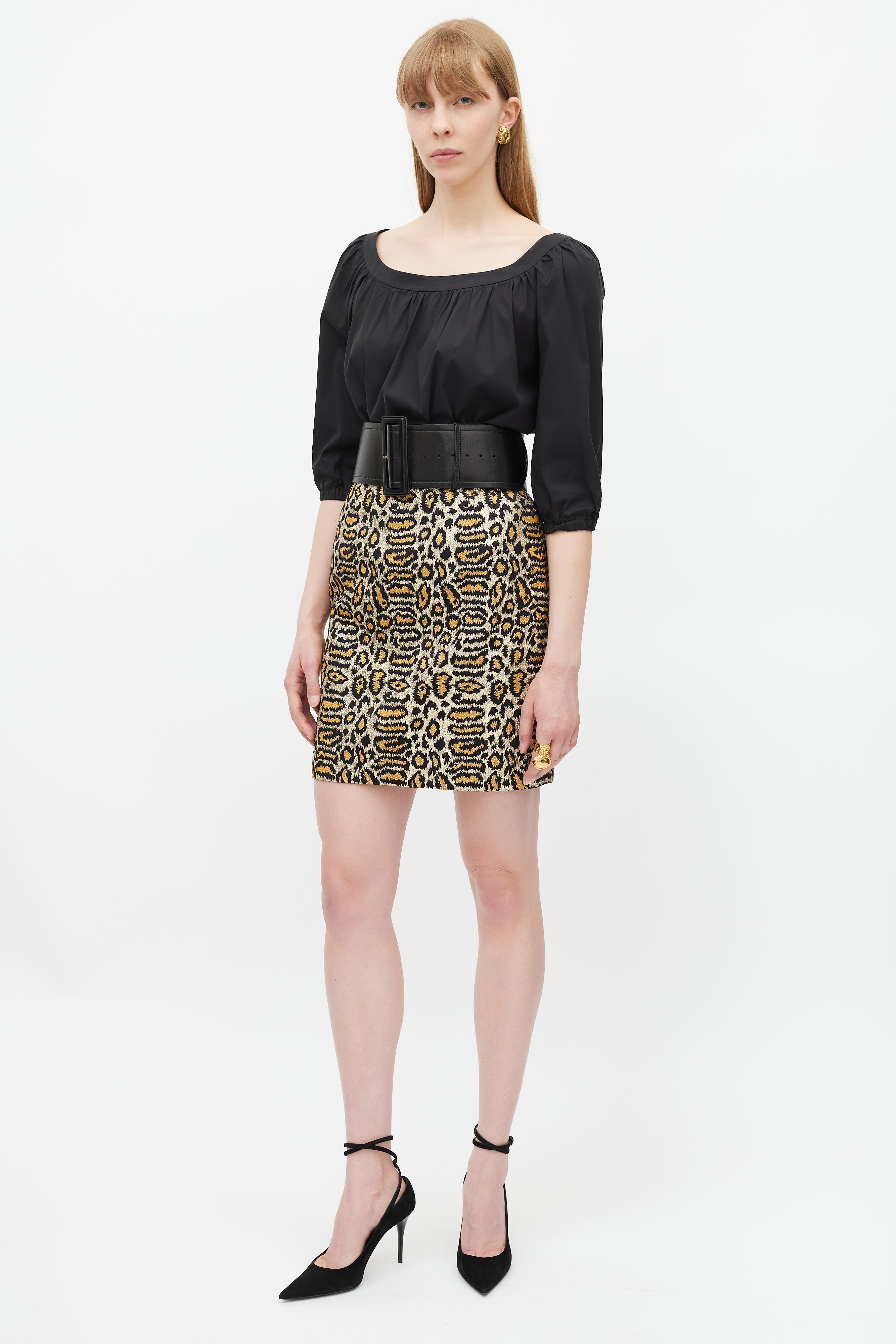 Saint Laurent beige metallic skirt featuring a black leopard pattern throughout, and zip at back with hook and eye closure. Lined.