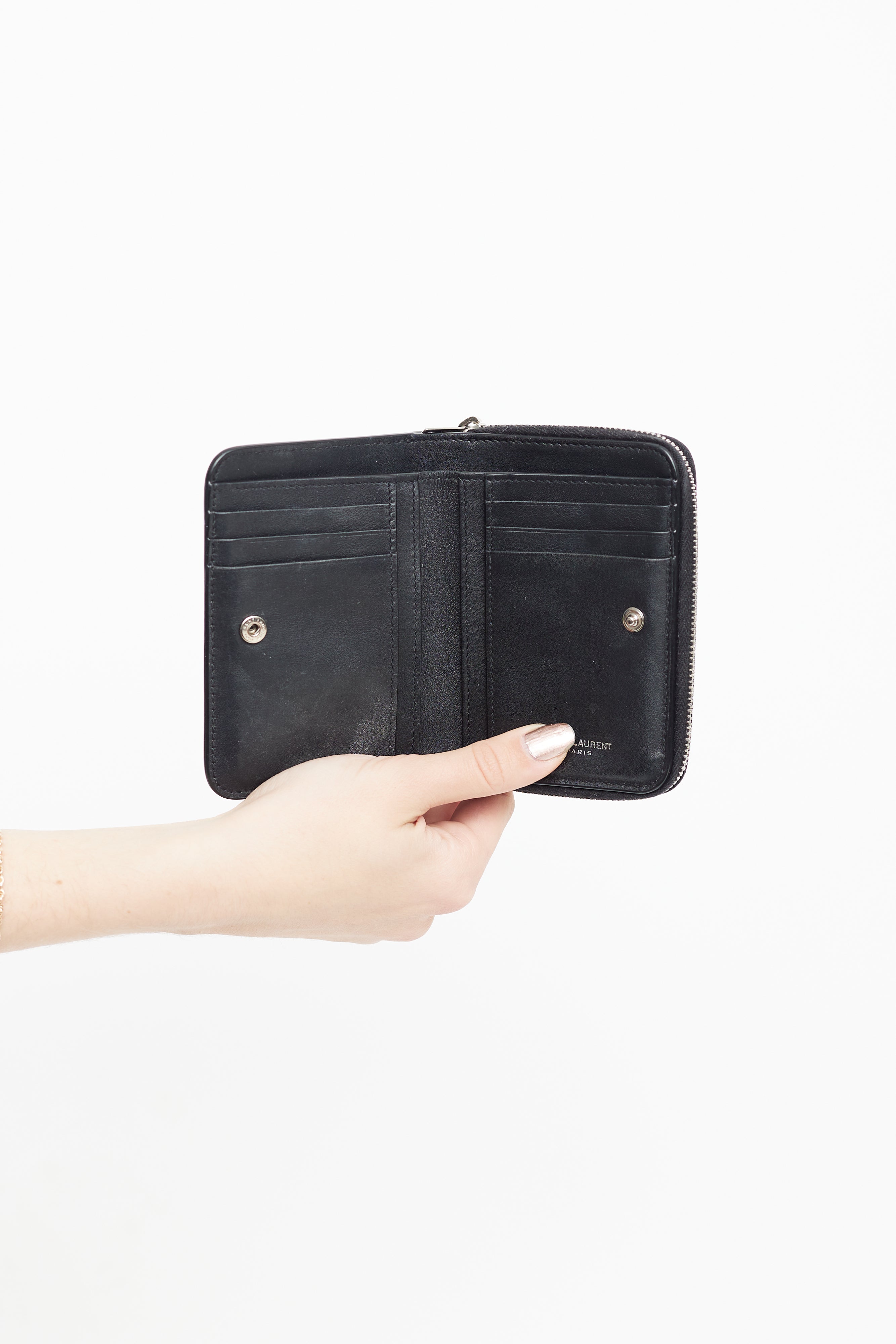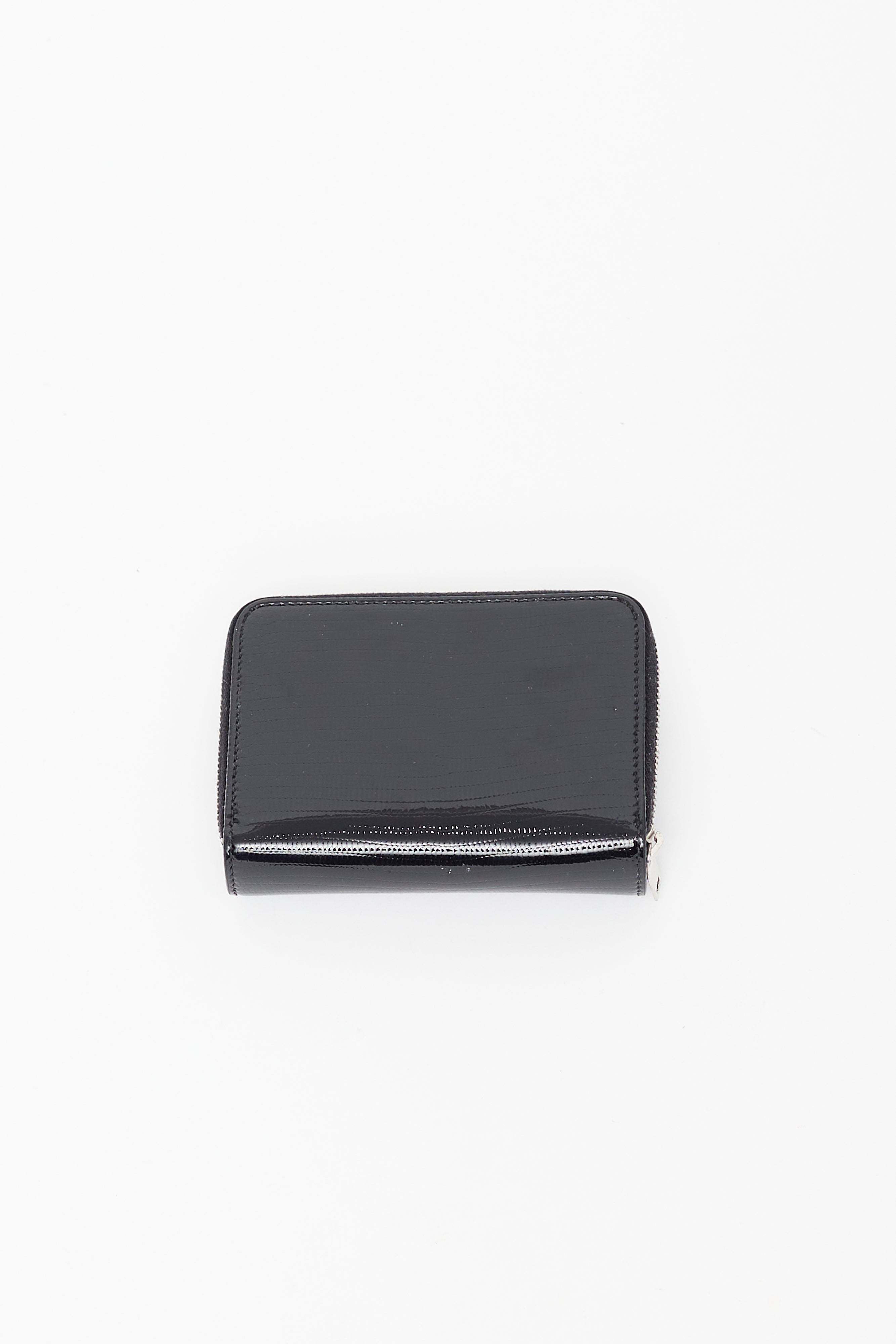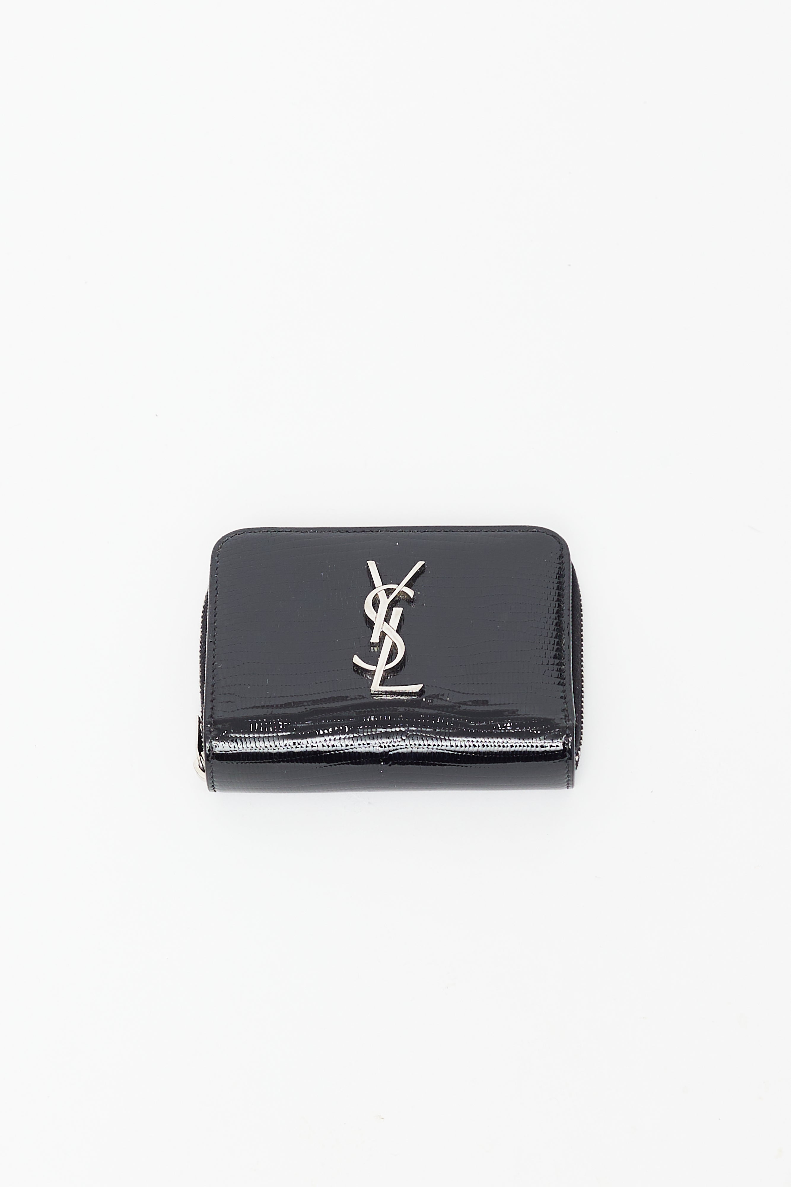 Pre-owned Saint Laurent black croc embossed patent leather wallet featuring silver tone YSL logo hardware at face, snap closure, six card slots, four slip pockets, large slip pocket at side and zip pocket with large gusset pouch. Comes with original box.