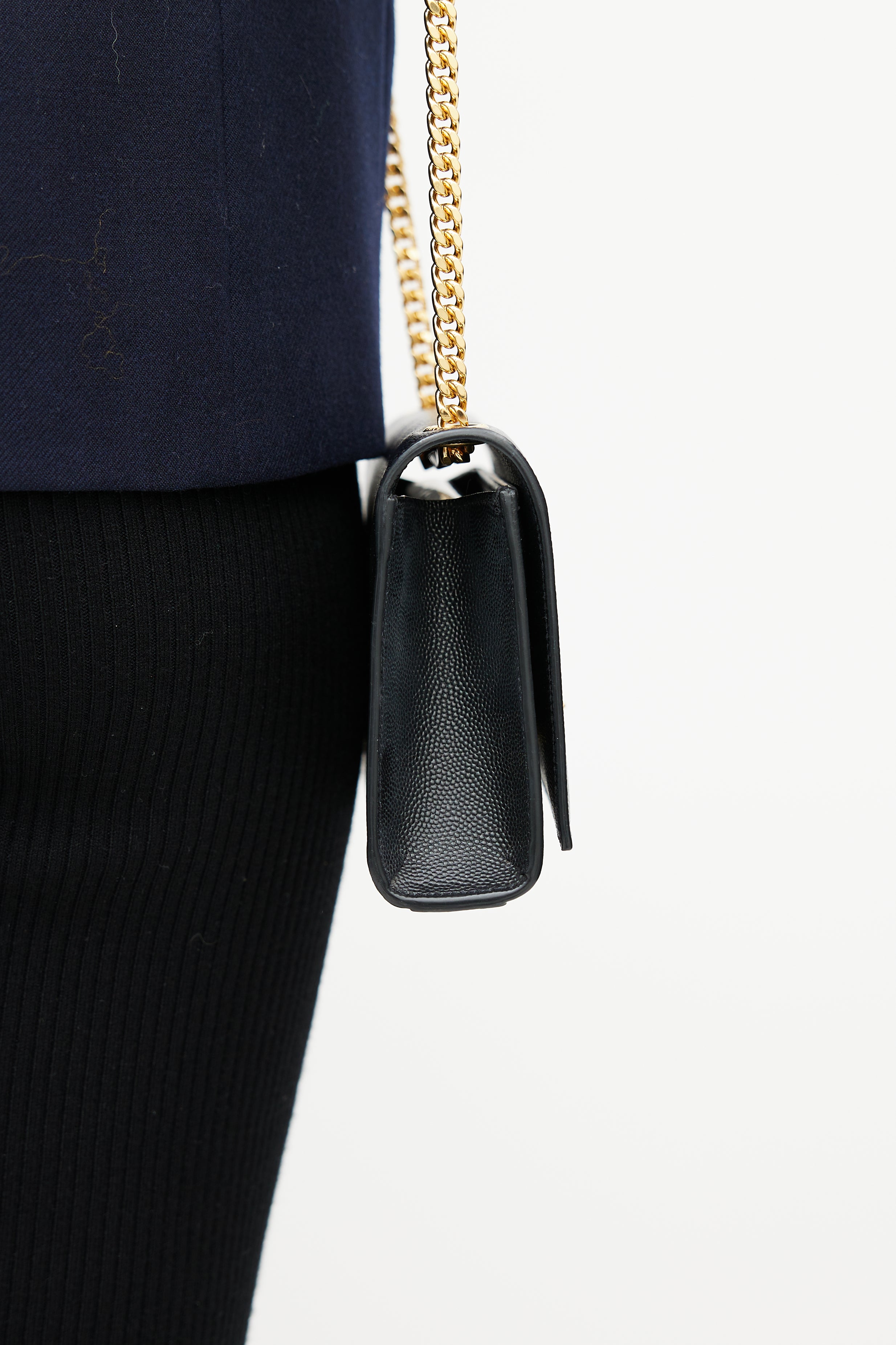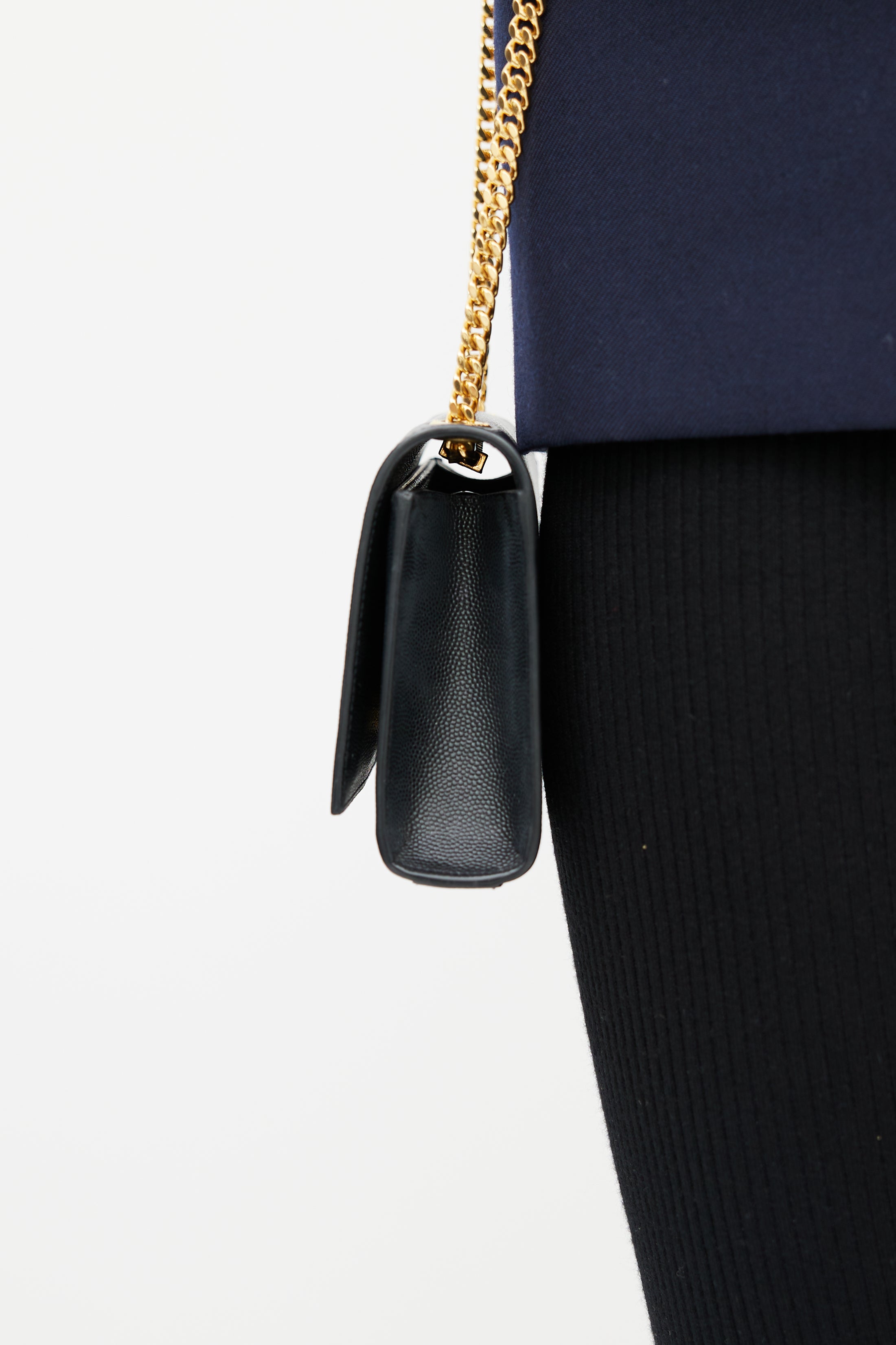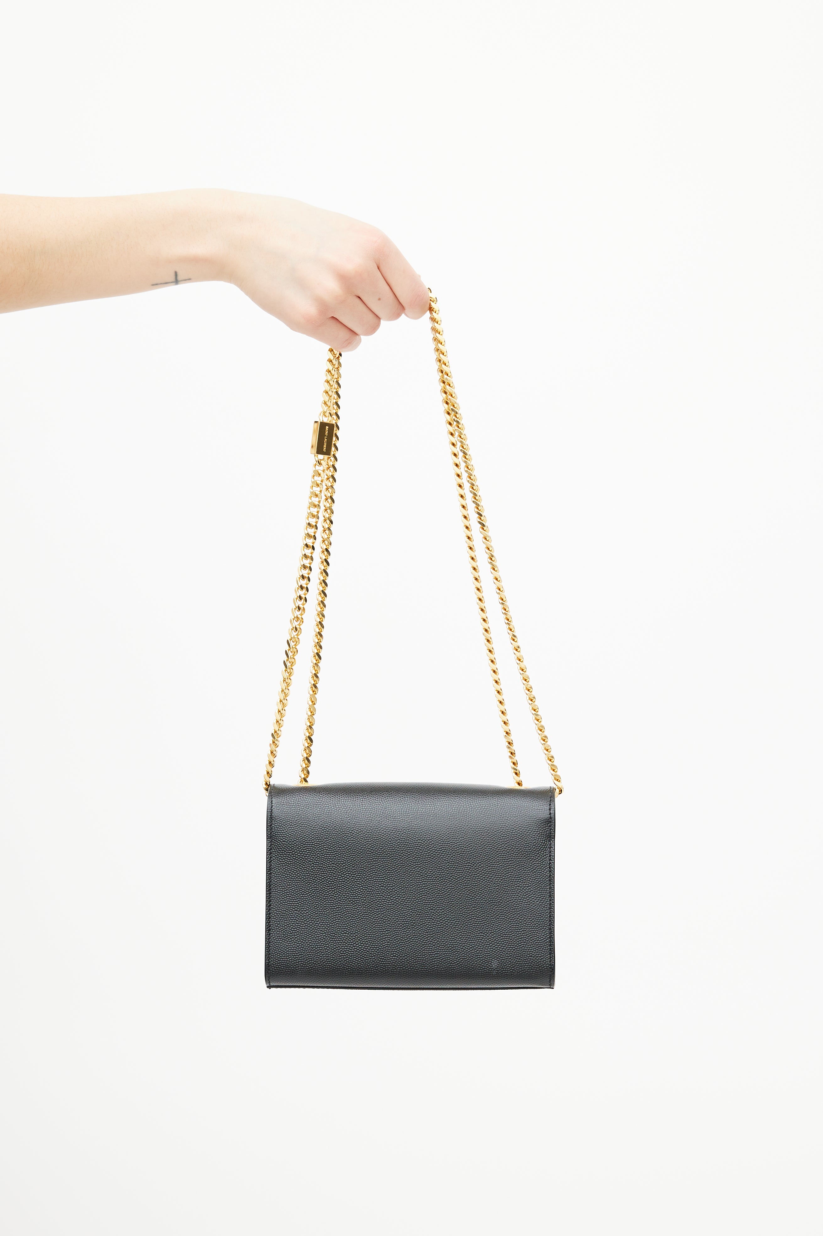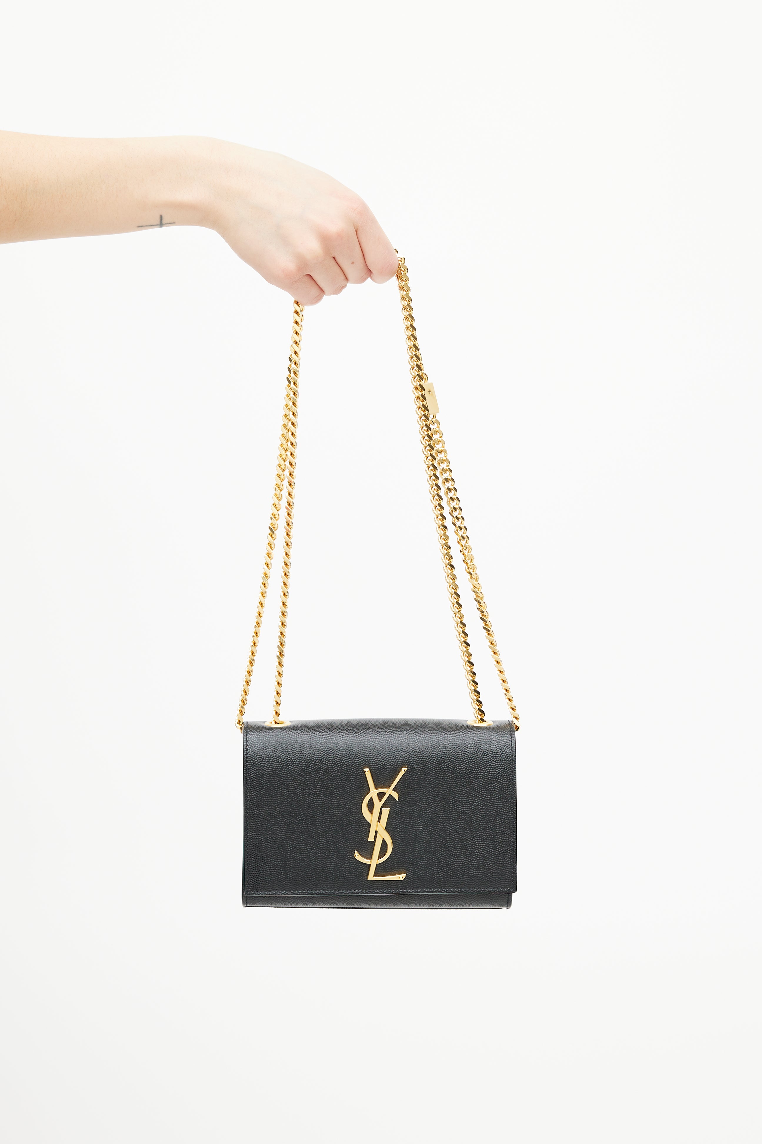 Pre-owned Saint Laurent black Classic Kate bag in embossed grain de poudre leather featuring a top flap with gold tone Cassandre logo hardware, one main compartment with one slip pocket, gold tone chainlink shoulder strap, and magnetic snap closure. Comes with original dust bag.