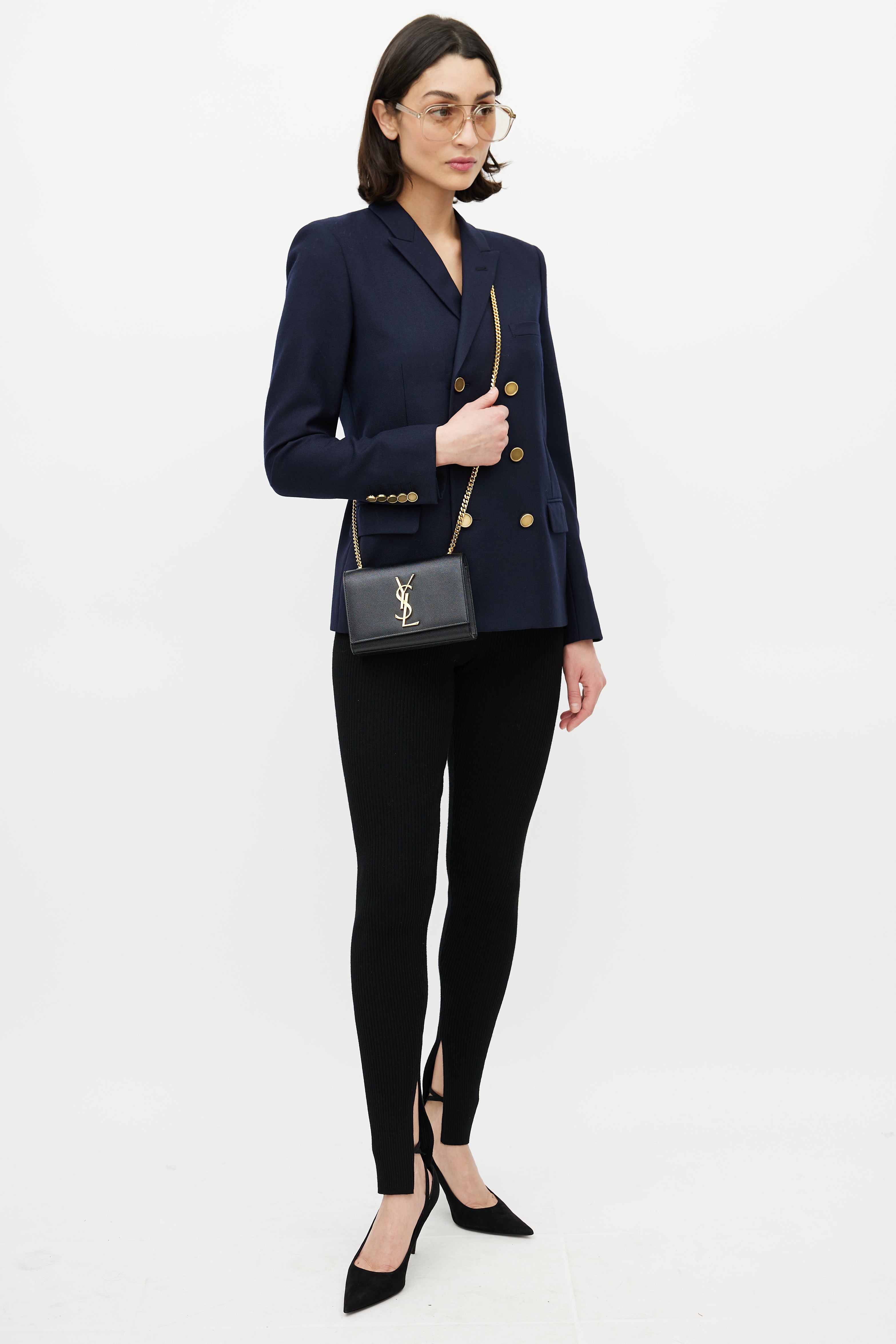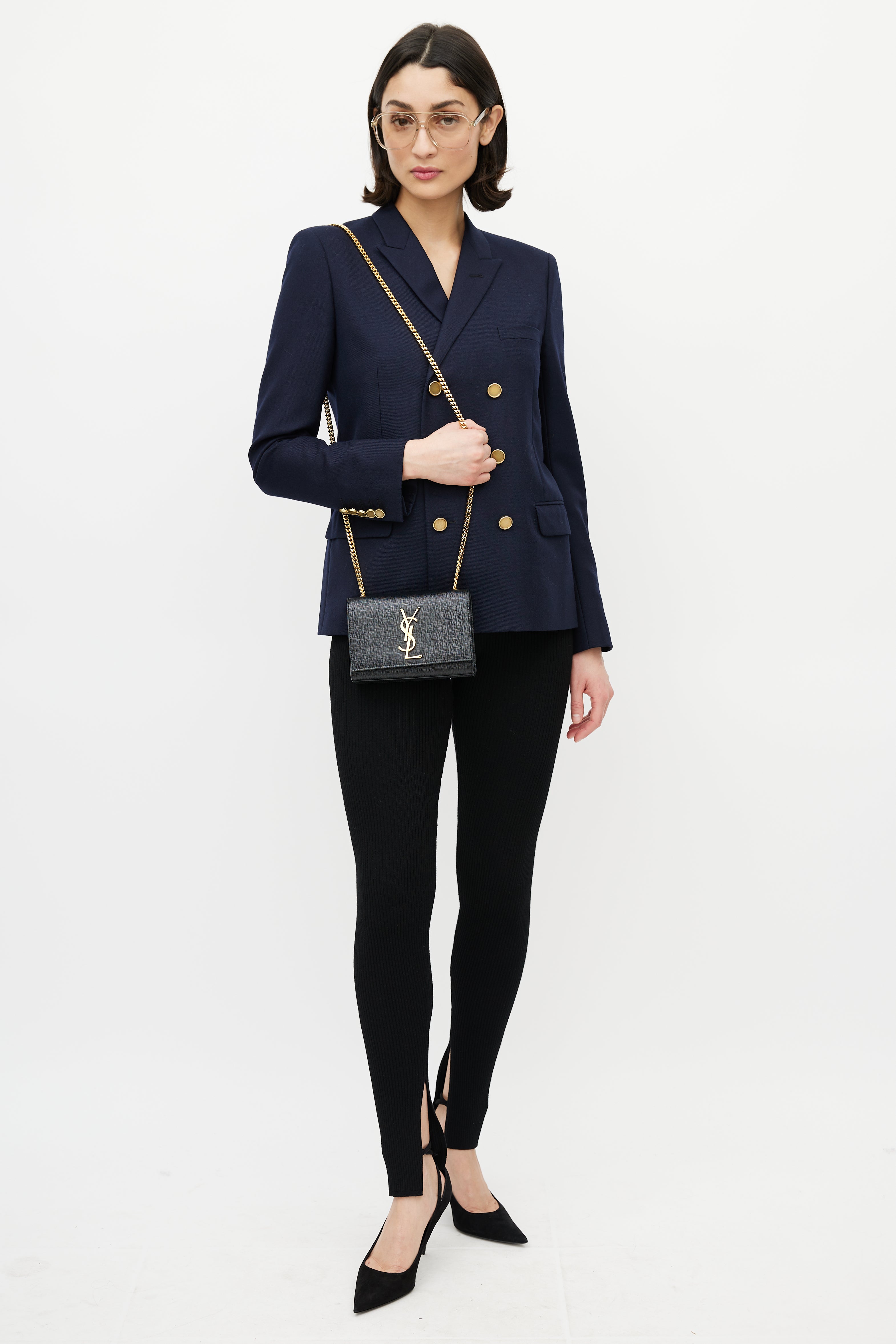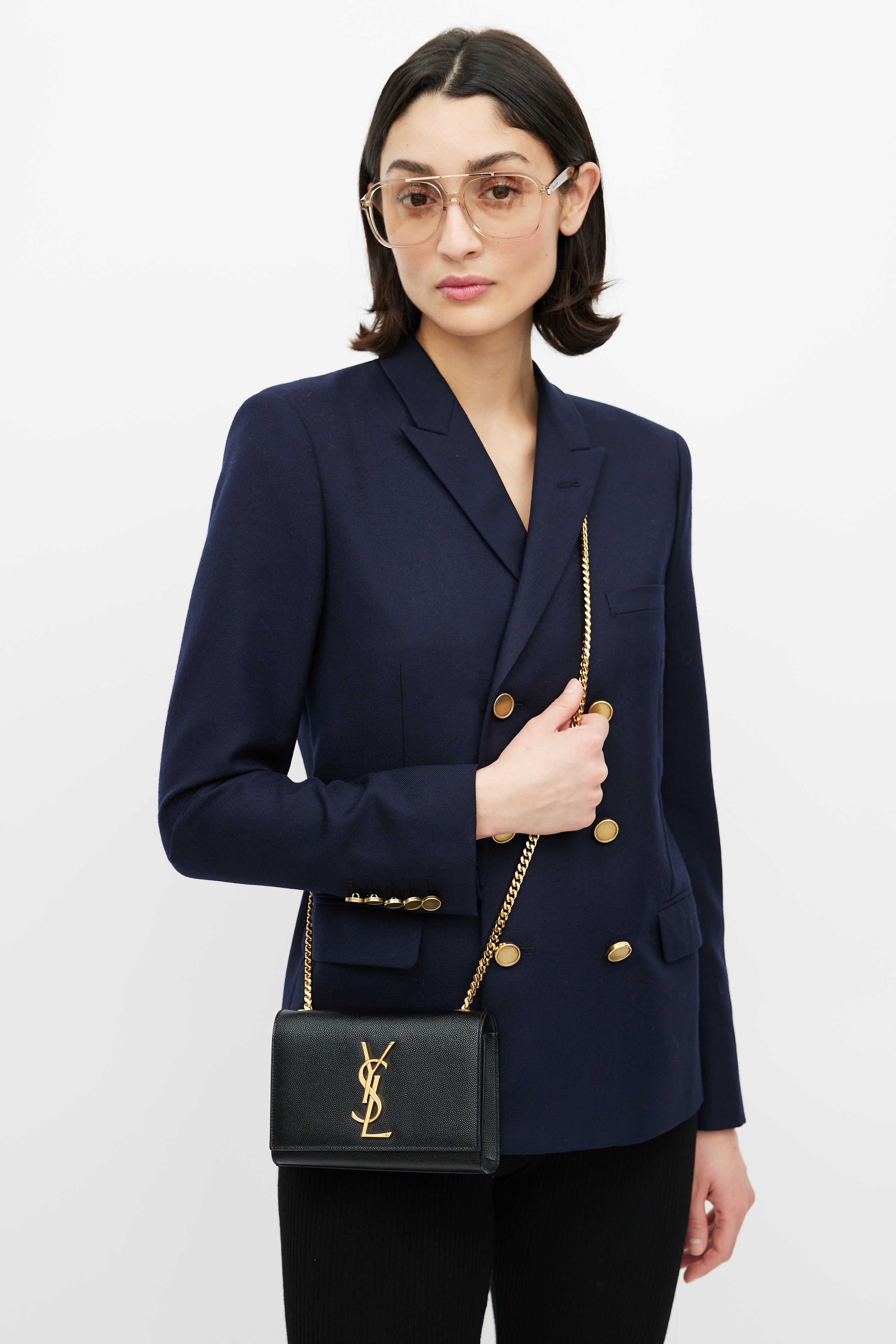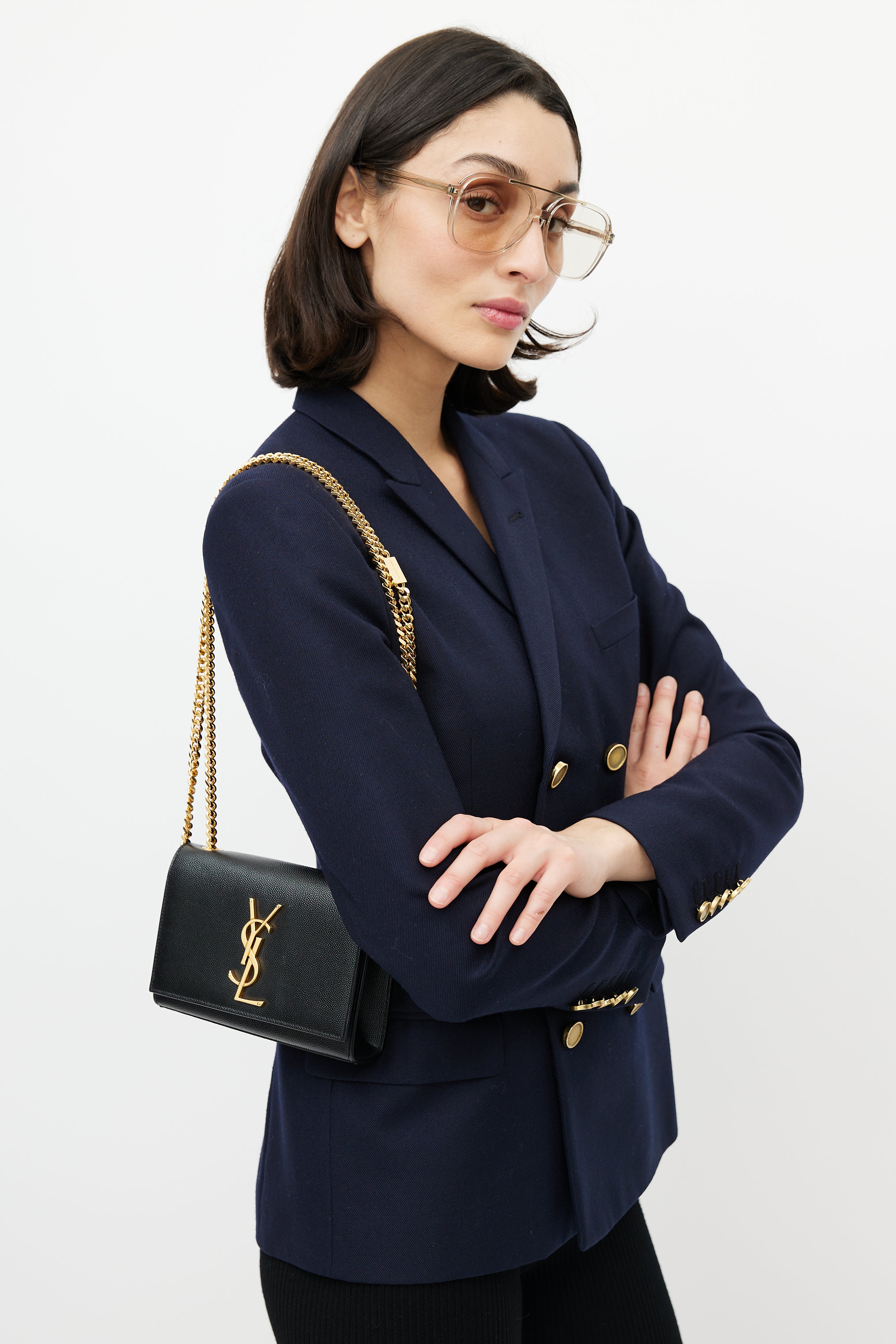 Pre-owned Saint Laurent black Classic Kate bag in embossed grain de poudre leather featuring a top flap with gold tone Cassandre logo hardware, one main compartment with one slip pocket, gold tone chainlink shoulder strap, and magnetic snap closure. Comes with original dust bag.