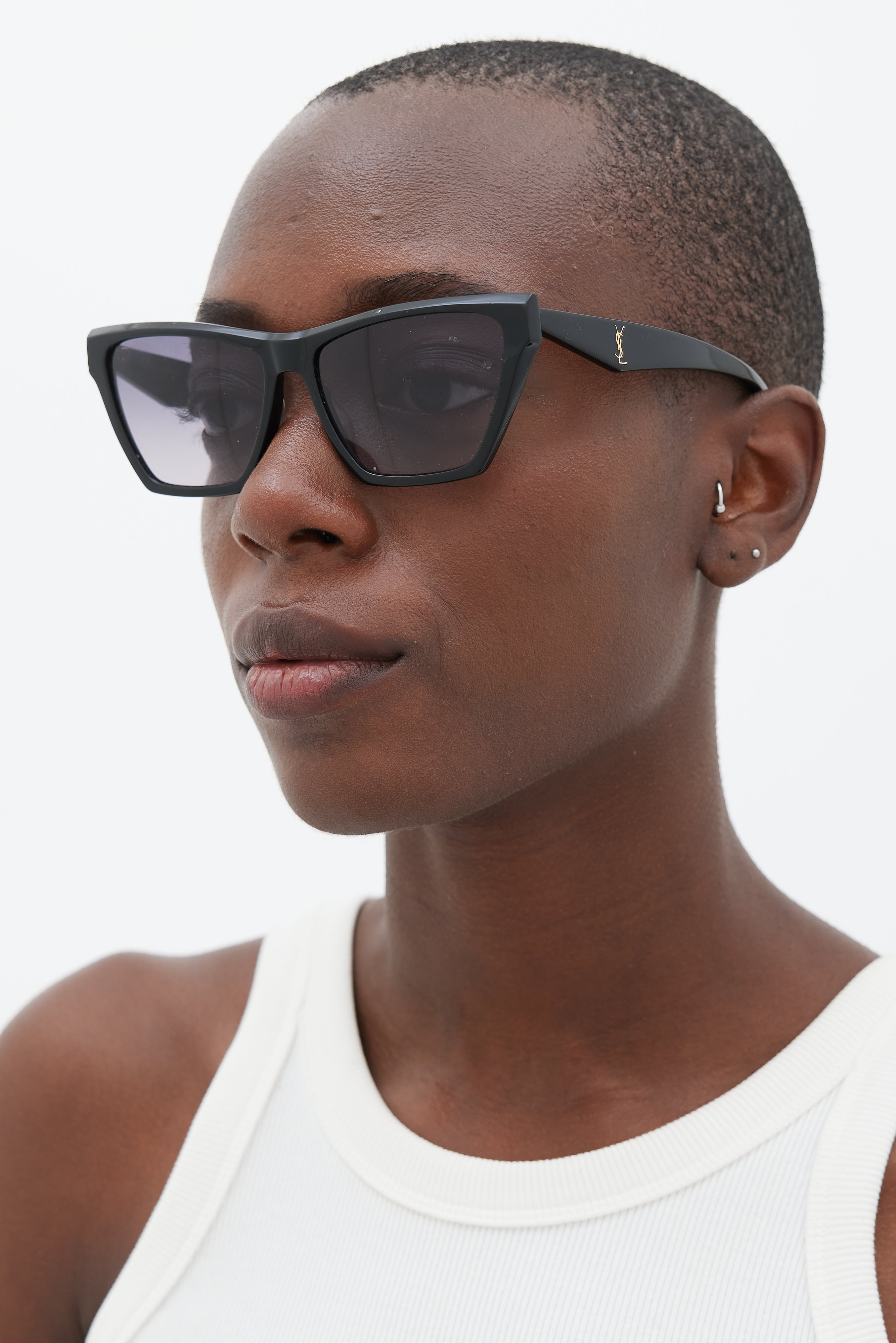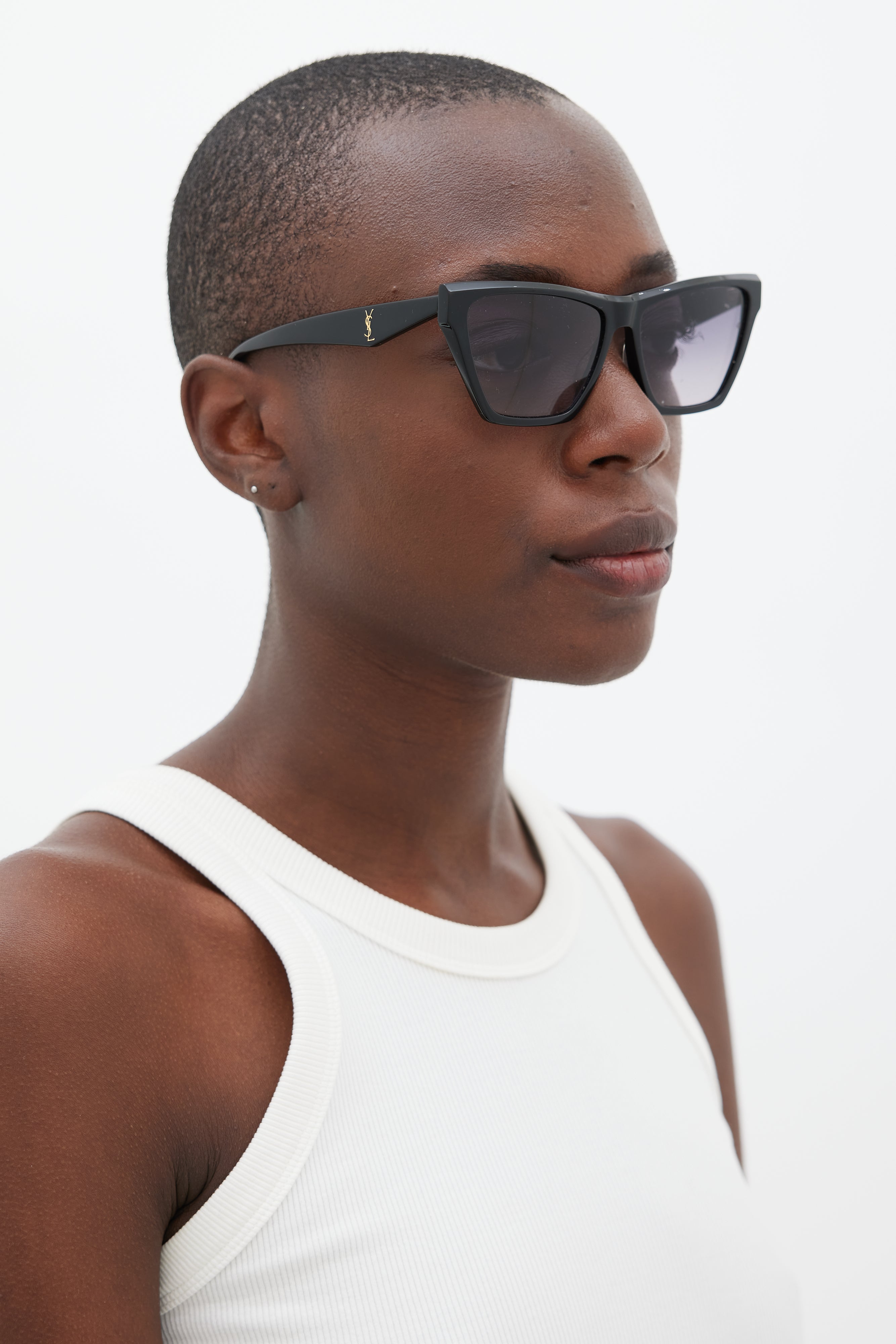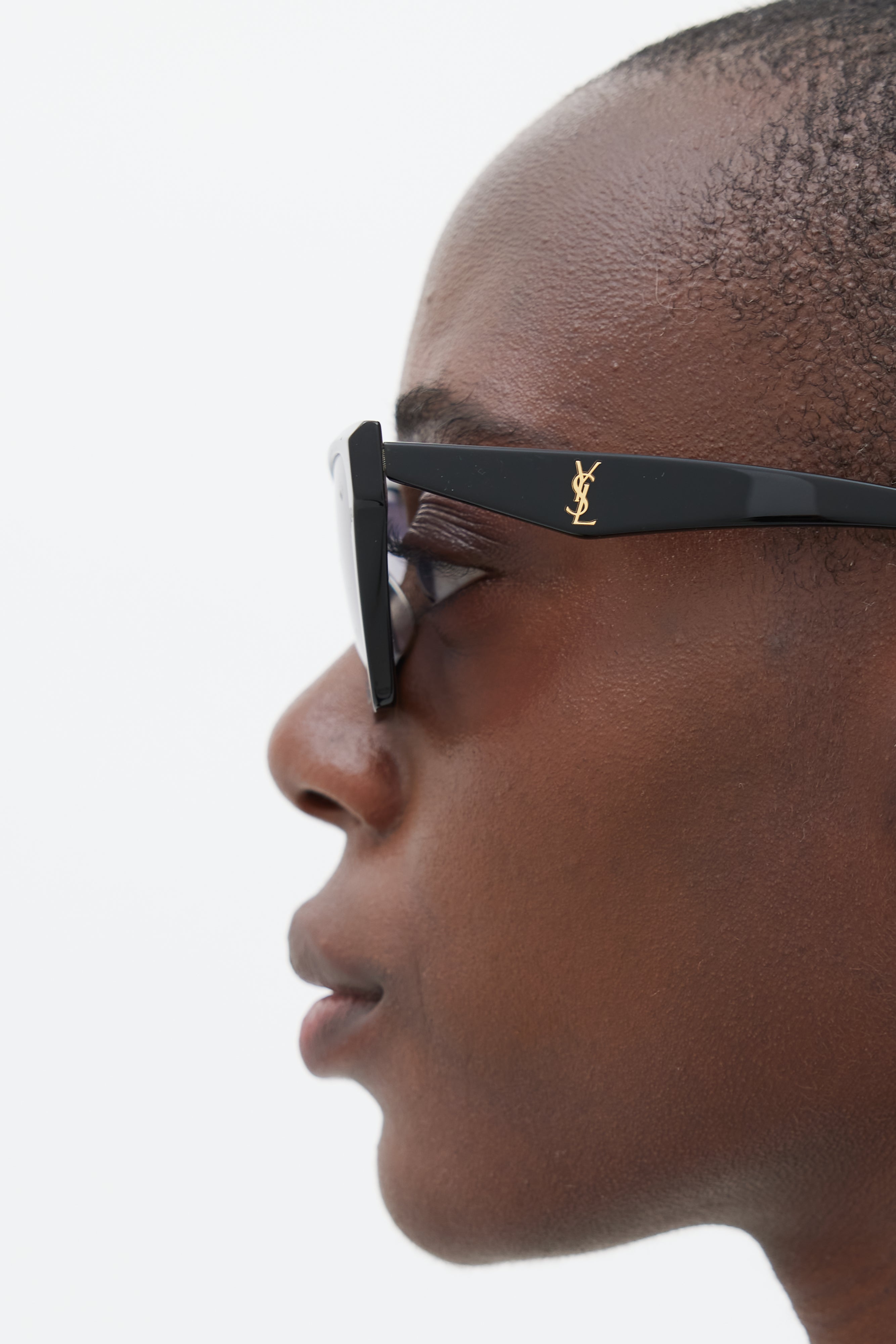 Pre-owned Saint Laurent black SLM103 sunglasses featuring a cateye frame, tinted lenses, nose pads, and gold tone Cassandre logo hardware at temple. Comes with original case.