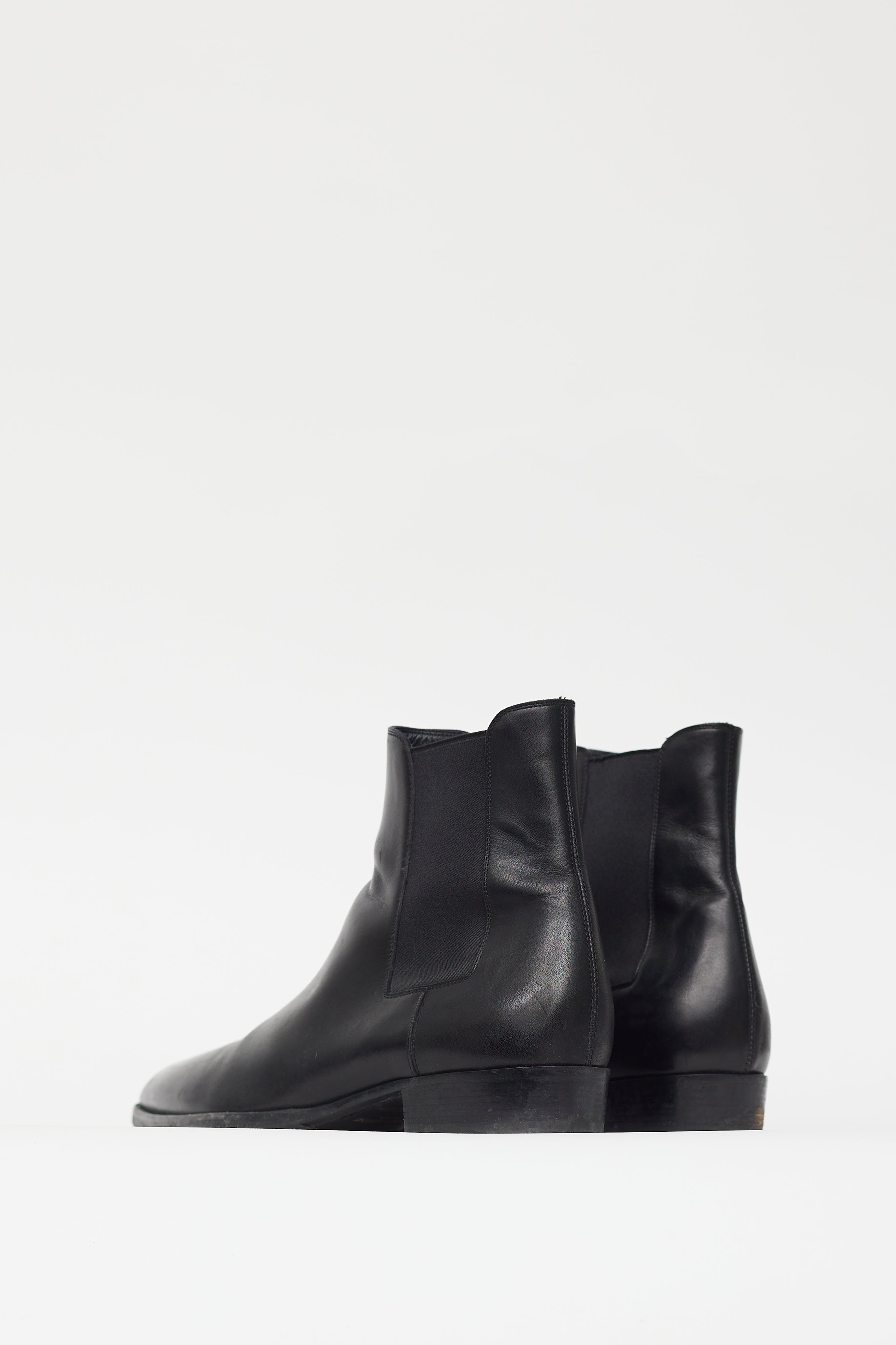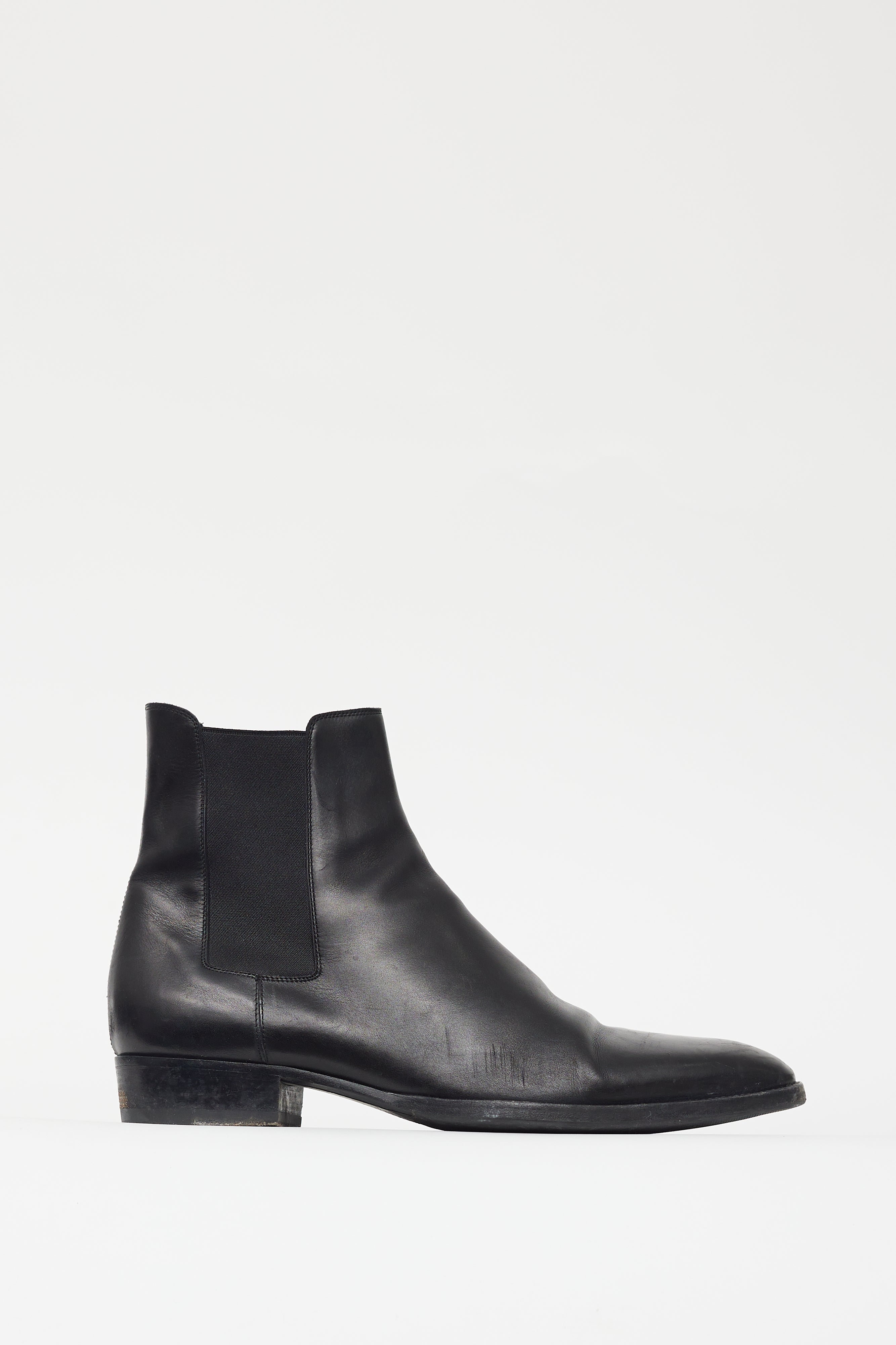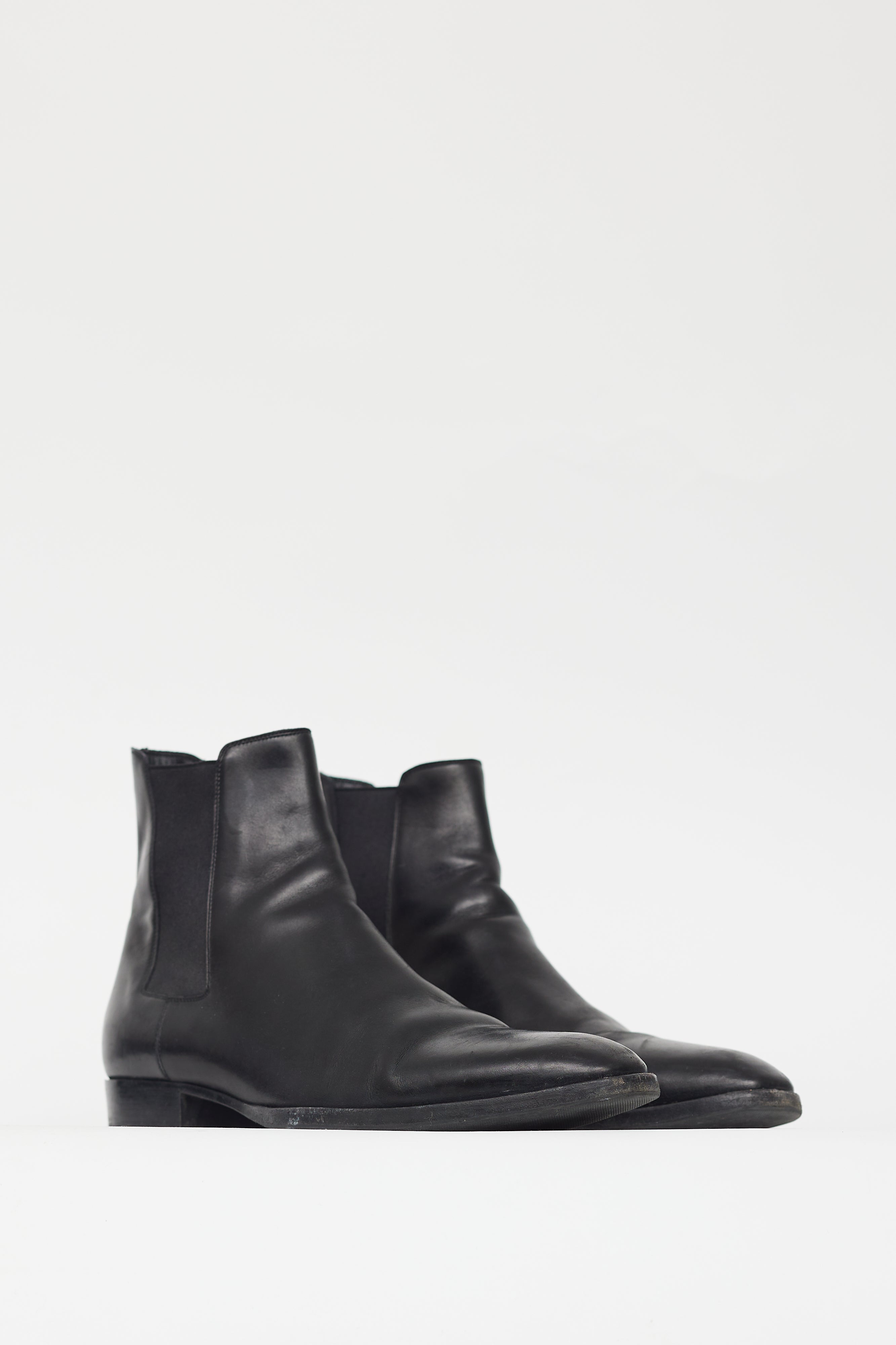 Pre-owned Saint Laurent black leather ankle Chelsea boots featuring pointed toe, elasticated gussets at side, slip on style, short block heel, and leather insoles.