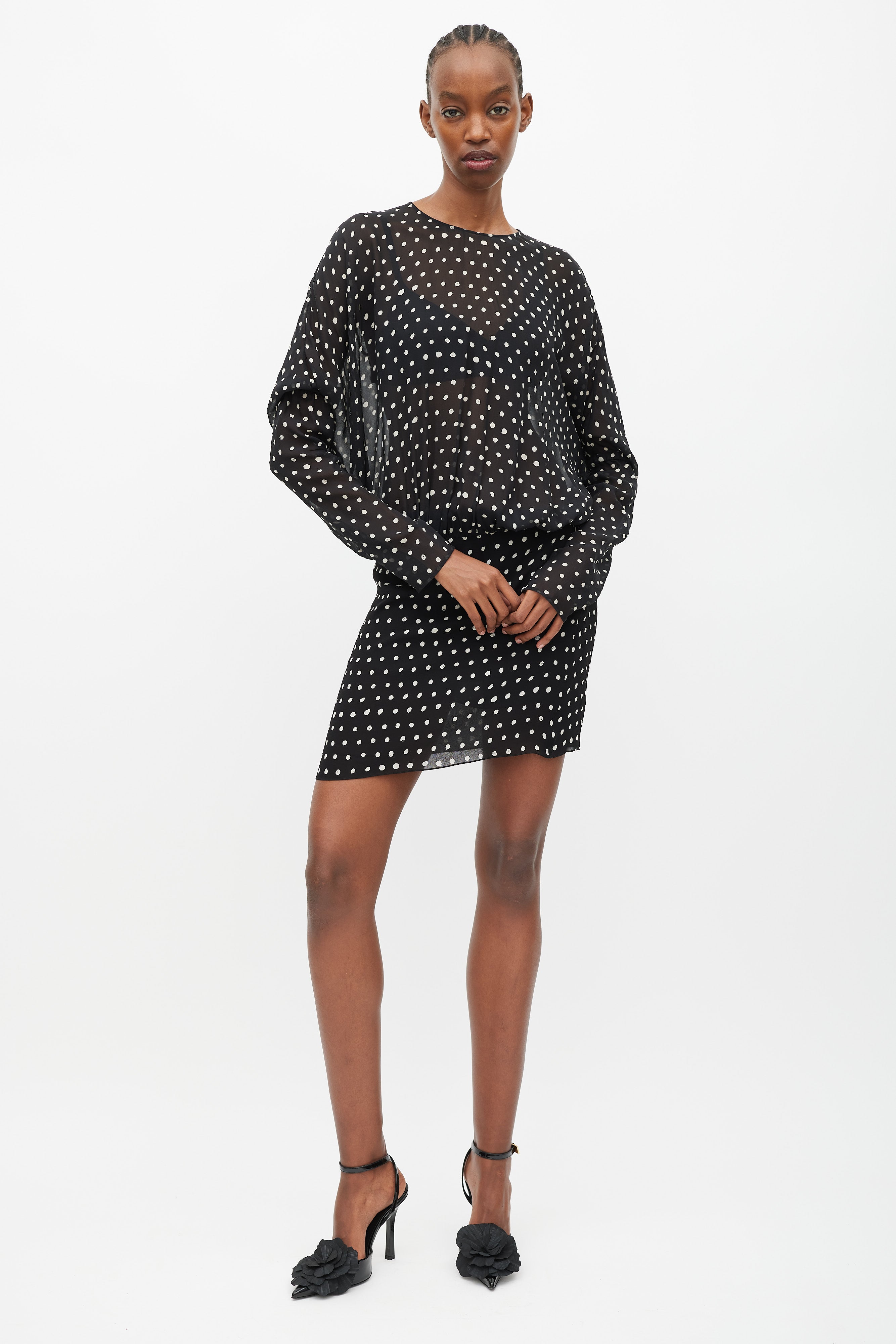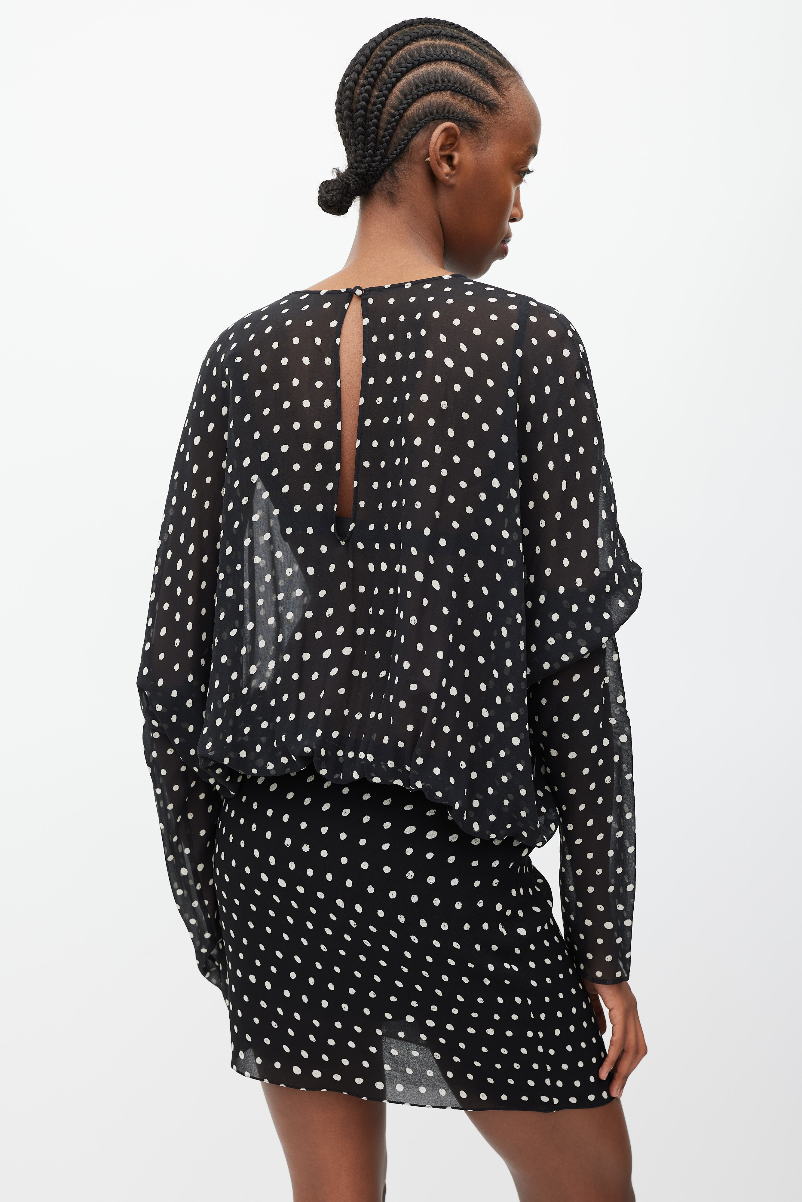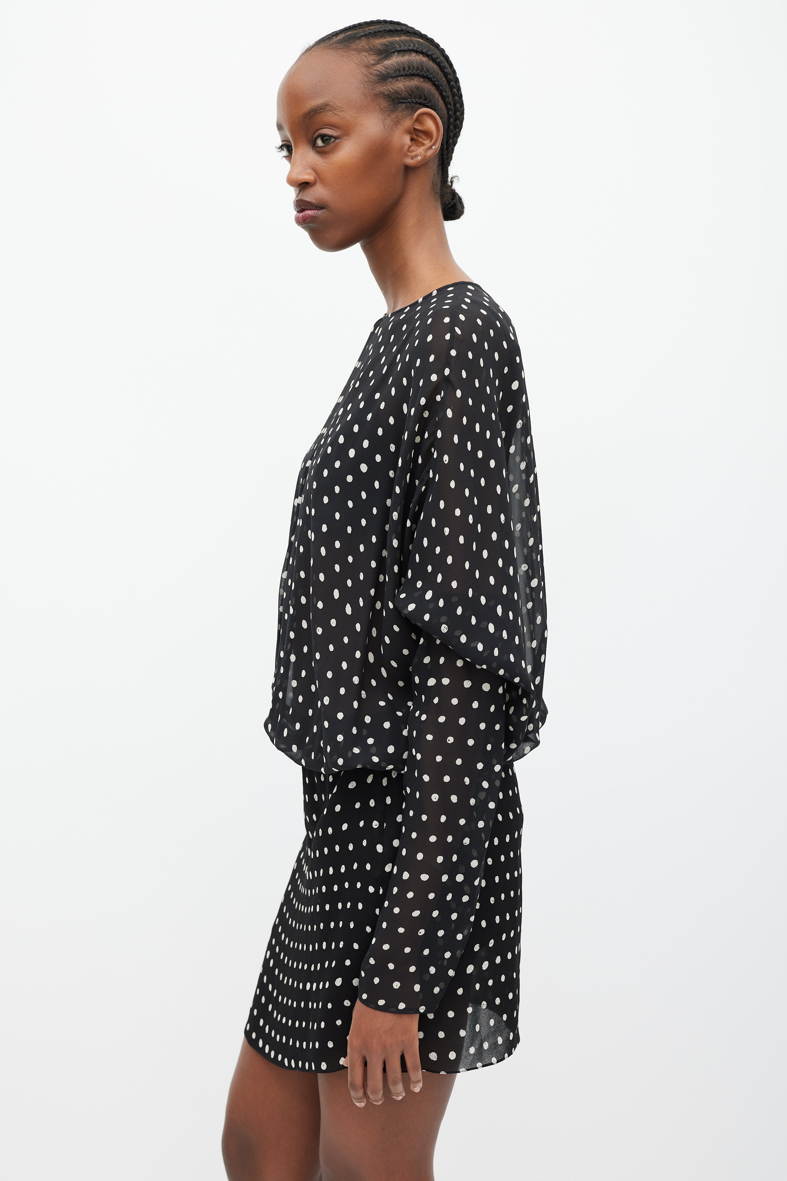 Pre-owned Saint Laurent black silk dress featuring a white polka dot pattern throughout, round neckline, long dolman sleeves, and zip at side with snap button closure. Lined.