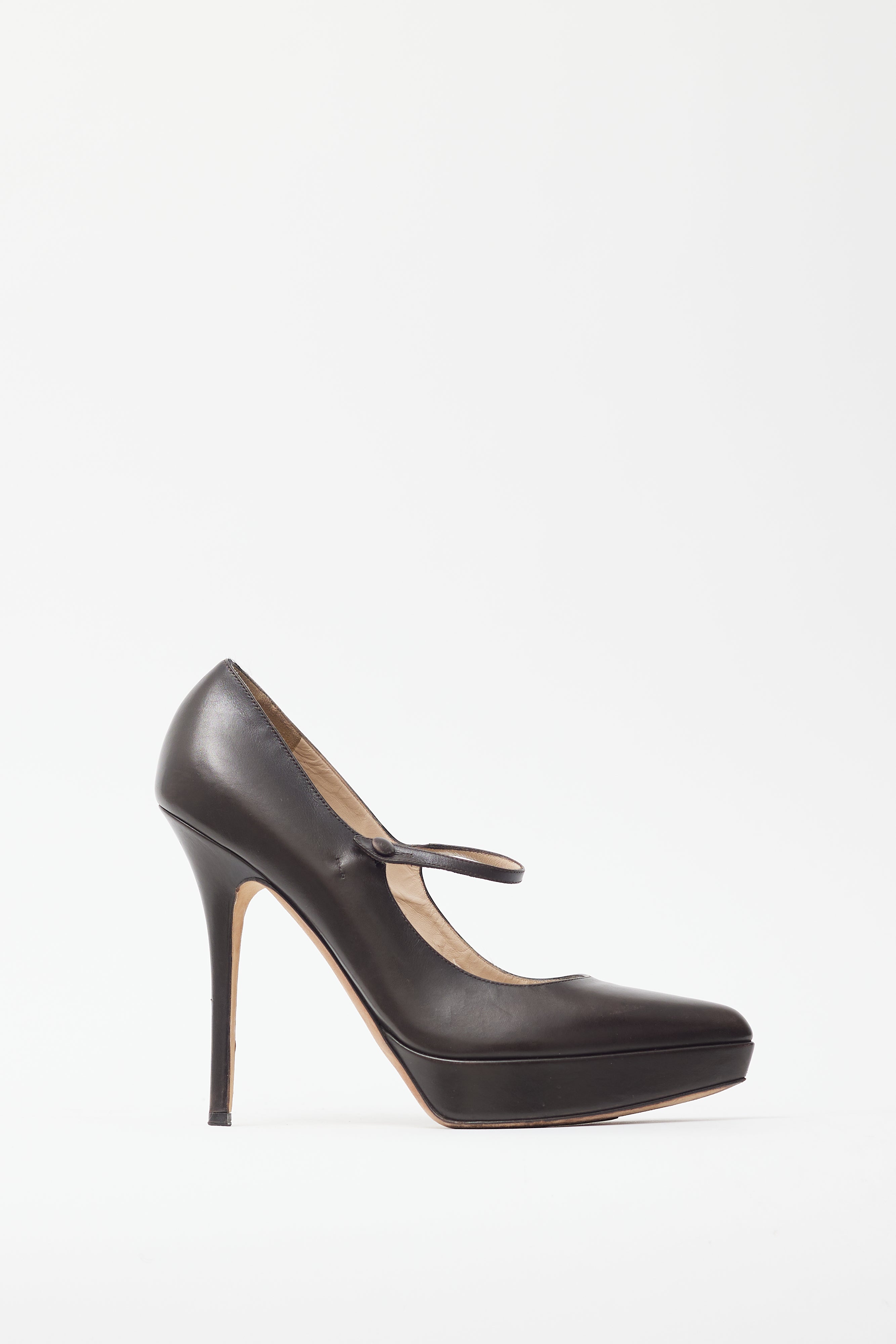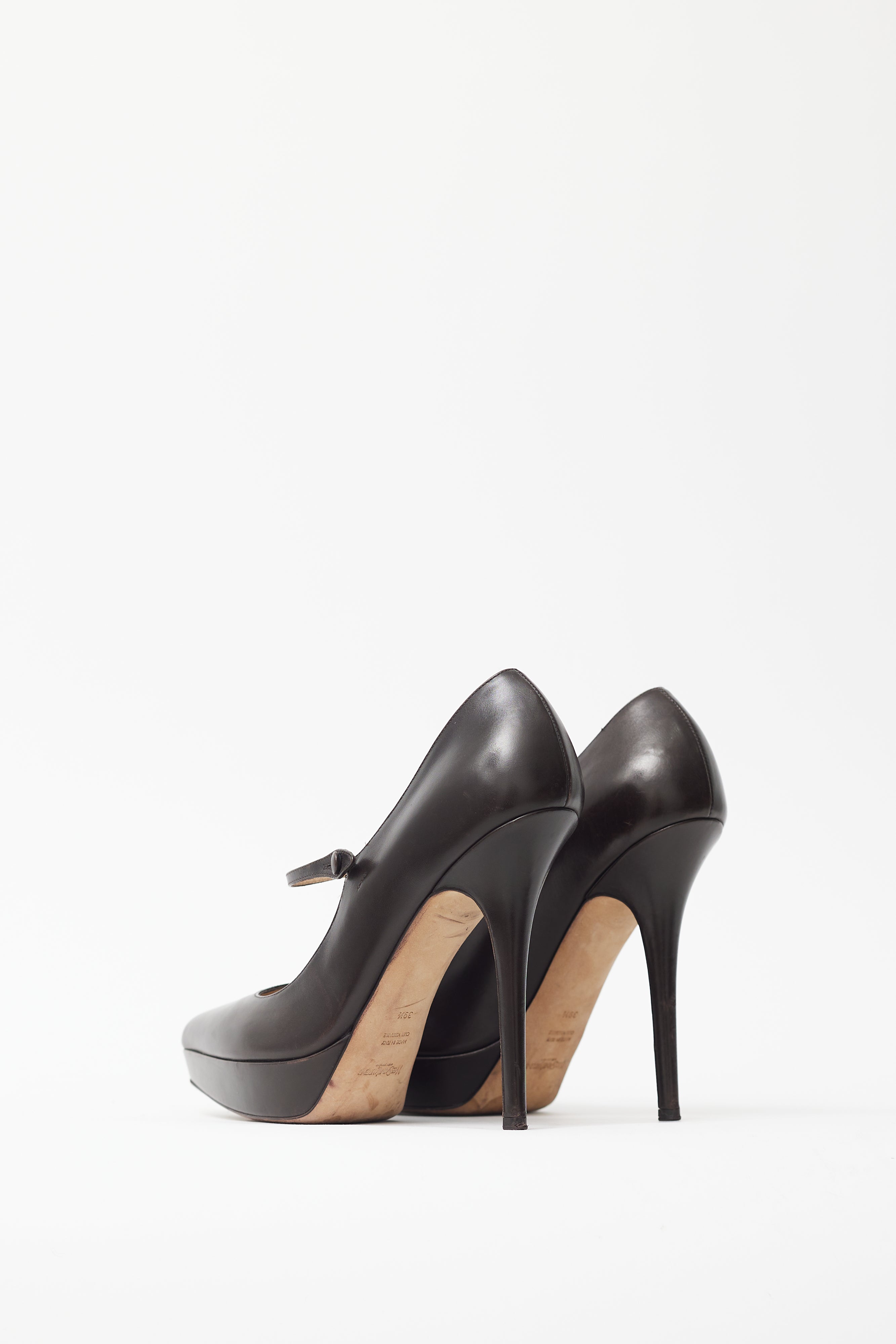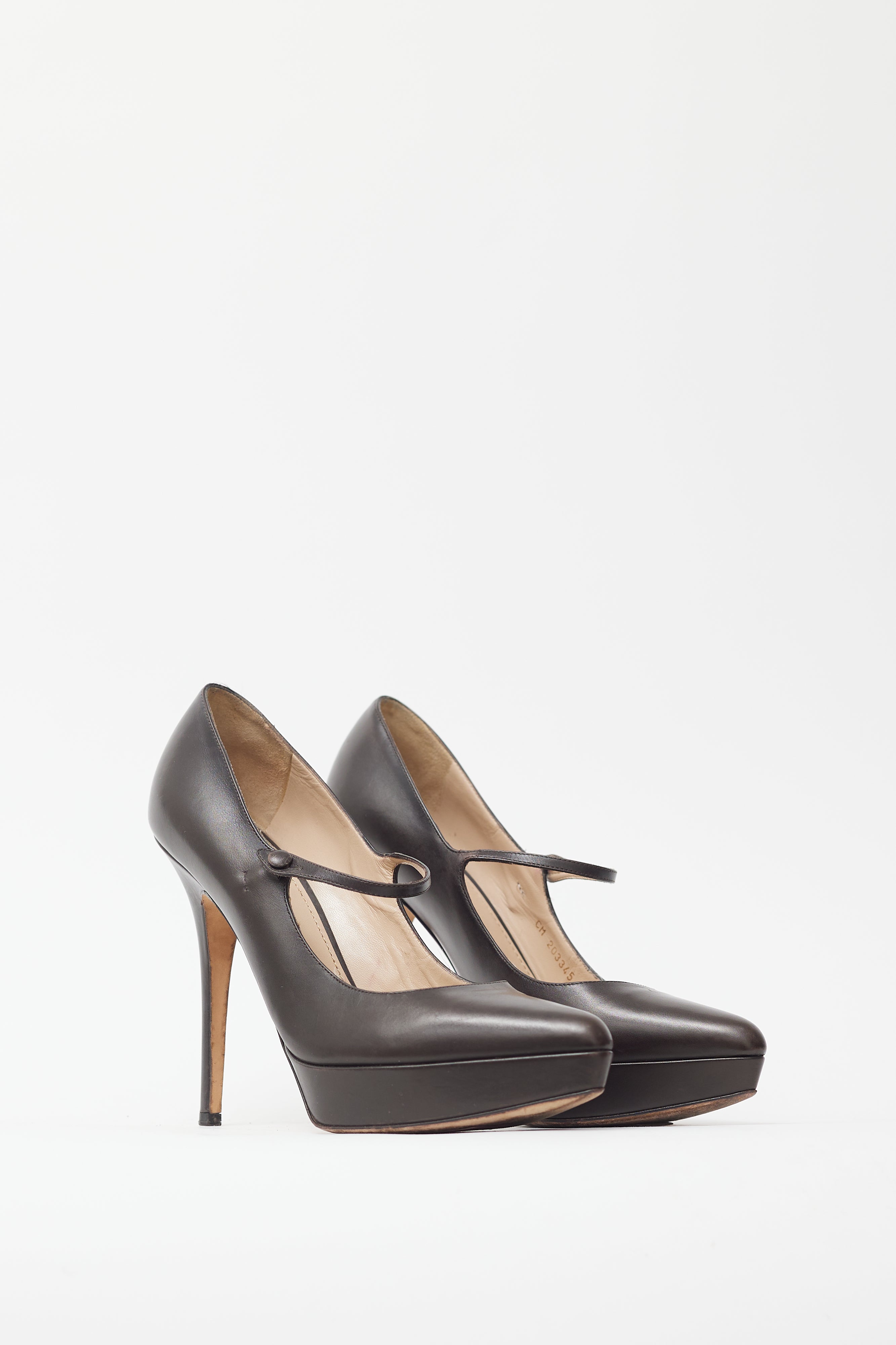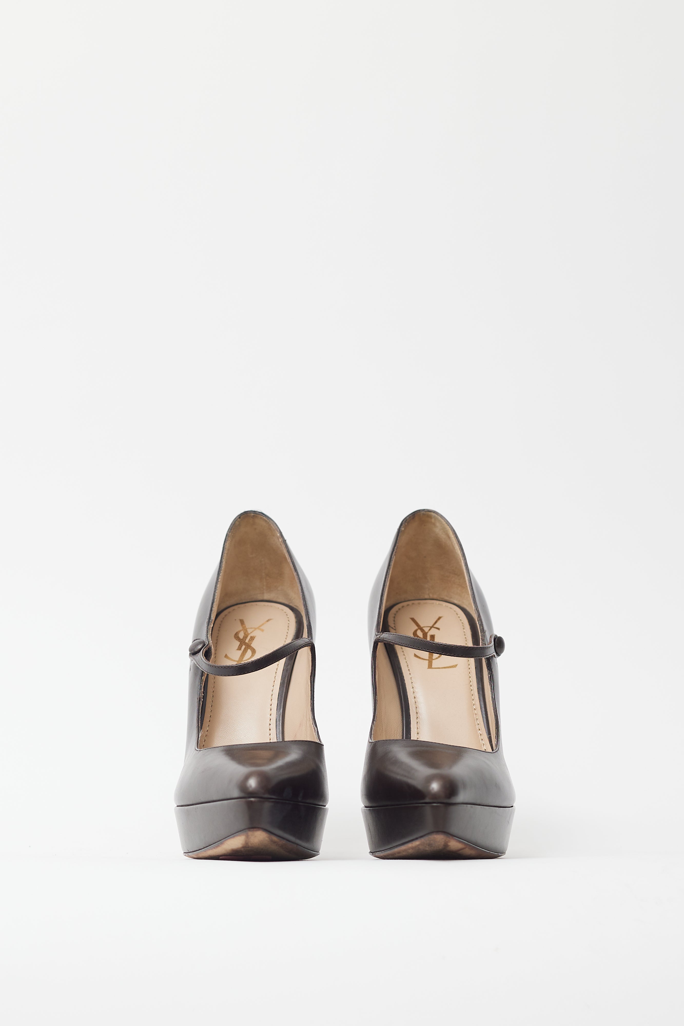 Pre-owned Yves Saint Laurent mary jane pumps featuring brown leather uppers, strap with button detail at vamp, a pointed toe, short platform, and stiletto heel. Comes with original dust bag.
