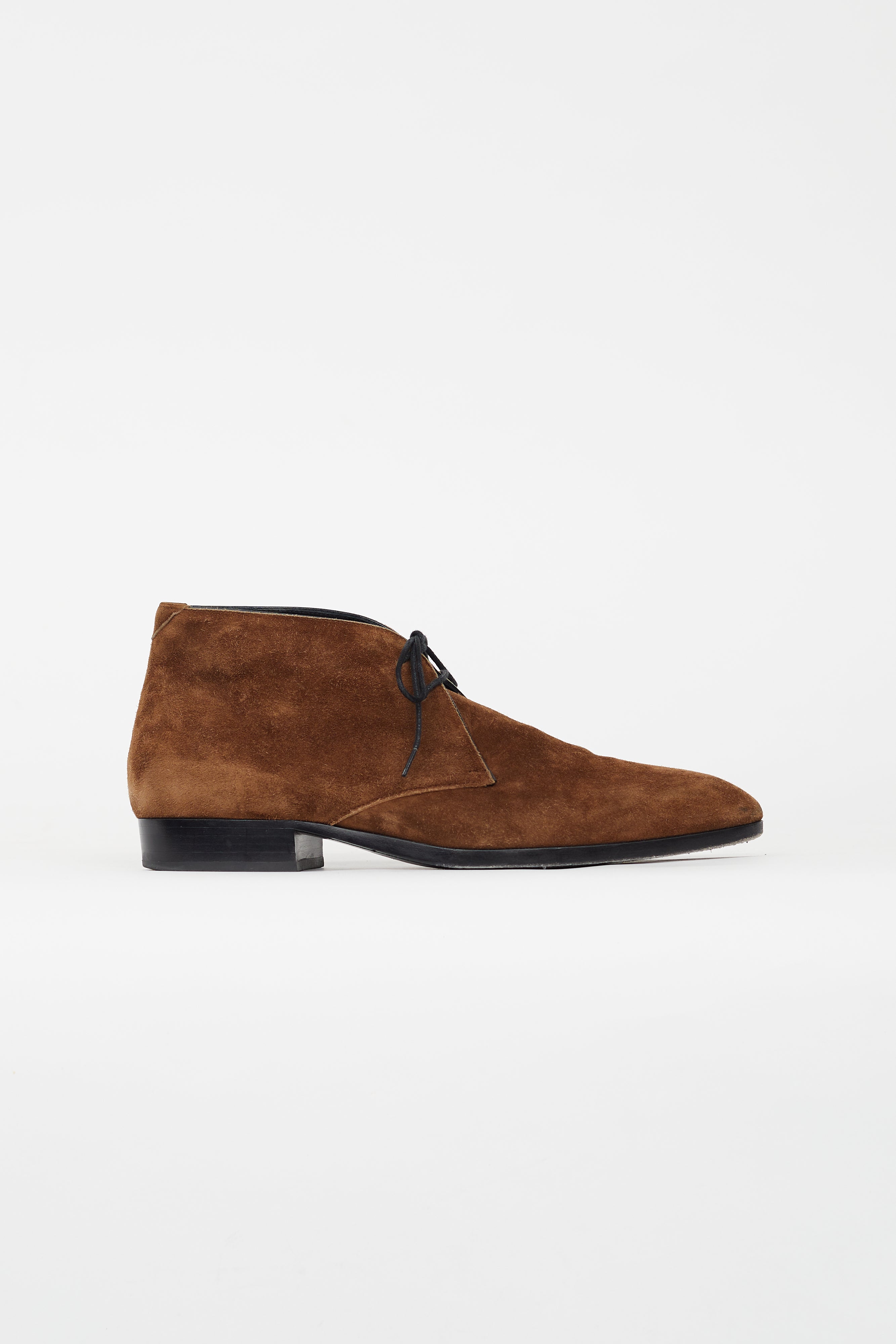 Pre-owned Saint Laurent brown Jonas boots featuring almond toe, lace up vamp, slip on entry, and stacked block heel. Comes with original dust bag.