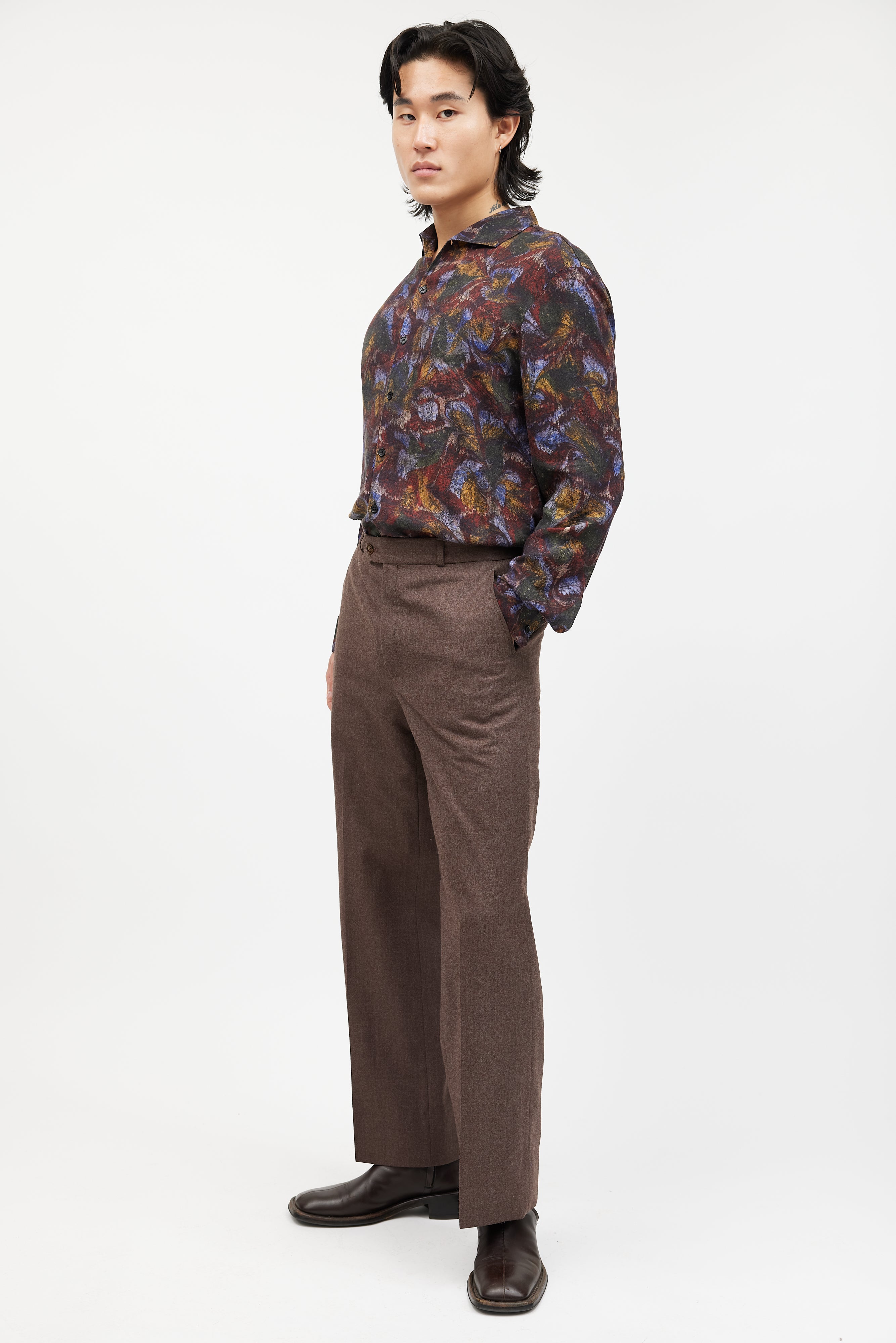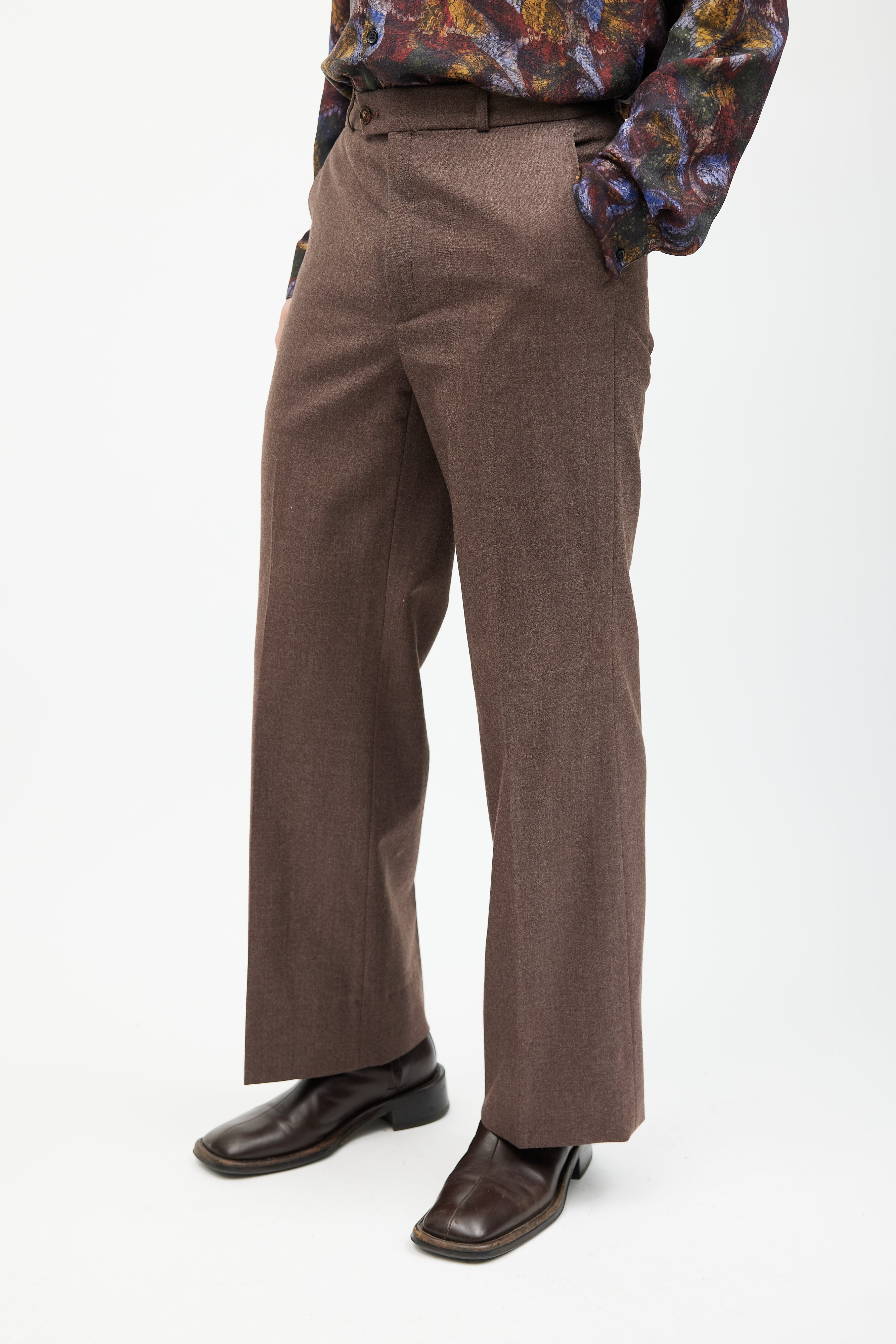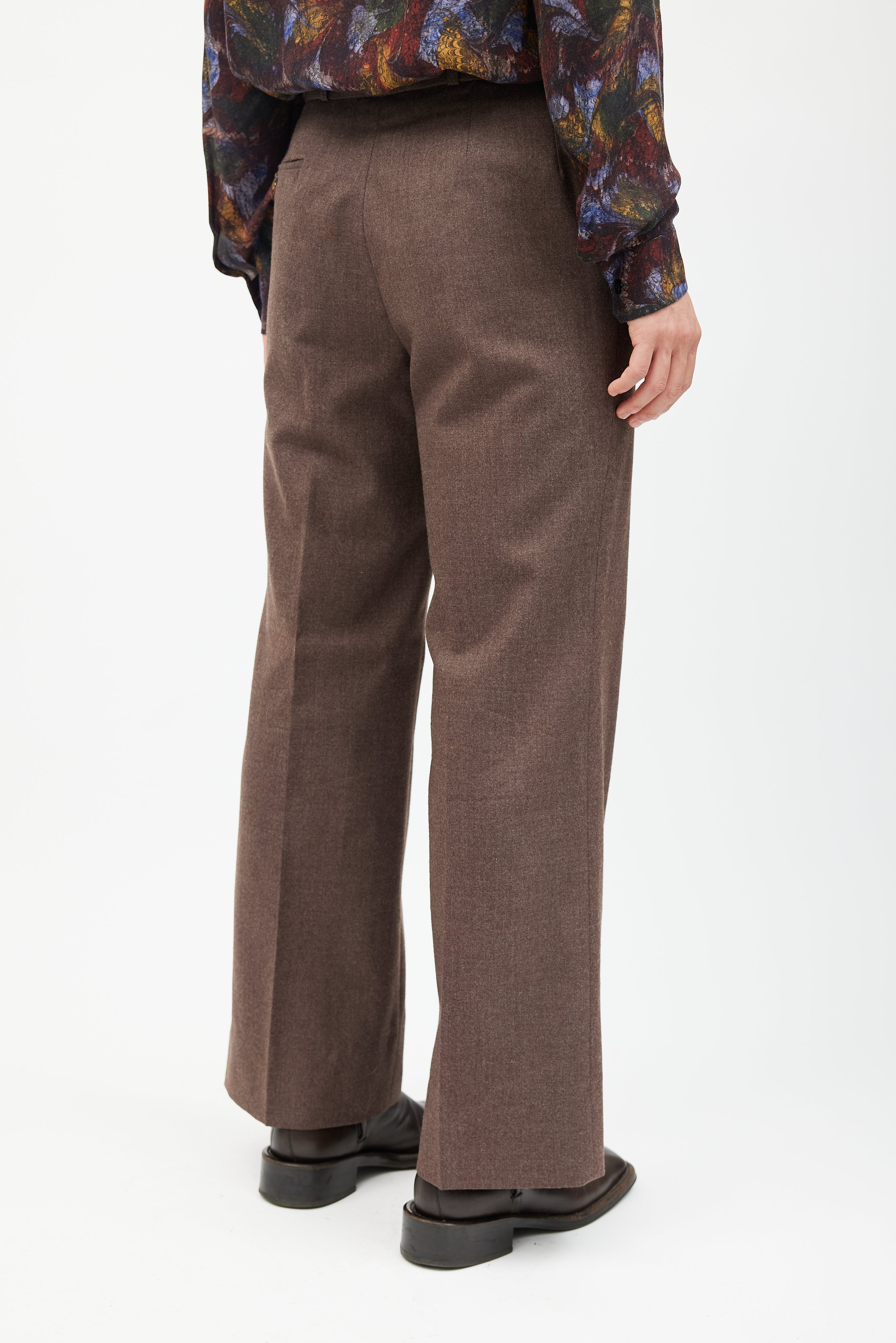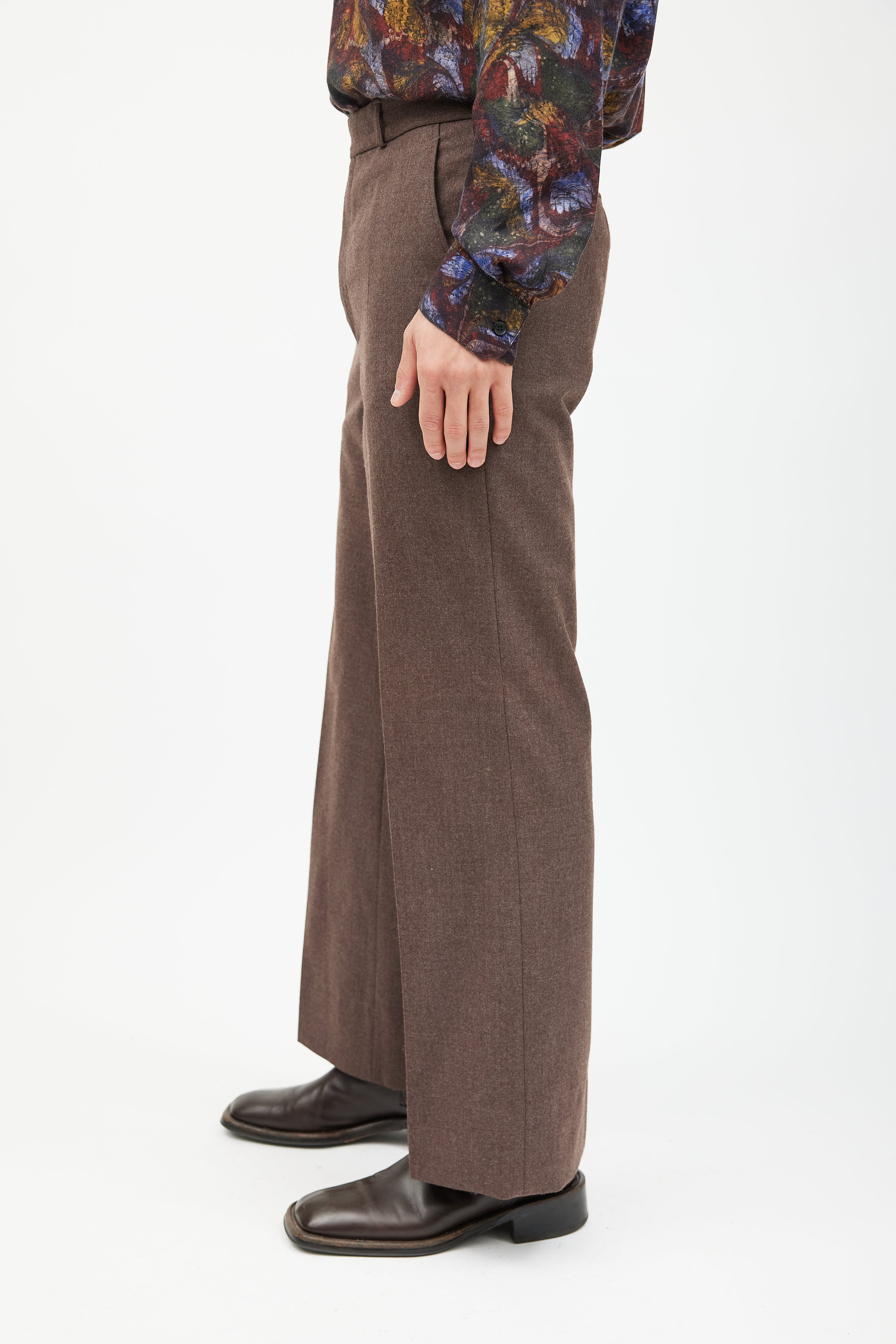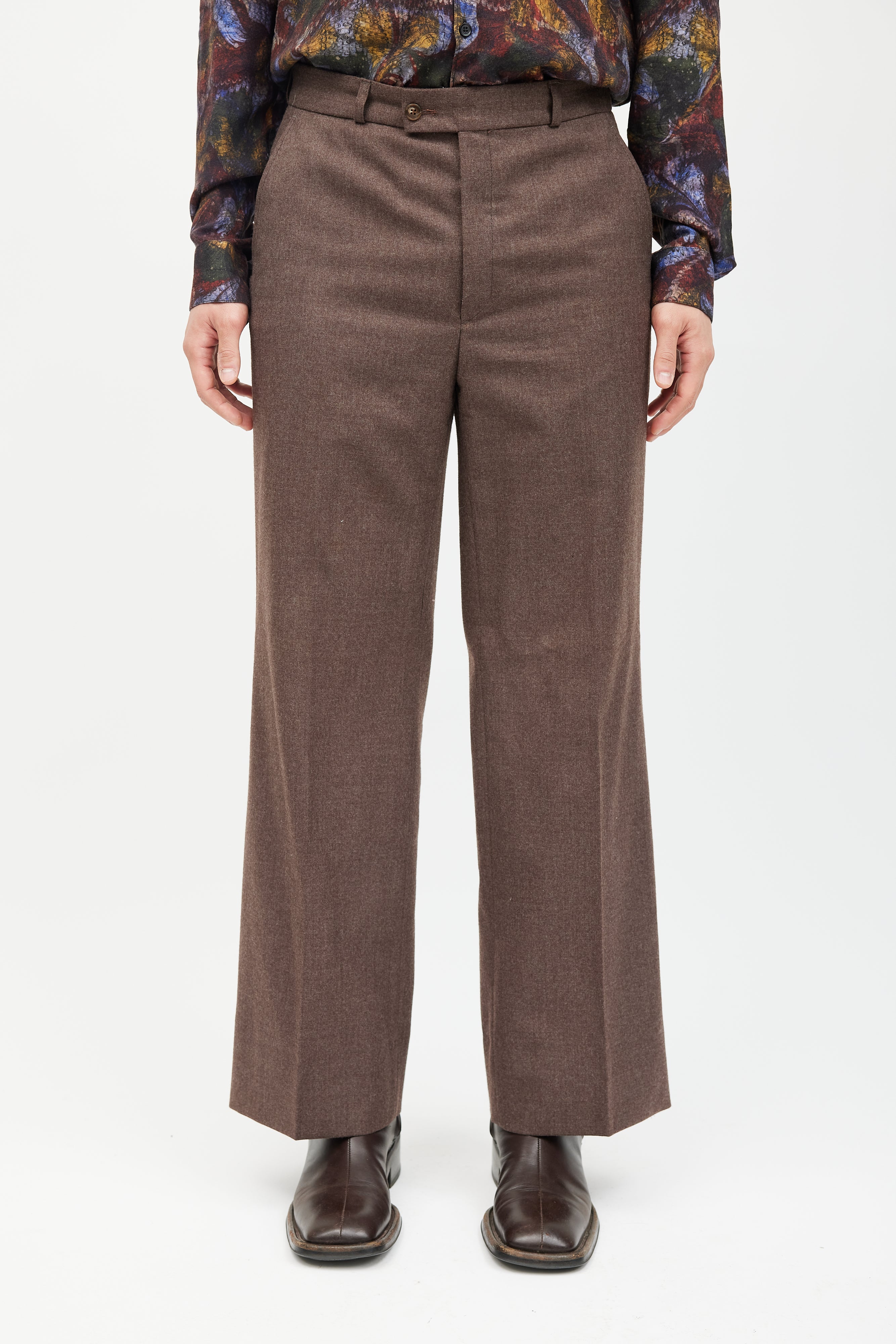 Pre-owned Yves Saint Laurent brown wool trousers featuring two slip pockets at hip, one buttoned pocket at back, wide leg, and zip fly with button closure.