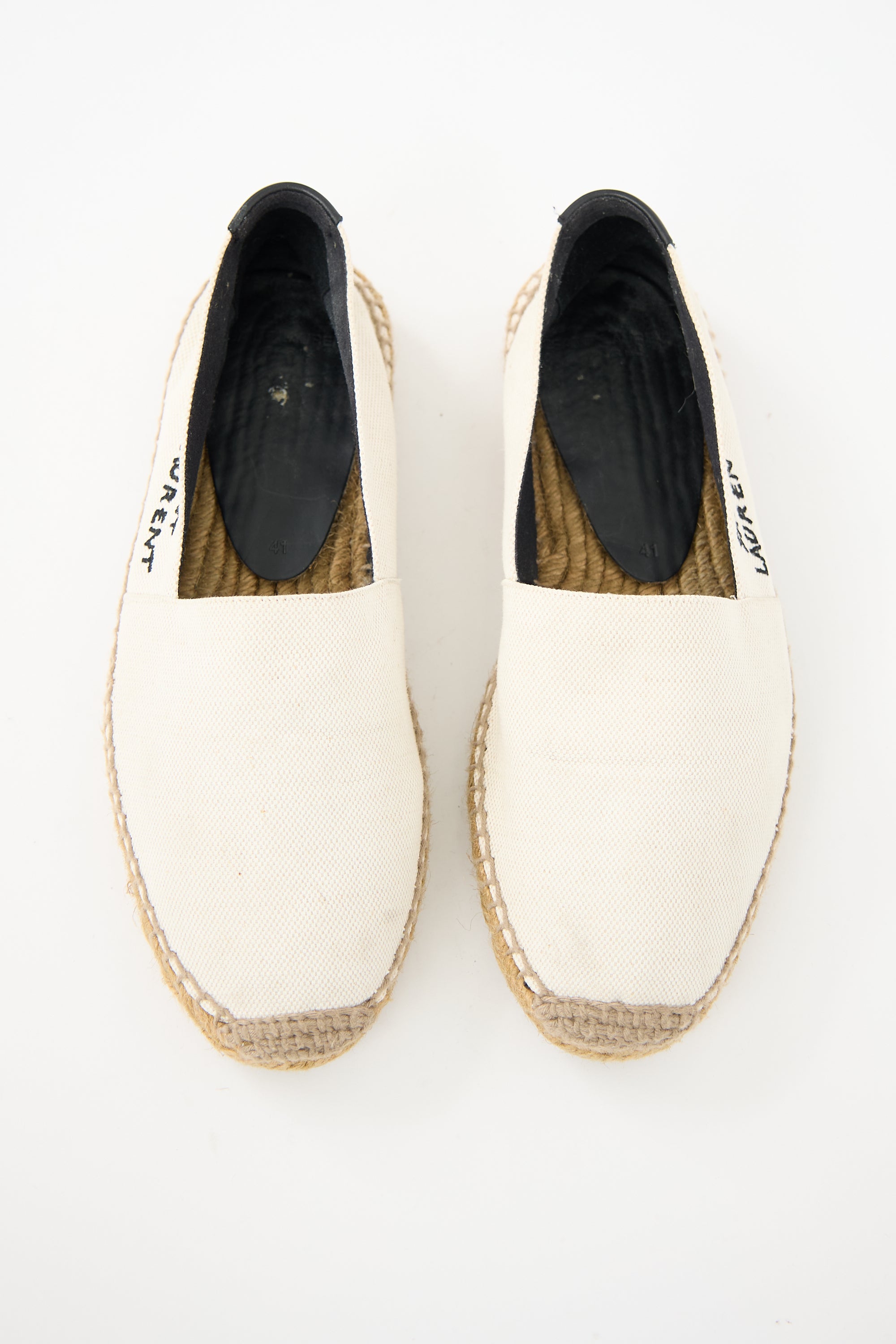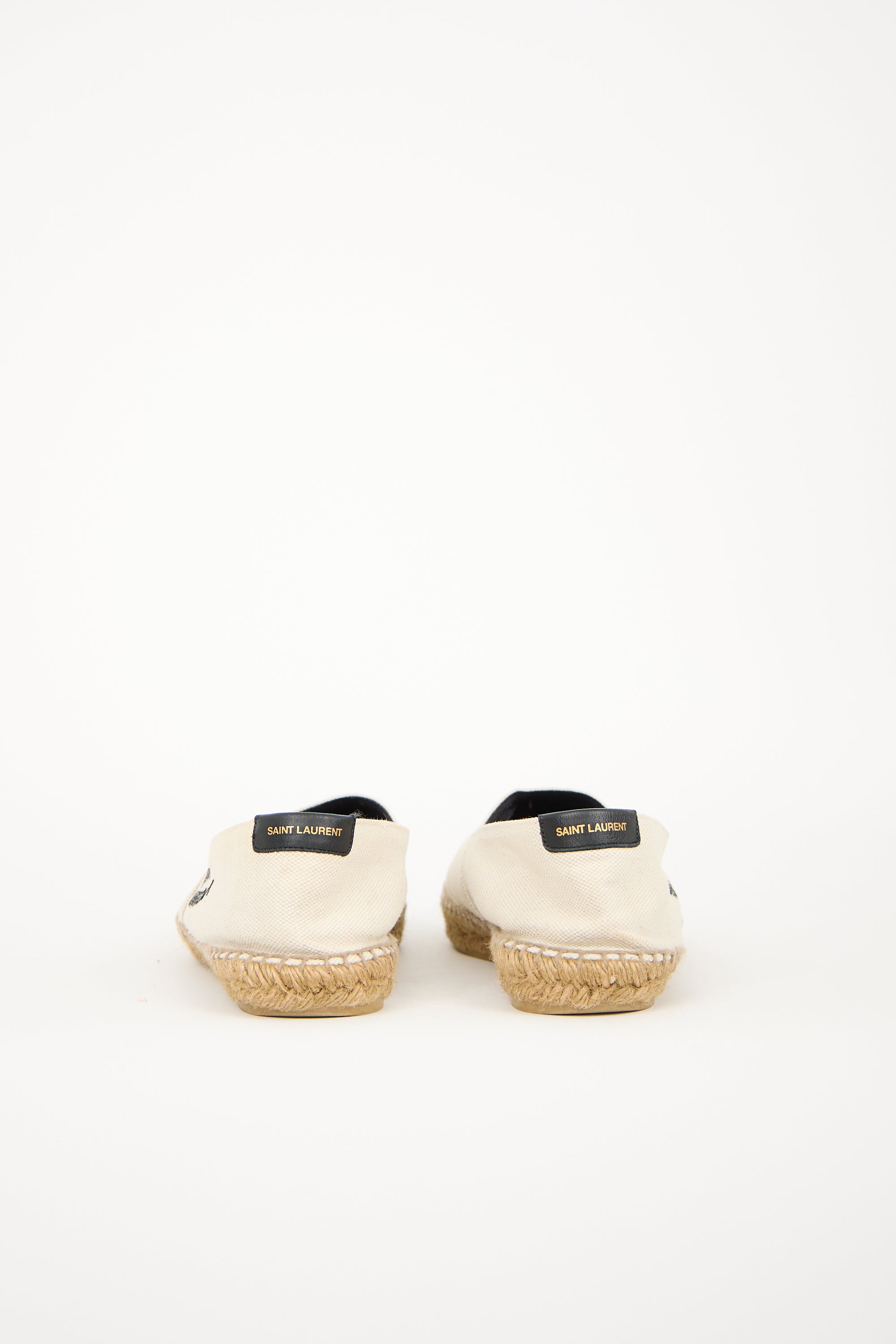 Pre-owned Saint Laurent beige canvas espadrilles featuring rounded toe, crochet cap, black embroidered logo at outer sides, logo tab at counter, and brown braided midsole.
