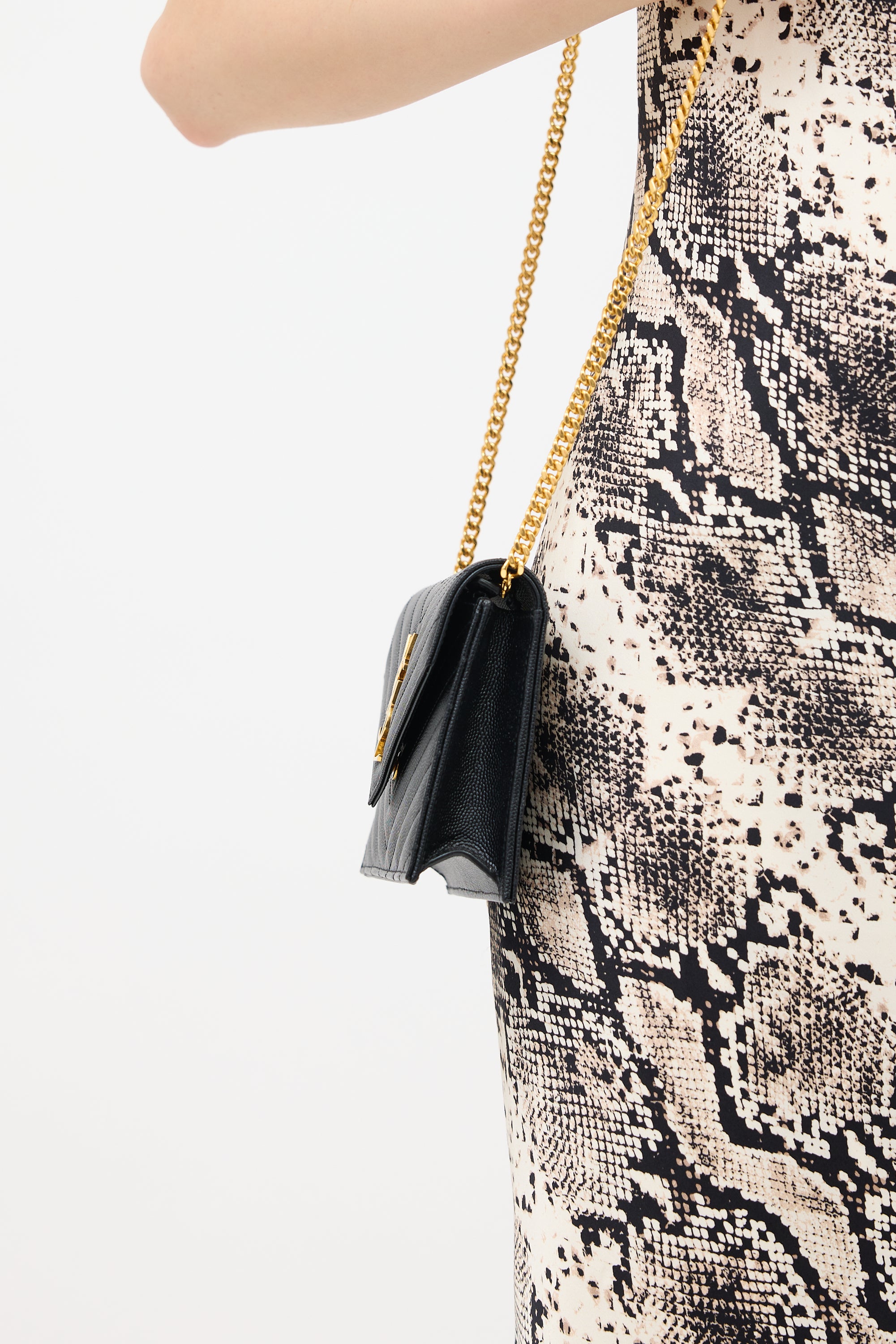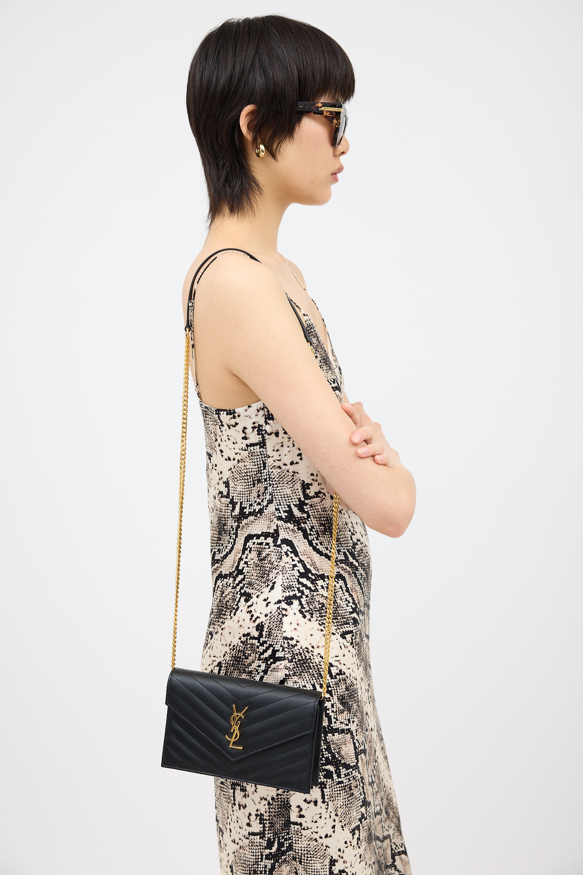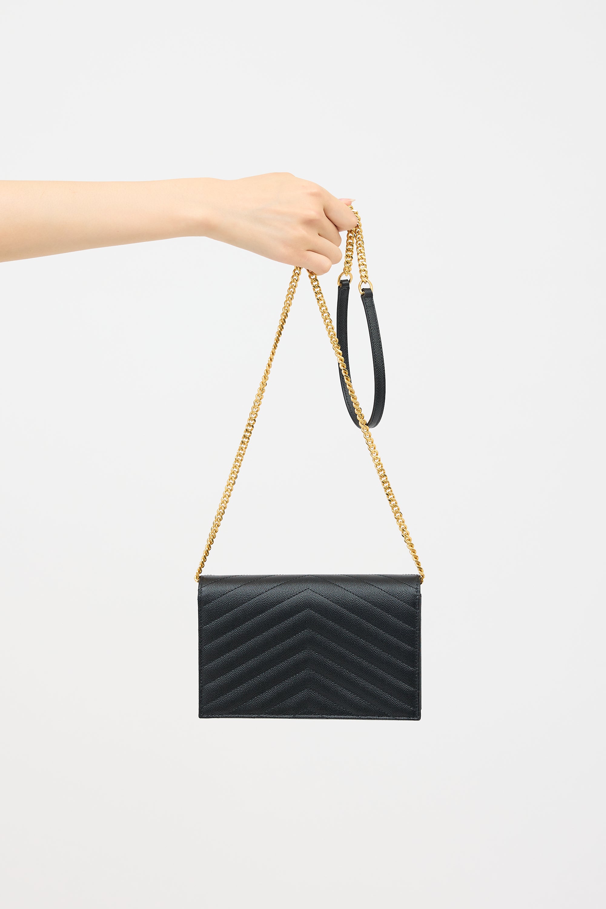 Pre-owned Saint Laurent black Cassandre Envelope chain wallet bag featuring chevron quilted grain de poudre leather, gold tone Cassandre logo at front, detachable leather and gold tone chainlink shoulder strap, front flap with snap closure, and one lined main compartment with one zip pocket, one bill slot, and six card slots. Comes with original box and dust bag.