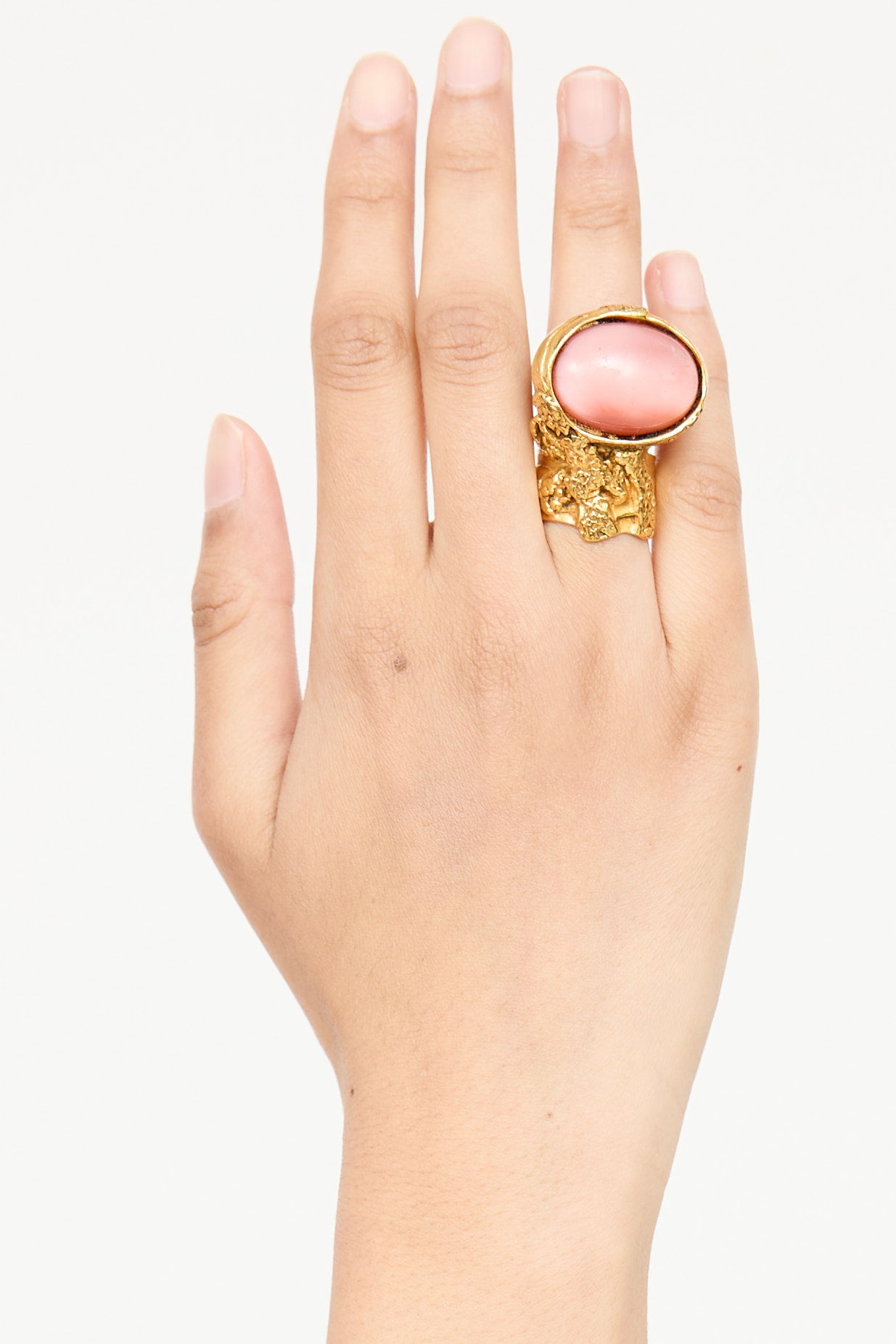 Pre-owned Saint Laurent gold tone Arty ring featuring textured band, inset rose oval stone, and engraved logo at reverse.