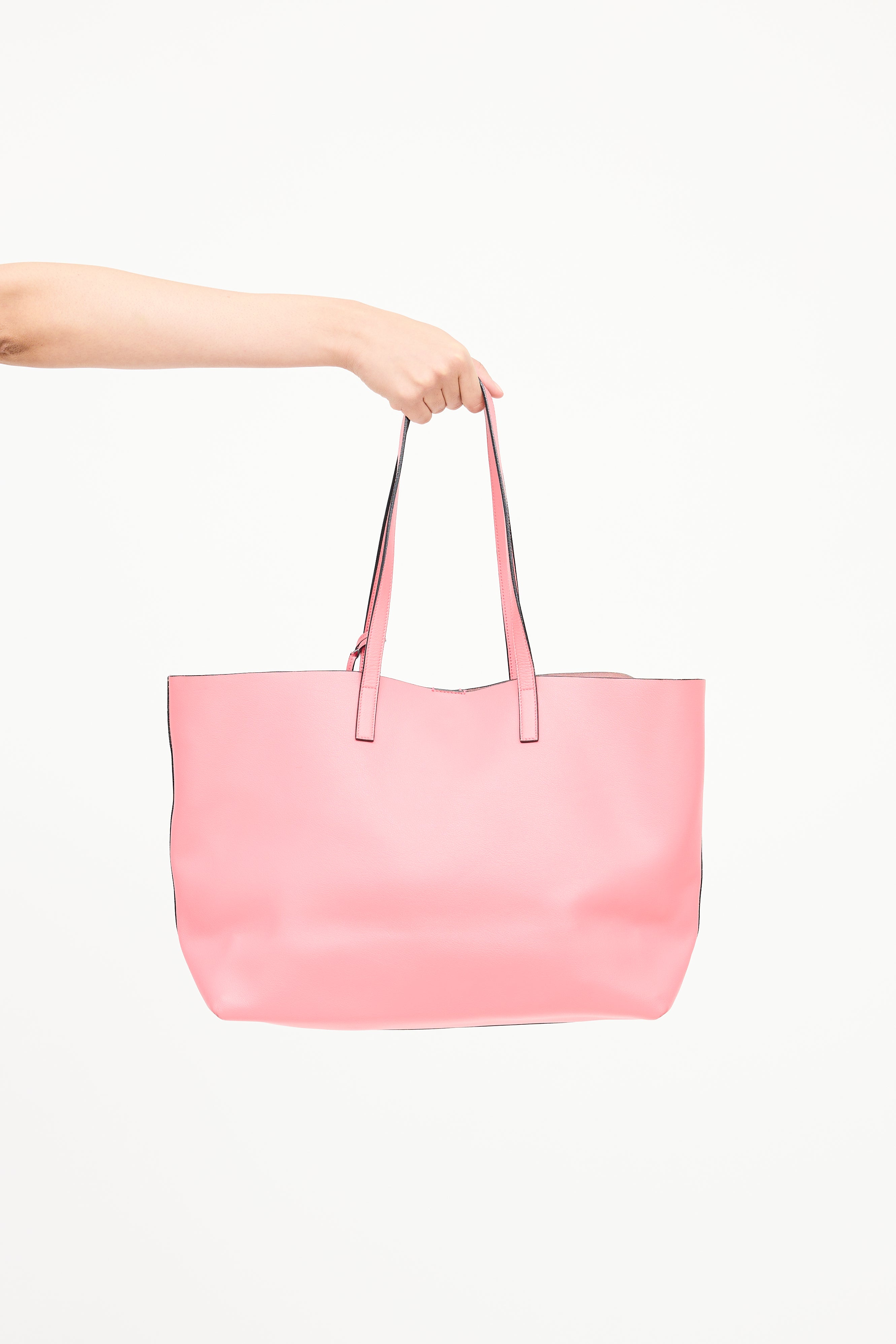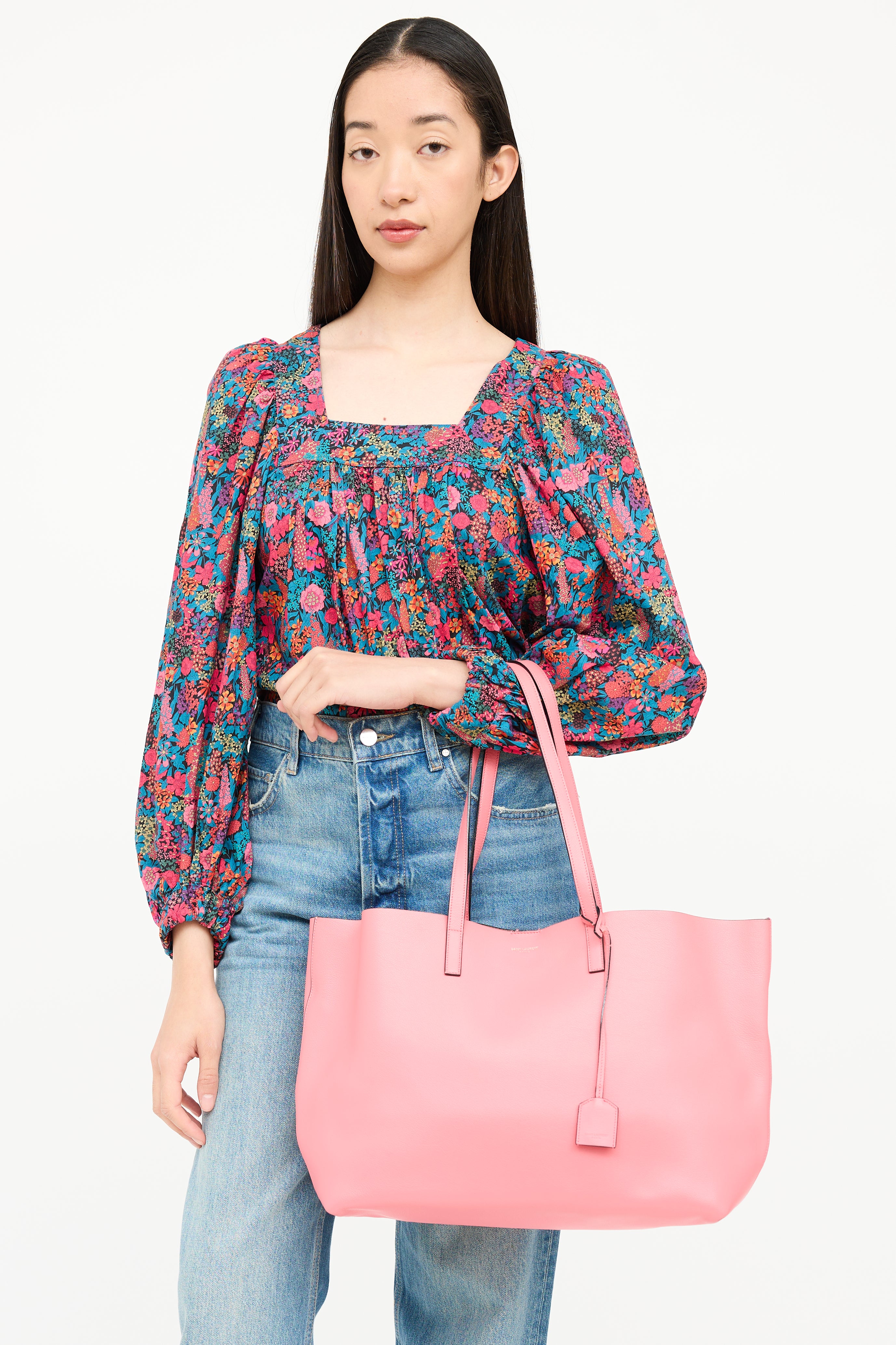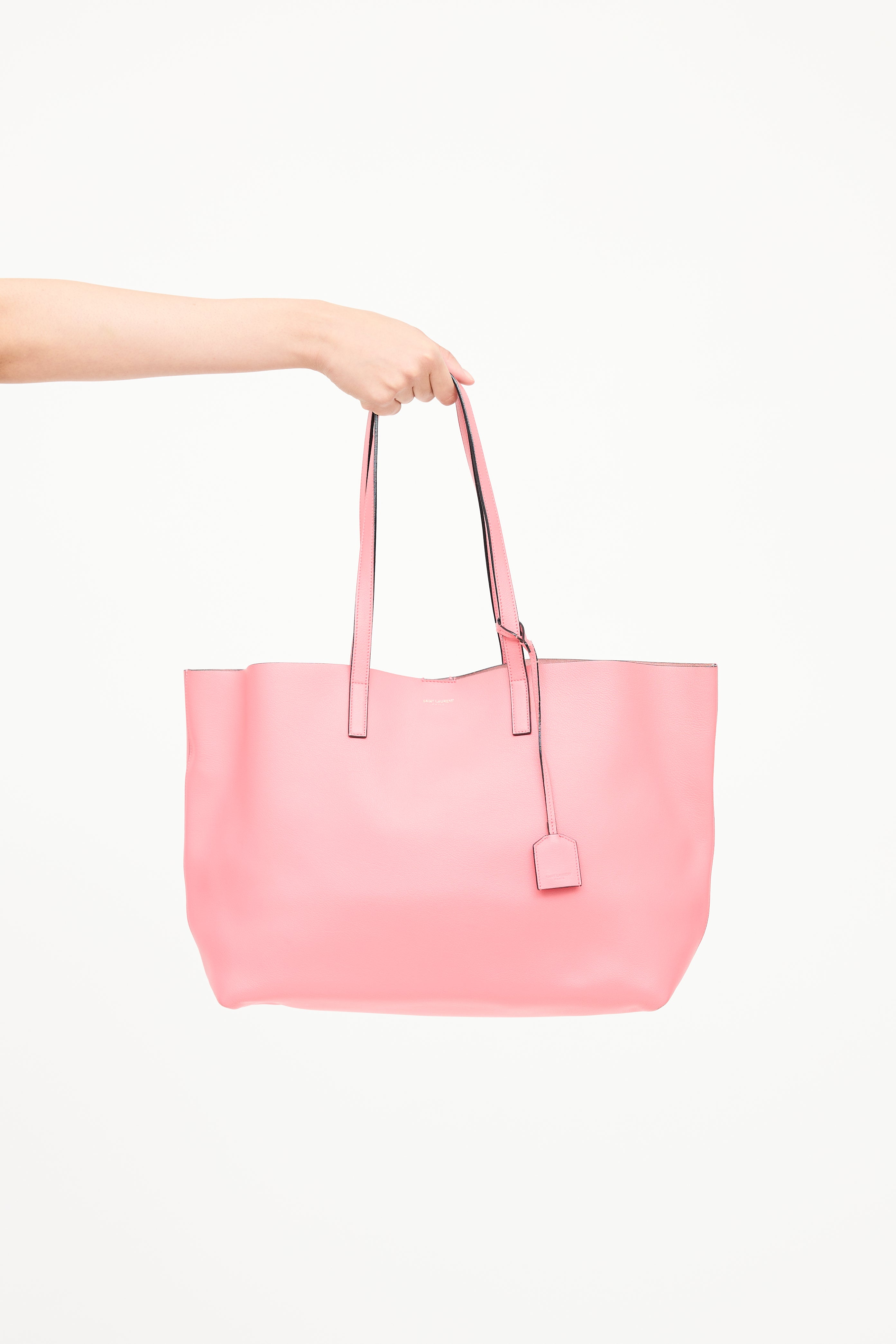 Pre-owned Saint Laurent pink East West leather tote bag featuring two top handles, gold tone stamped logo at front, Cassandre logo clochette at handle, removable inner zip pouch, and top snap closure.