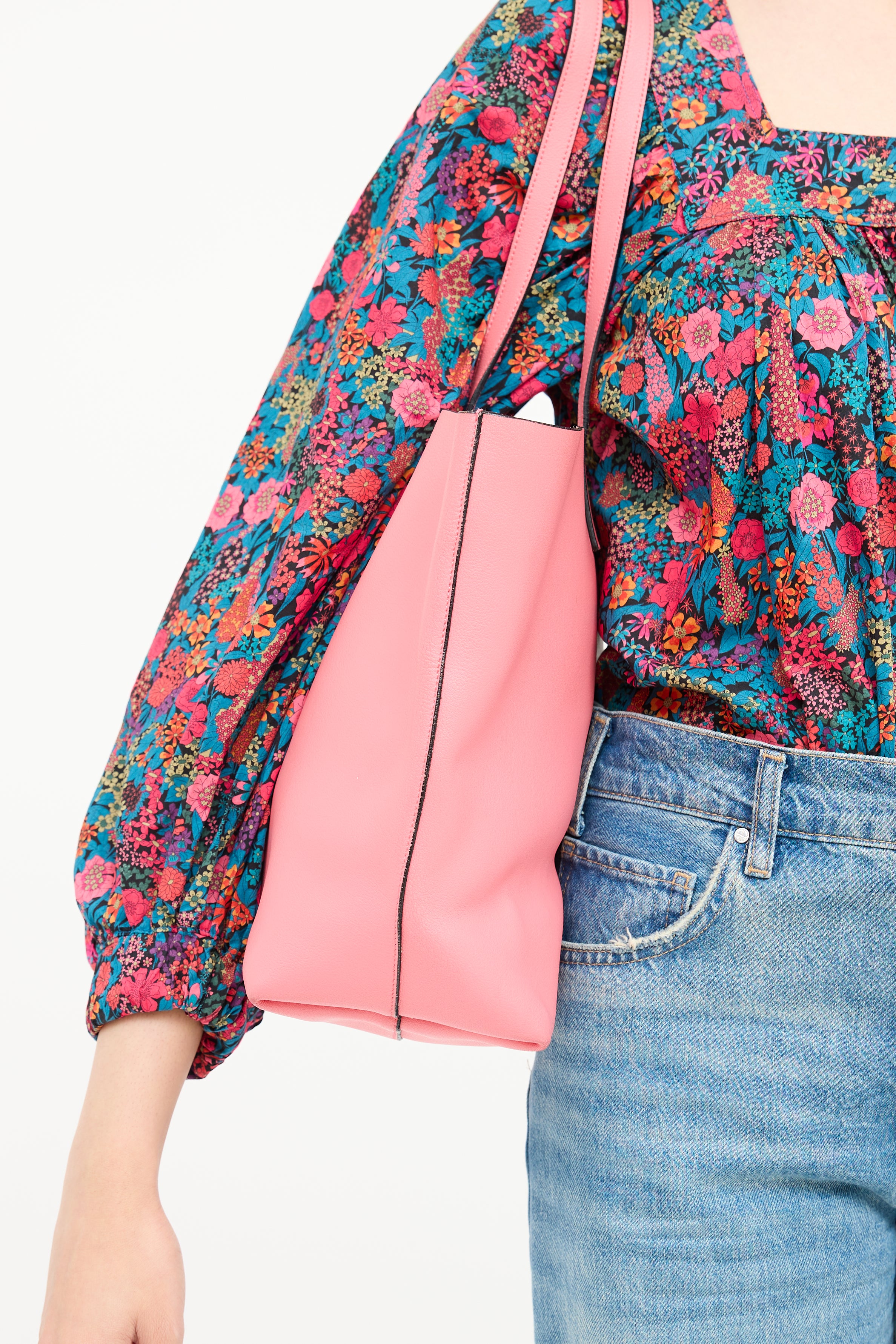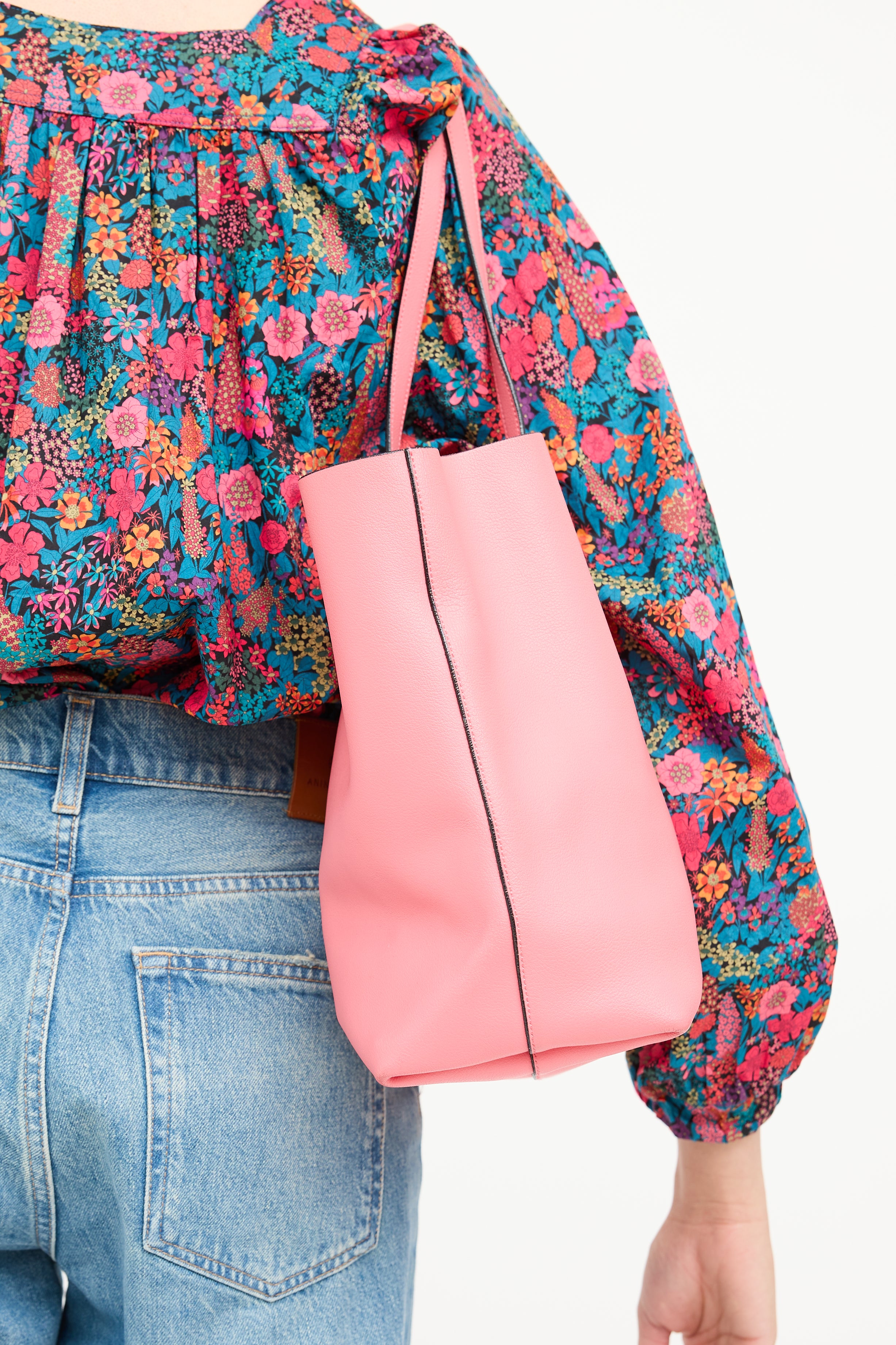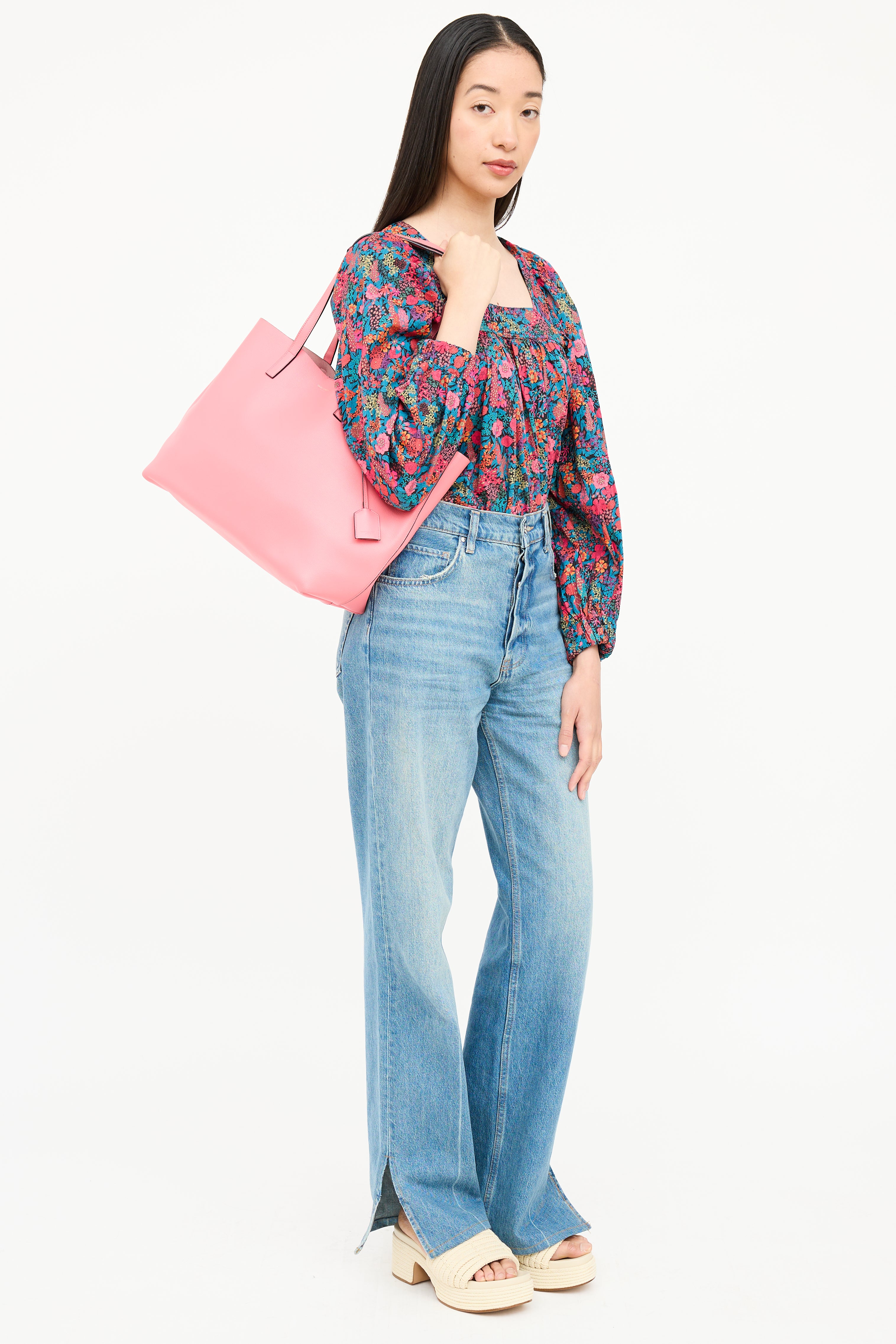 Pre-owned Saint Laurent pink East West leather tote bag featuring two top handles, gold tone stamped logo at front, Cassandre logo clochette at handle, removable inner zip pouch, and top snap closure.