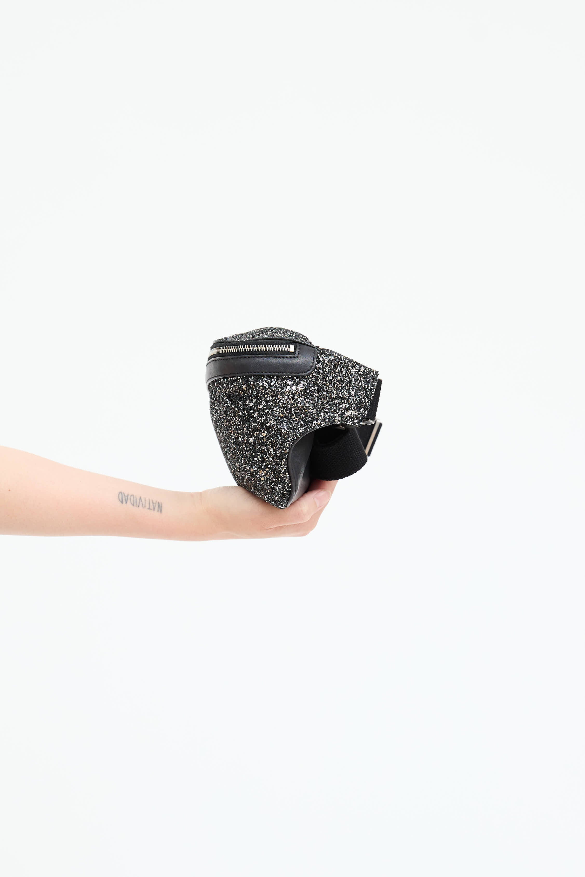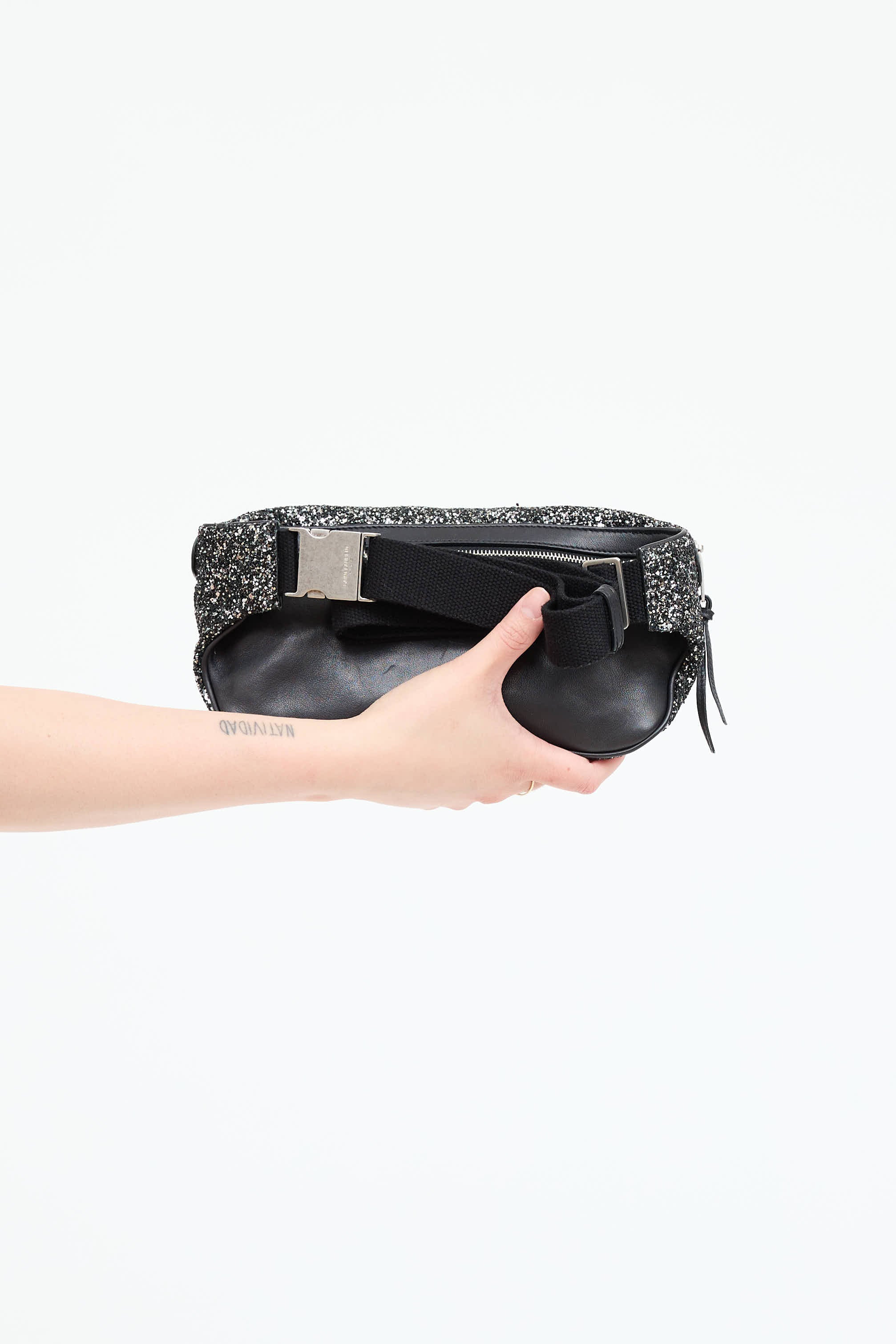 Pre-owned Saint Laurent black glitter belt bag featuring adjustable belt strap with silver tone hardware, zip pocket at back, zip closure, and one main compartment with three card slots, and one slip pocket.
