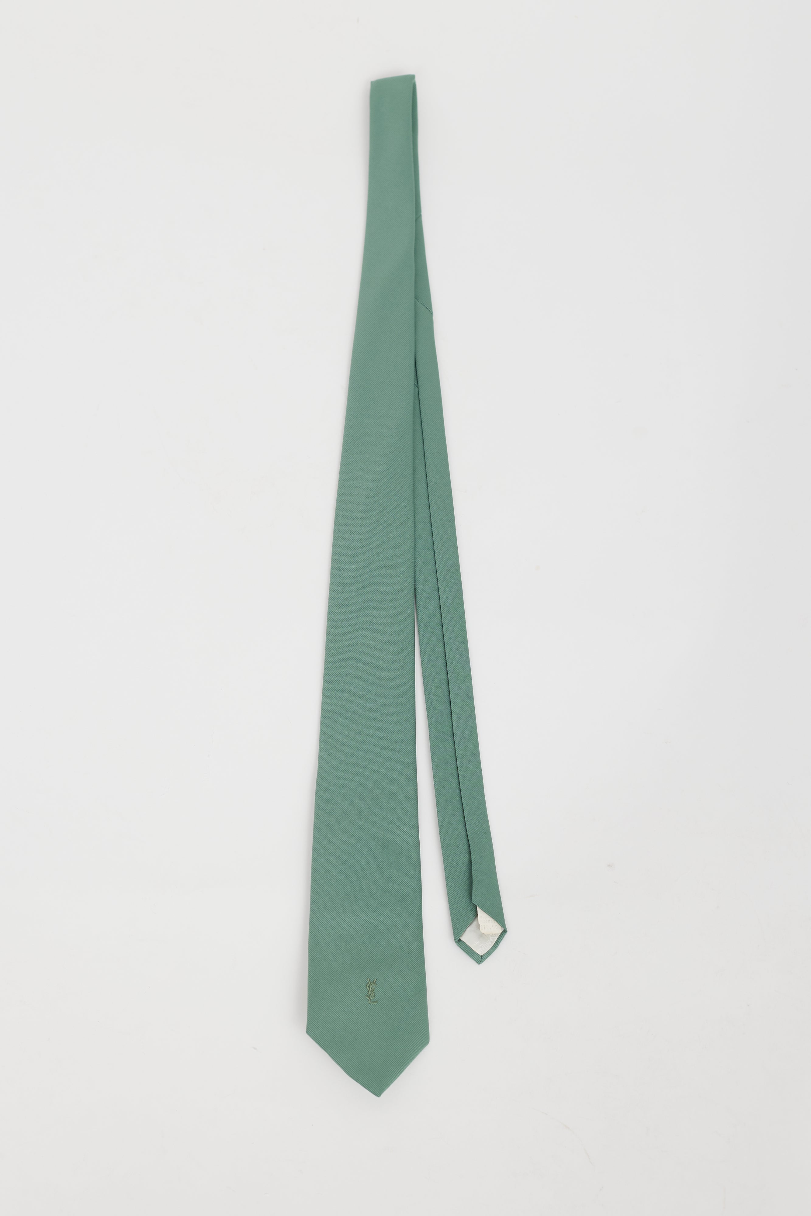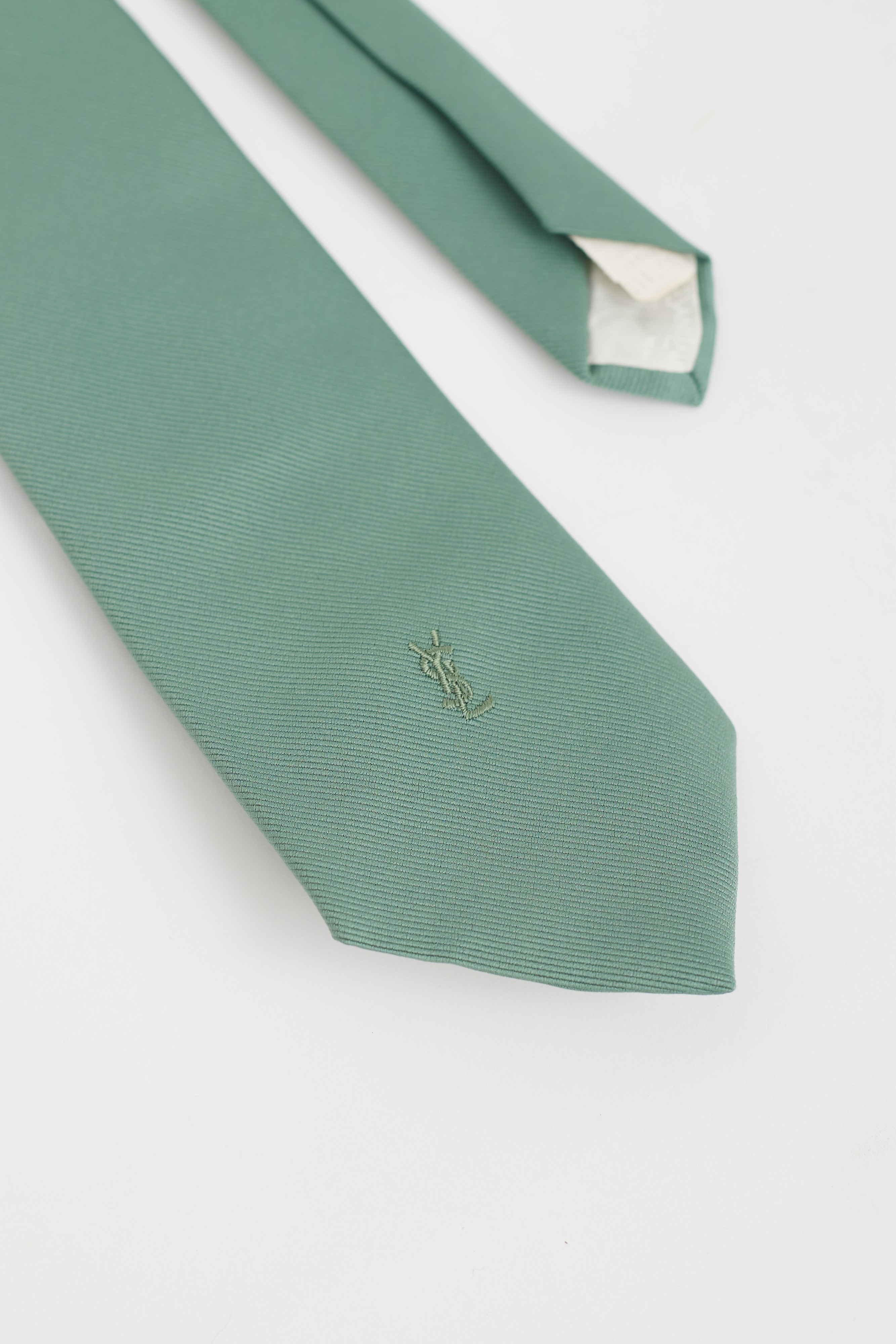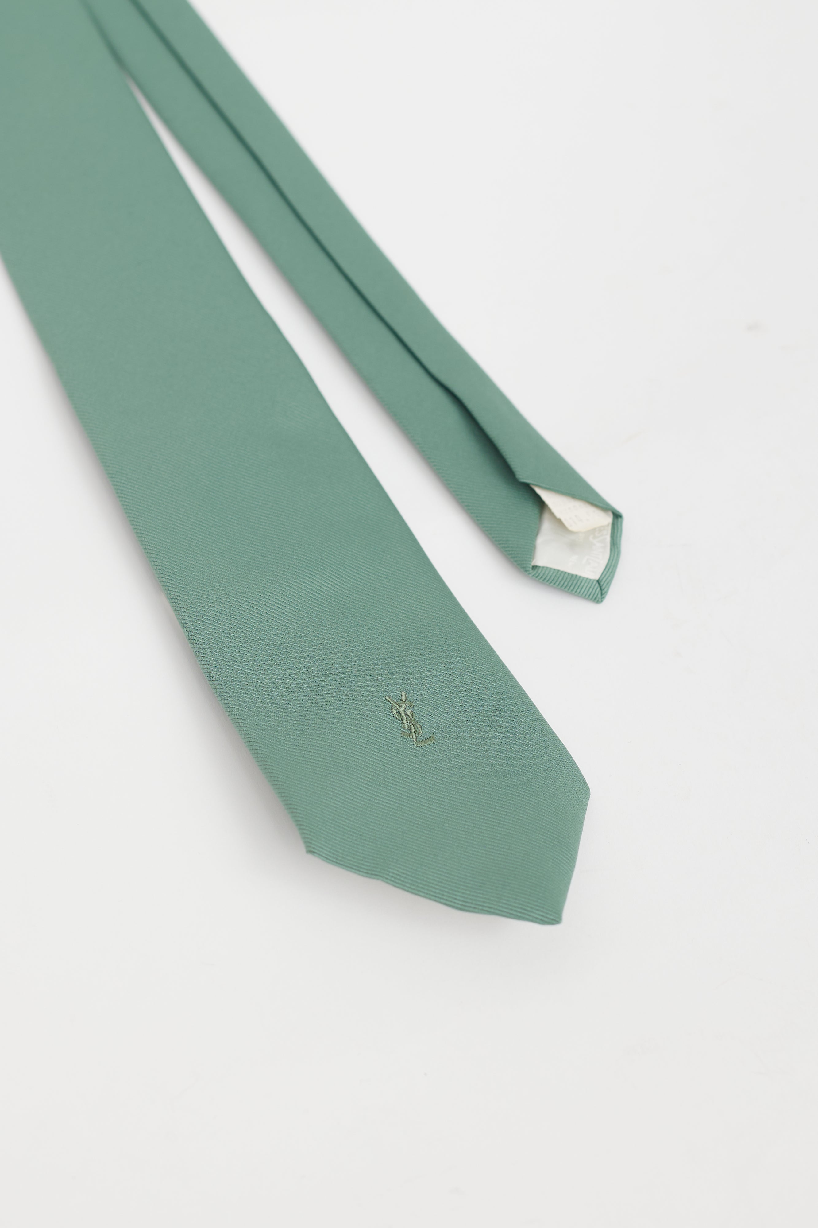Pre-owned Saint Laurent green silk tie featuring tonal Cassandre logo embroidered at front and logo tab at reversed.