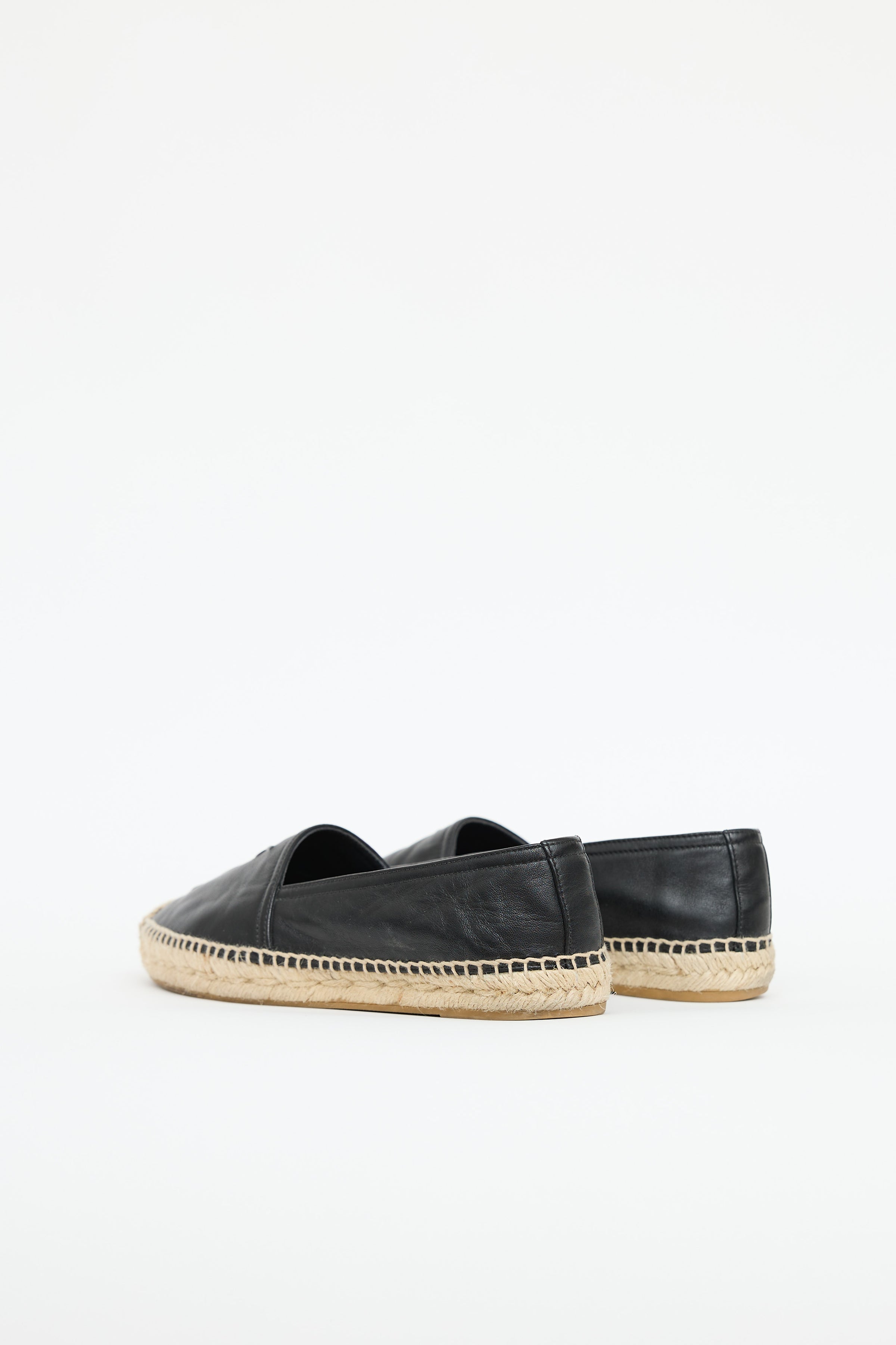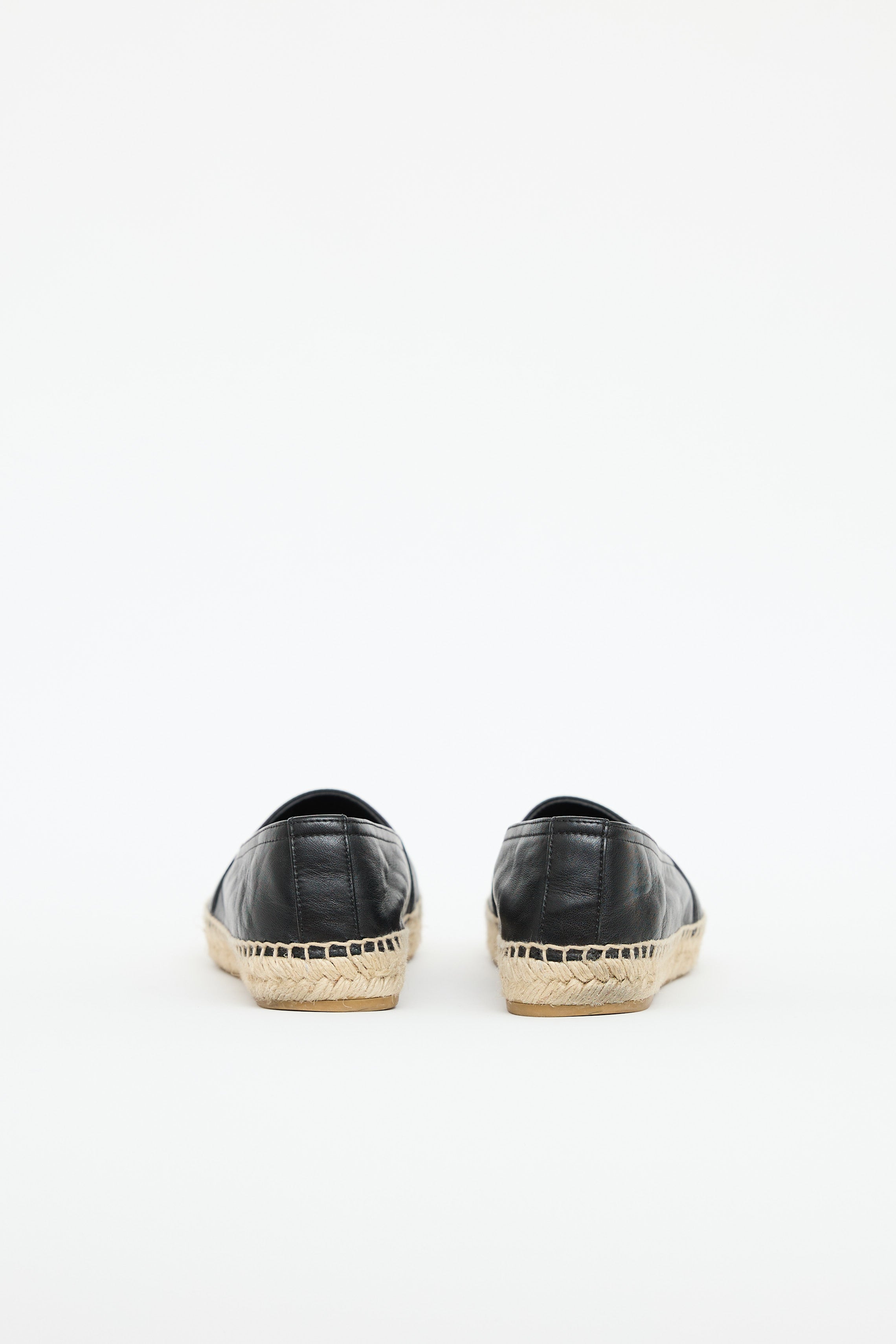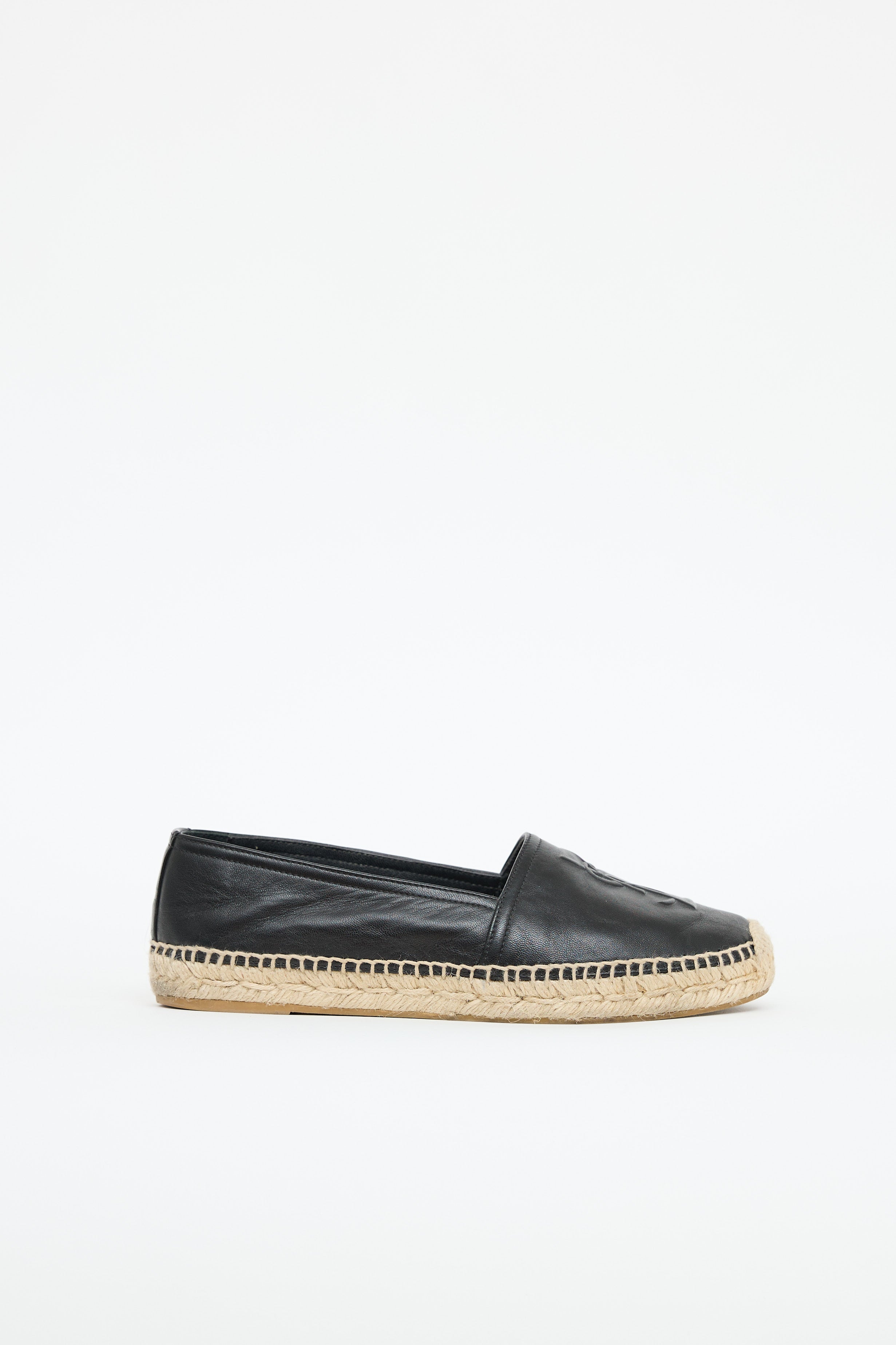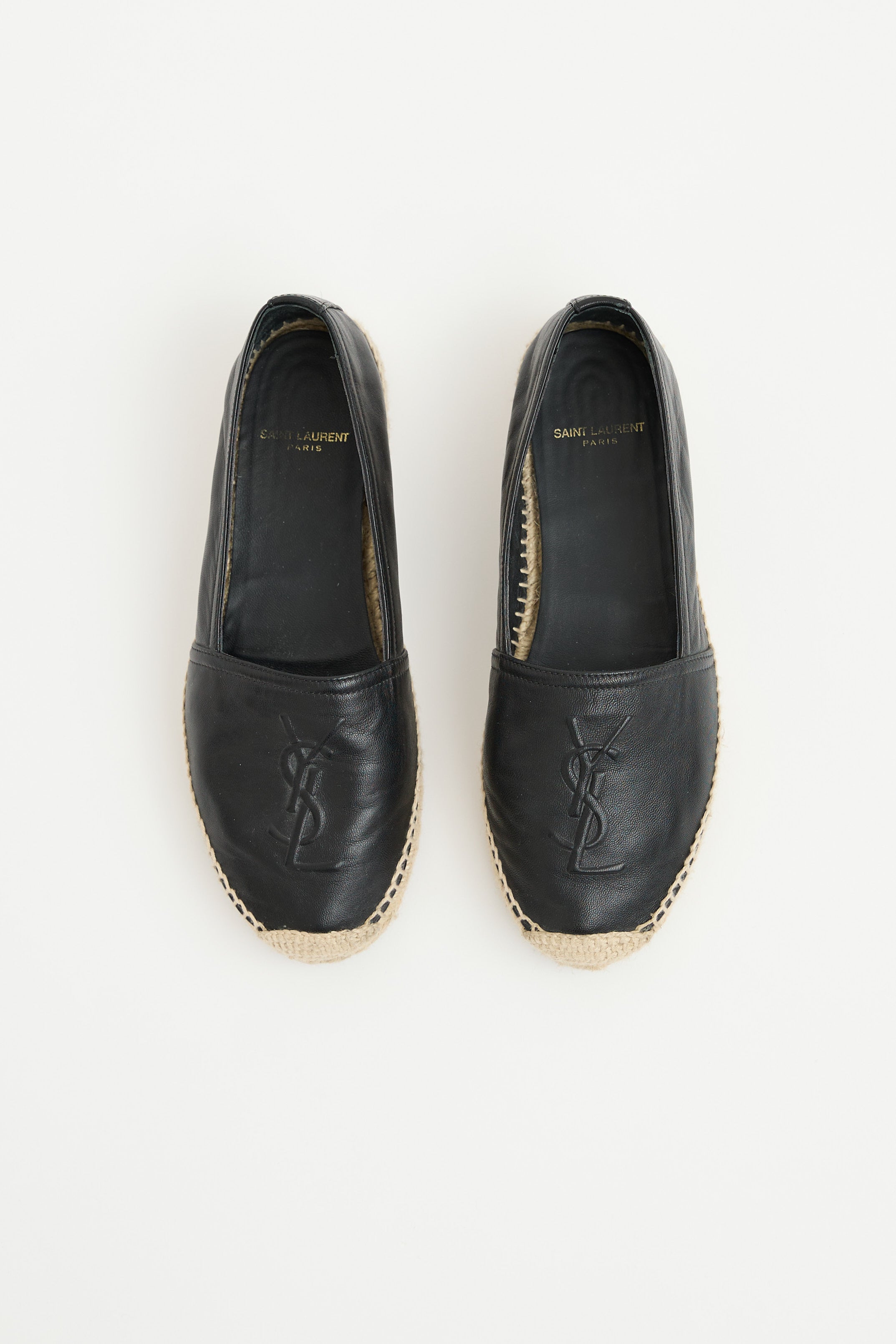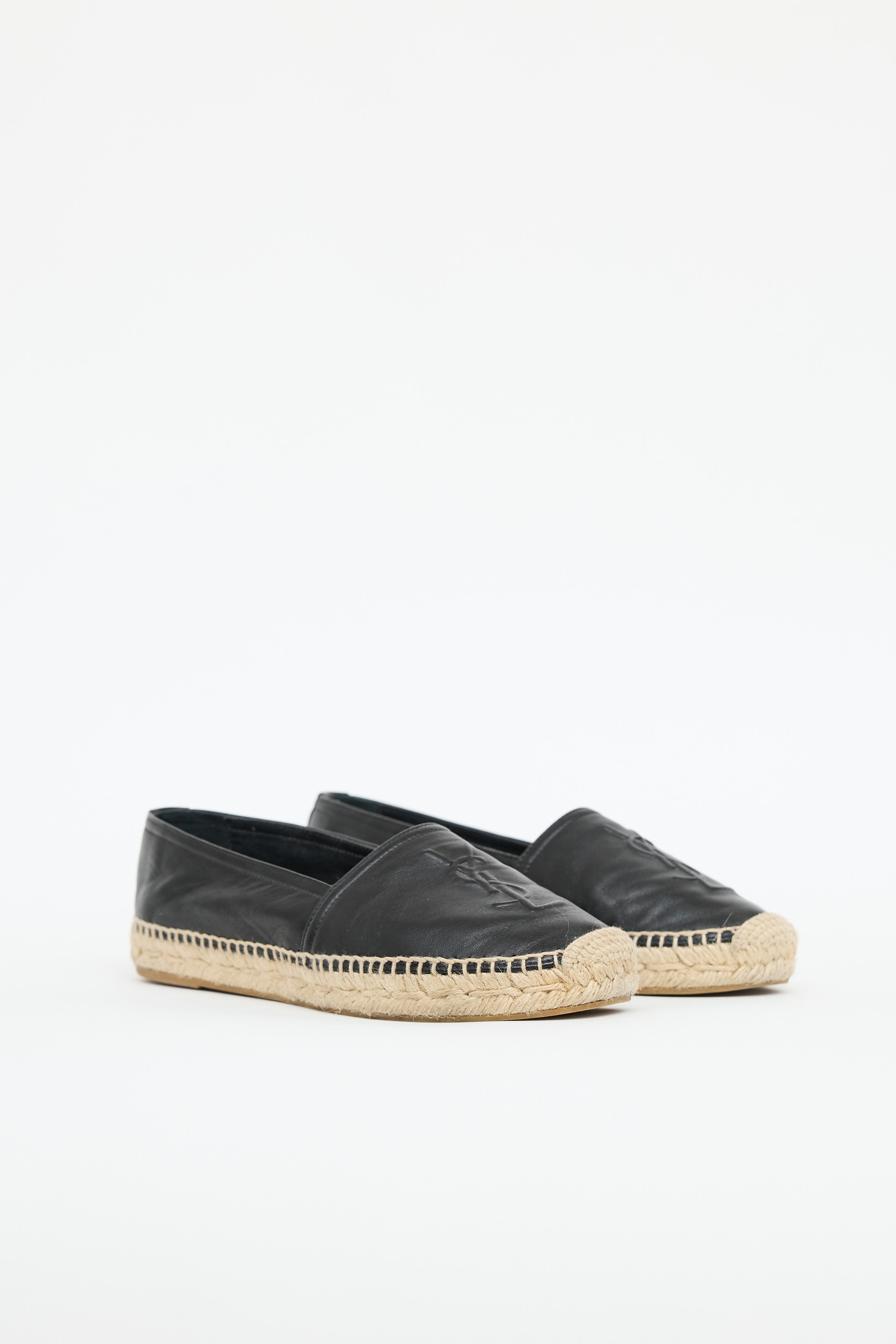 Pre-owned Saint Laurent black leather Cassandre espadrilles featuring almond toe, embossed YSL logo on upper and jute midsole.