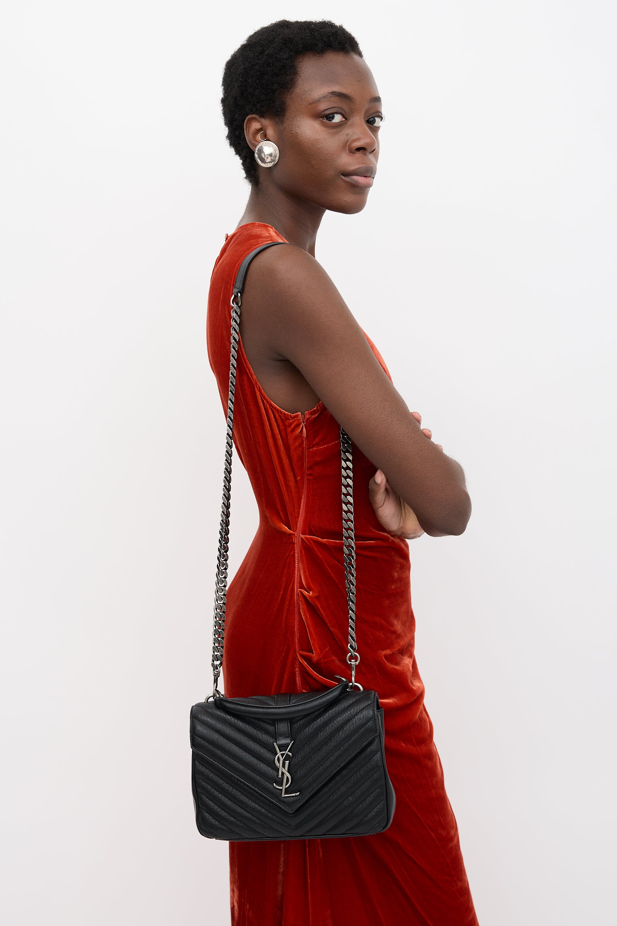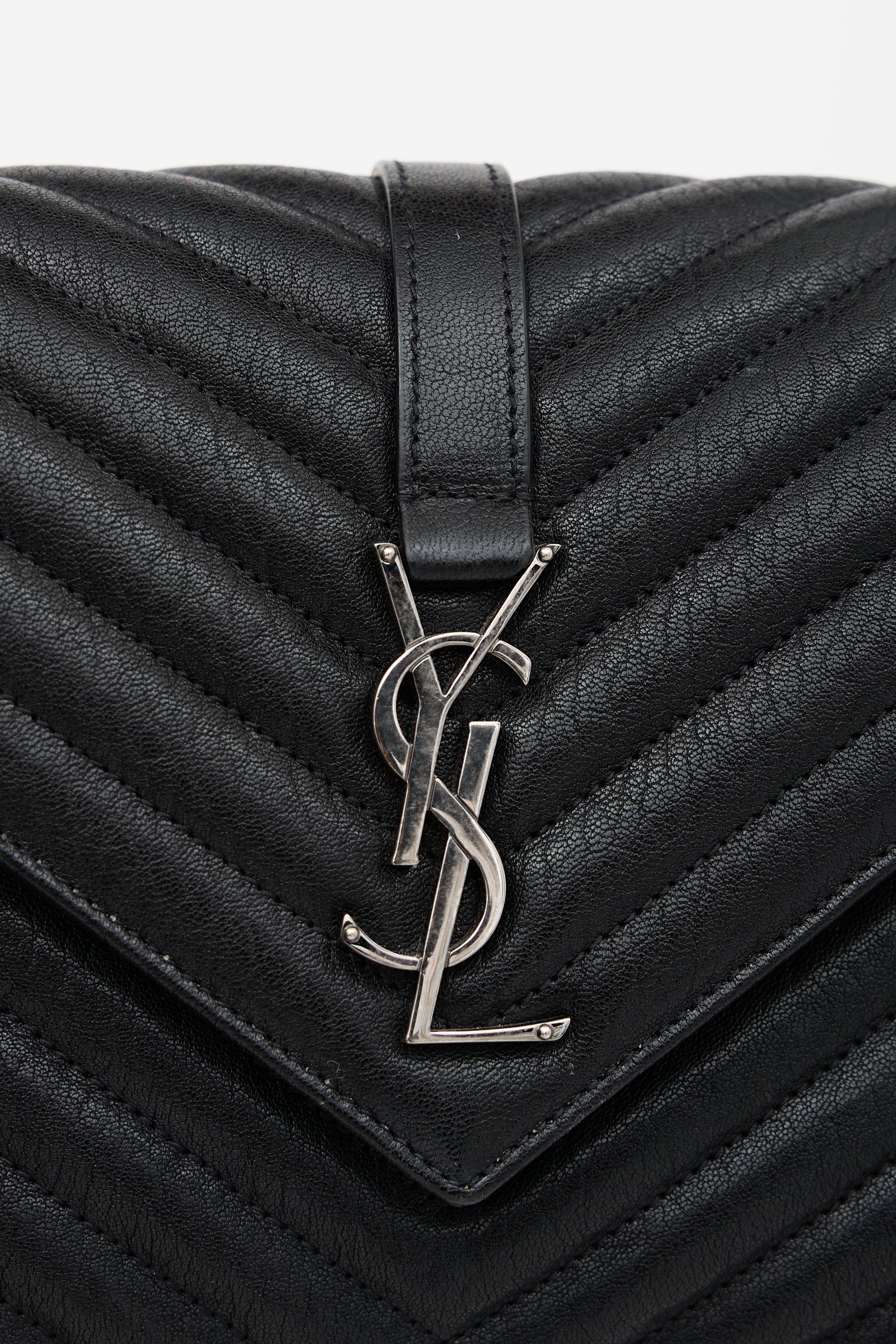 Pre-owned Saint Laurent black quilted leather College bag featuring silver tone hardware, rolled leather top handle, detachable chain link shoulder strap, front flap with Cassandre logo hardware, back slip pocket, magnetic snap closure, and two lined main compartments with one zippered divider and one slip pocket. Comes with original dust bag.
