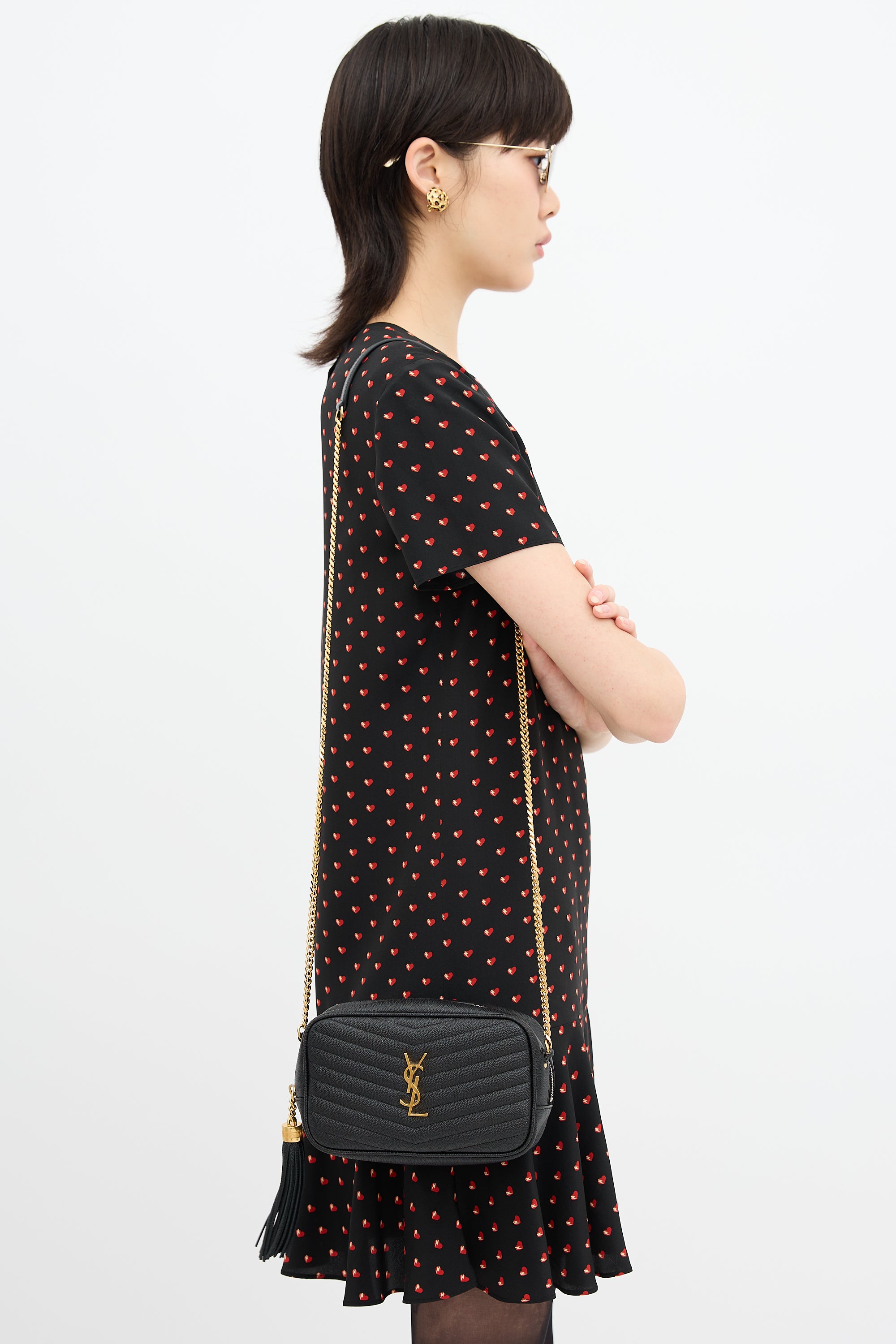Pre-owned Saint Laurent black quilted leather Mini Lou crossbody bag featuring gold tone hardware, logo at front face, tassel charm, top zip closure, chain shoulder strap, back slip pocket, and one lined main compartment with three slip pockets. Comes with original dust bag.