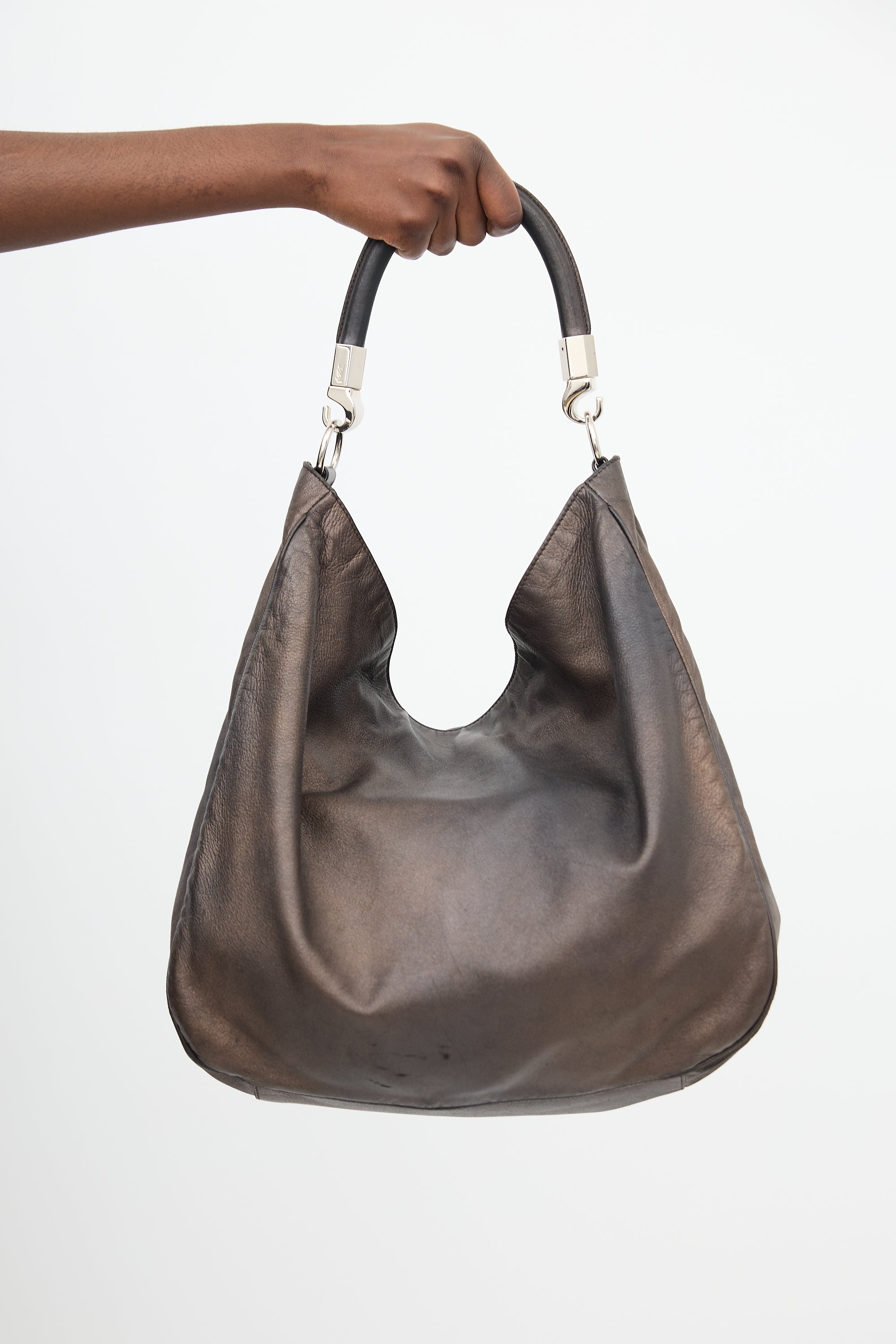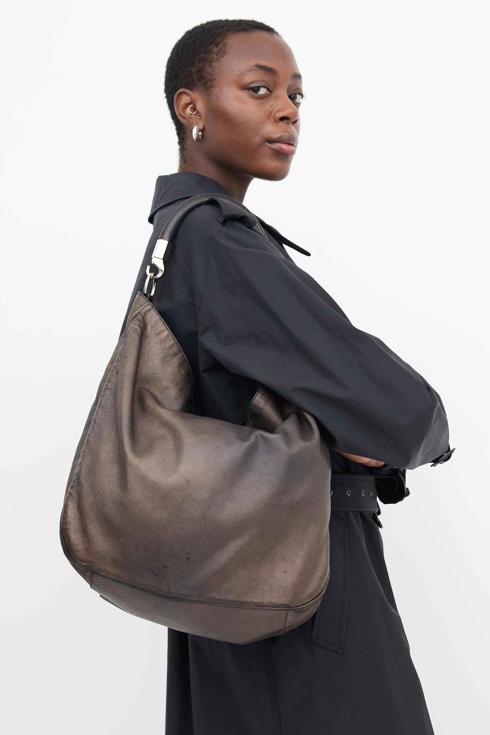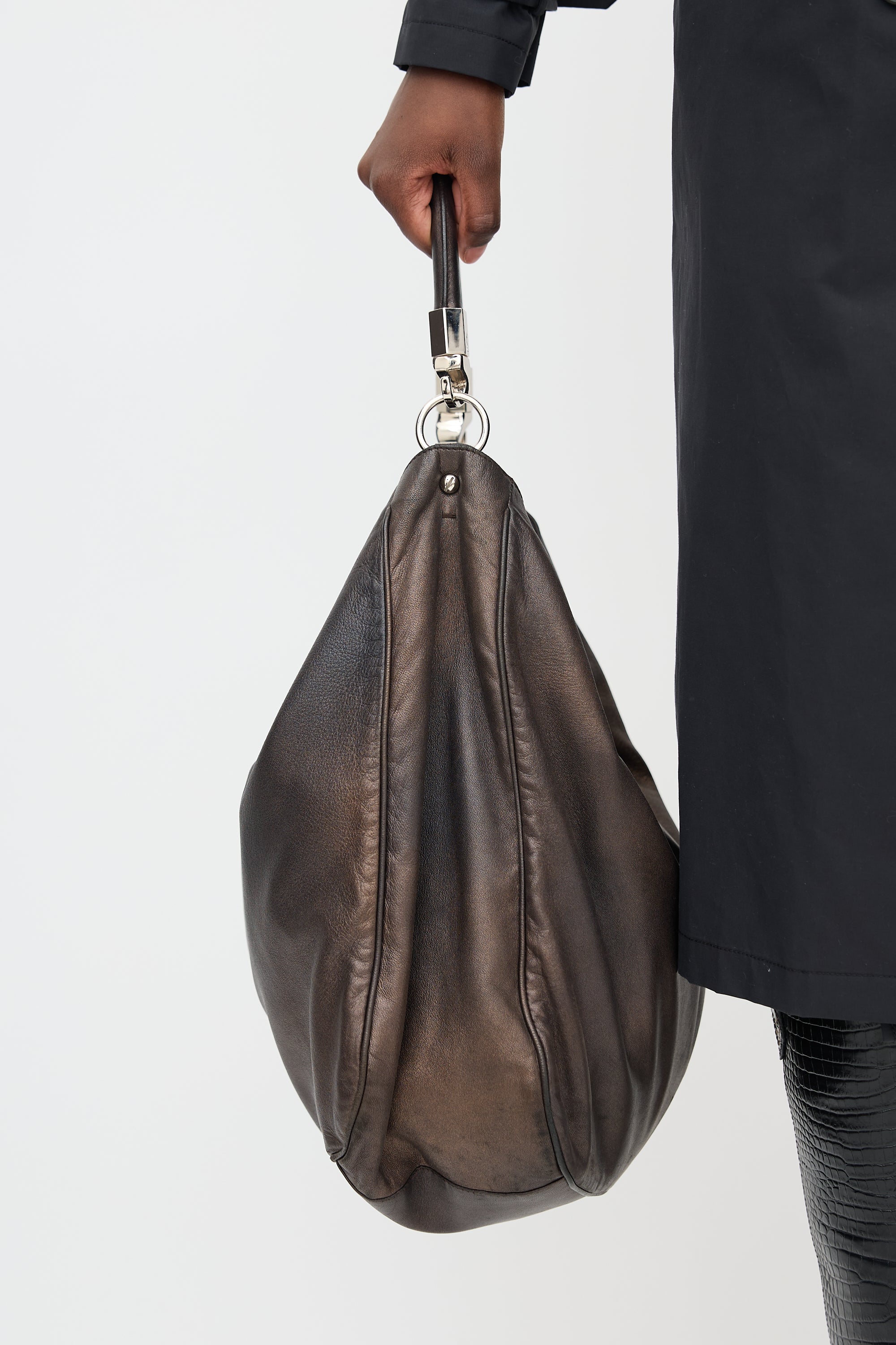 Pre-owned Yves Saint Laurent bronze leather Roady shoulder bag featuring silver tone hardware, single structured top handle, snap button closure, satin lining, and one zip and two slip pockets inside. Comes with original dust bag.