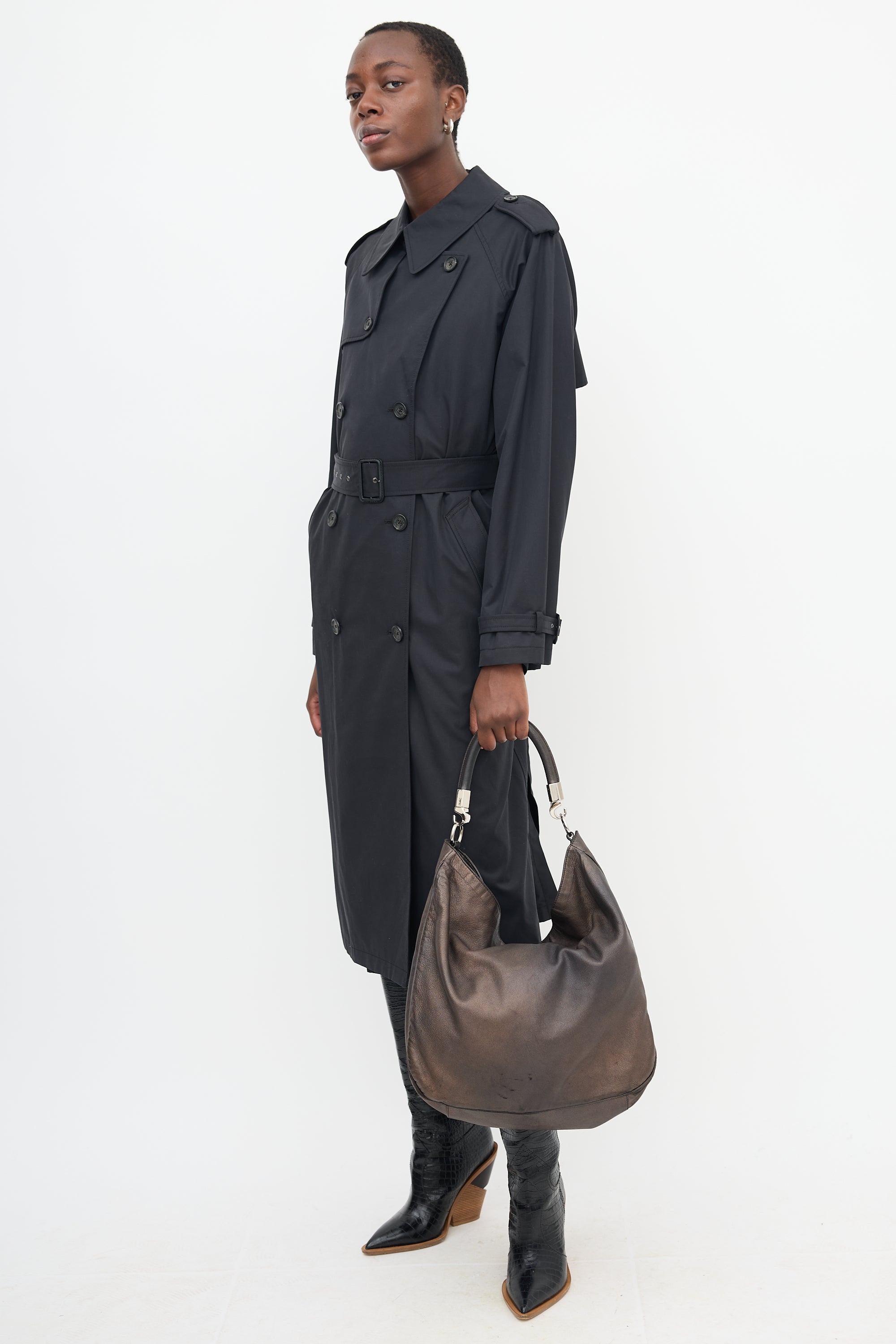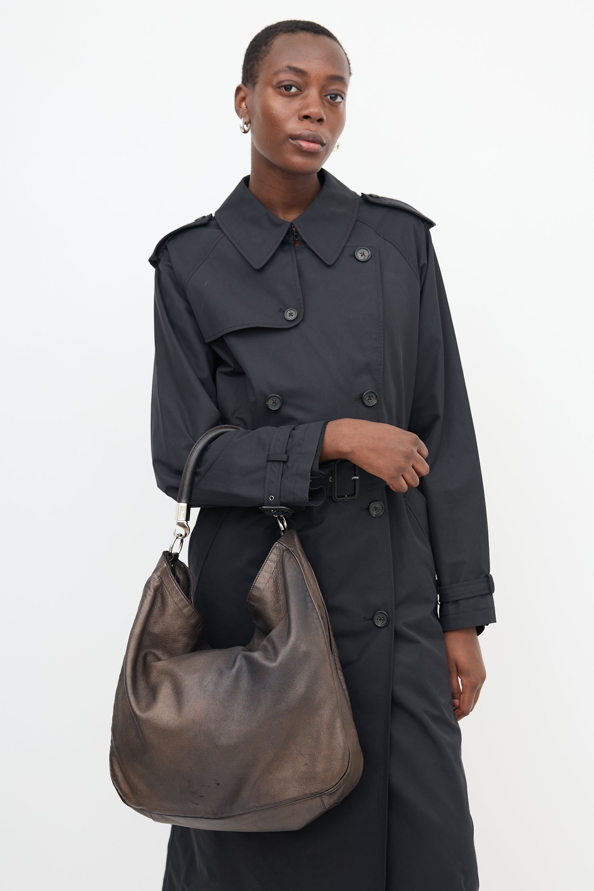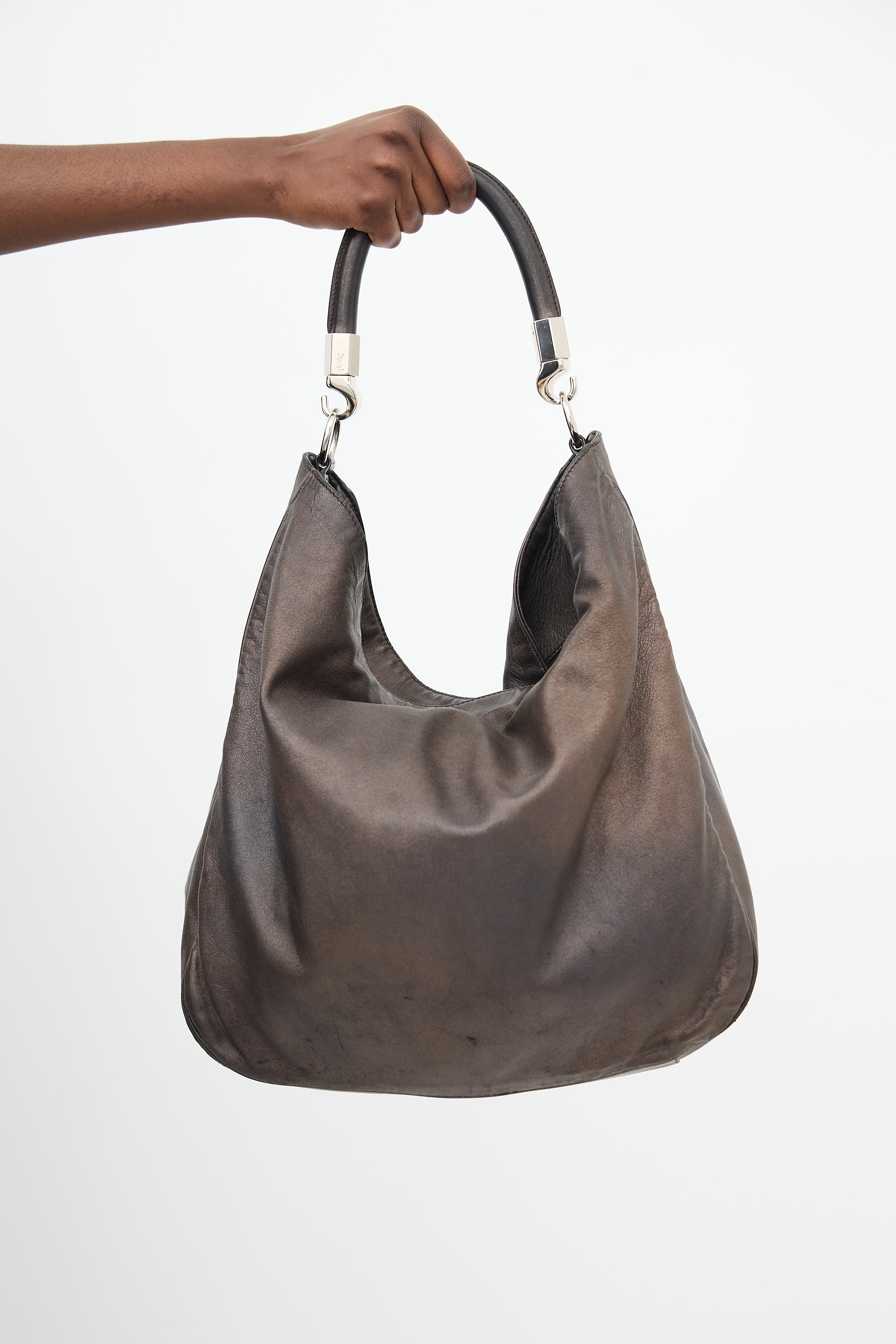 Pre-owned Yves Saint Laurent bronze leather Roady shoulder bag featuring silver tone hardware, single structured top handle, snap button closure, satin lining, and one zip and two slip pockets inside. Comes with original dust bag.