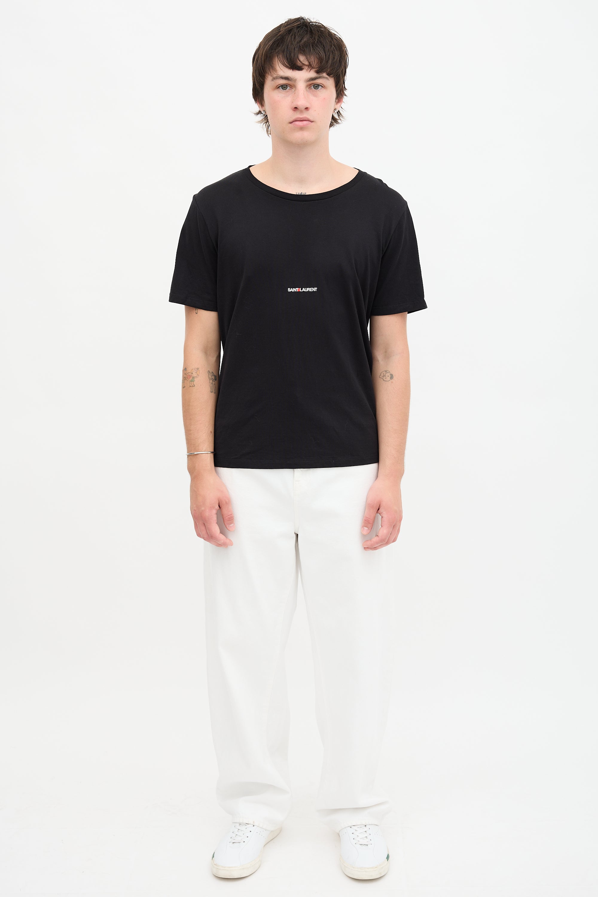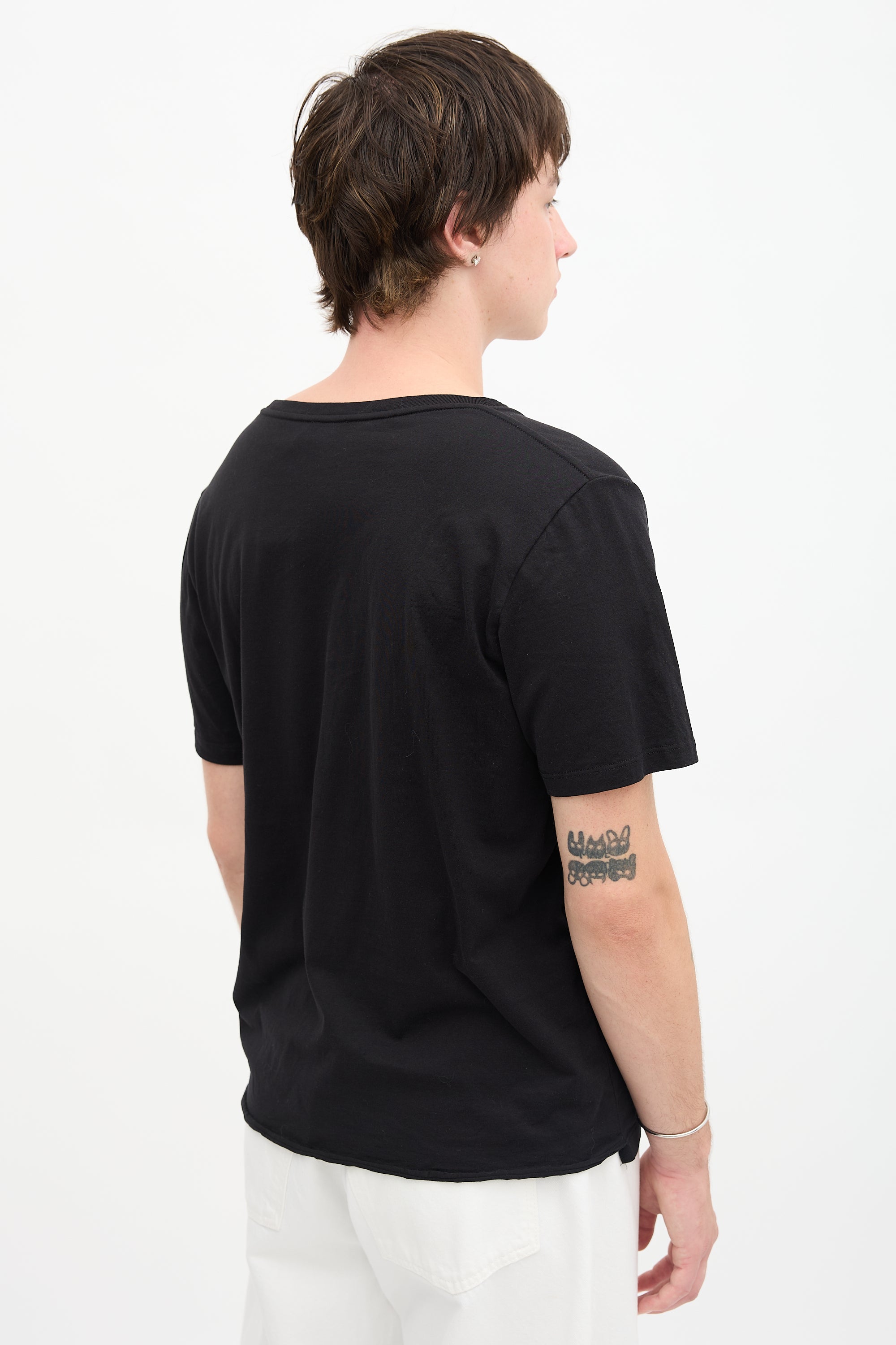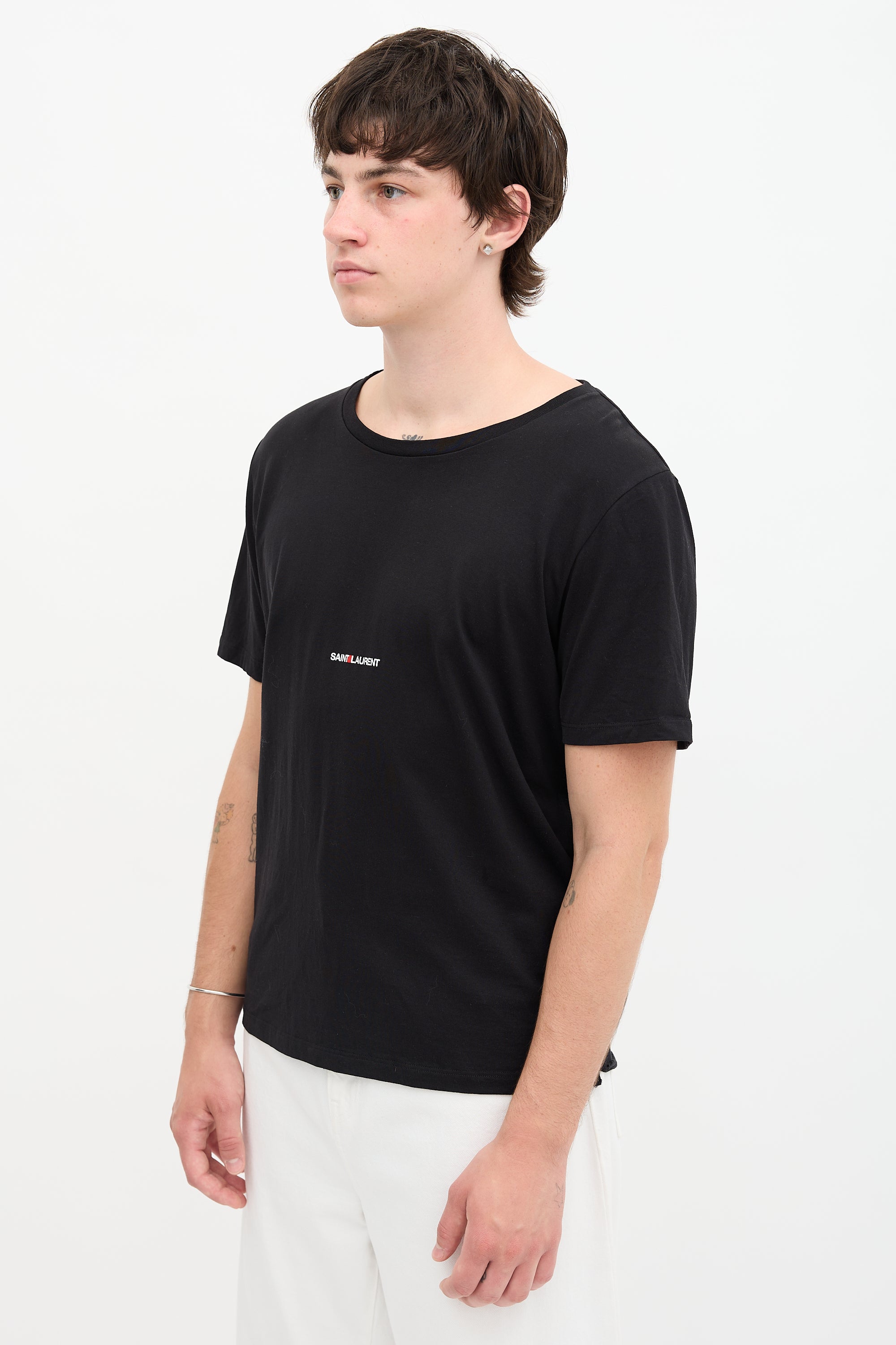 Pre-owned Saint Laurent black T-shirt featuring a crew neckline, printed logo at chest, and rolled back hem.