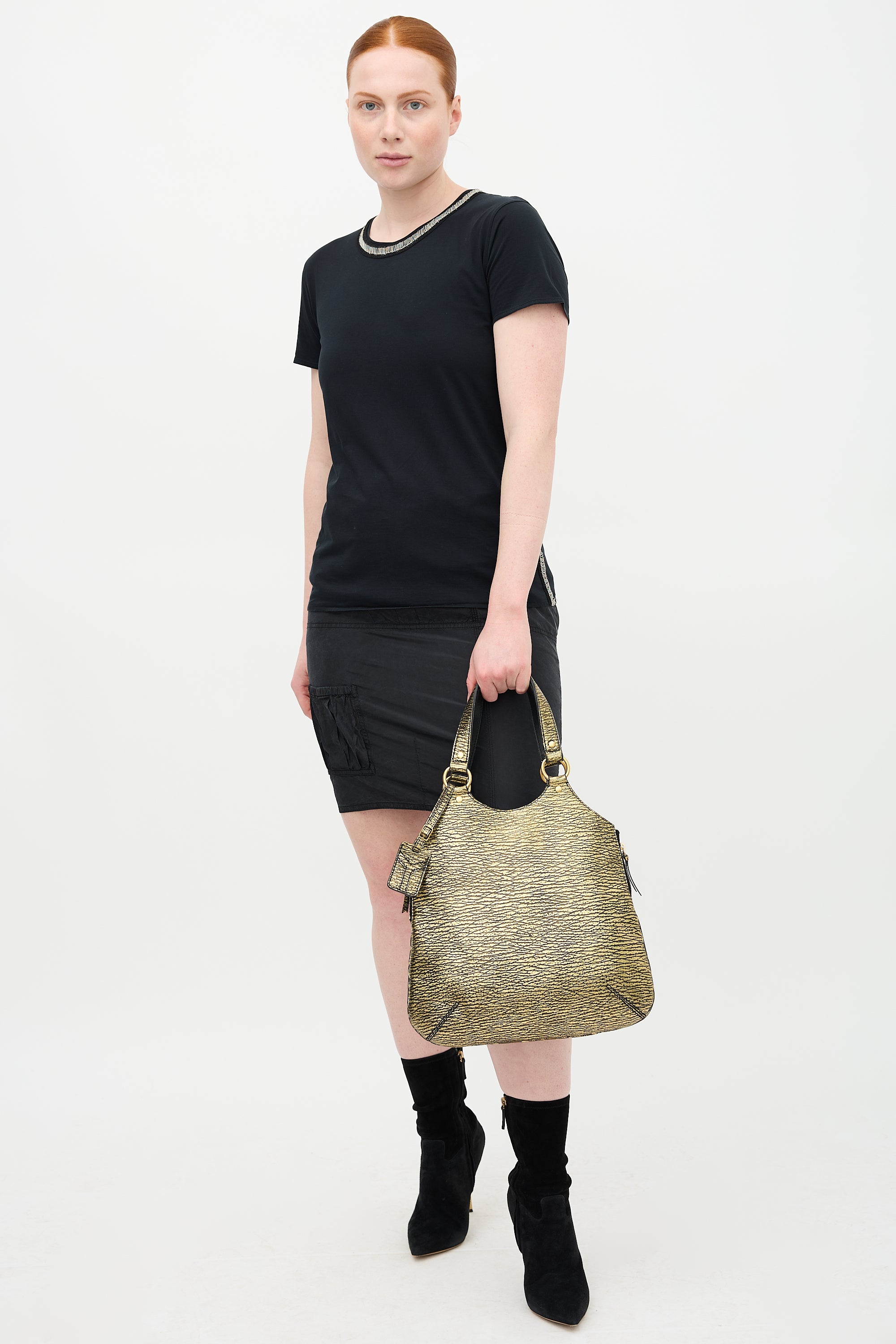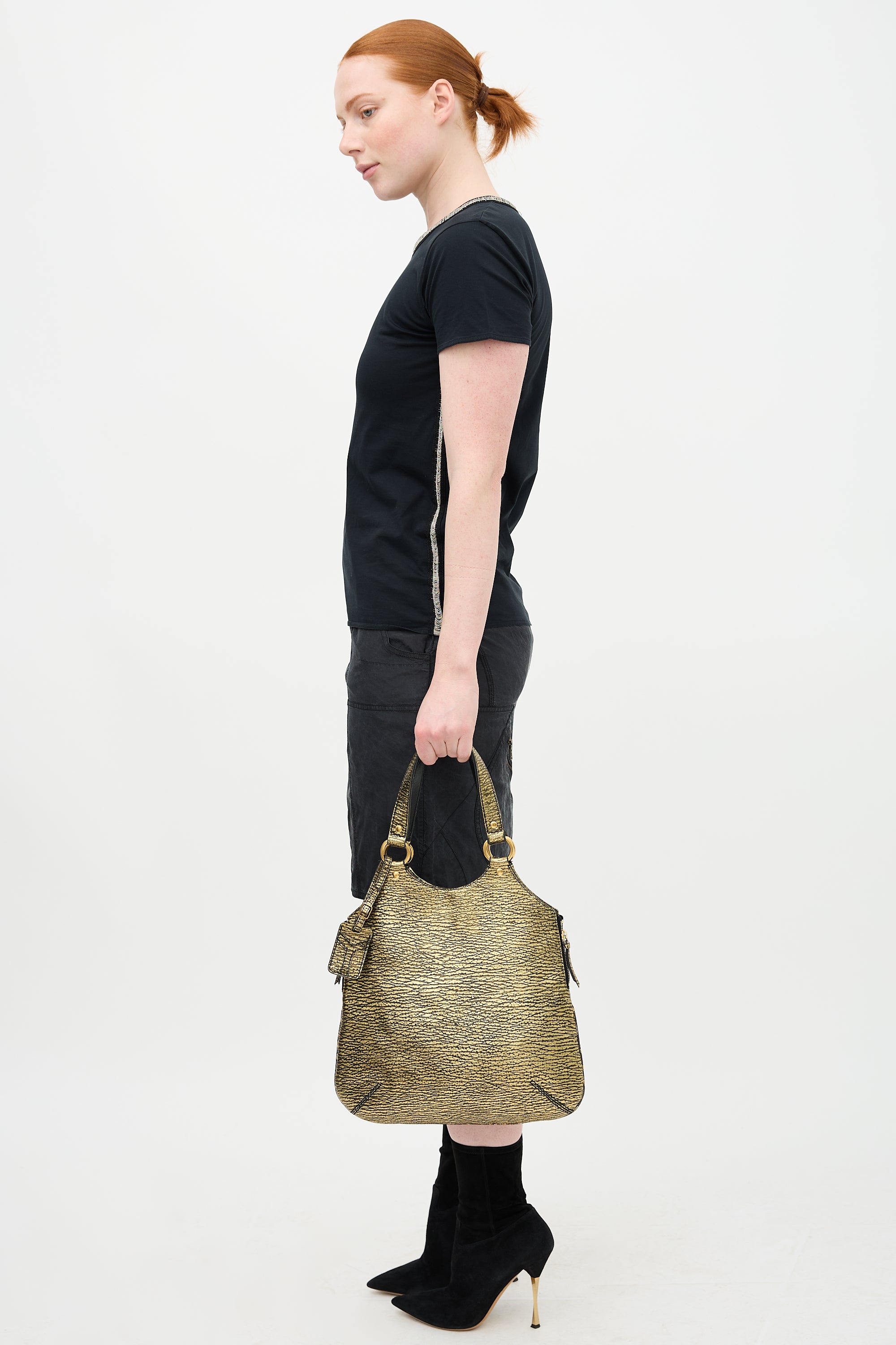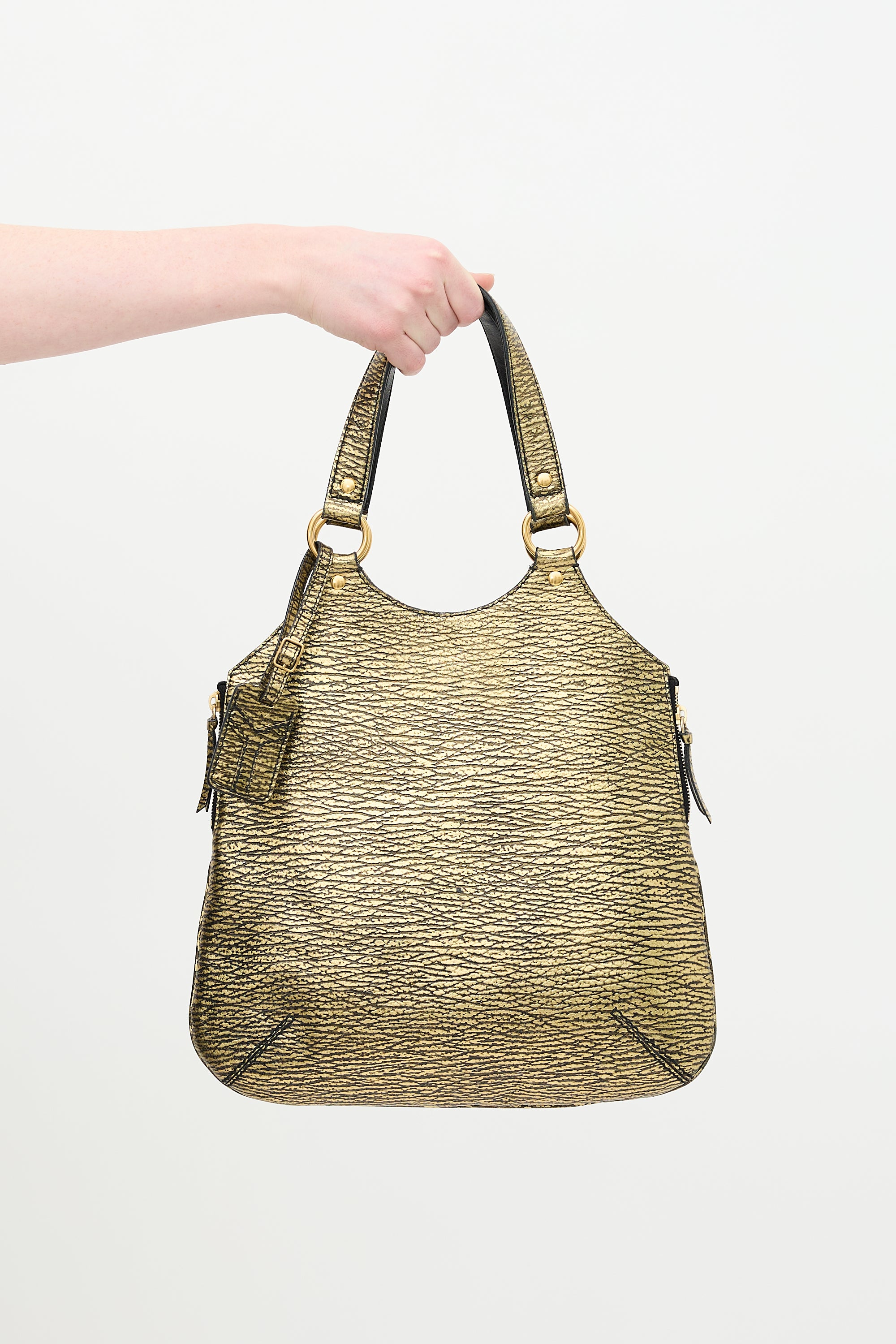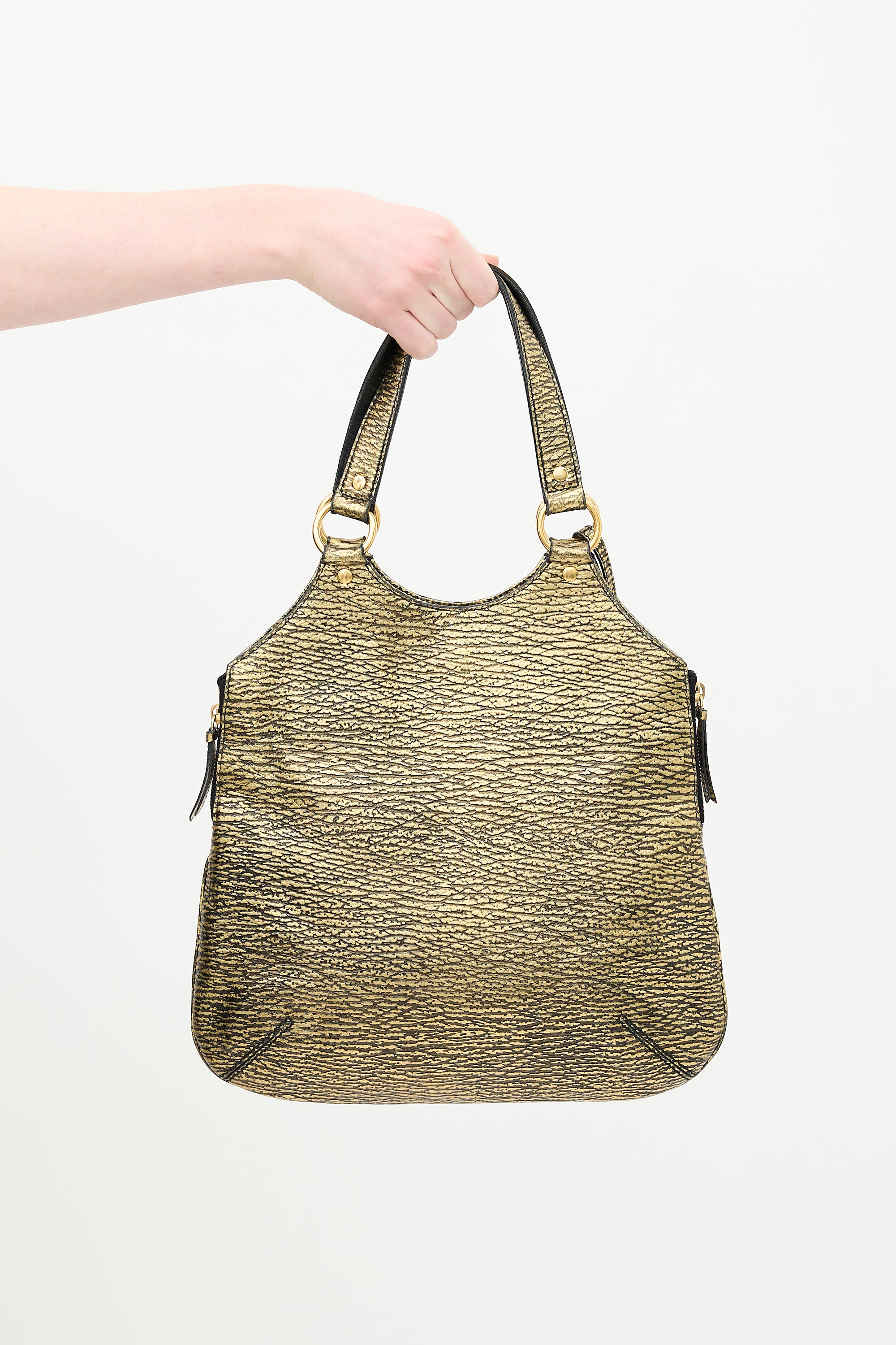 Pre-owned Saint Laurent gold metallic leather tote featuring two flat top handles, gold tone hardware, zipped sides, textured body, snap closure, and one lined main compartment with zip pocket and slip pocket.