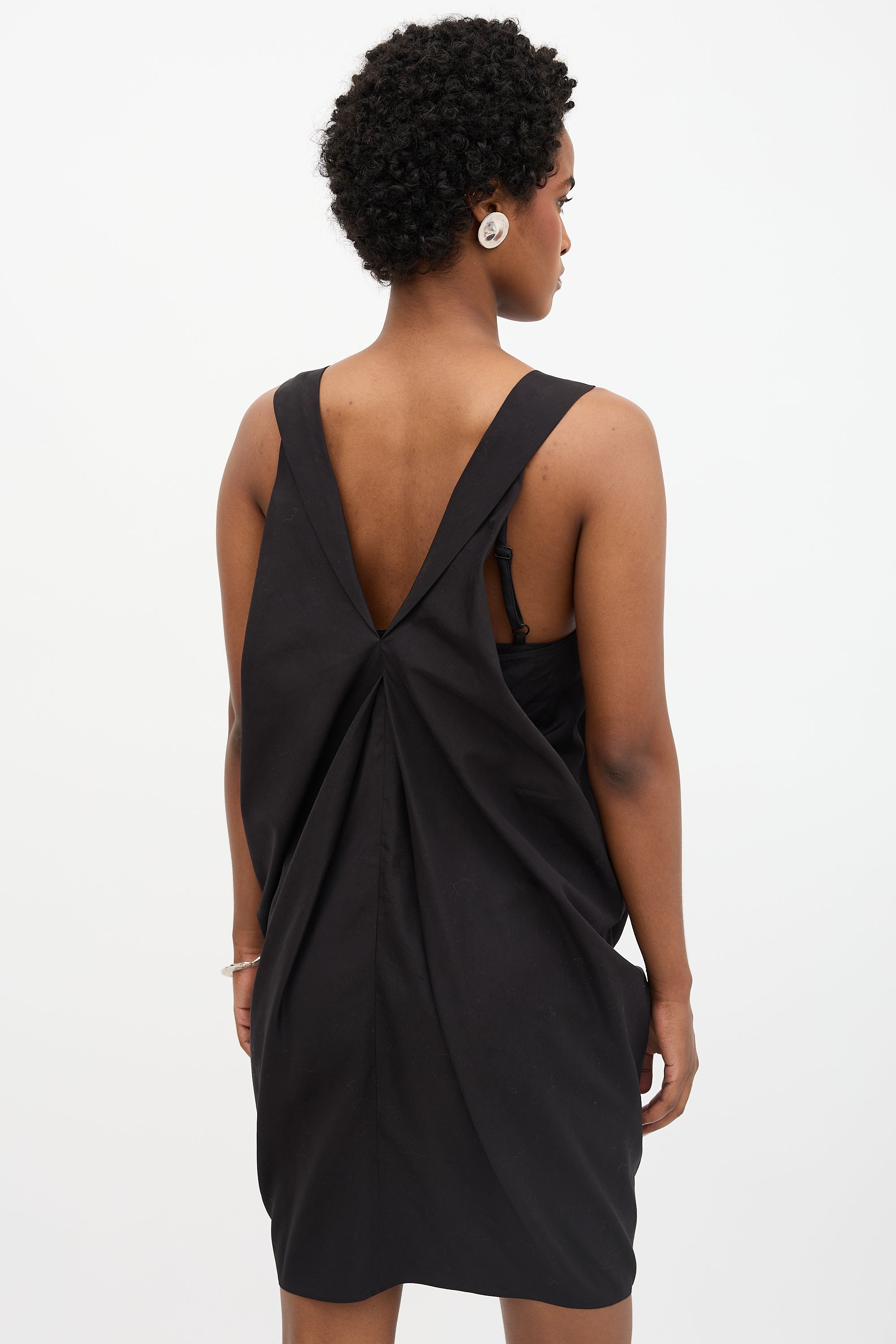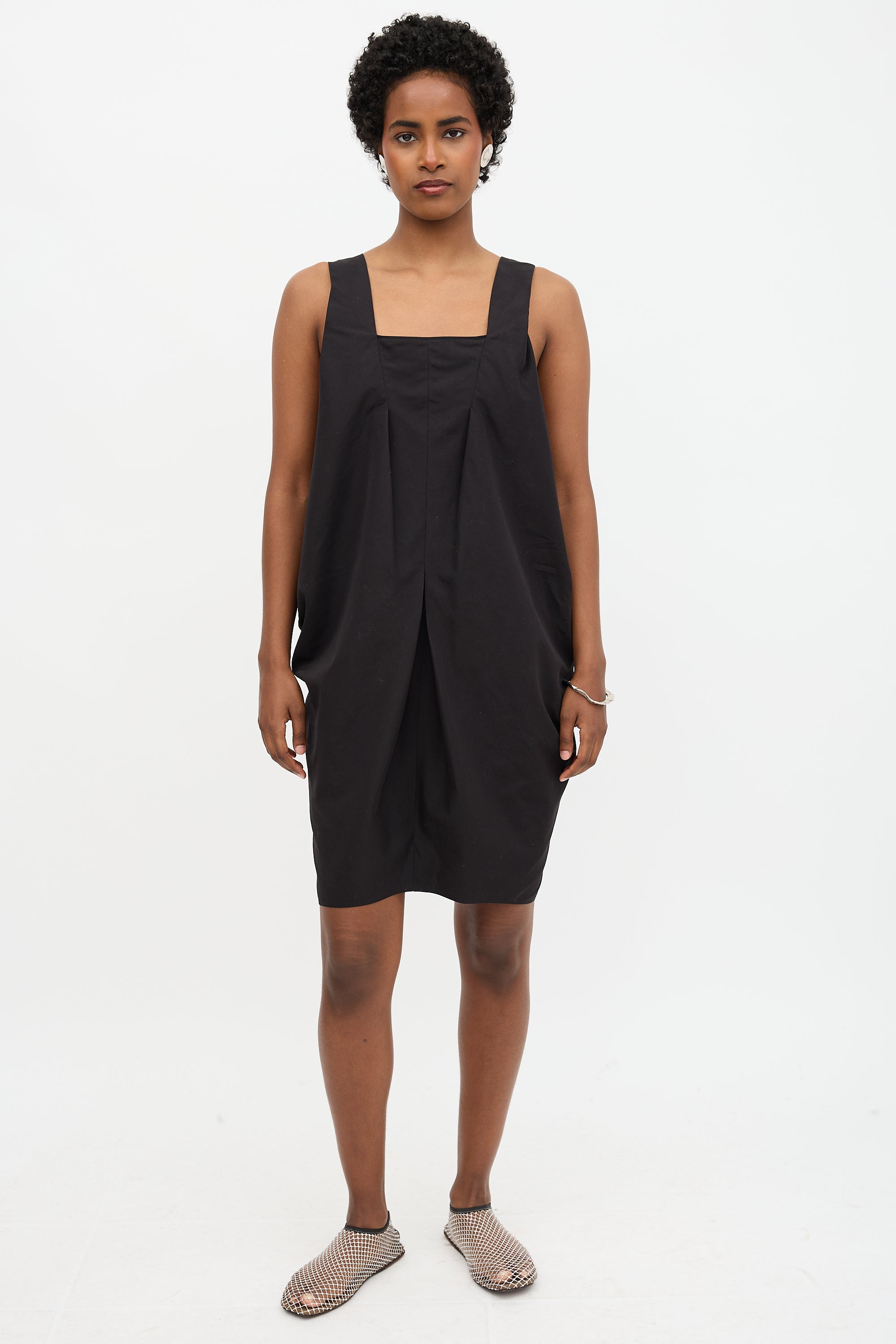 Pre-owned Yves Saint Laurent black poplin dress featuring a square neckline, pleated front with draped sides, button fastenings at interior, and a V-cut back.