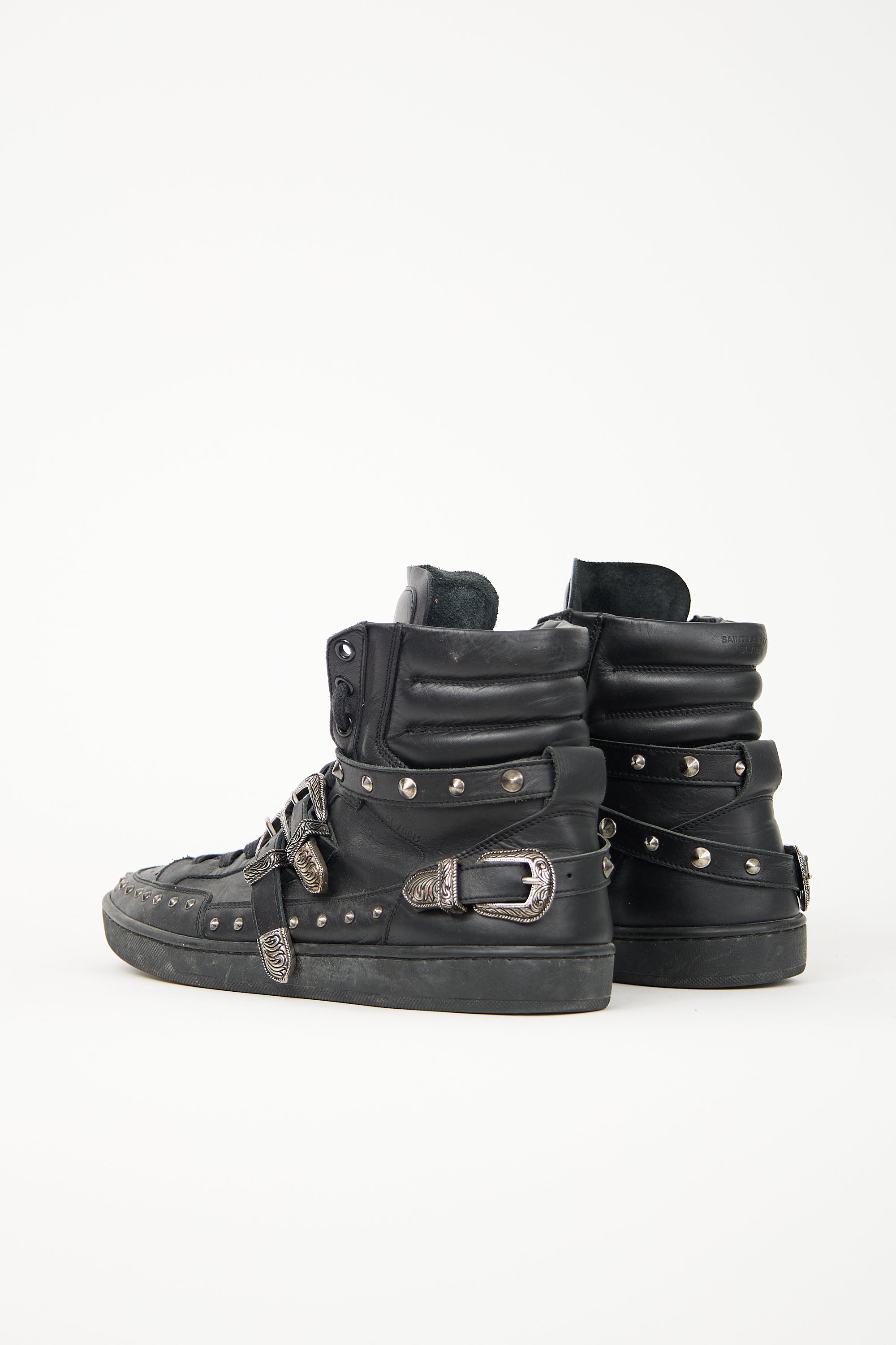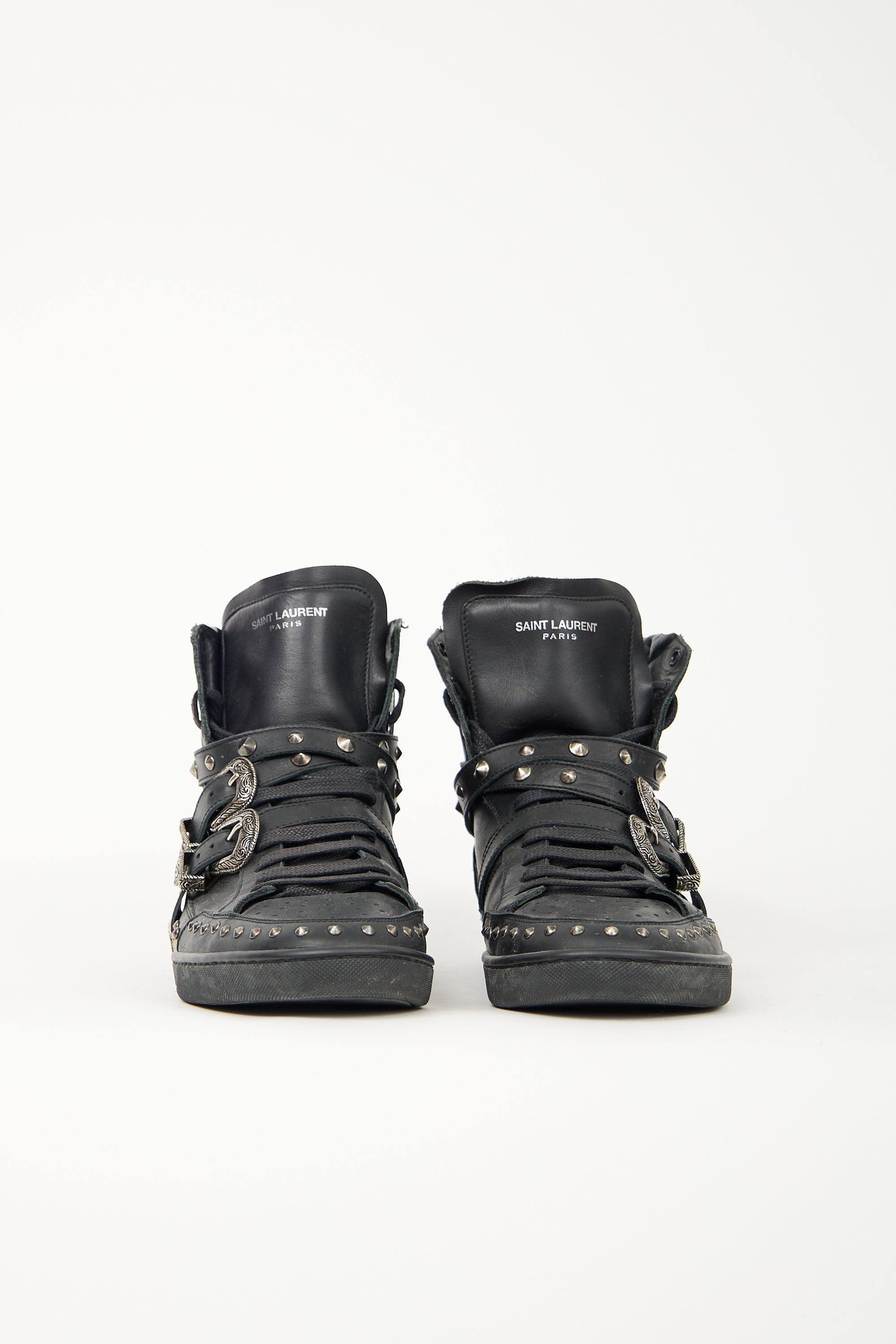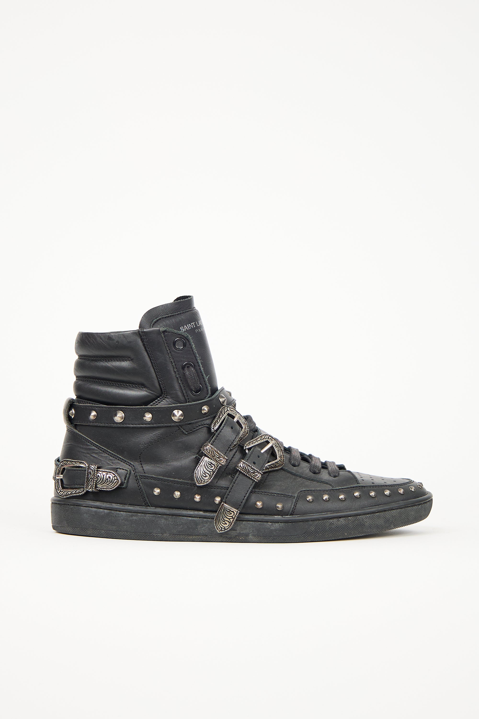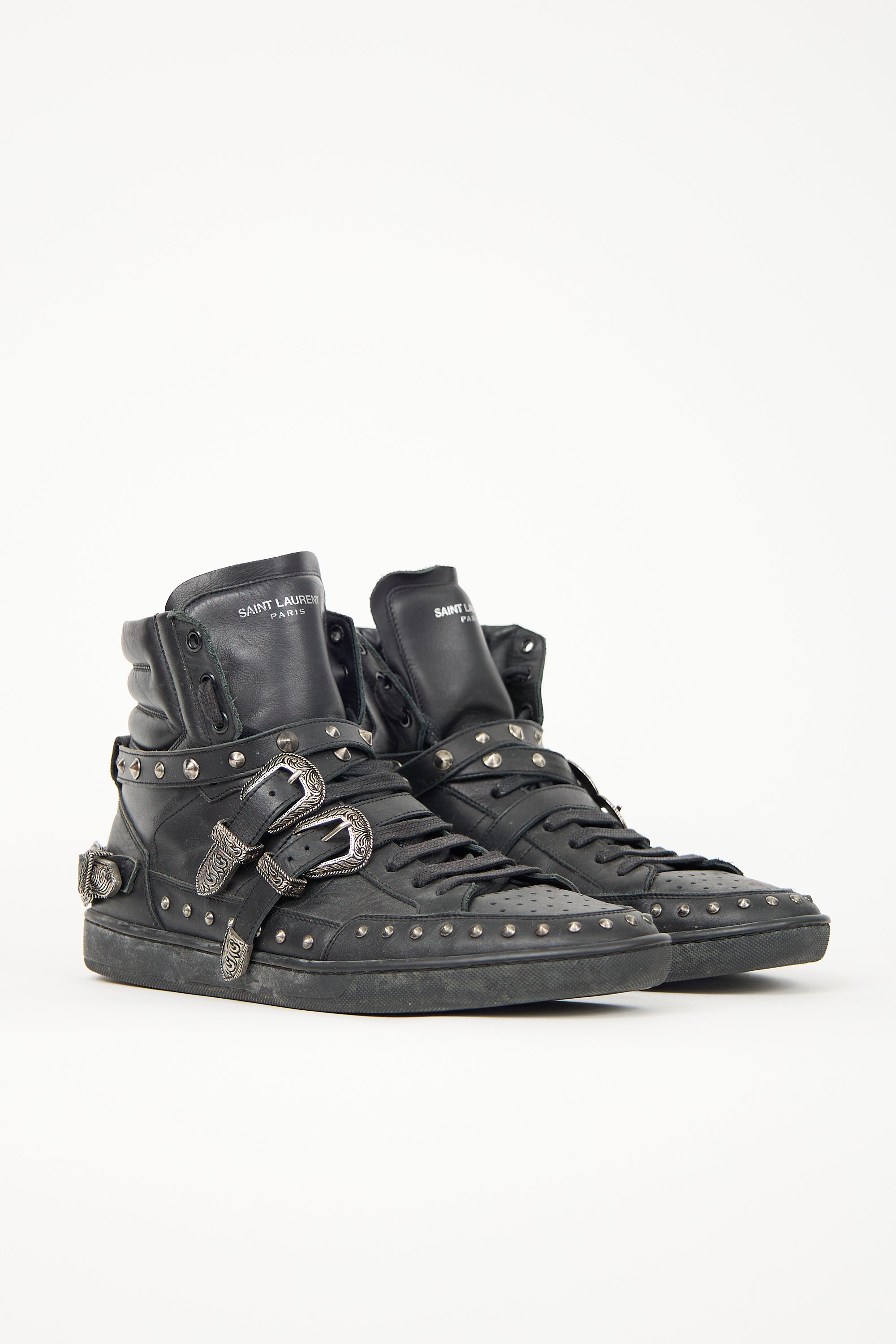 Pre-owned Saint Laurent black leather SL\08H high top sneaker featuring a perforated round toe, gunmetal tone hardware, studding at vamp, lace up closure with two buckle straps, silver tone stamped logo at tongue, studded wrap around strap at collar with buckle fastening, padded counter with debossed logo, and a tonal rubber sole.