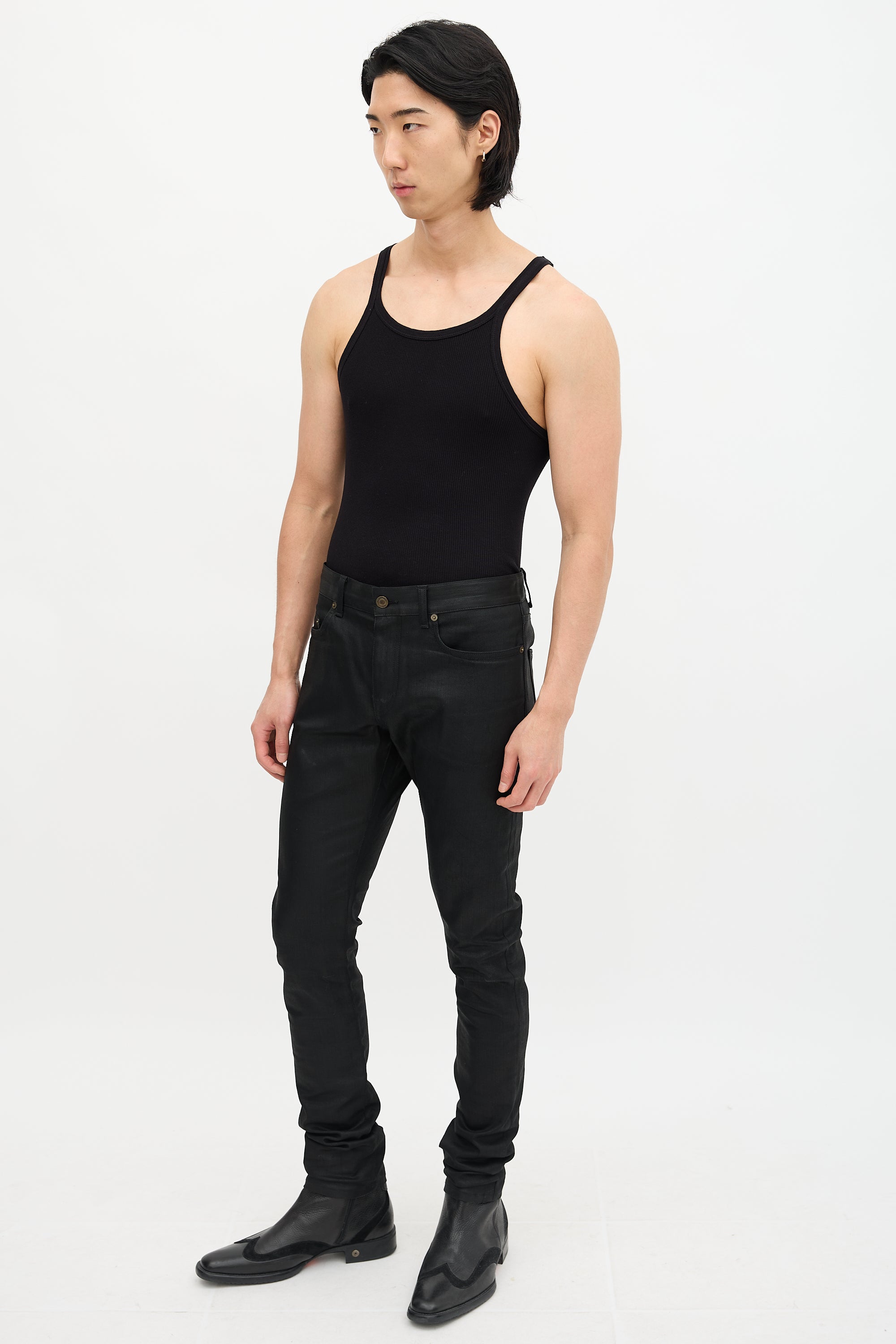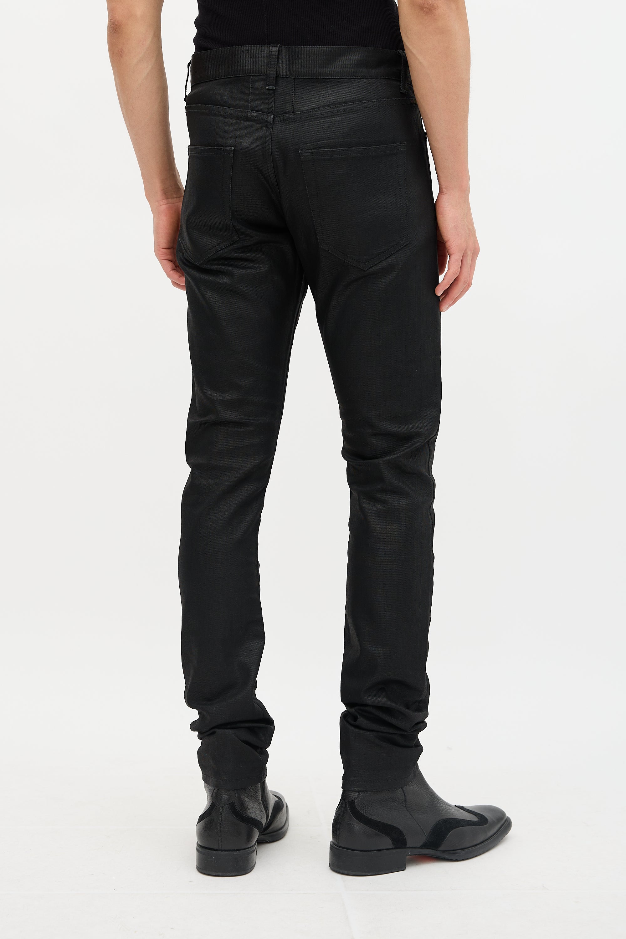 Pre-owned Saint Laurent black D02 skinny jeans featuring mid rise, five pocket styling, zip fly, and waxed finish.
