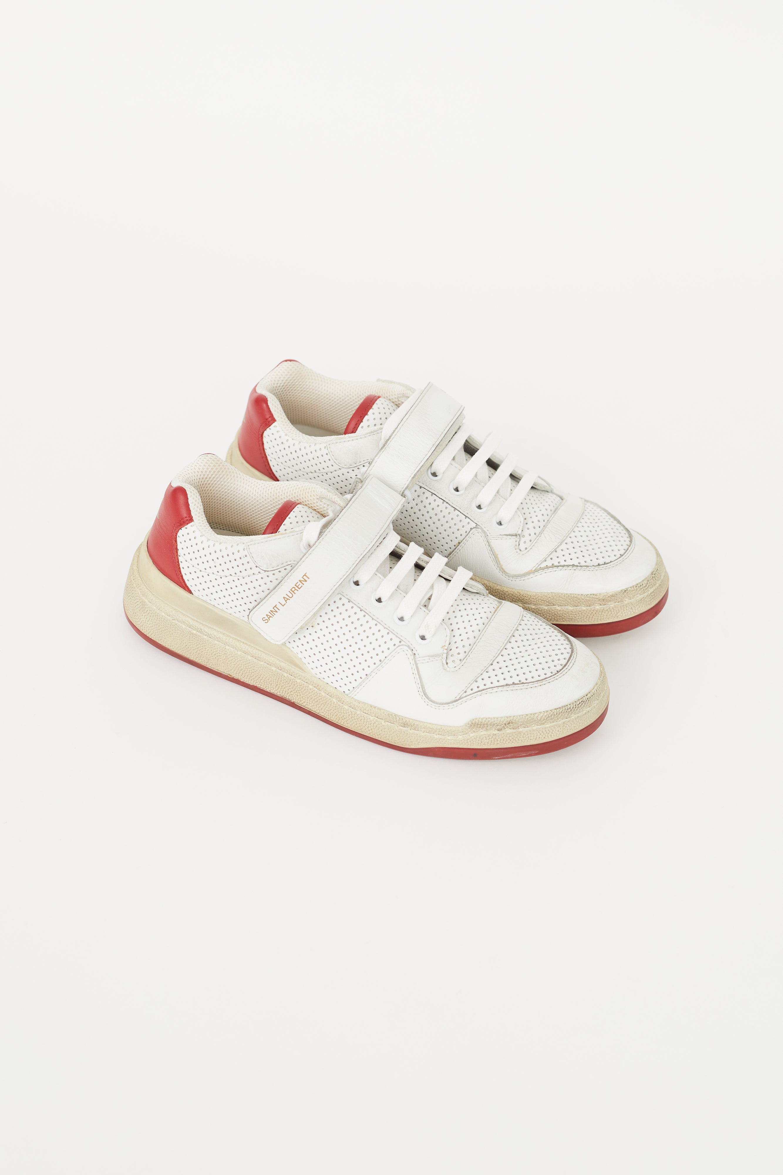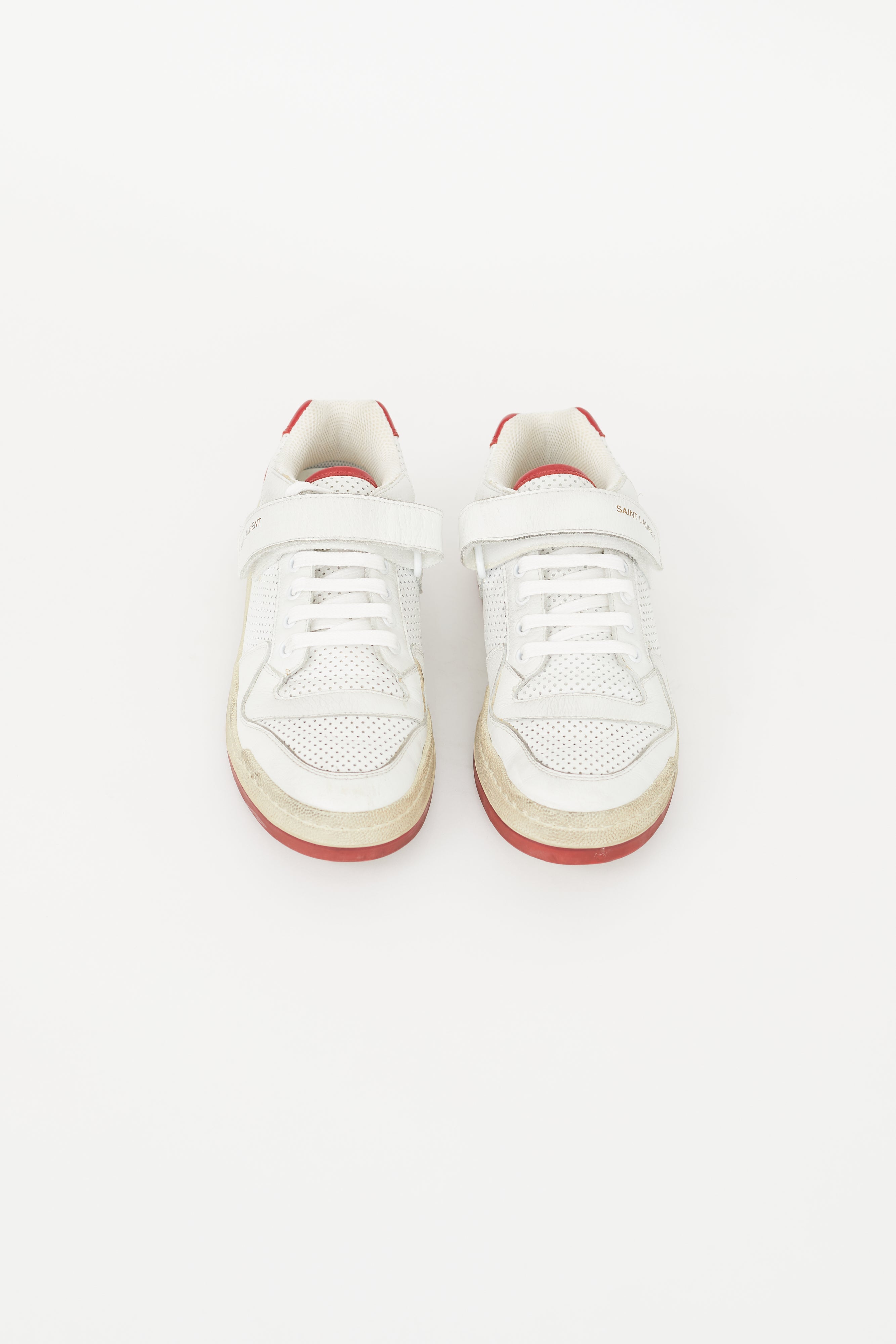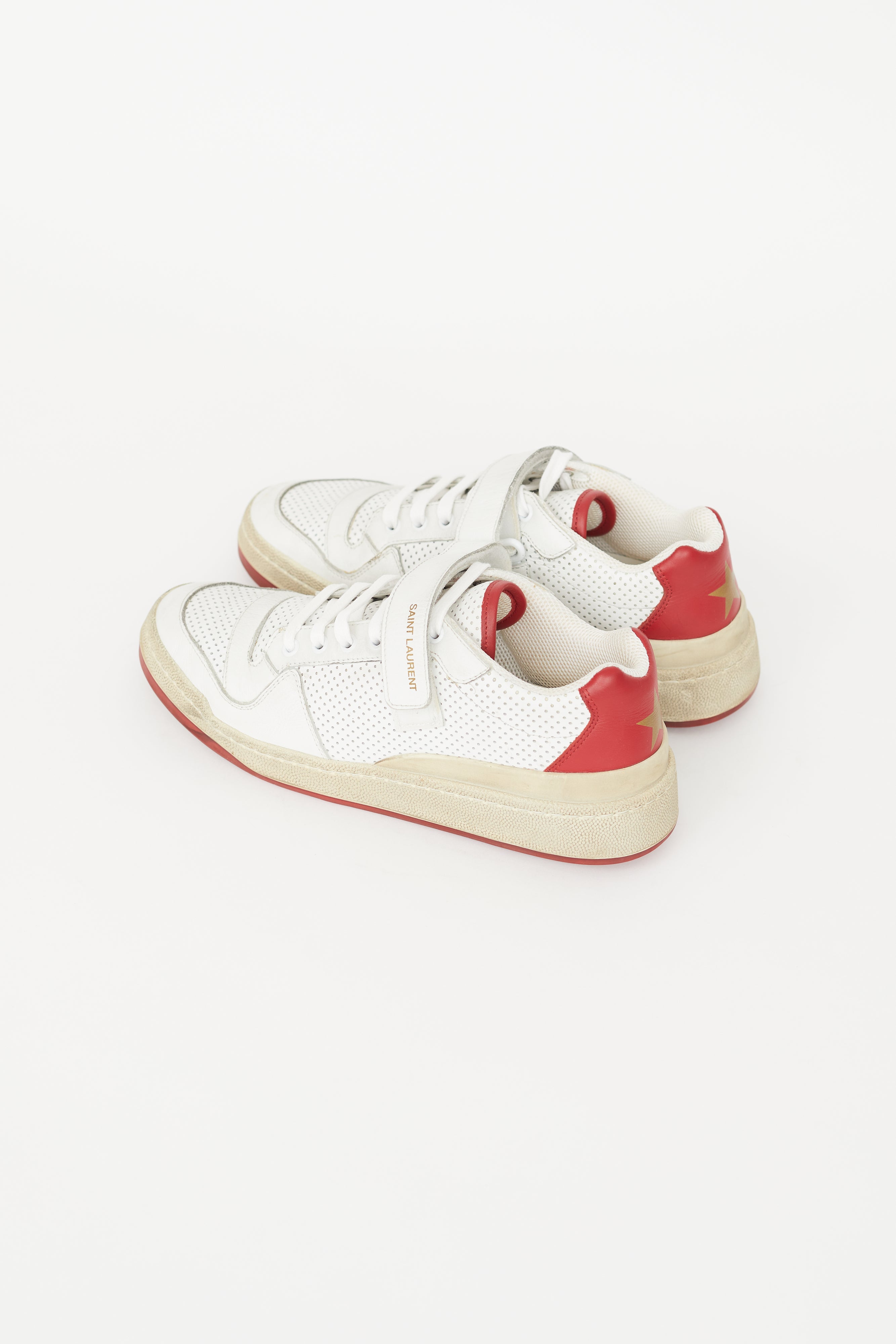 Pre-owned Saint Laurent white SL24 low sneakers featuring rounded toe, perforated body, lace up vamp, red leather heel counter, outsole, and tongue trim, gold stamped star at heel counter, and velcro strap across tongue.