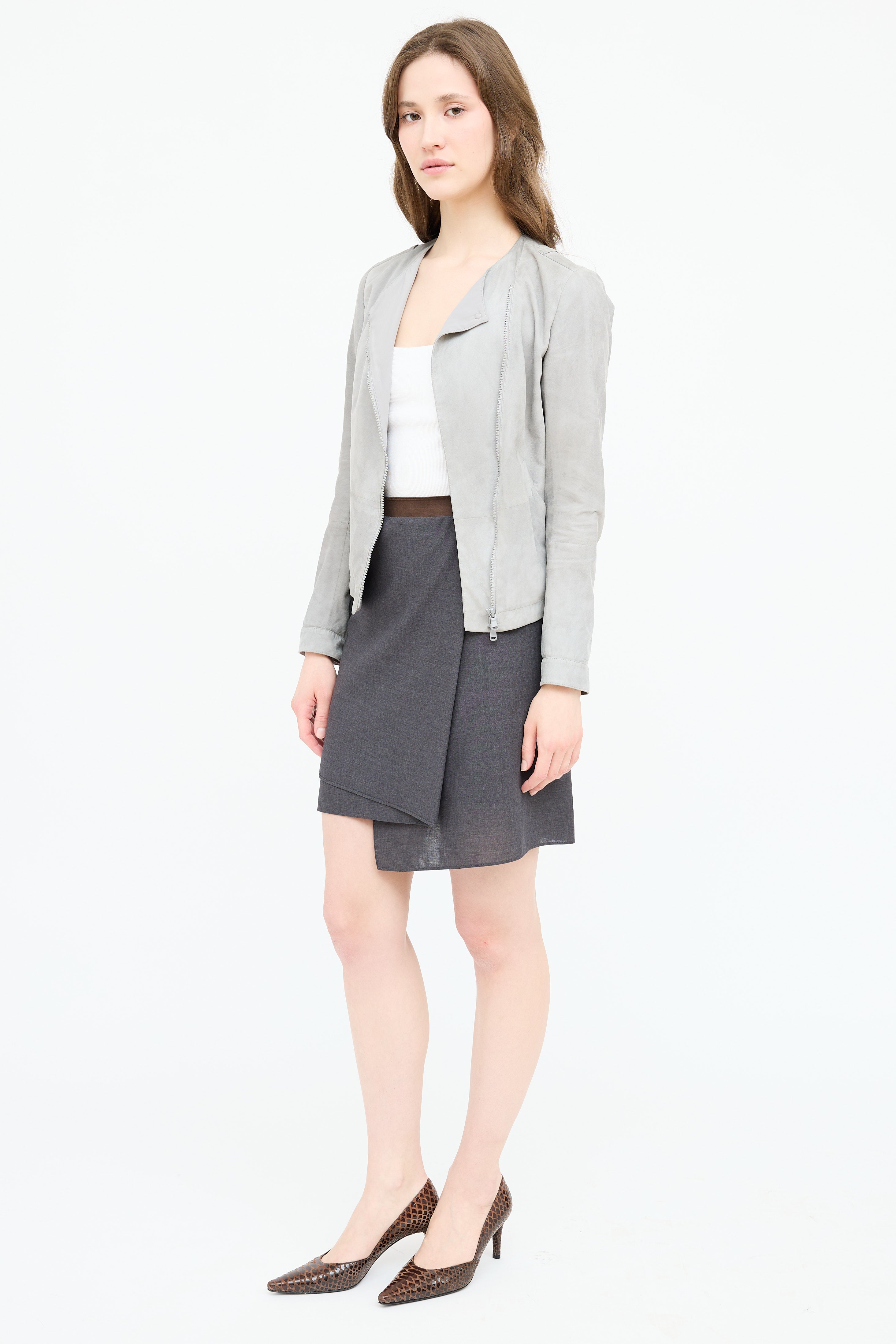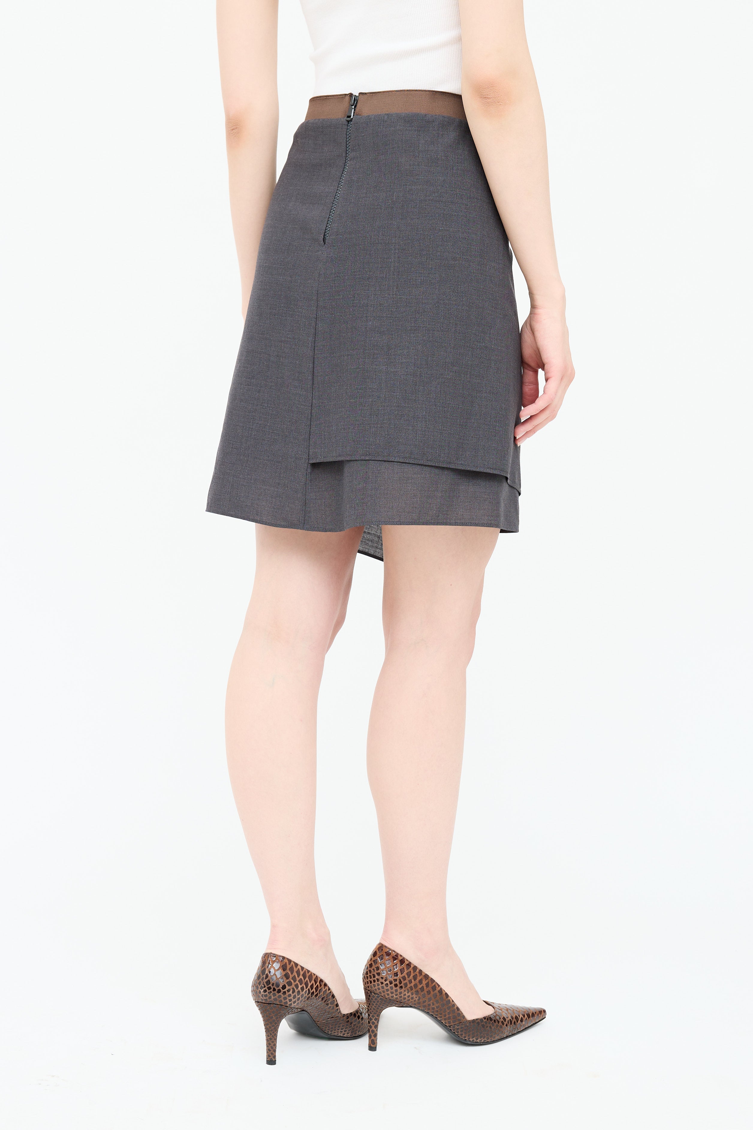 Pre-owned Brunello Cucinelli grey wool skirt featuring brown elastic waist band, layered detail at front and zip closure at back.