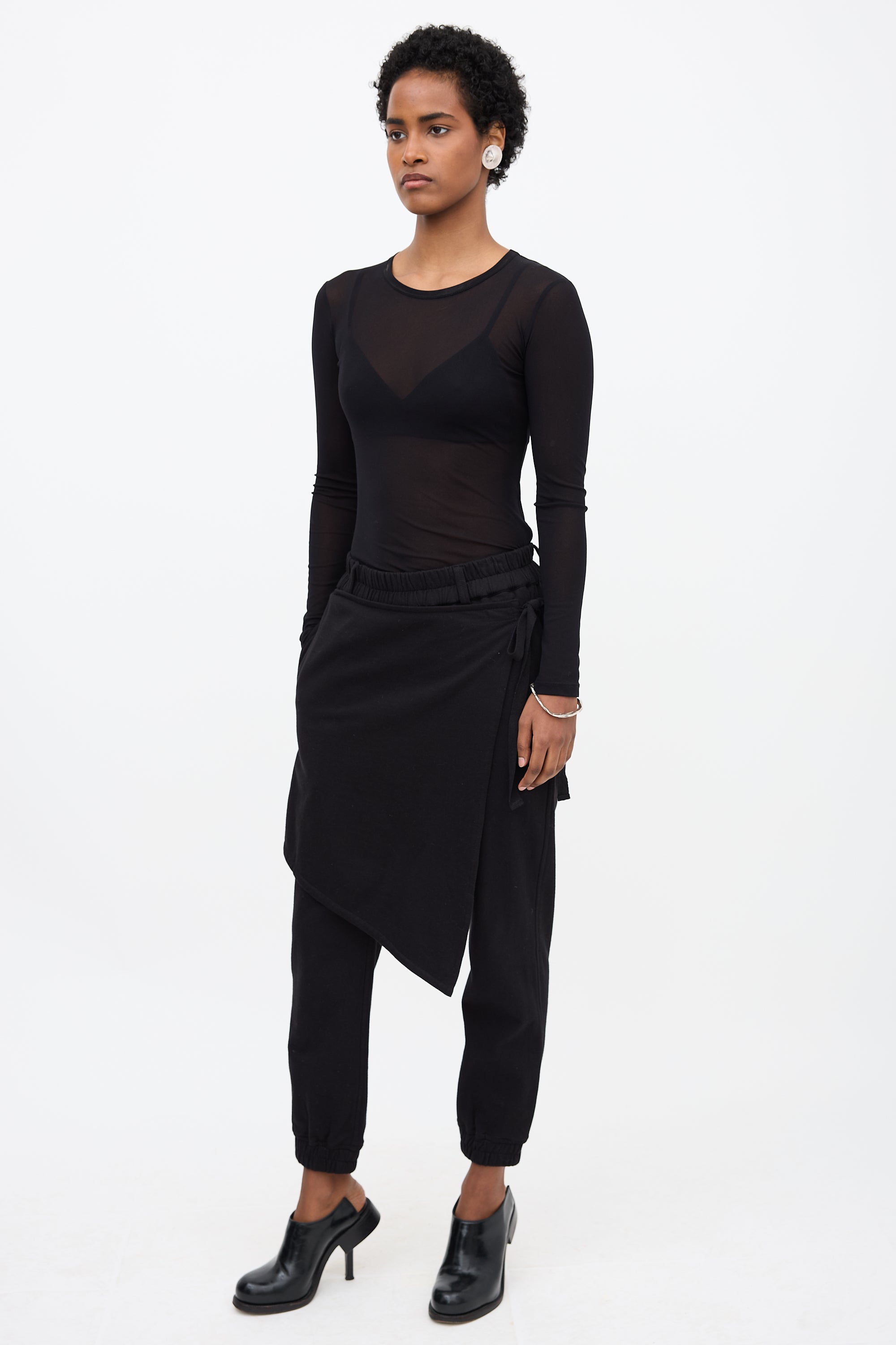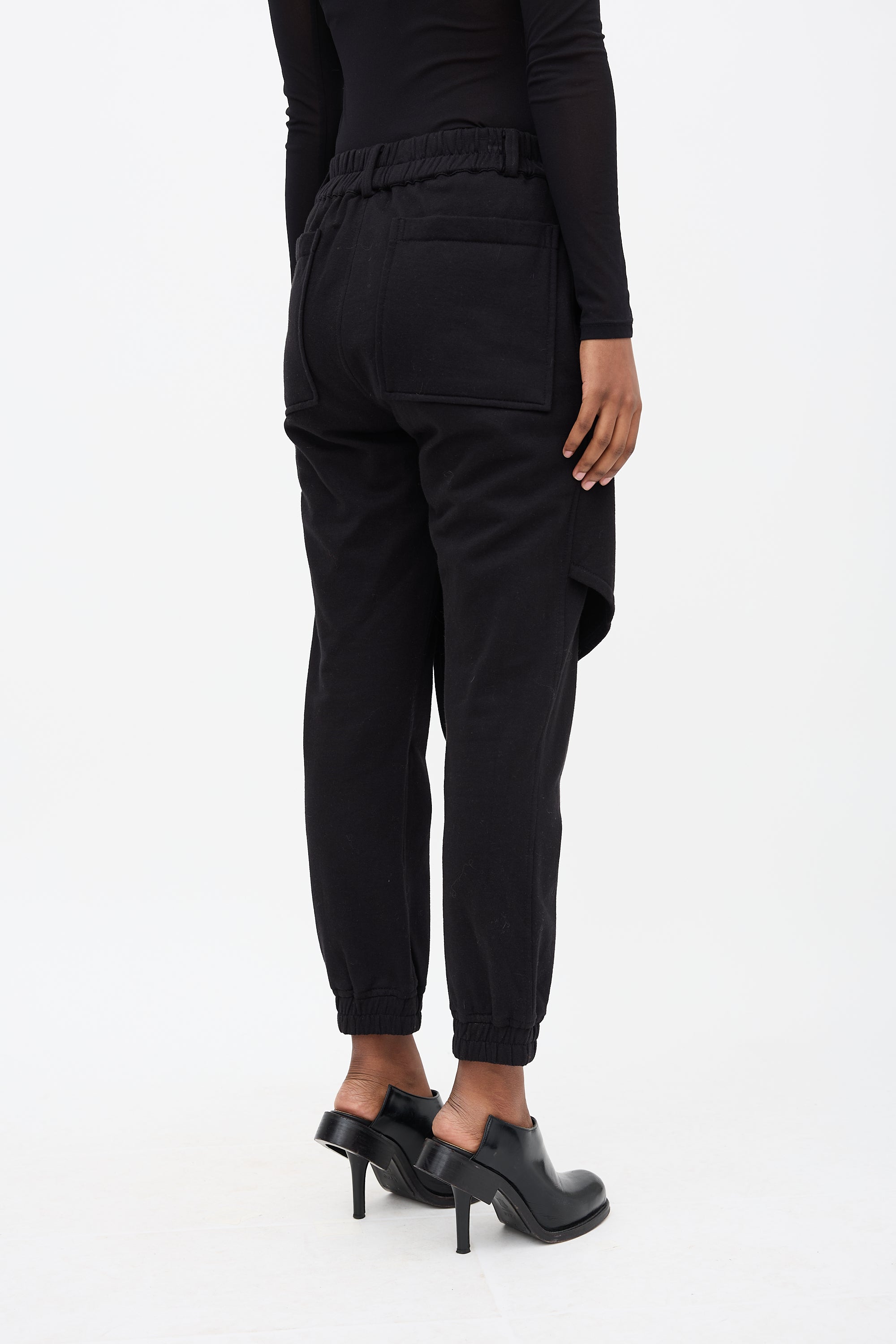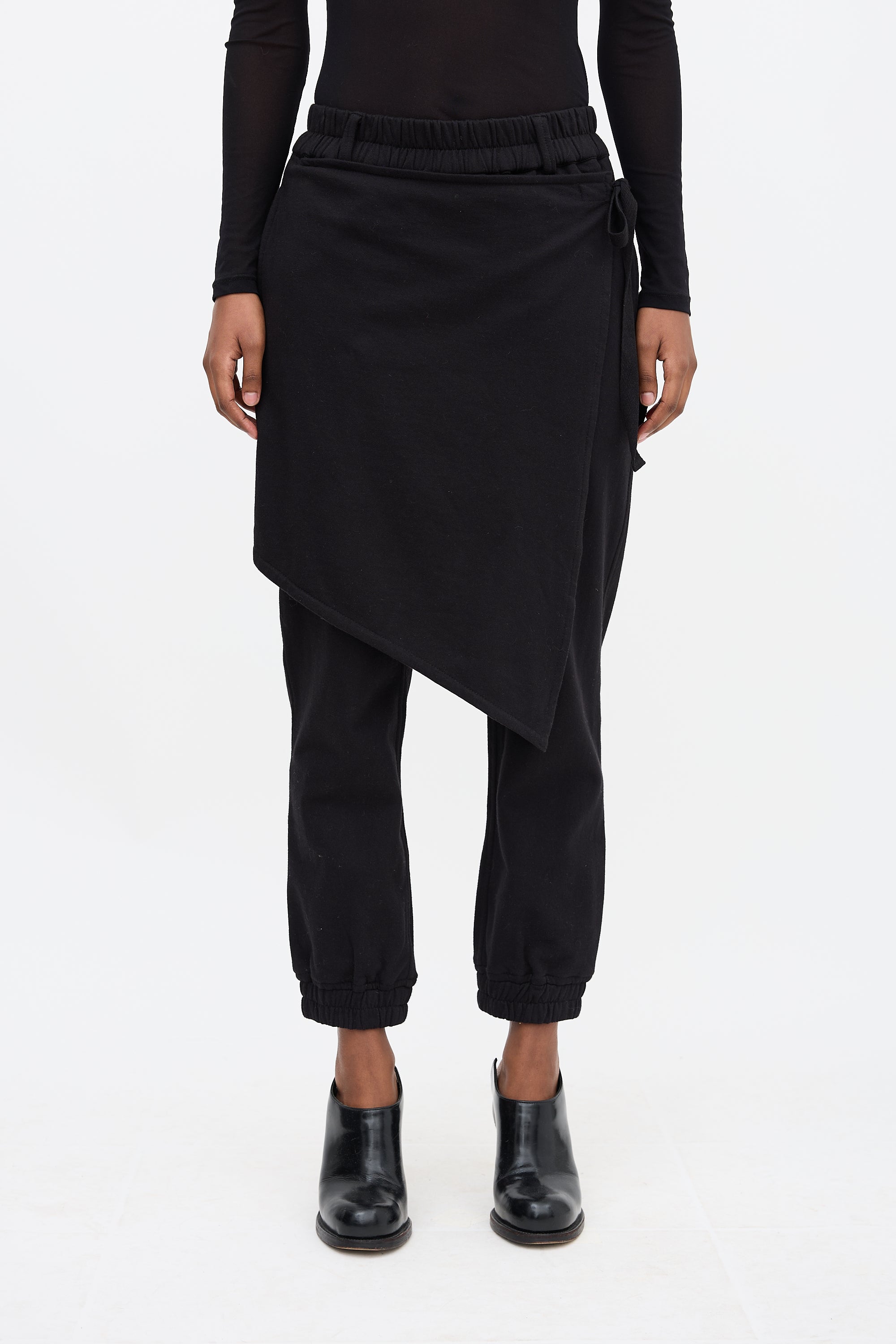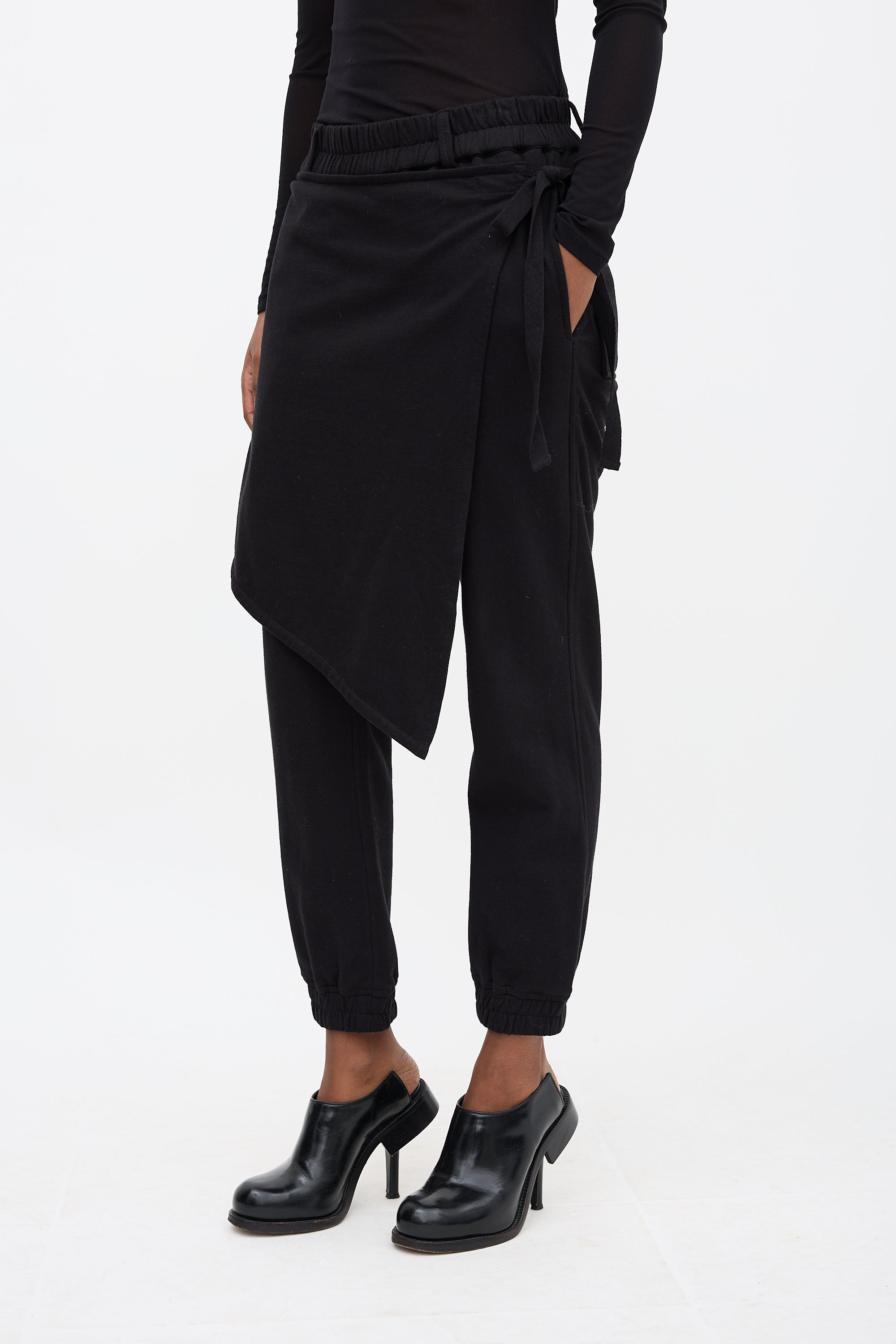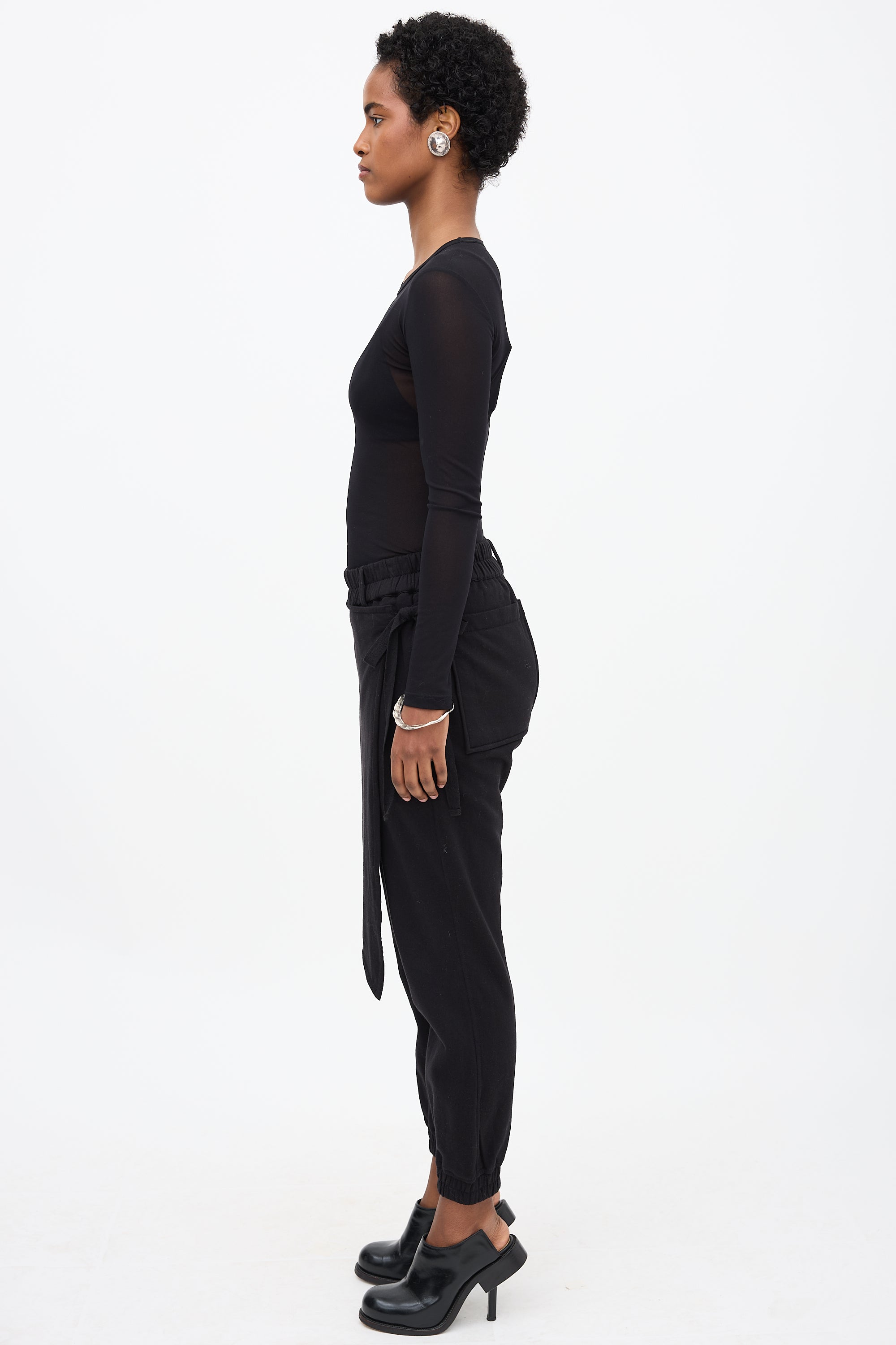 Pre-owned Nicholas K black Anouk sweat pants featuring wide elasticized waistband with belt loops, wrap front with tie fastening, tapered leg, elasticized hem, and four pocket styling.