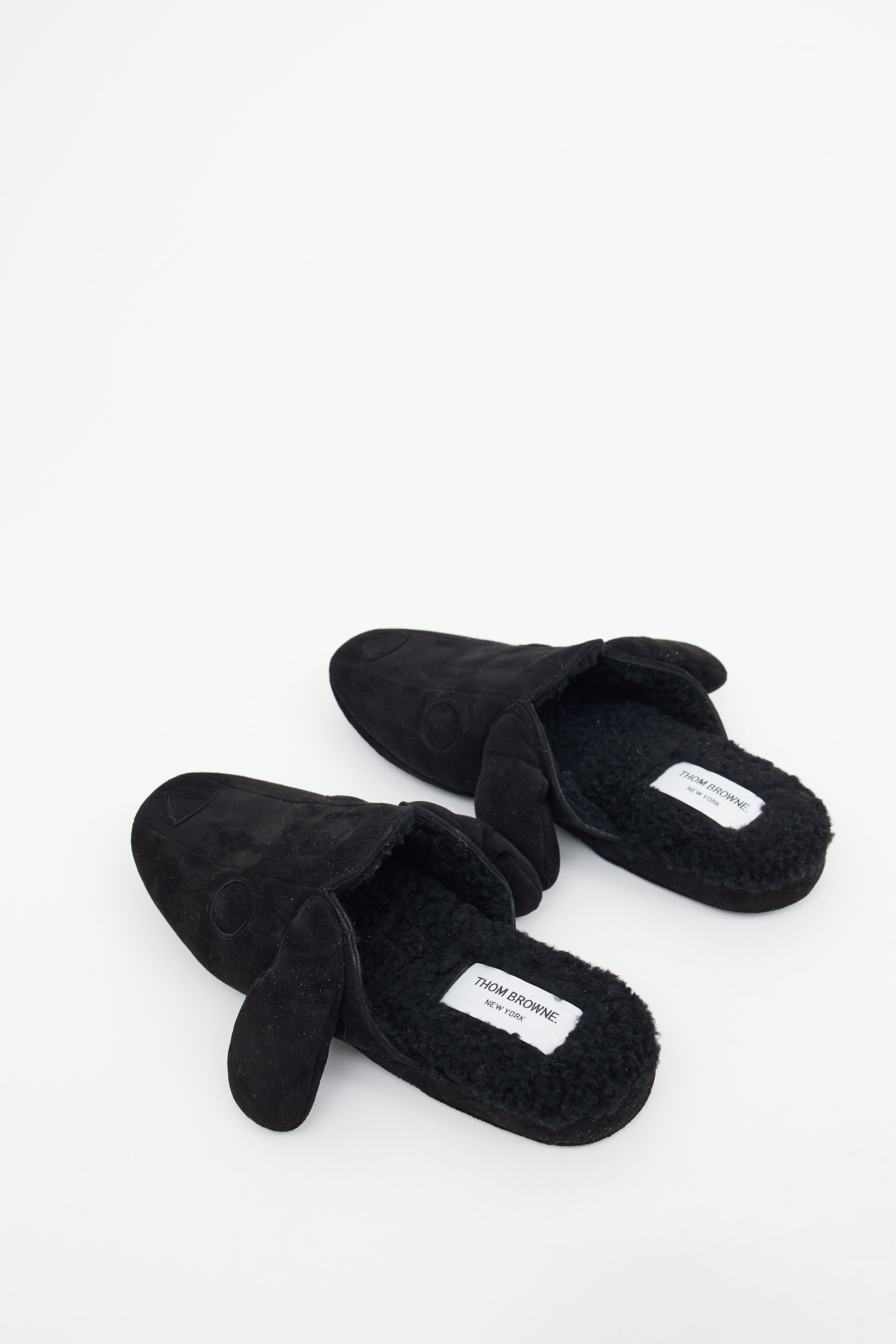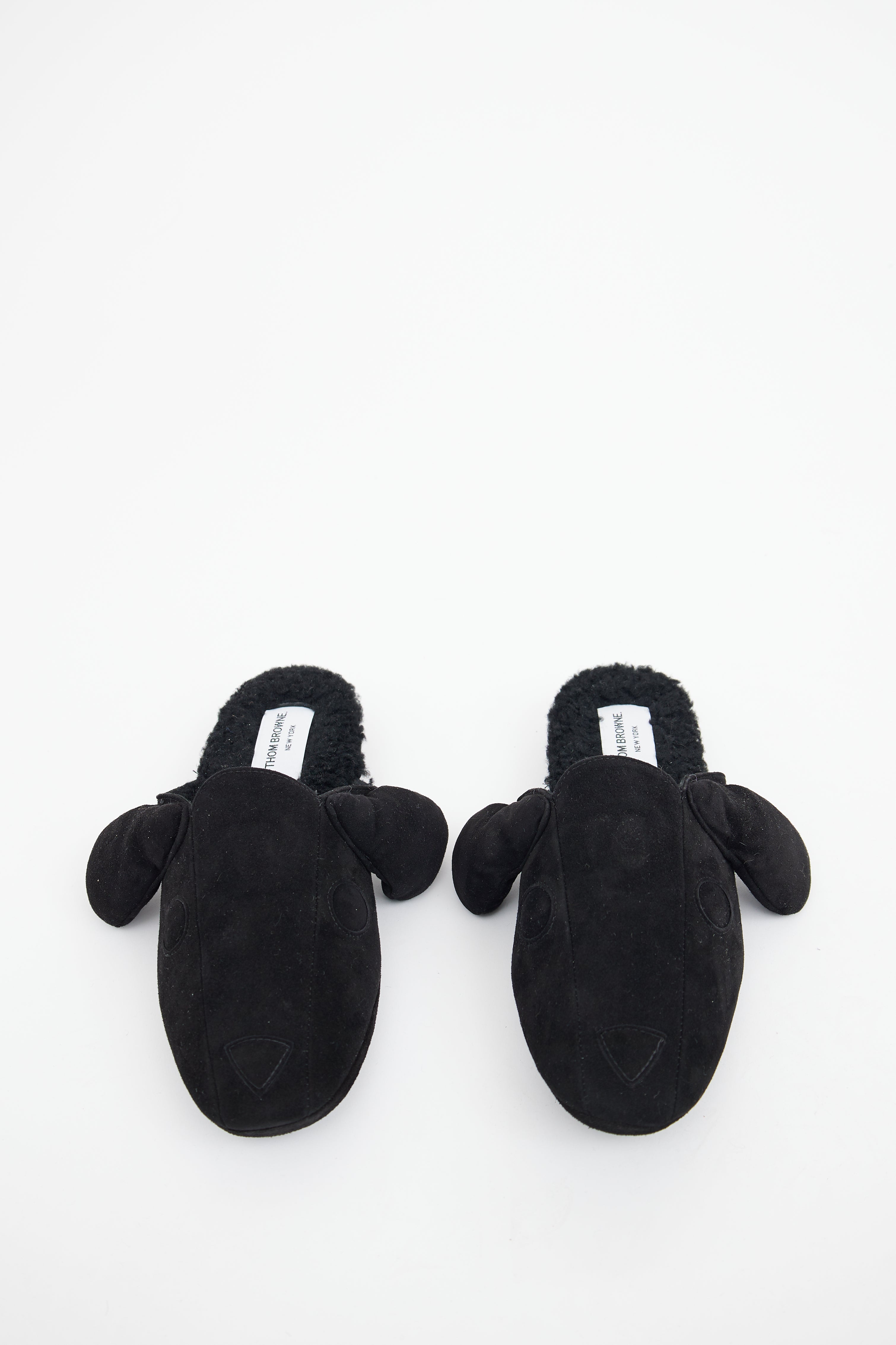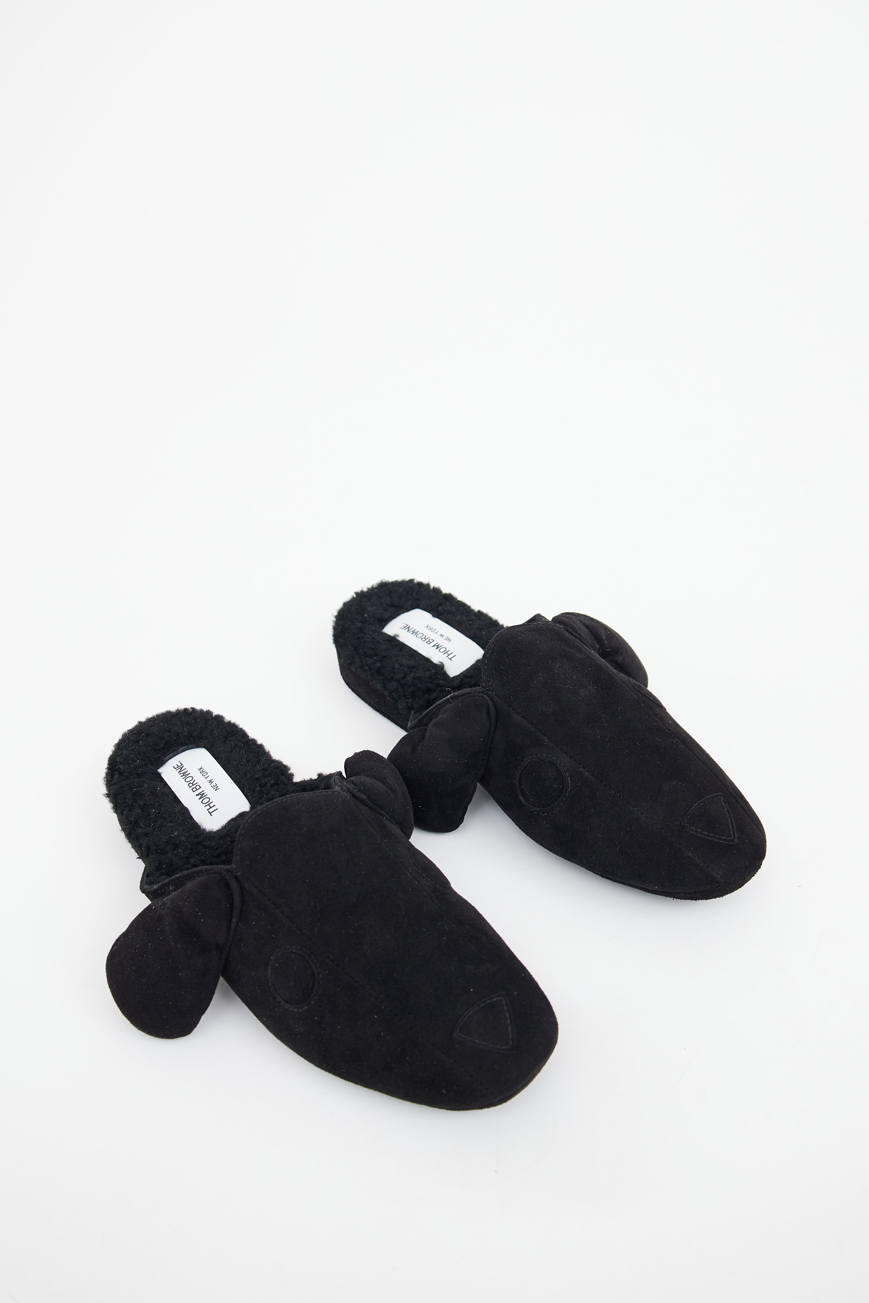 Pre-owned Thom Brown black suede Hector slippers featuring almond toe, dog embroidered face on upper with ear extension, slip on with Sherpa insole and suede outsole.