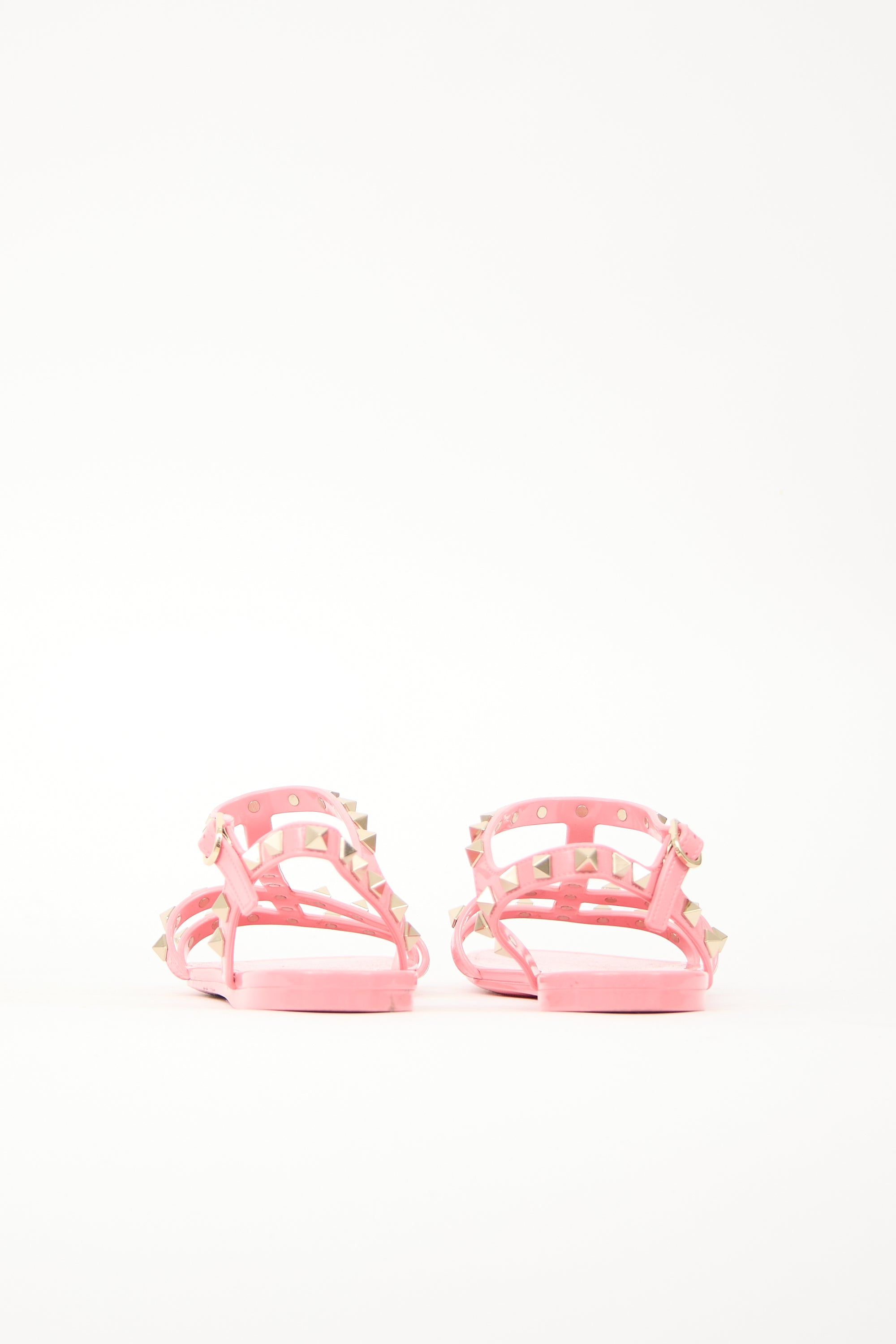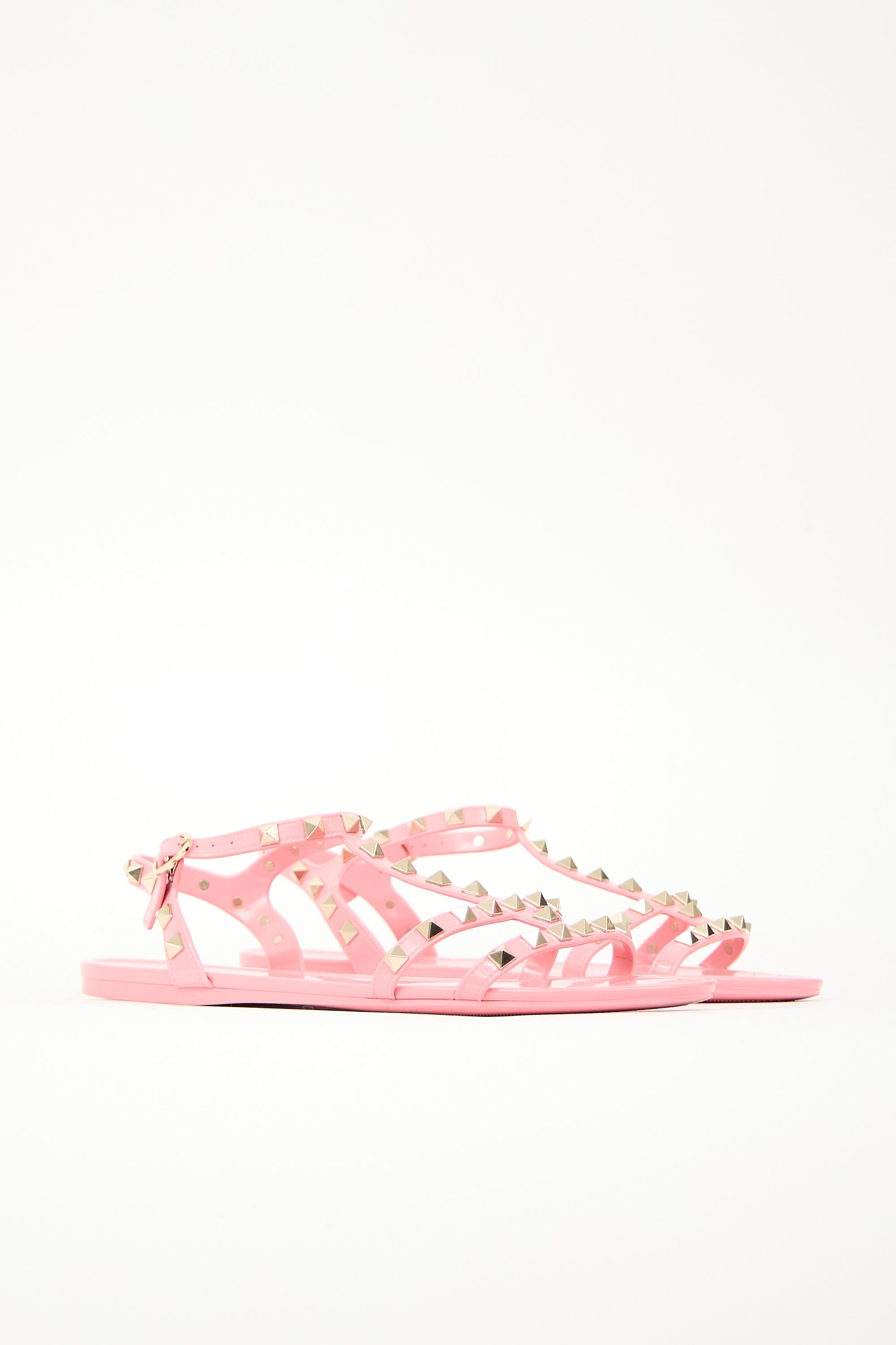 Pre-owned Valentino pink rubber sandals featuring rounded toe, cage upper with pale gold tone Rockstud embellishment, and adjustable ankle strap. Comes with original dust bag.