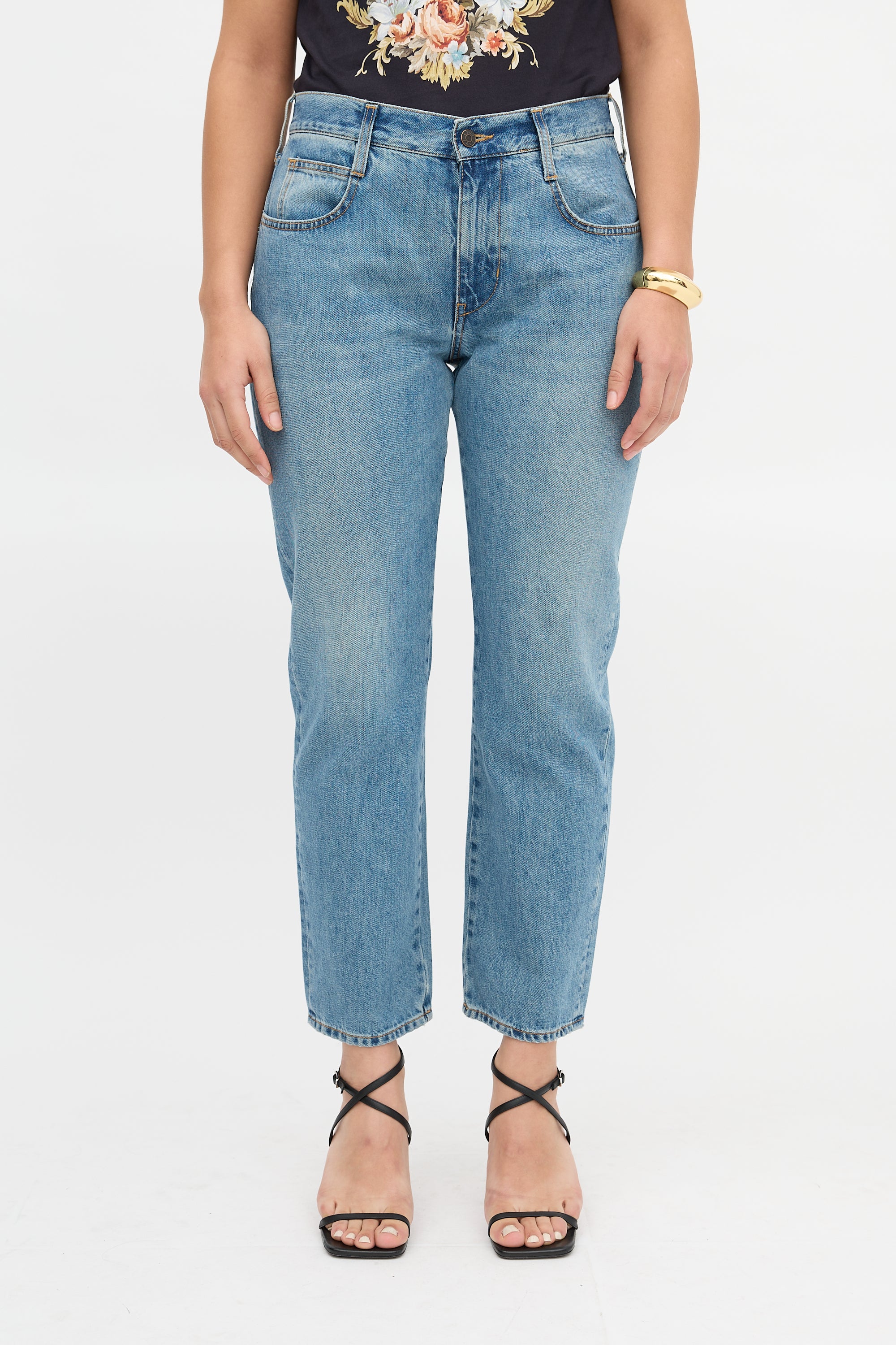 Pre-owned 6397 medium wash NP330 jeans featuring straight leg, five pocket styling, brown Jacron, and zip fly.