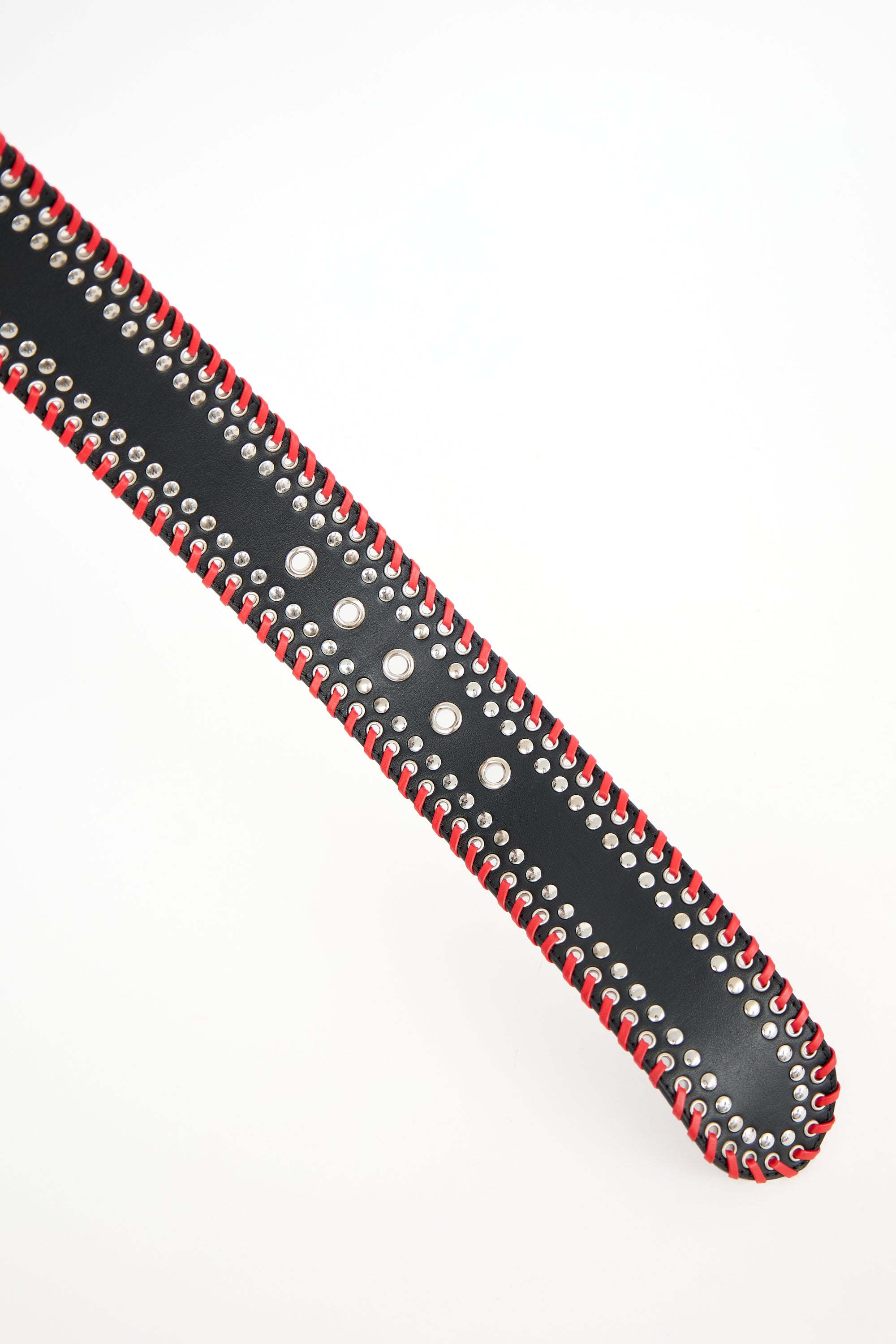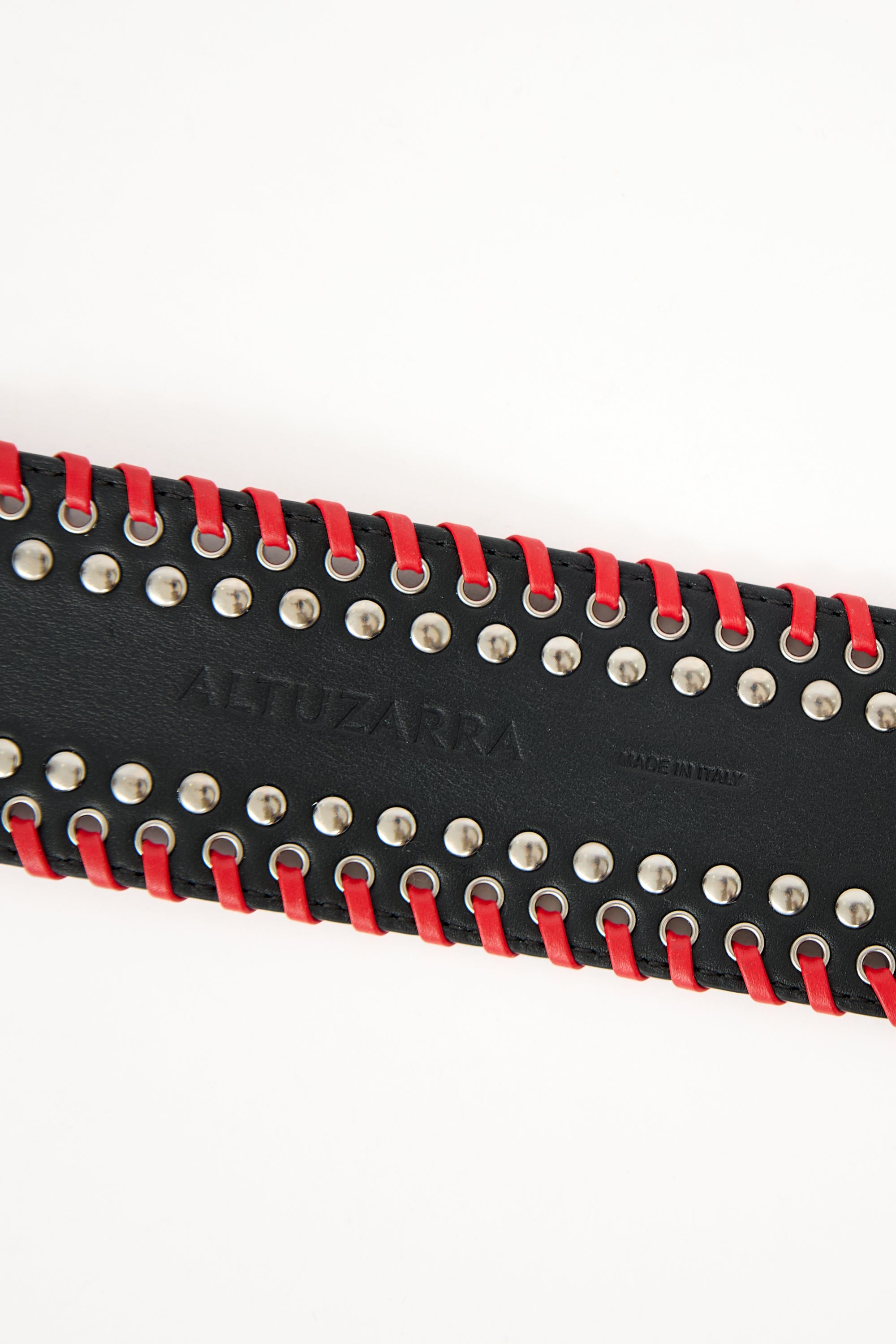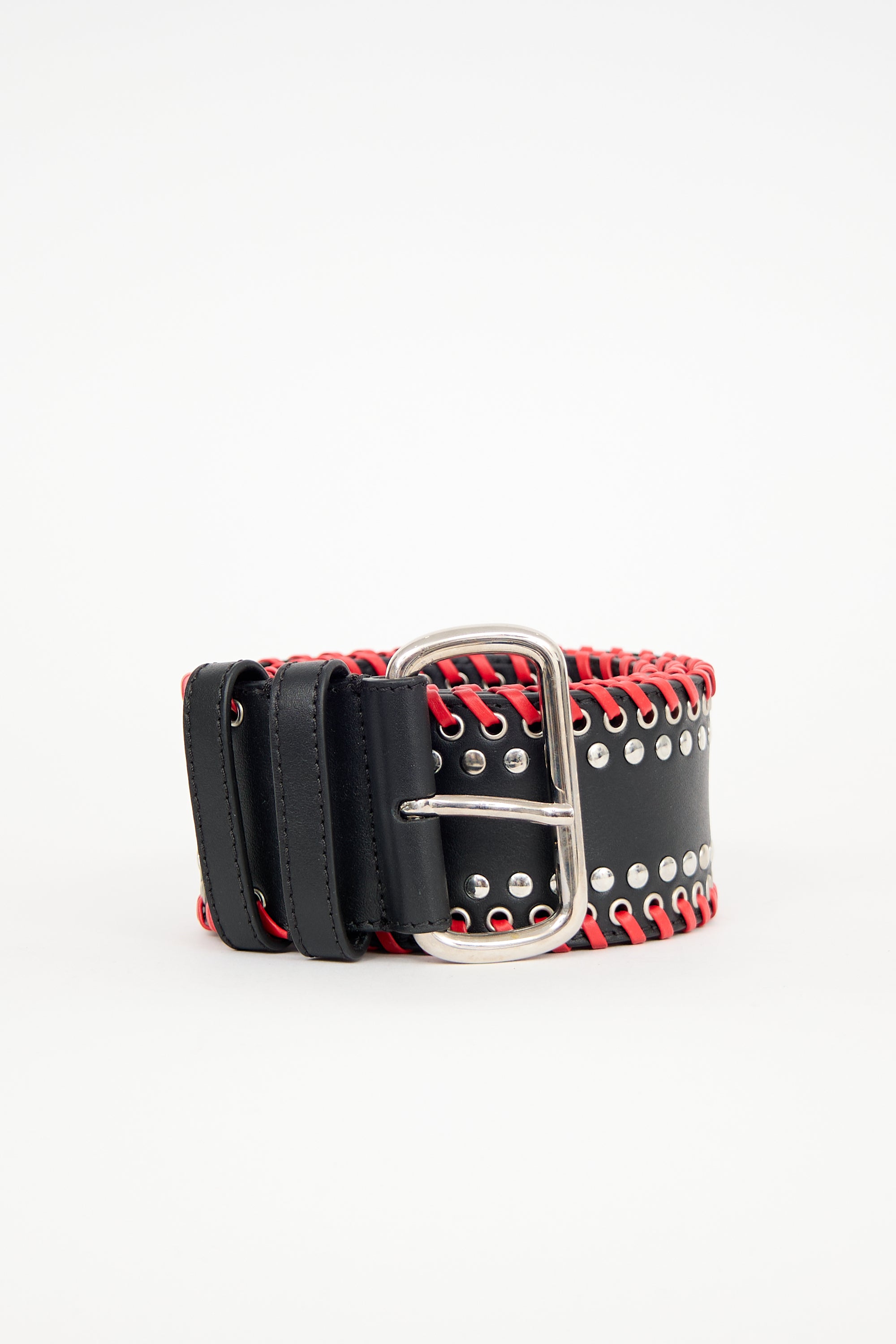 Pre-owned Altuzarra black leather belt featuring red leather weaving, silver tone hardware, studding throughout, and rectangular pin buckle.