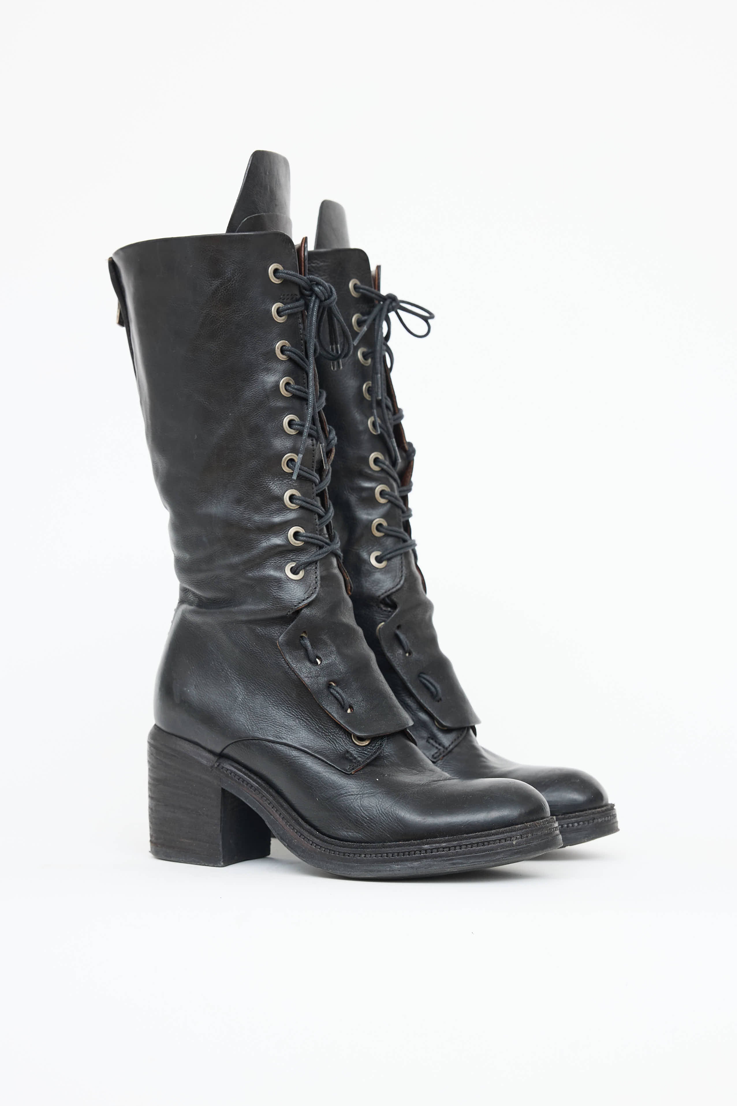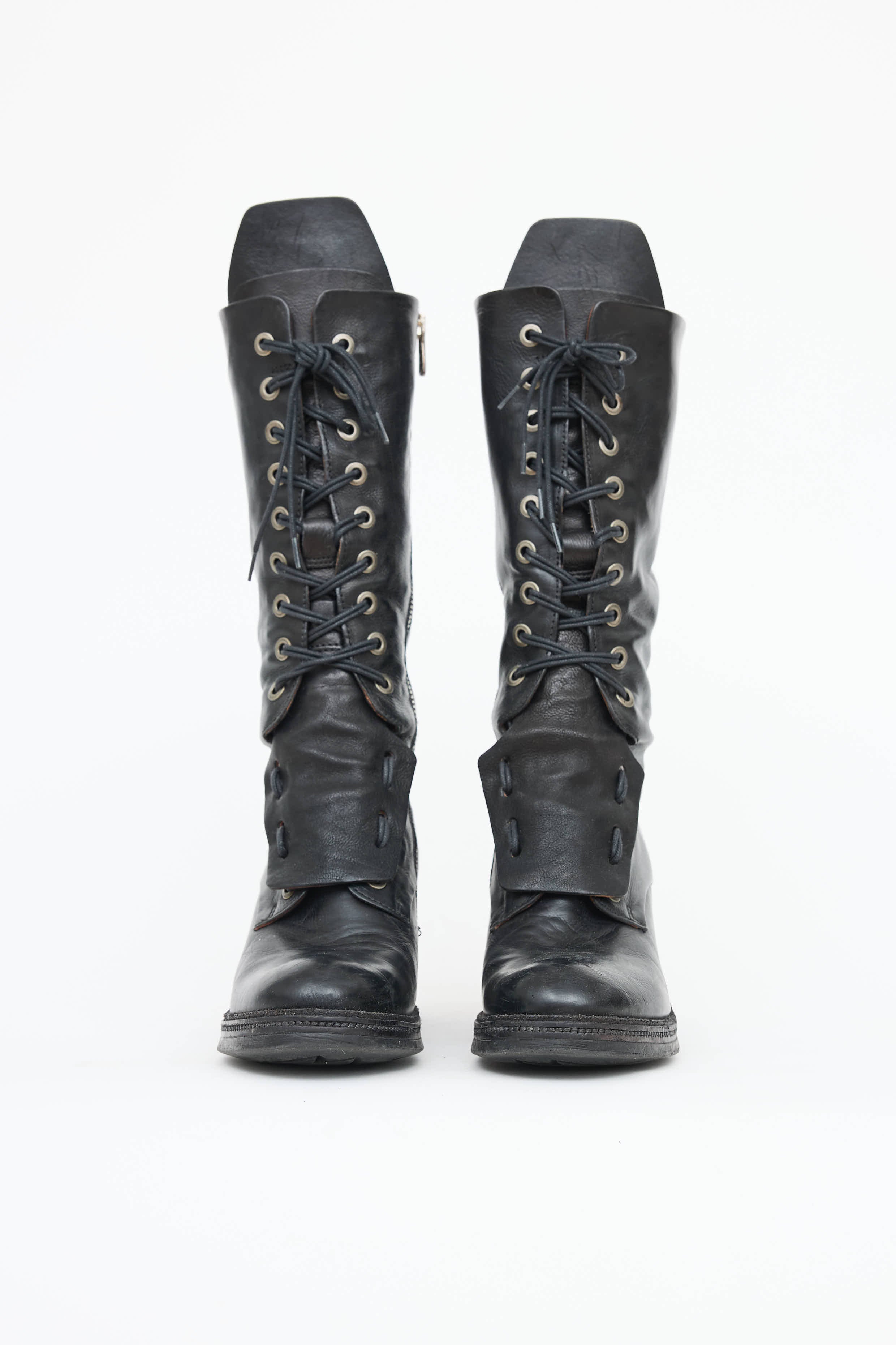 Pre-owned AS98 black leather combat boot featuring rounded toe, lace up vamp, stacked heel, silver tone studs at back, and zip at sides and back.