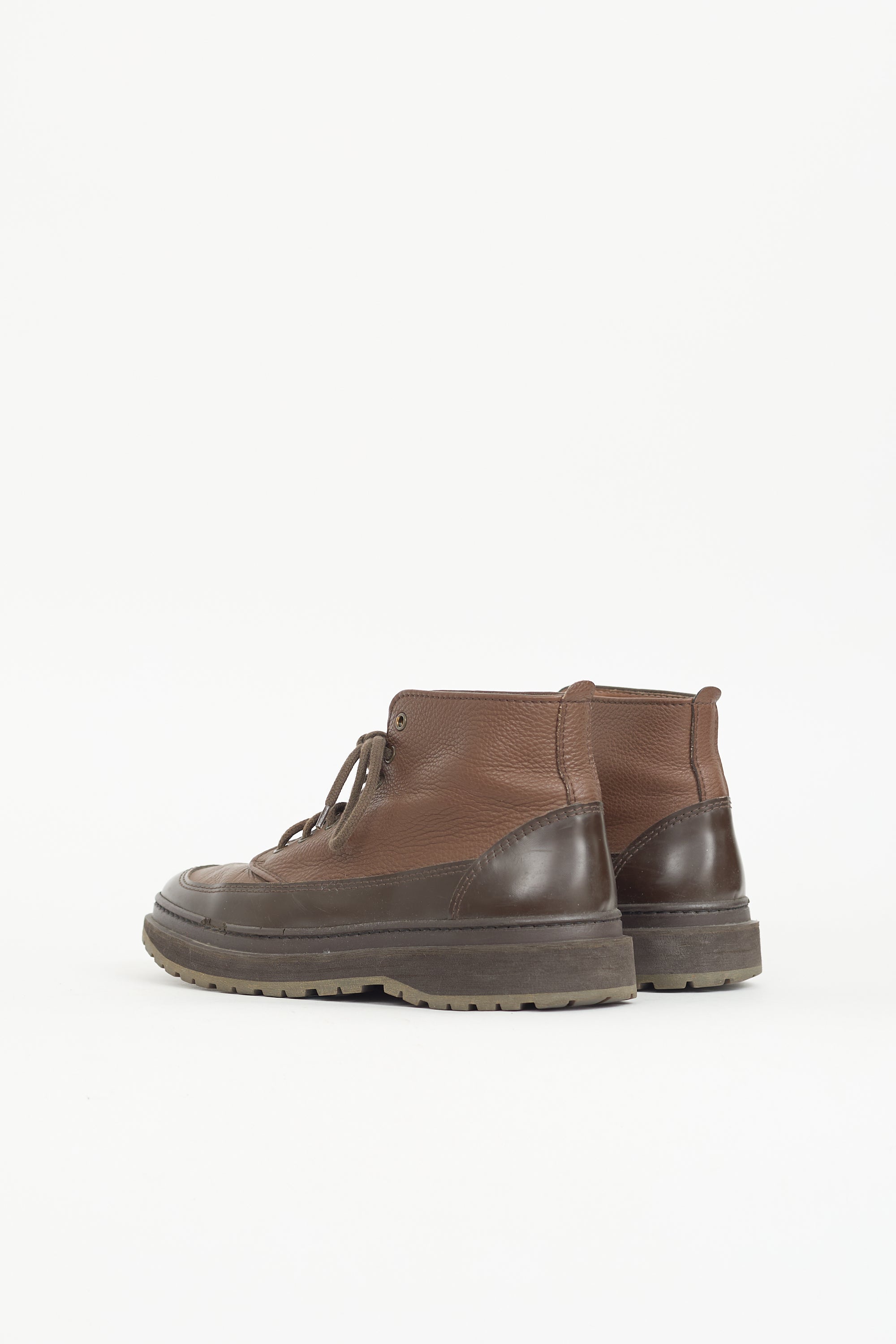 Pre-owned Brunello Cucinelli brown leather boots featuring rounded toe, lace up front, stamped logo at tongue, rubber trim, and treaded rubber sole.