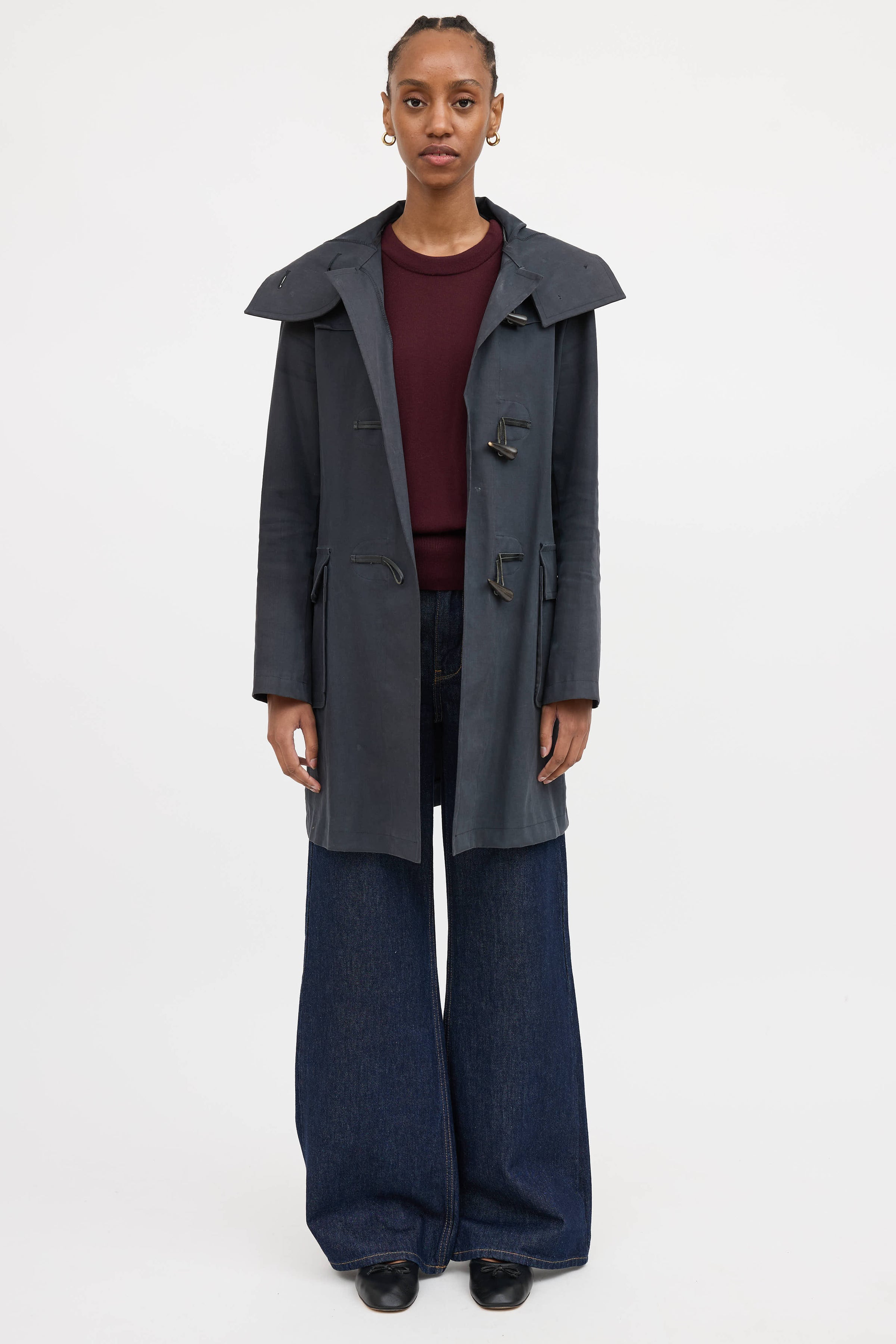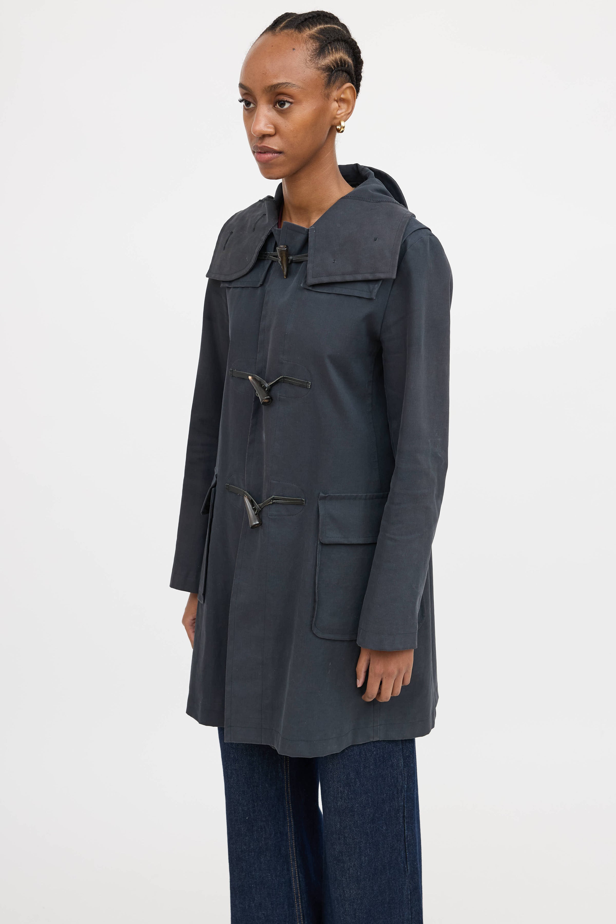 Pre-owned Burberry navy coat featuring hood, stand collar, toggle button front, and patch pockets at front.